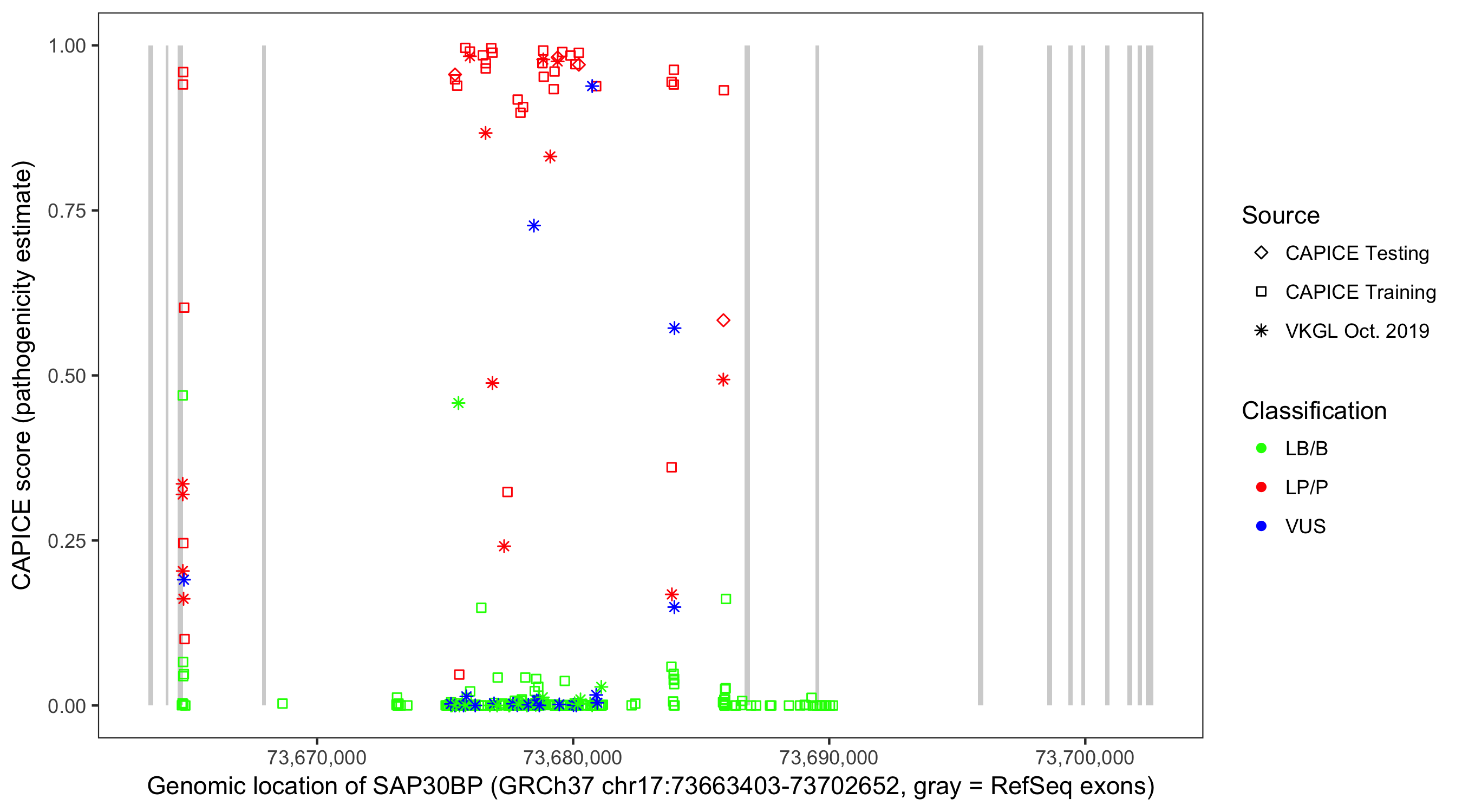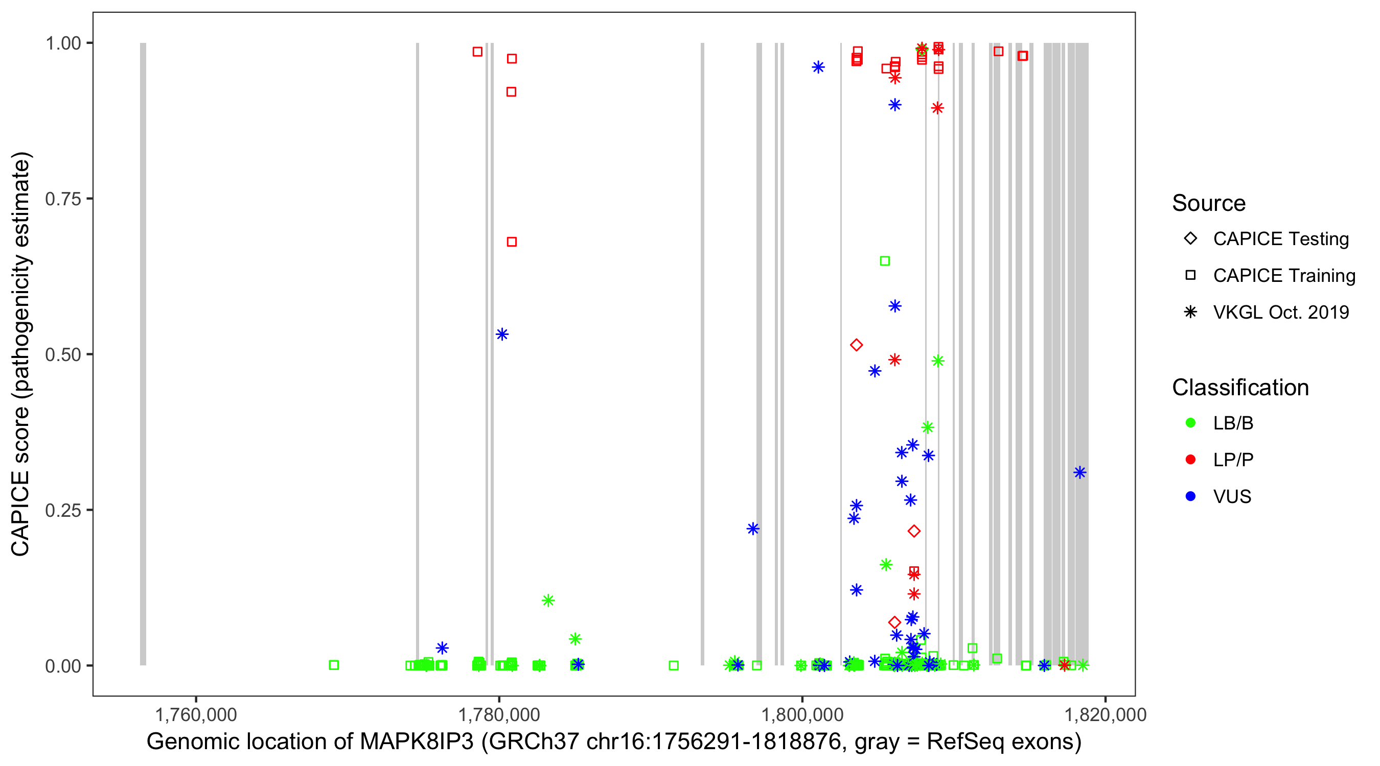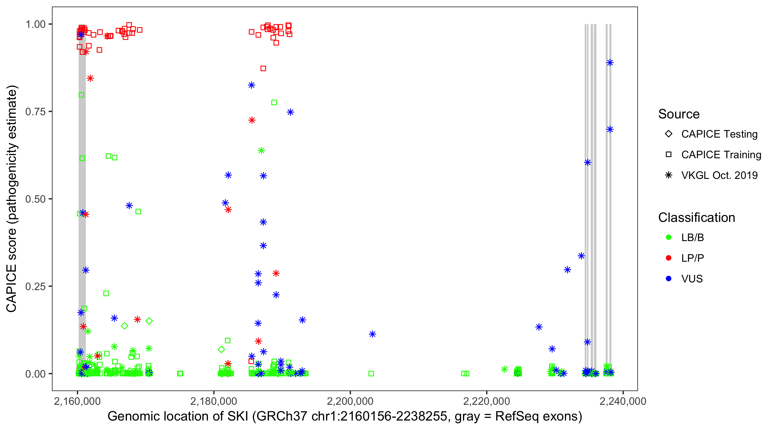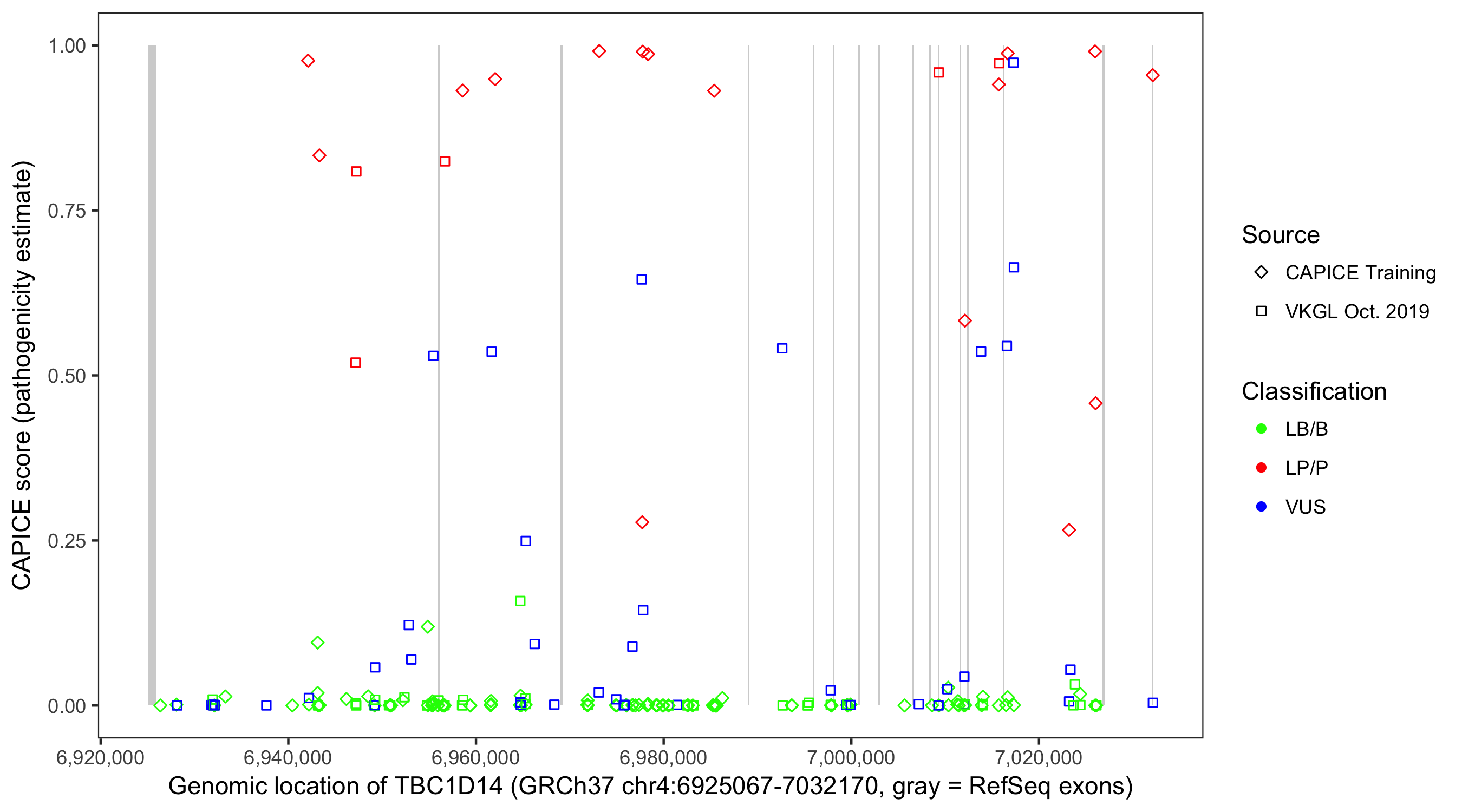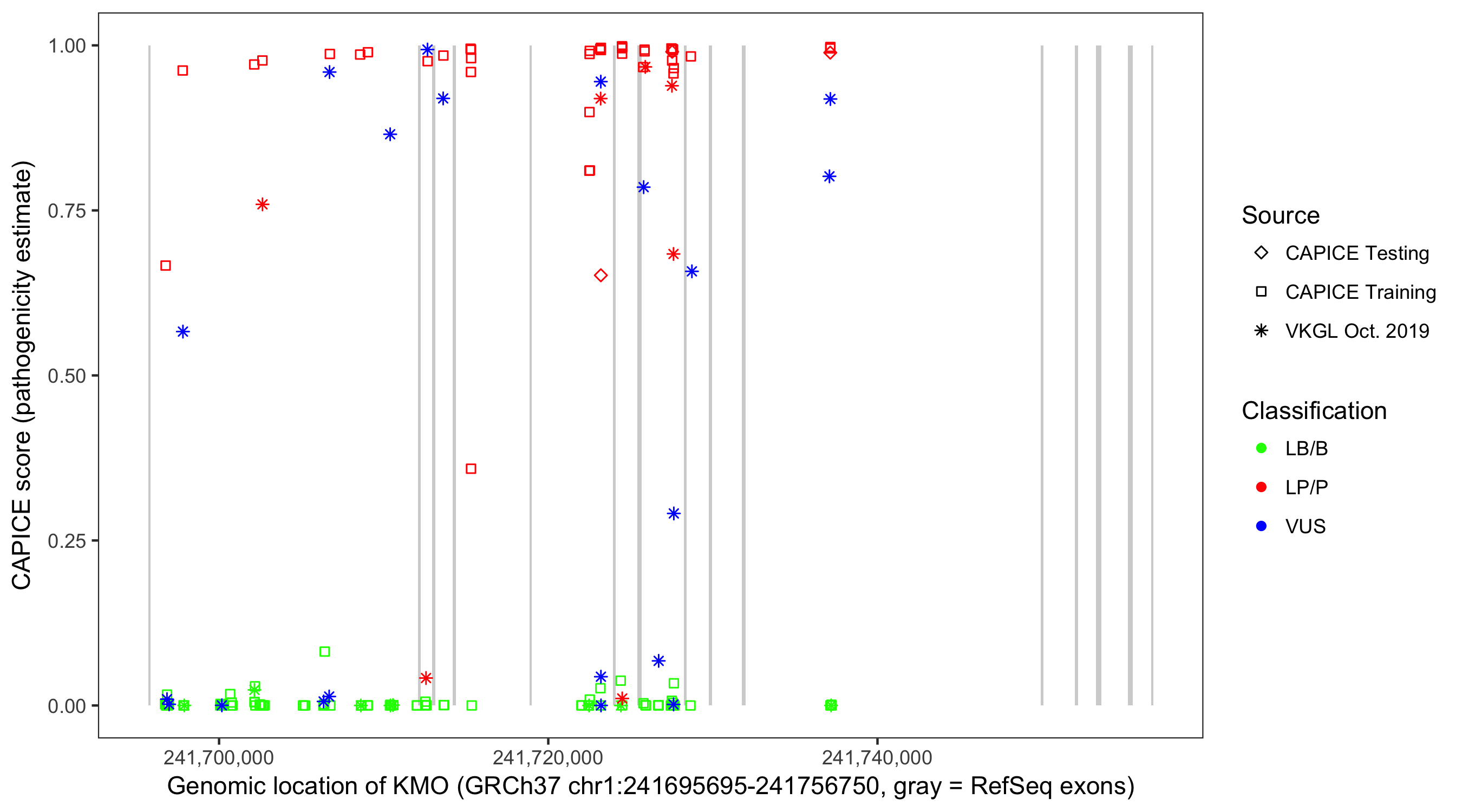 Shown are CAPICE train/test variants plus VKGL Oct 2019.