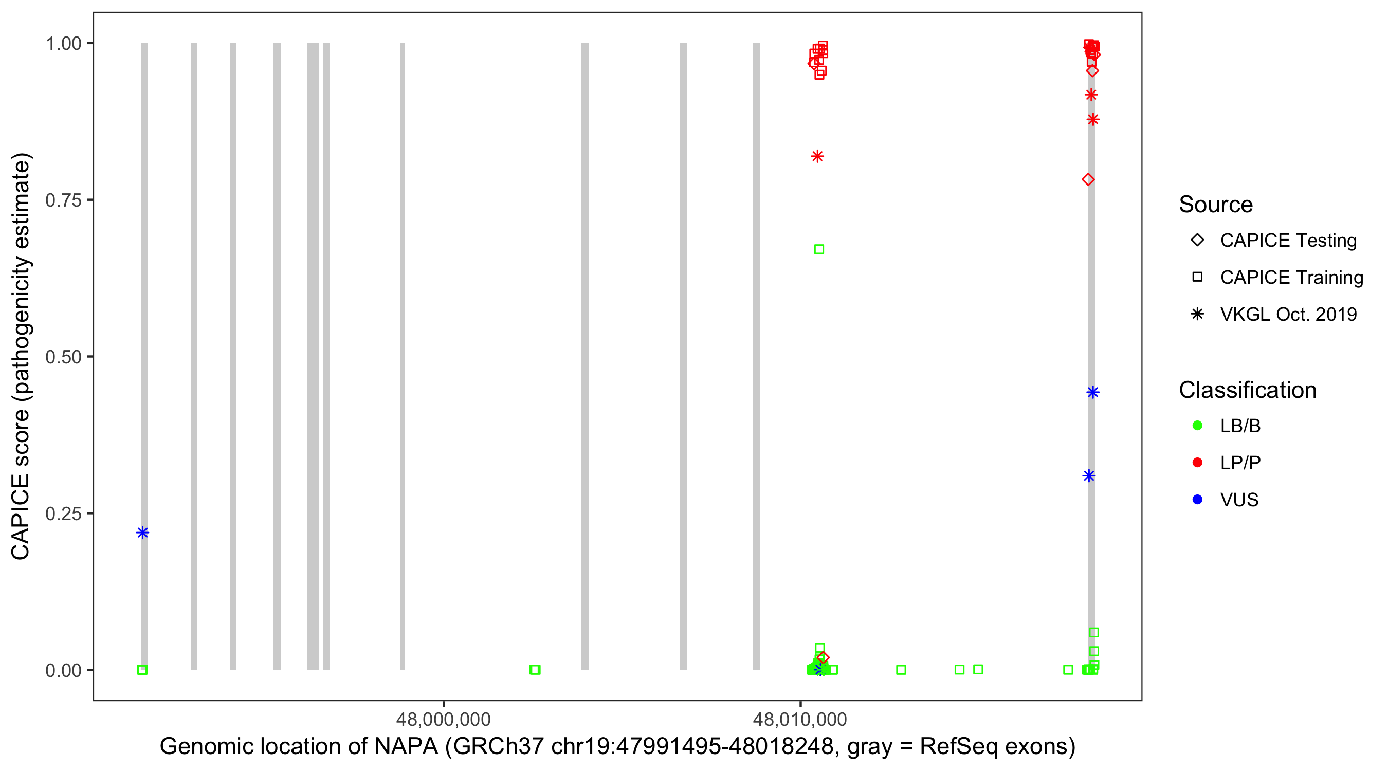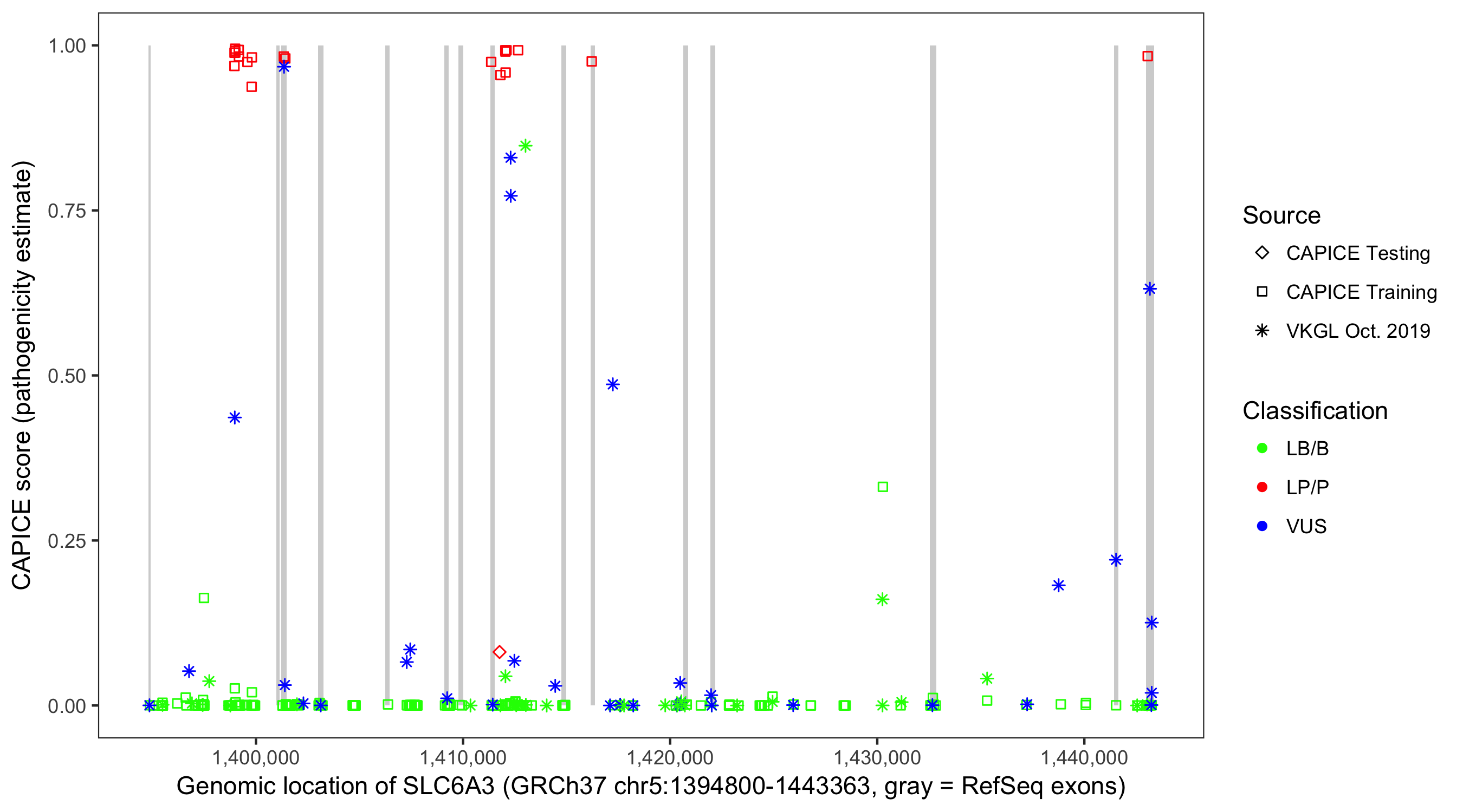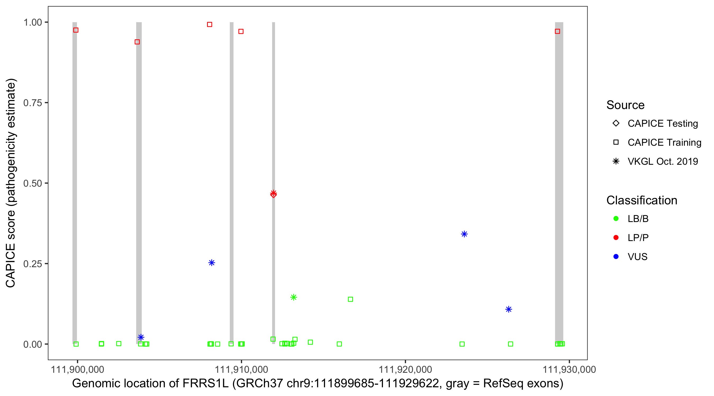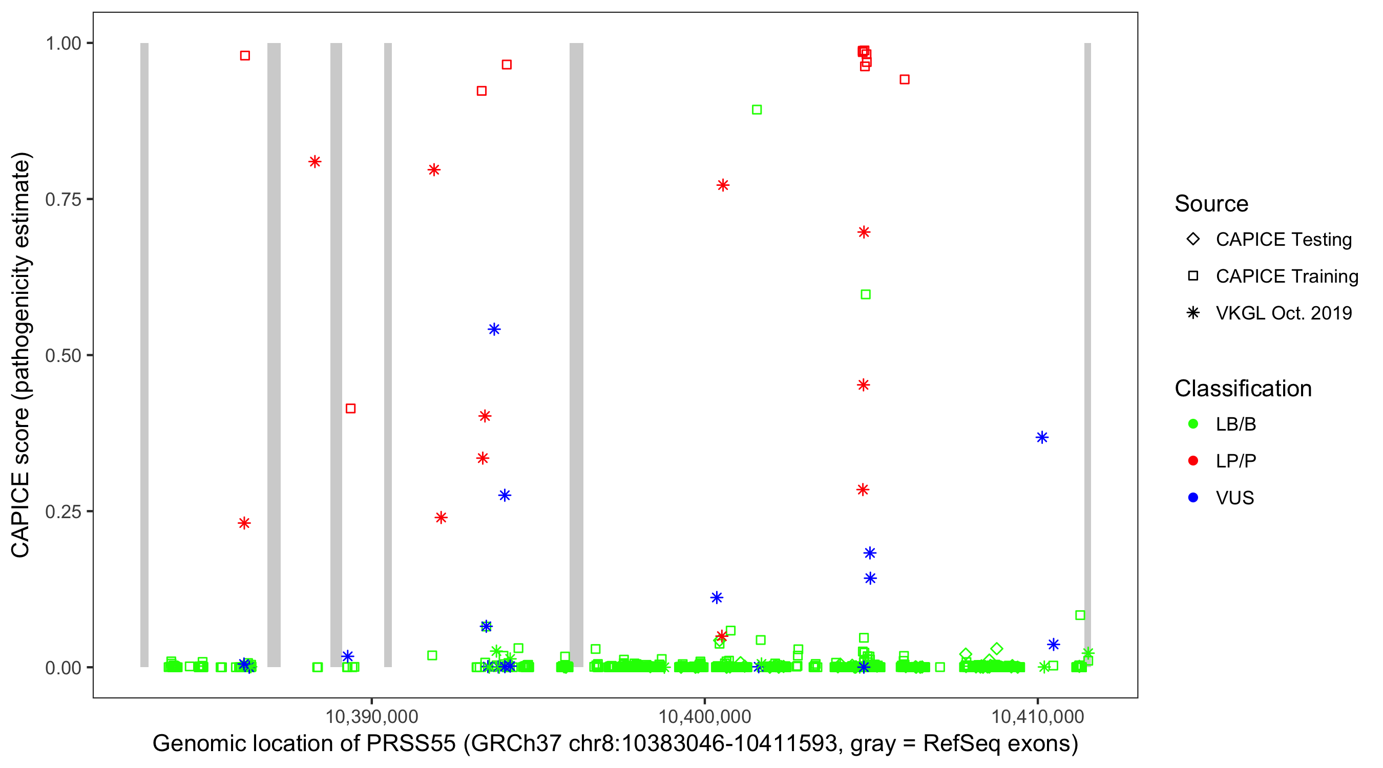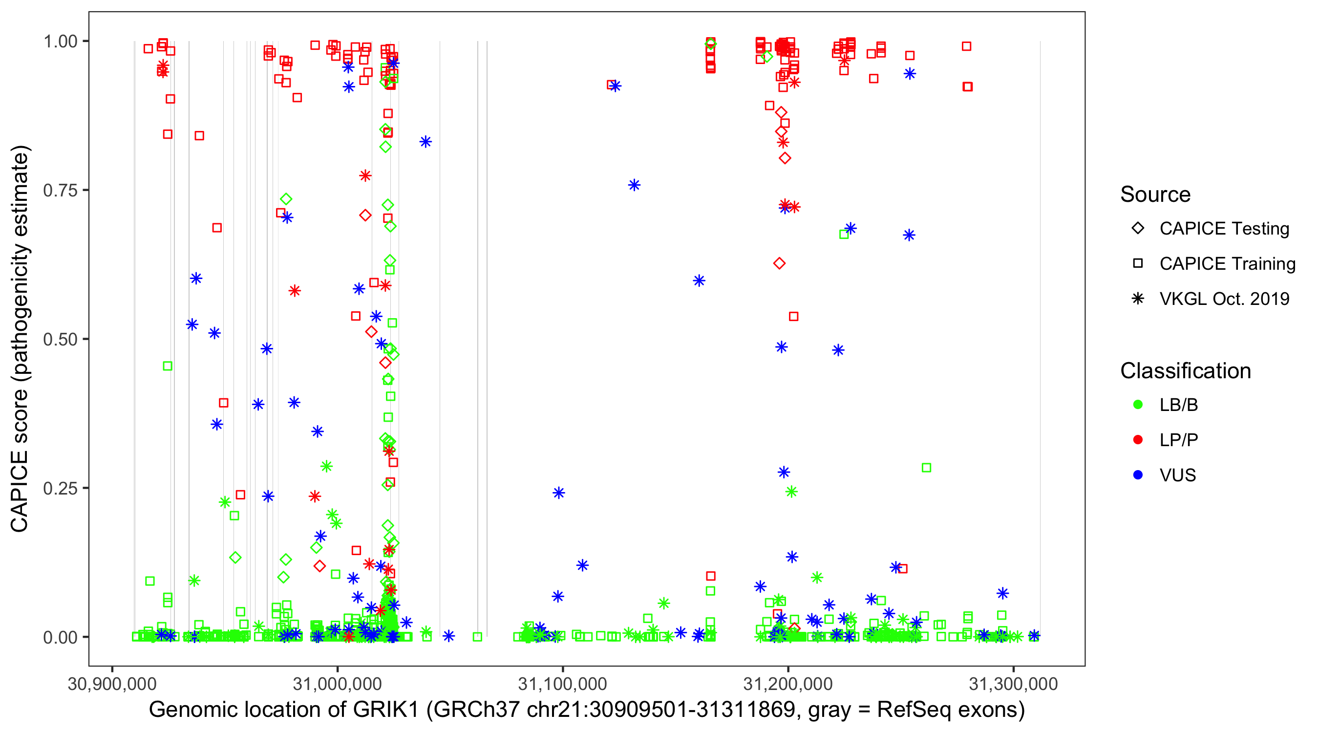 Shown are CAPICE train/test variants plus VKGL Oct 2019.
