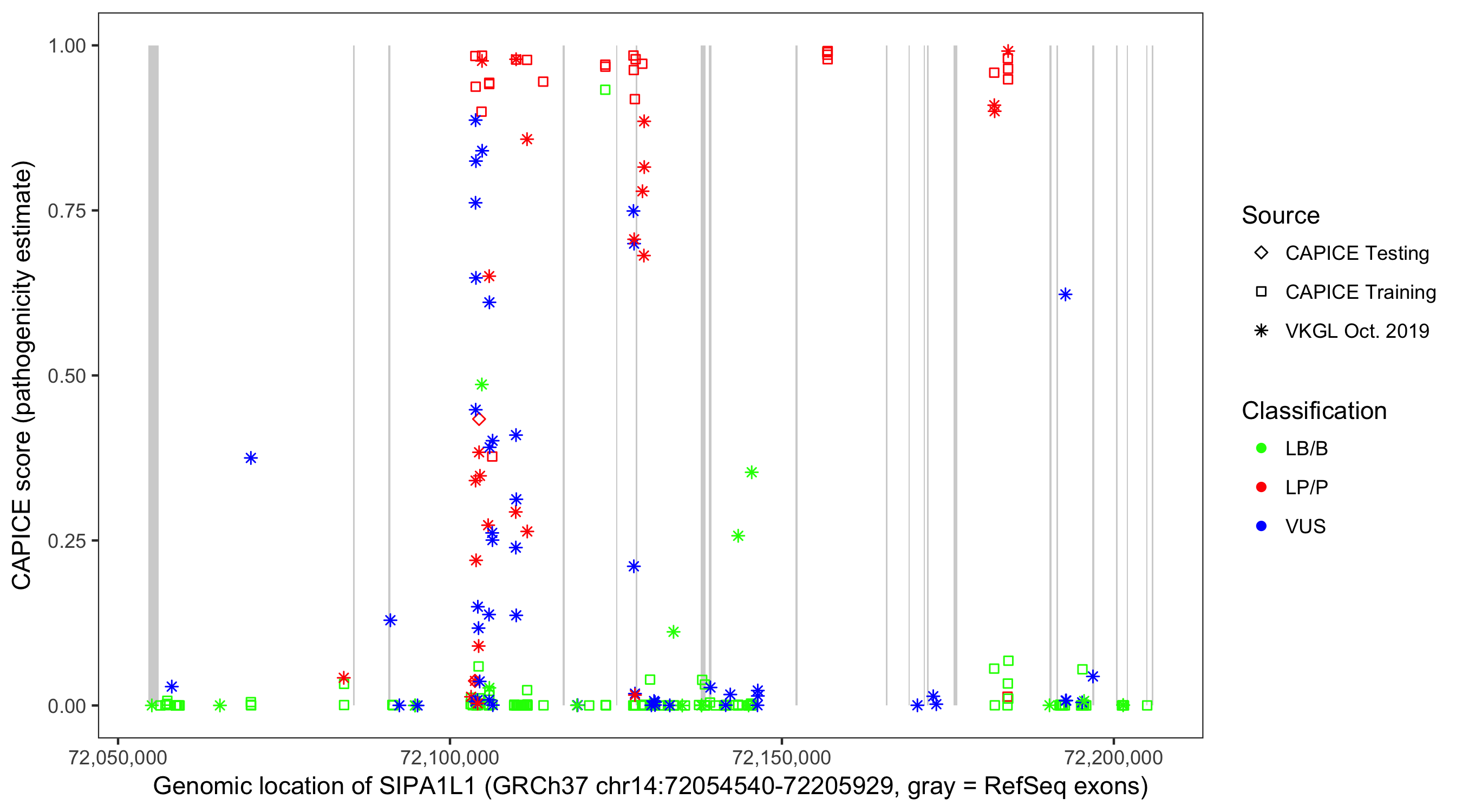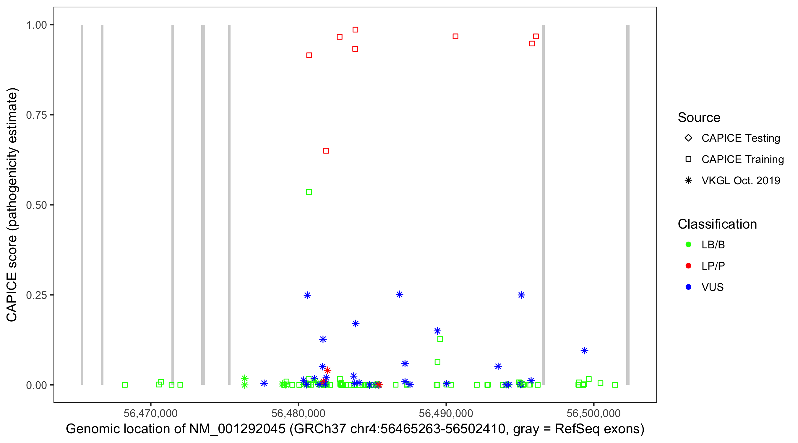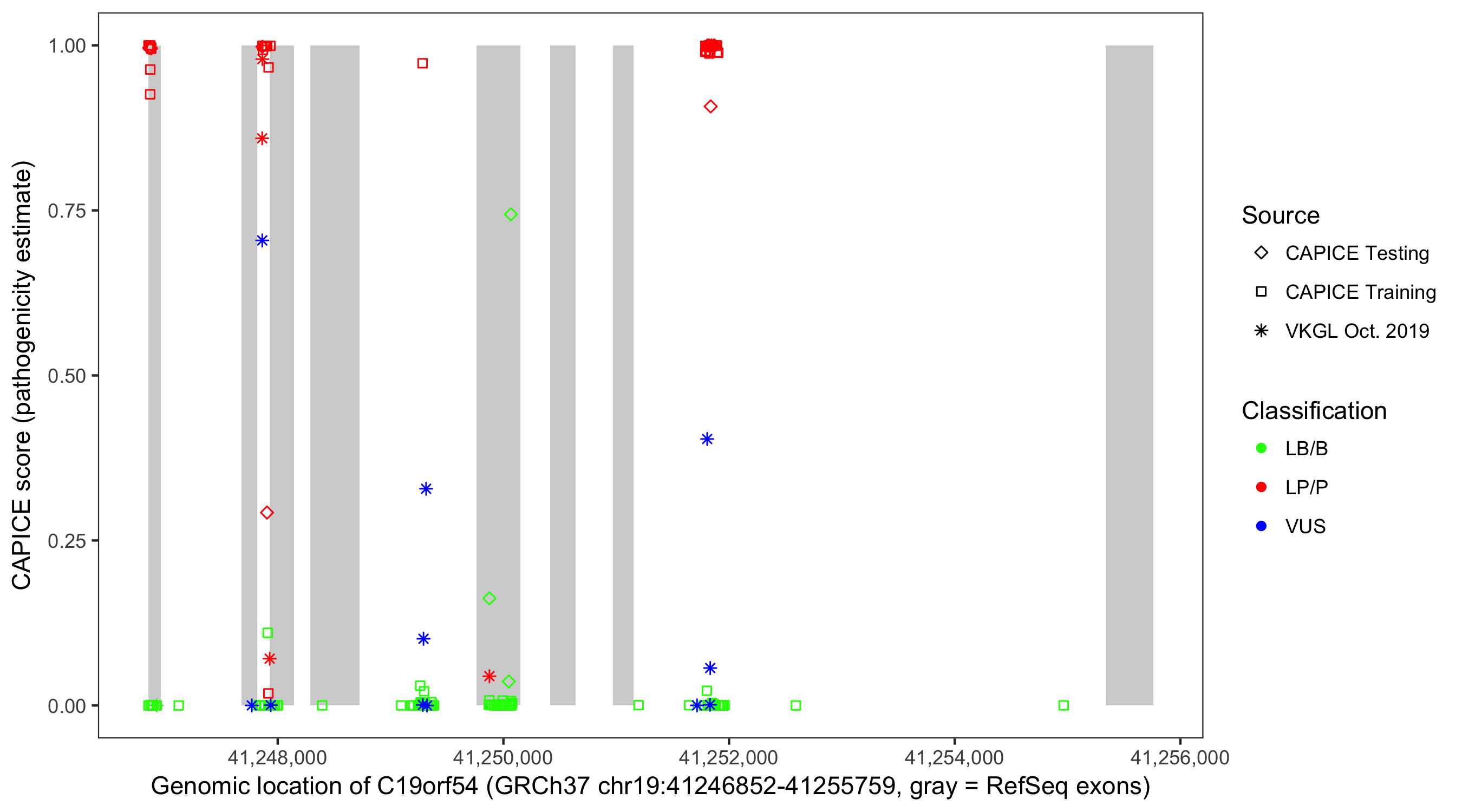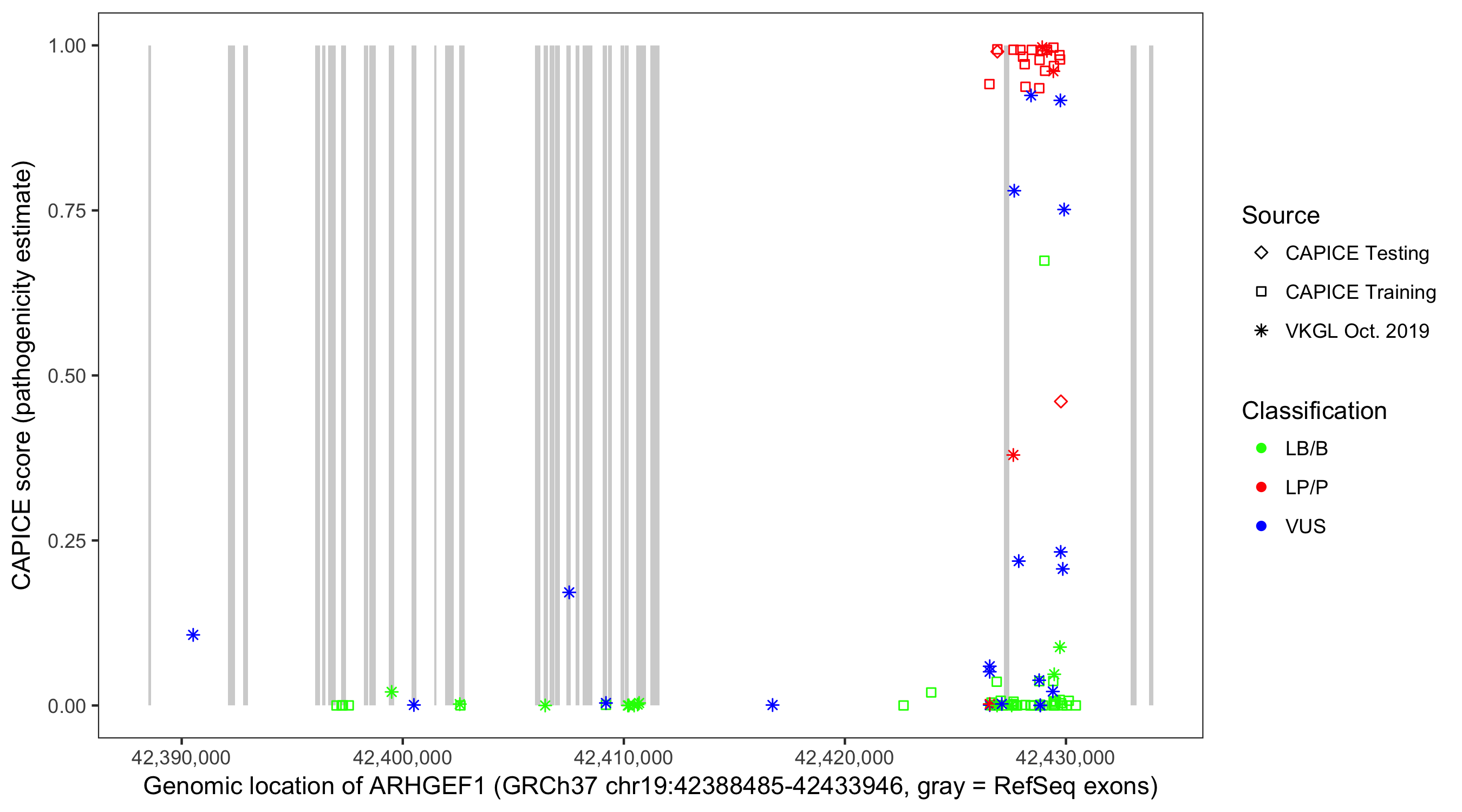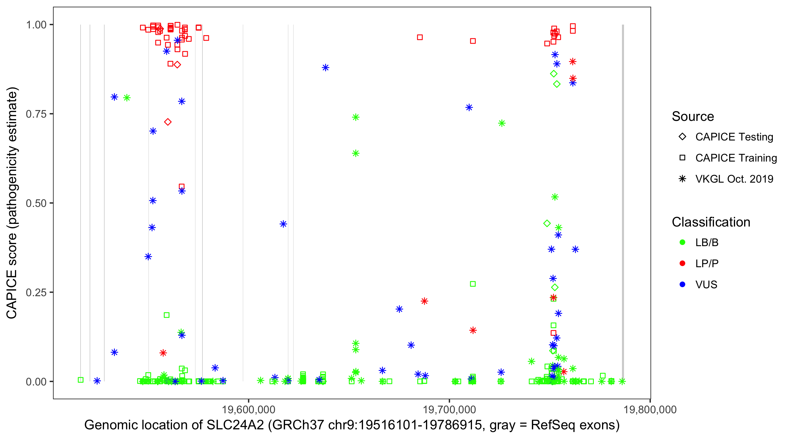 Shown are CAPICE train/test variants plus VKGL Oct 2019.
