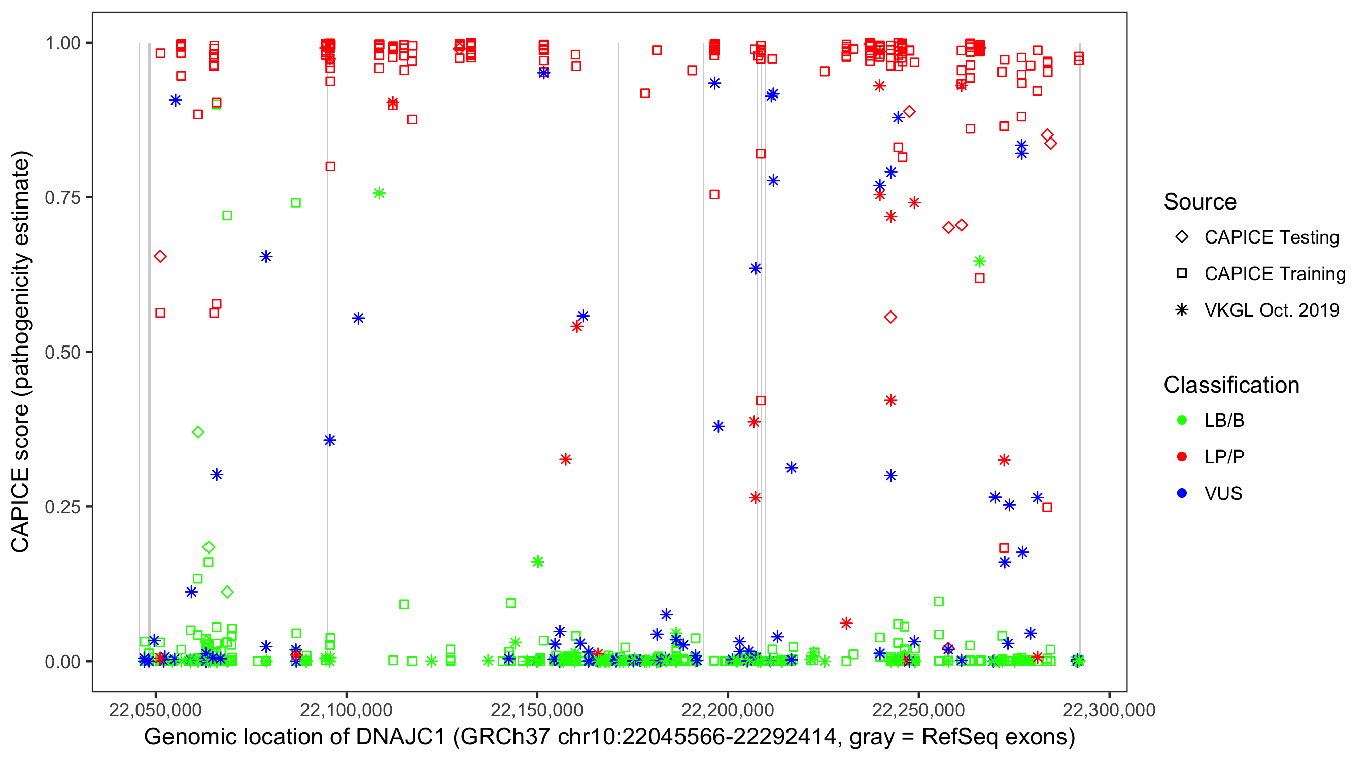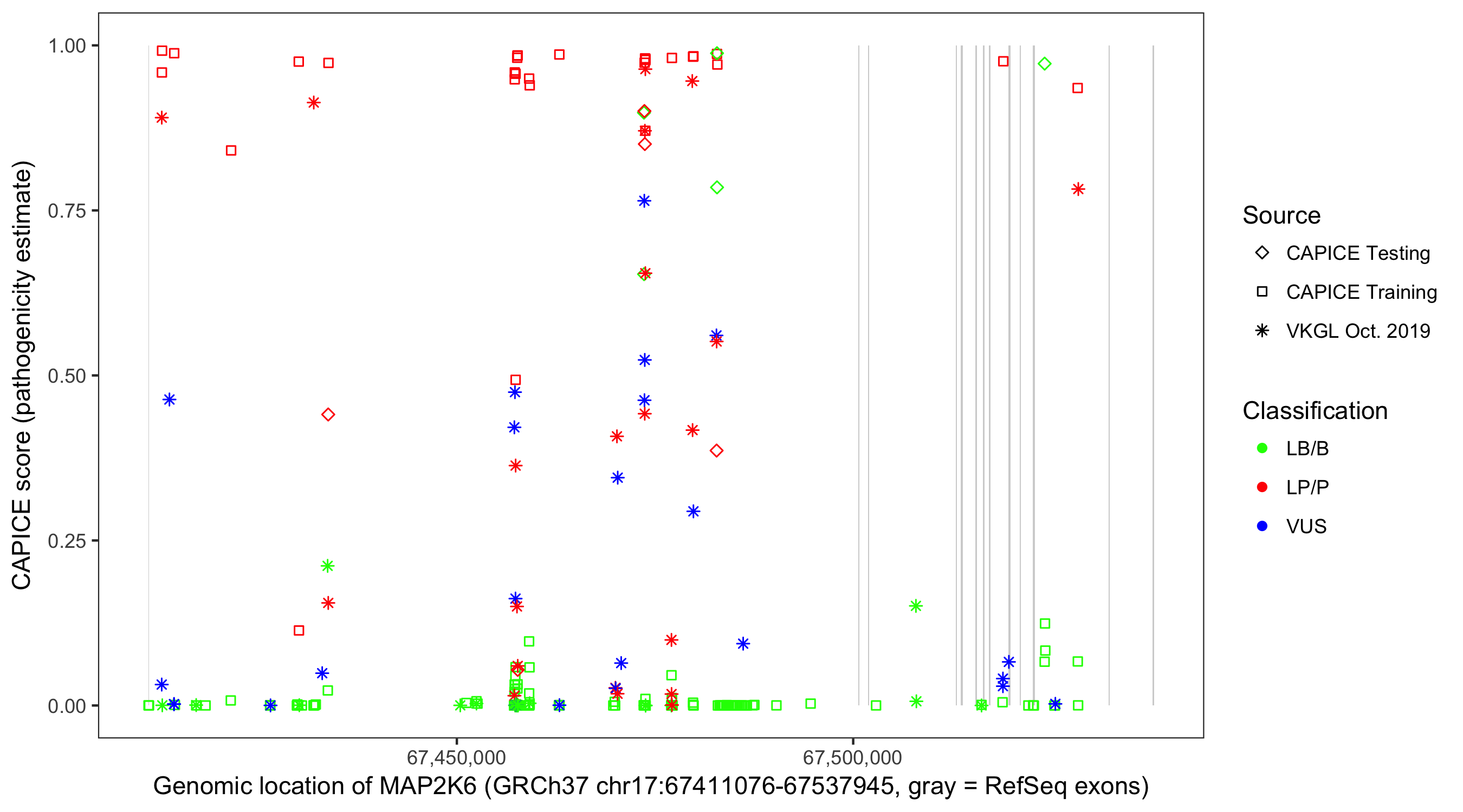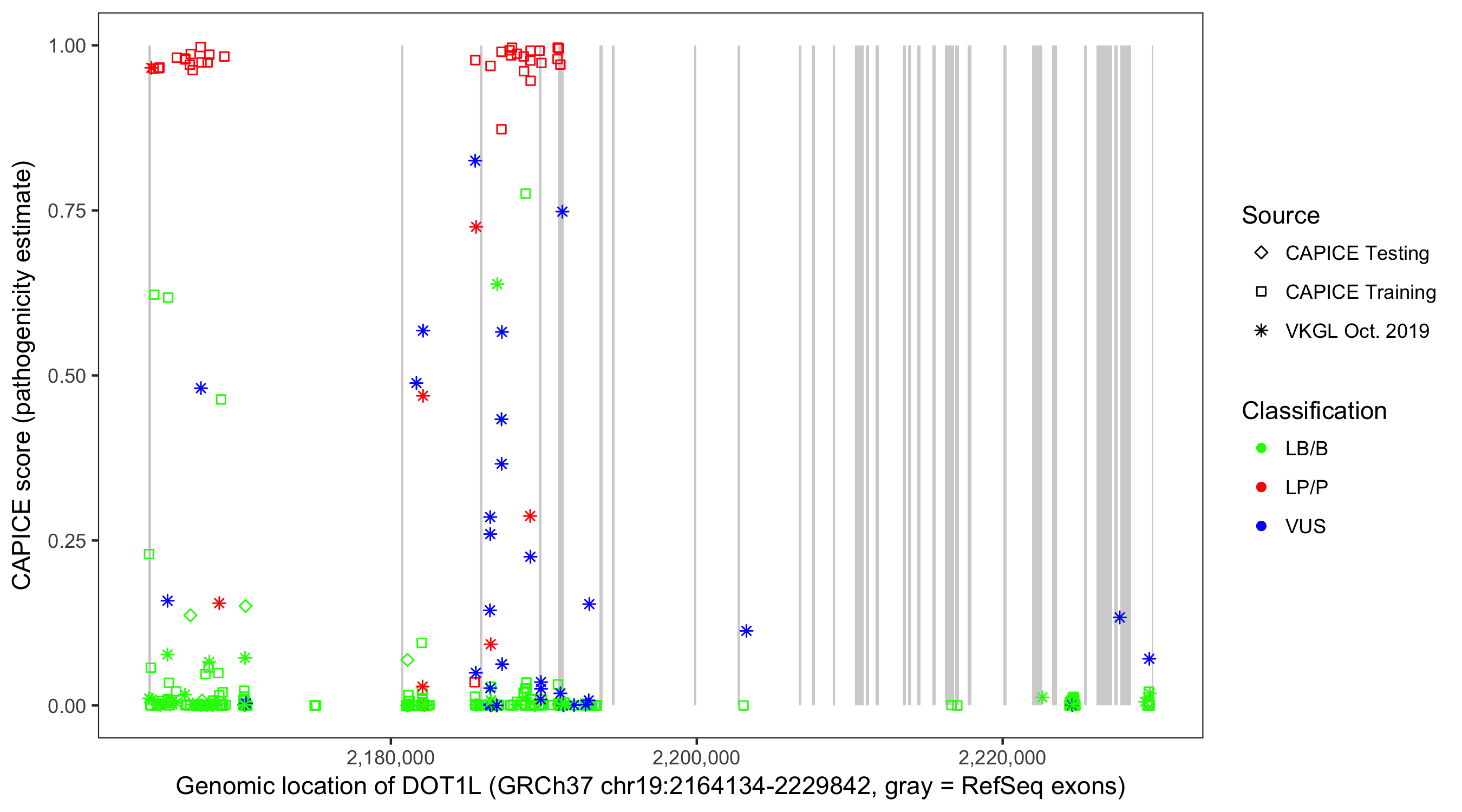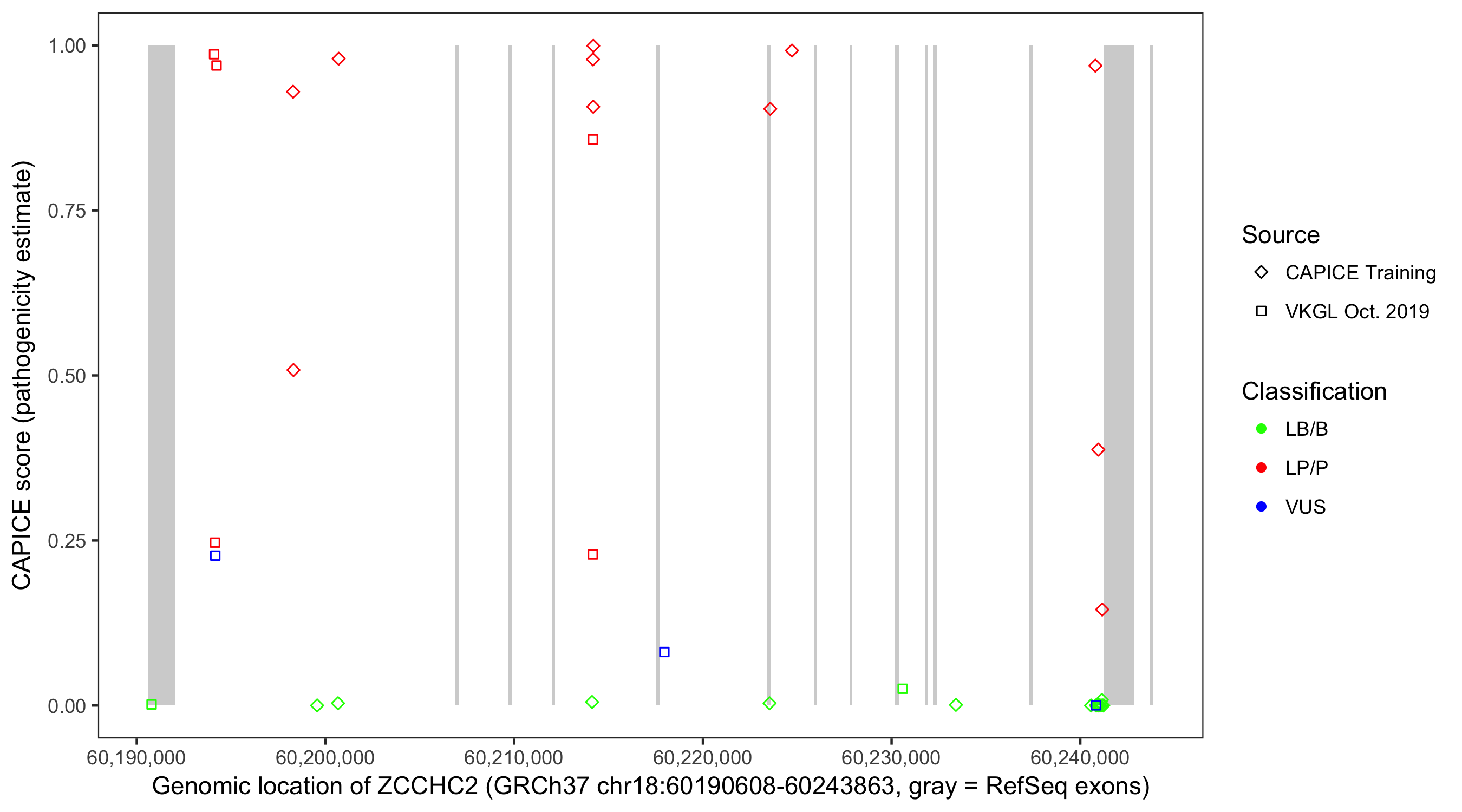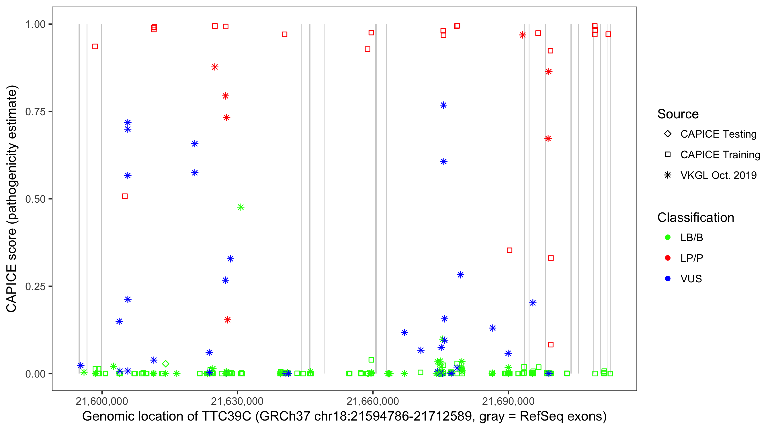 Shown are CAPICE train/test variants plus VKGL Oct 2019.