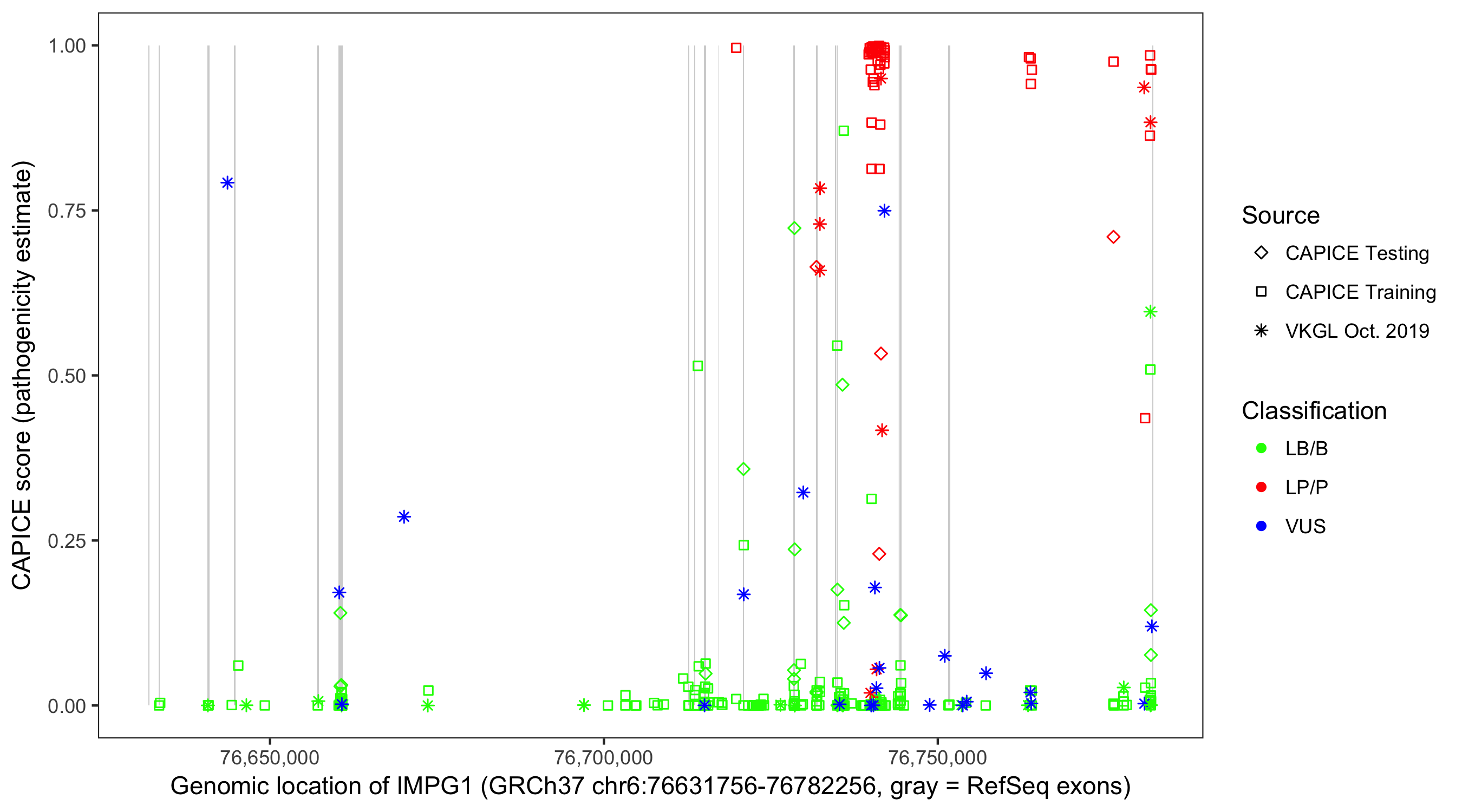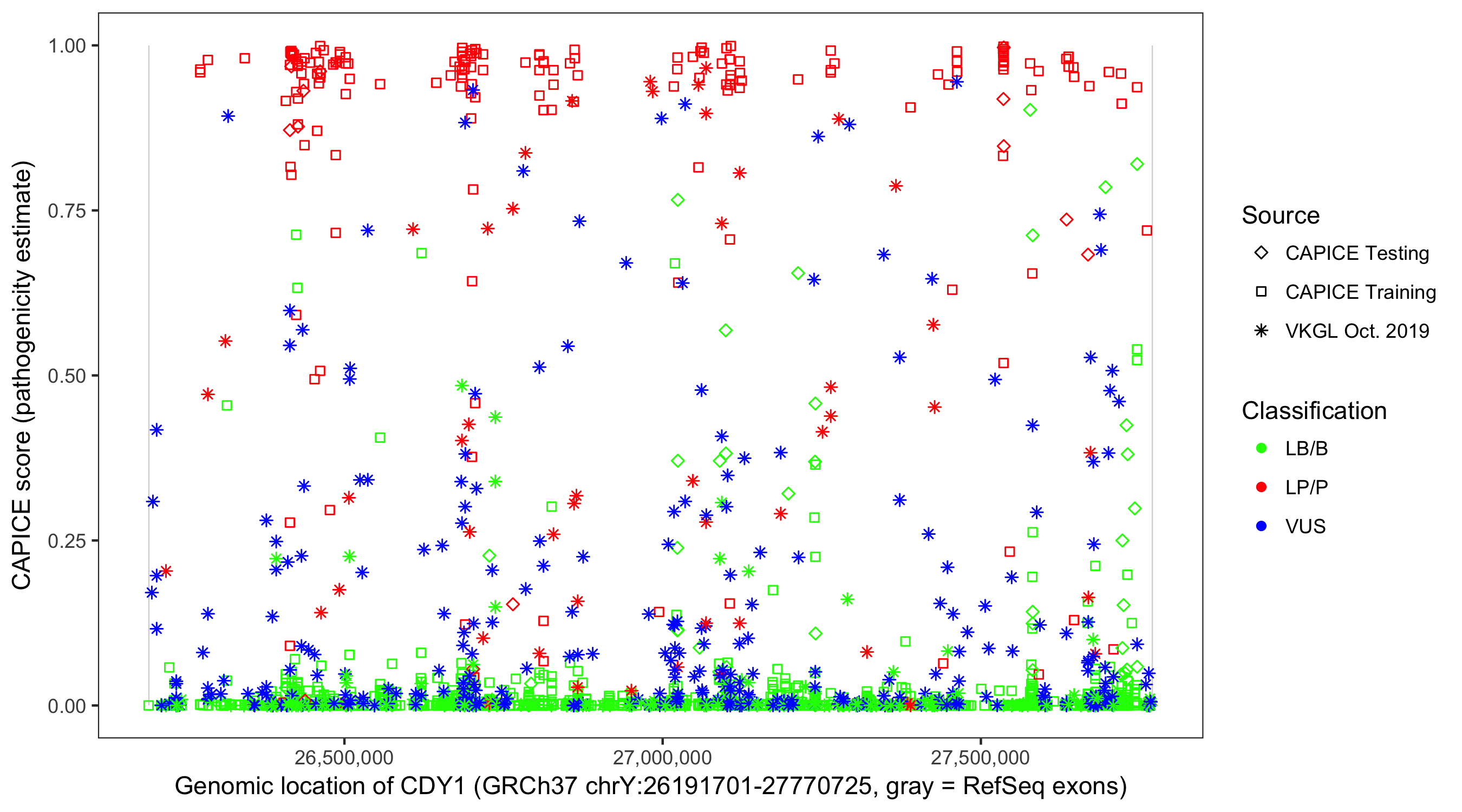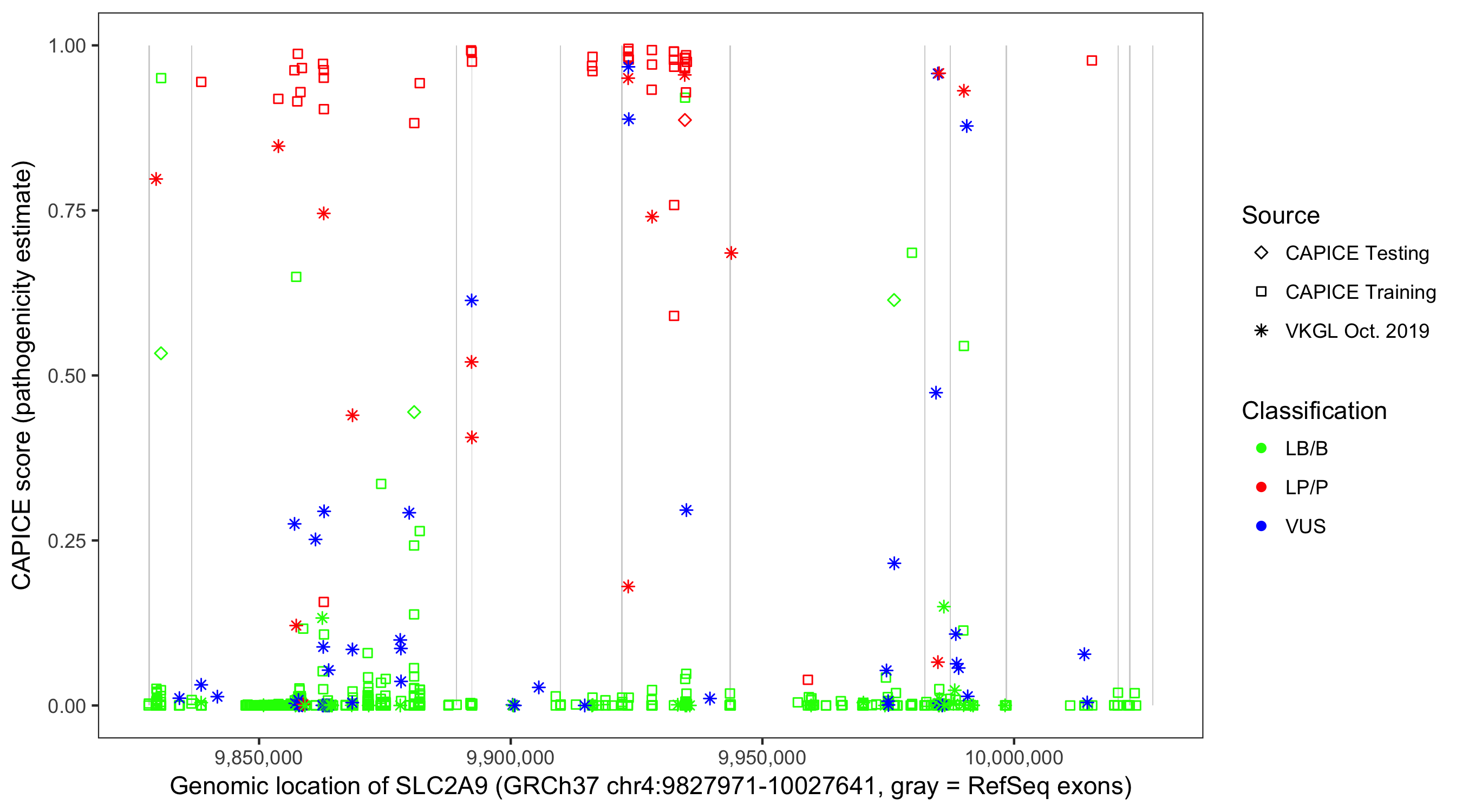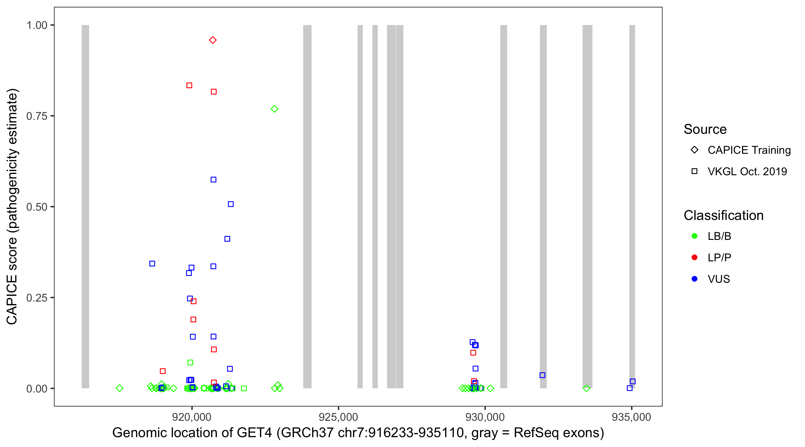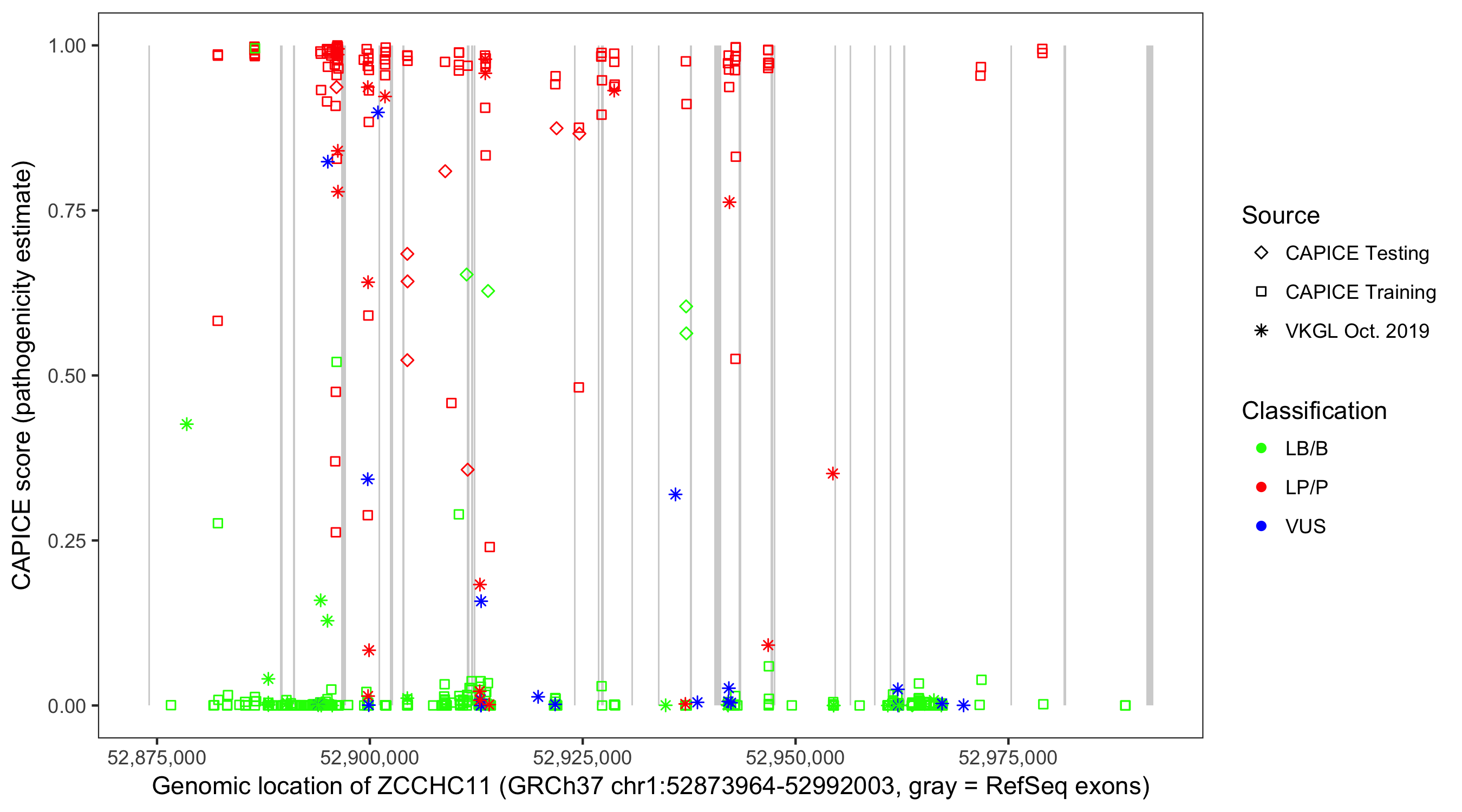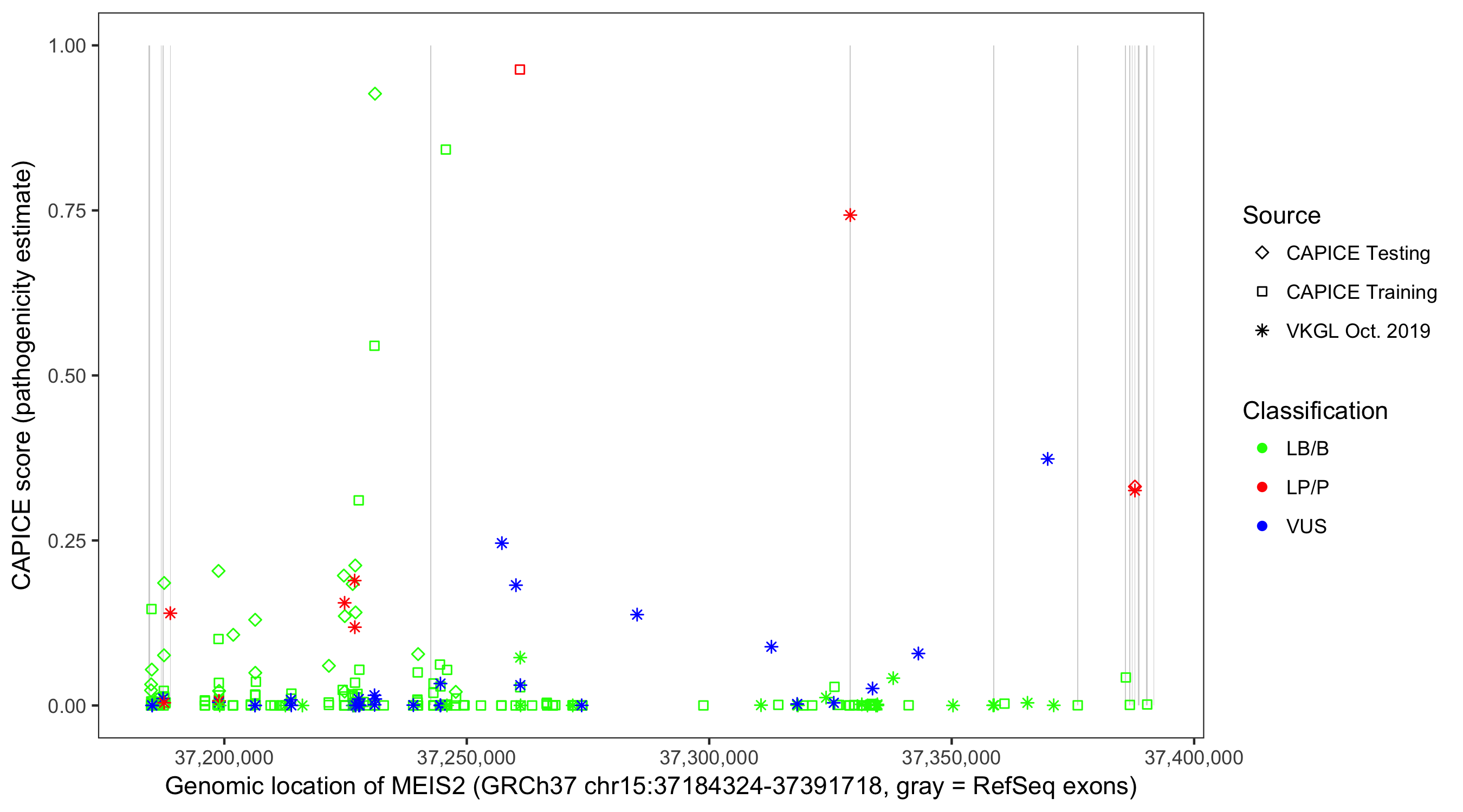 Shown are CAPICE train/test variants plus VKGL Oct 2019.