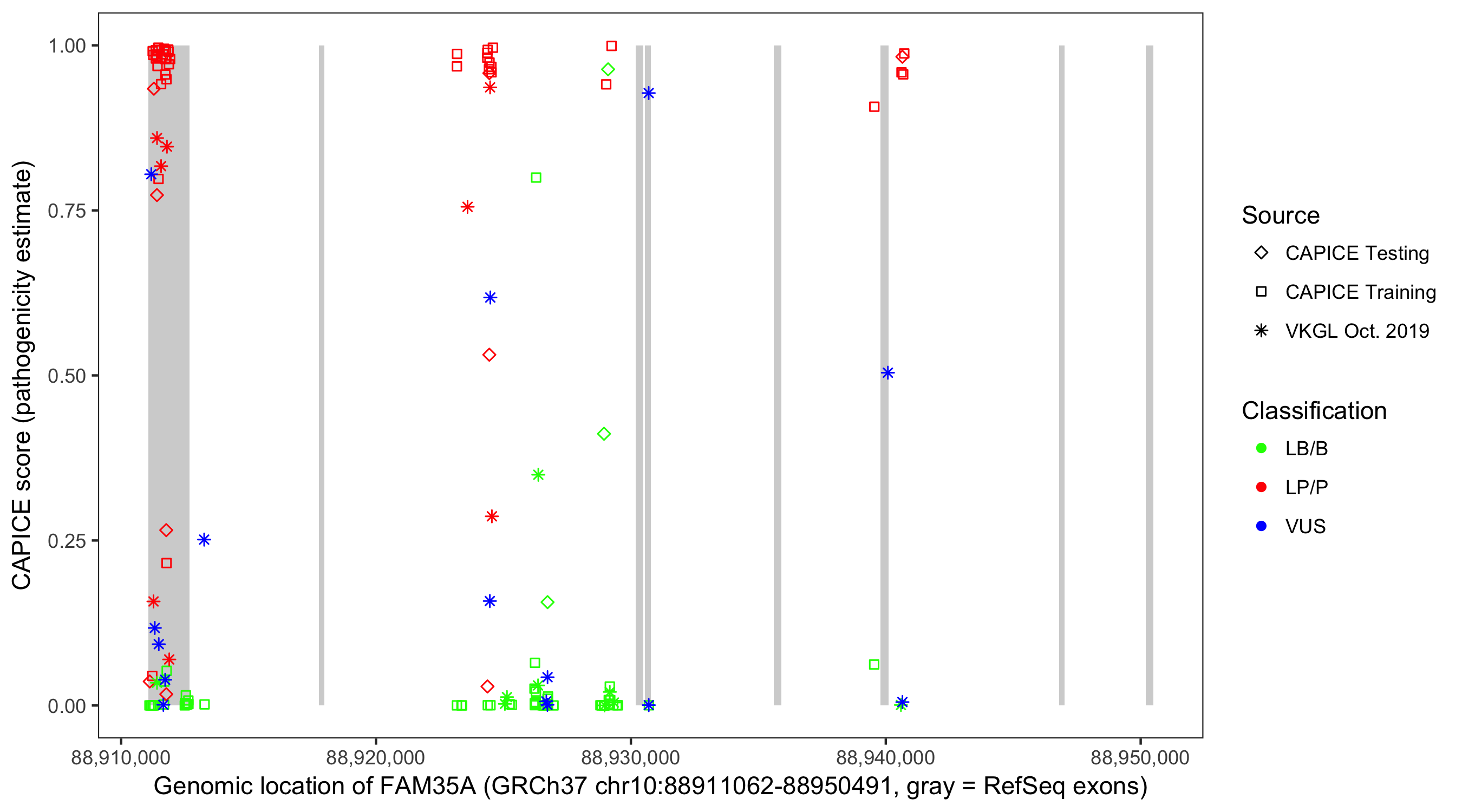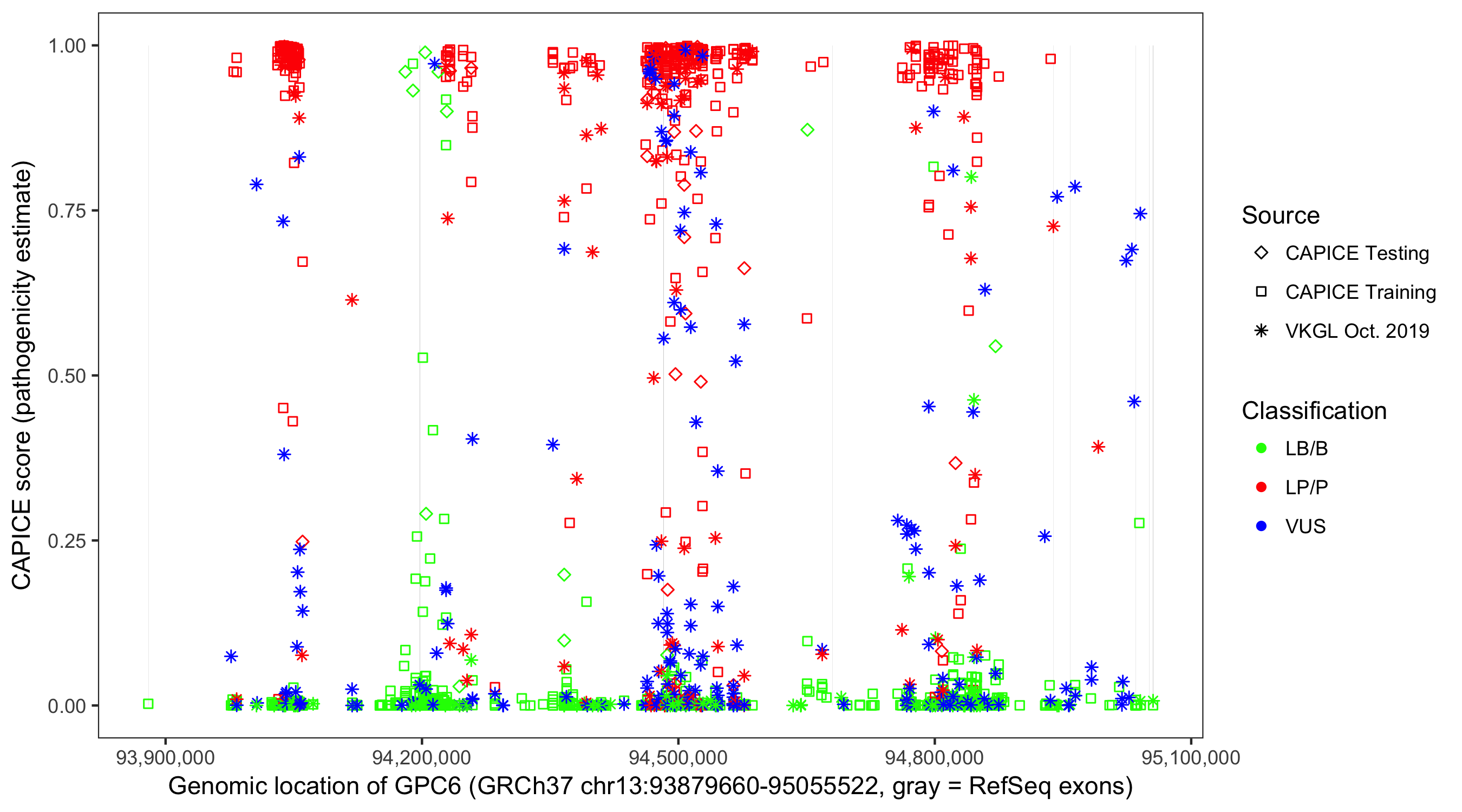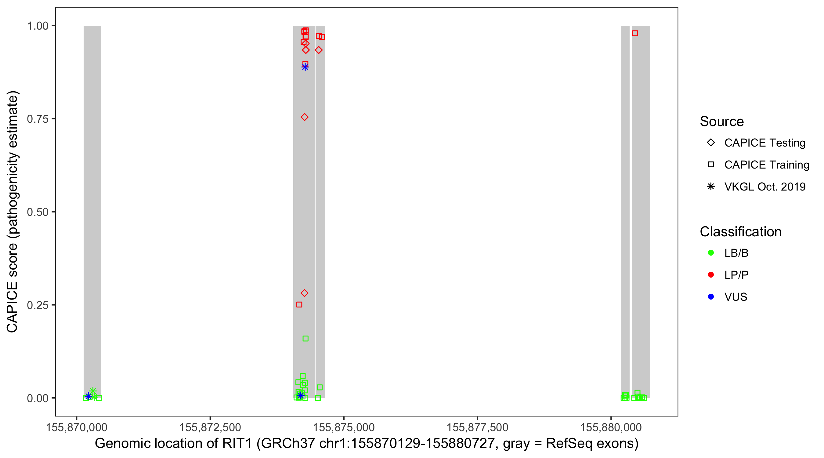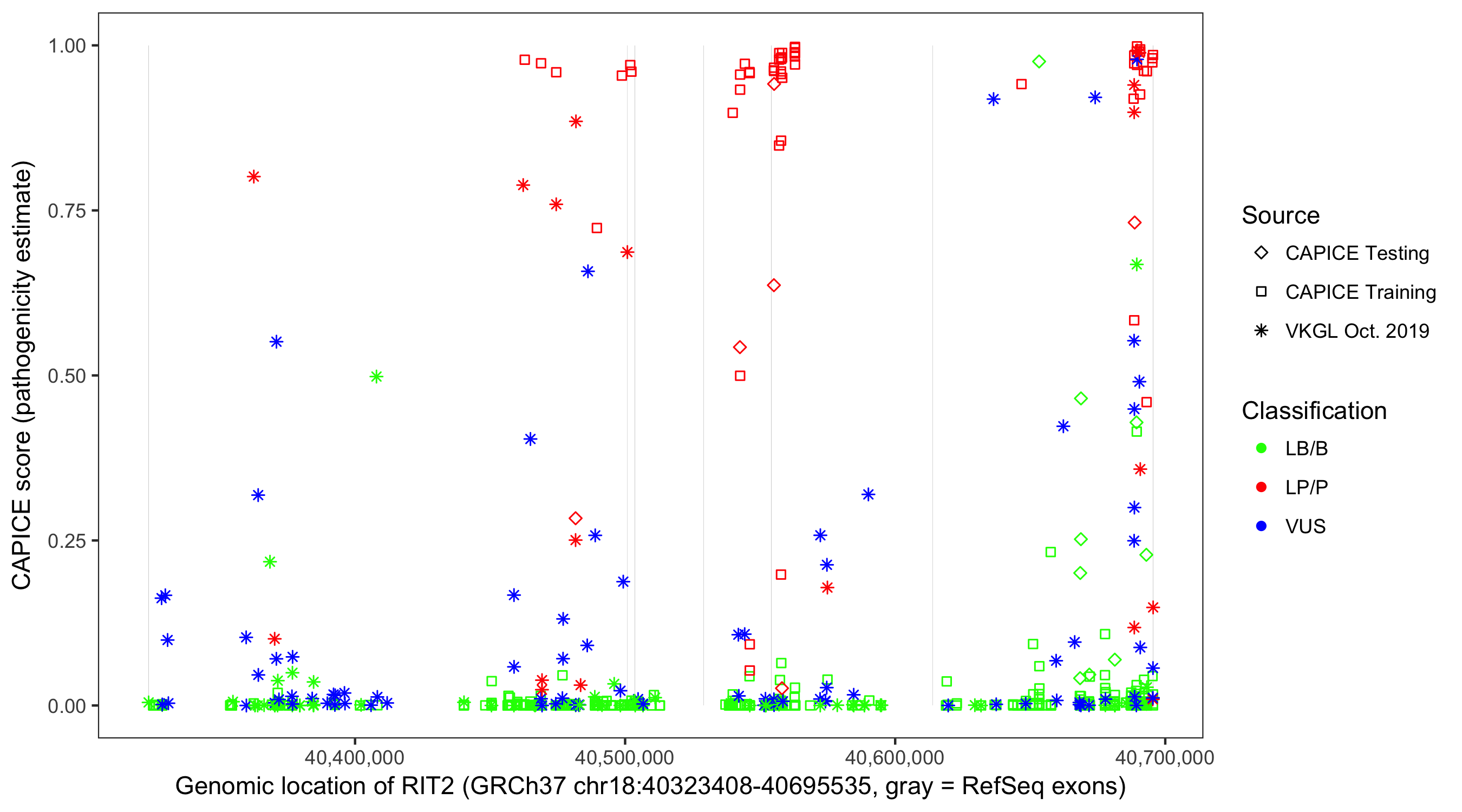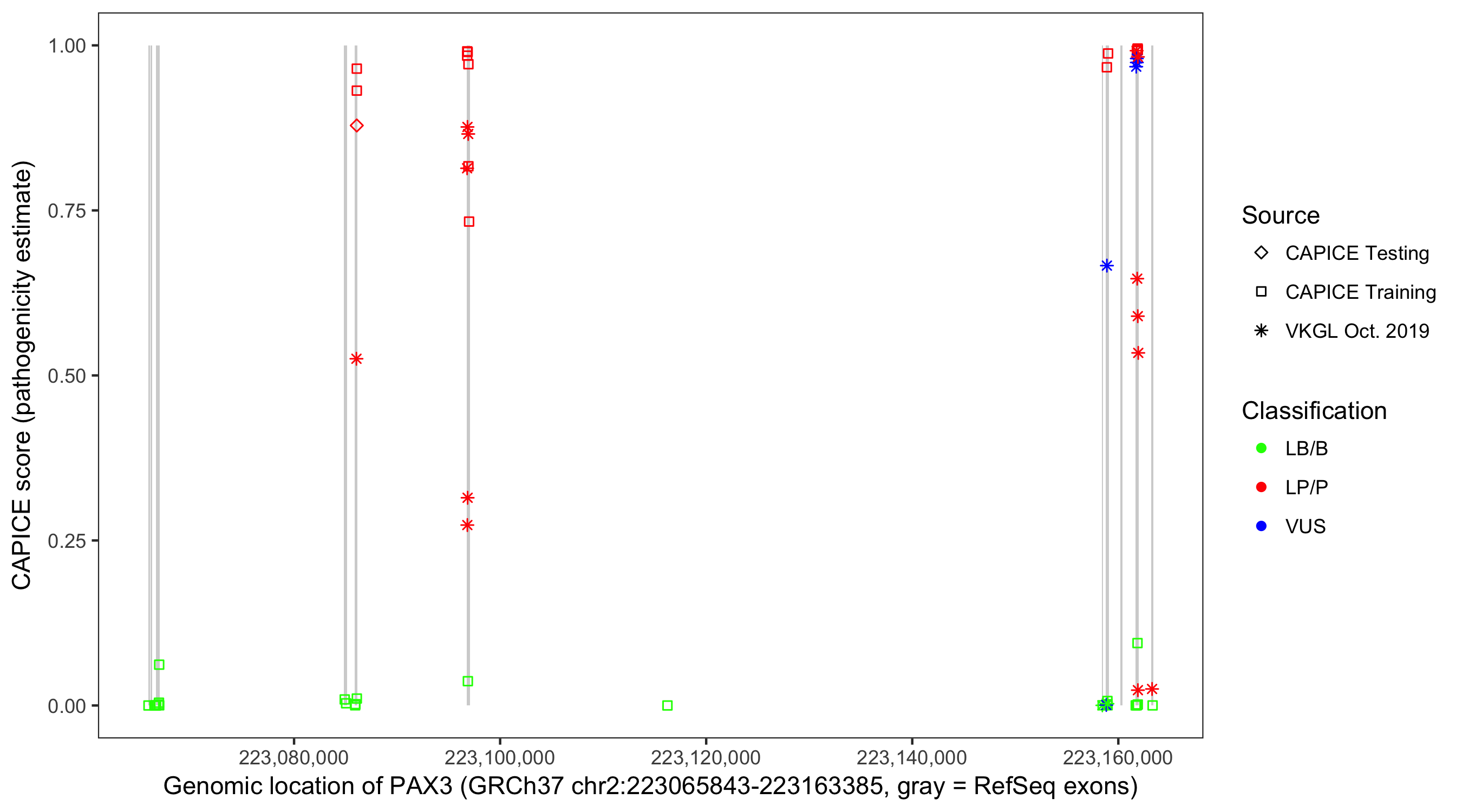 Shown are CAPICE train/test variants plus VKGL Oct 2019.