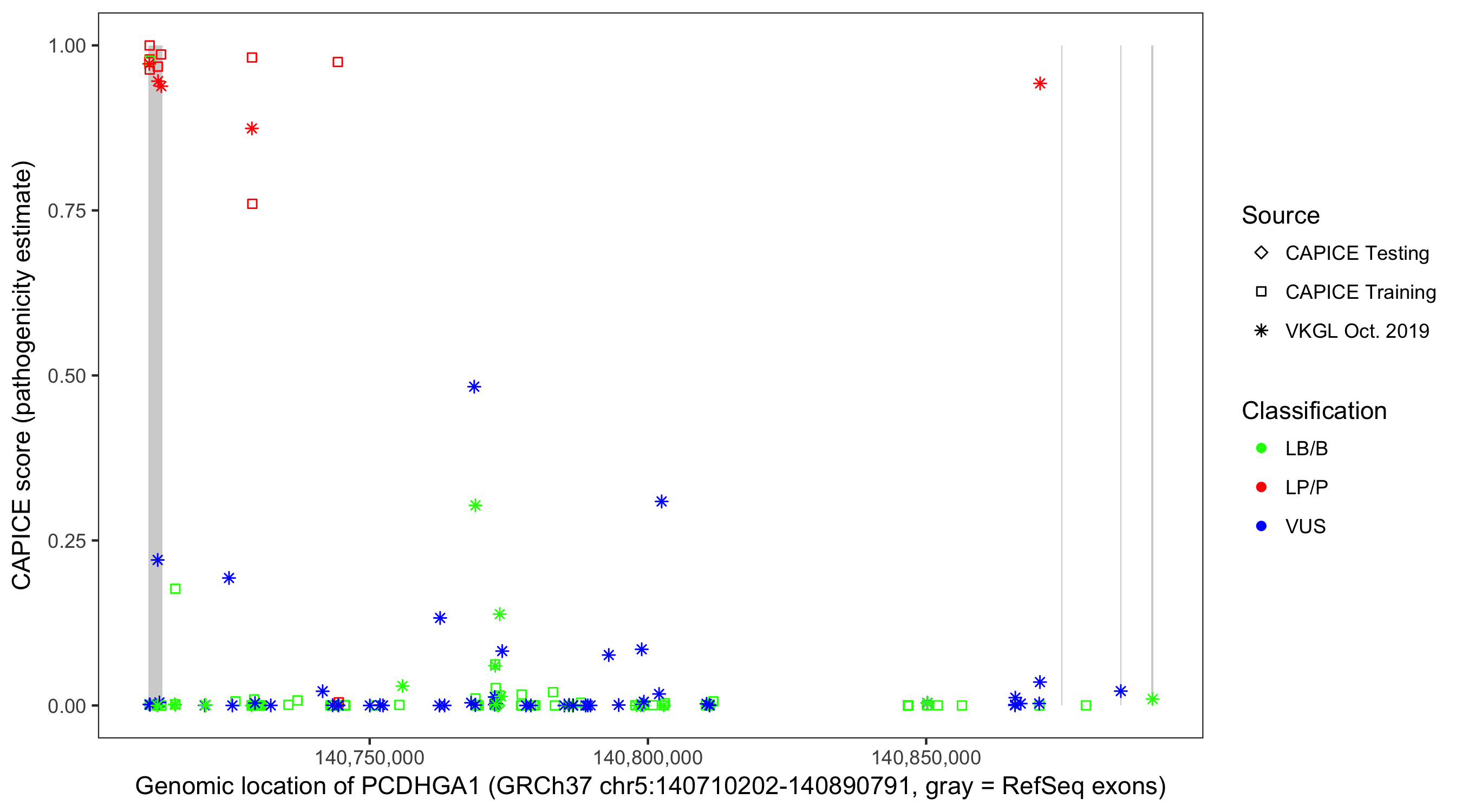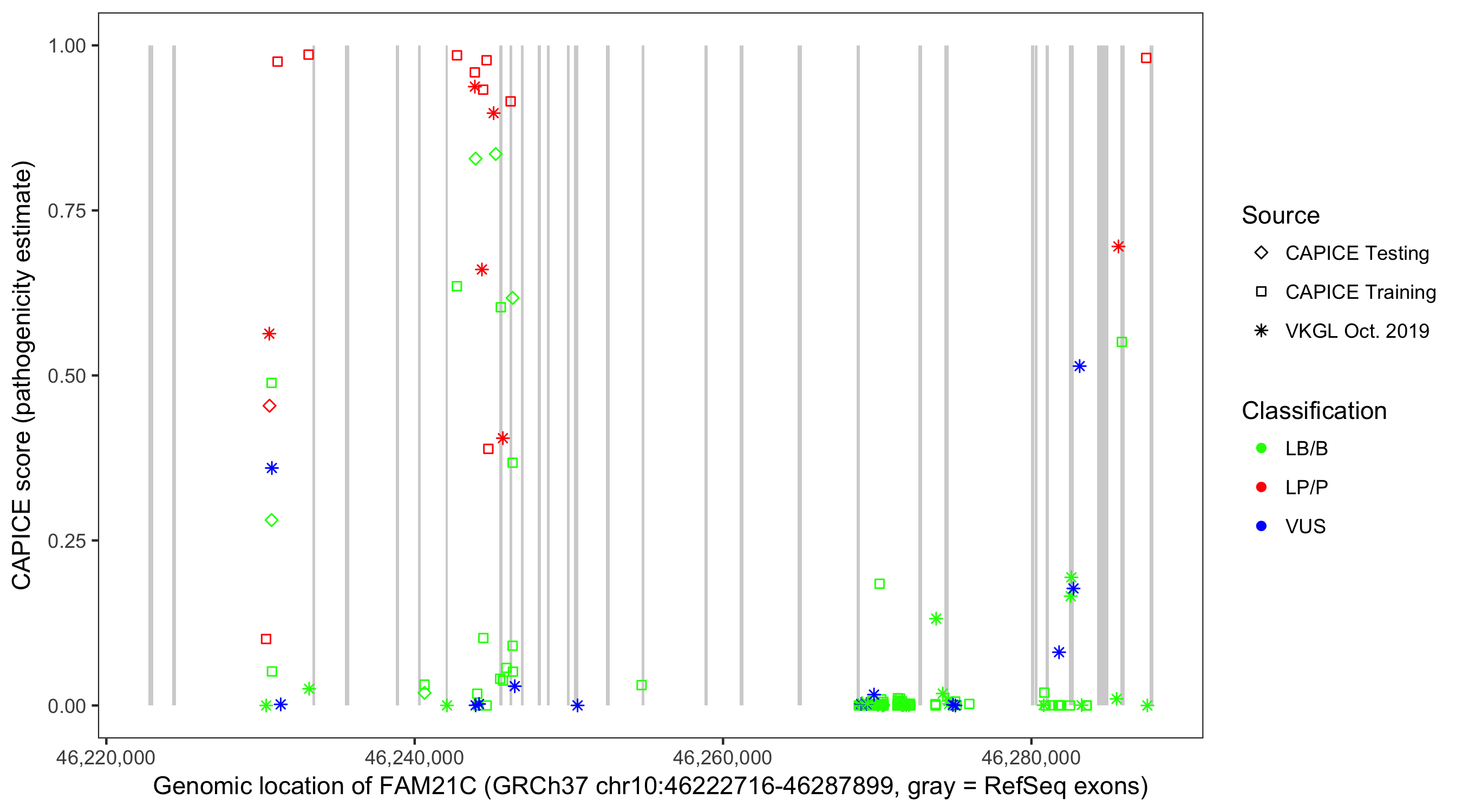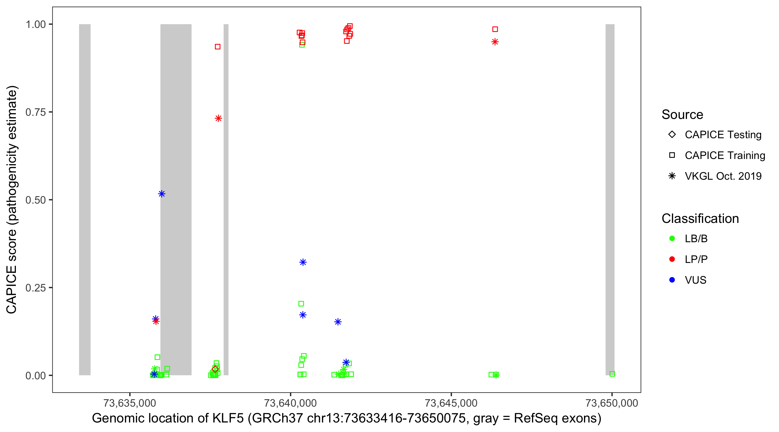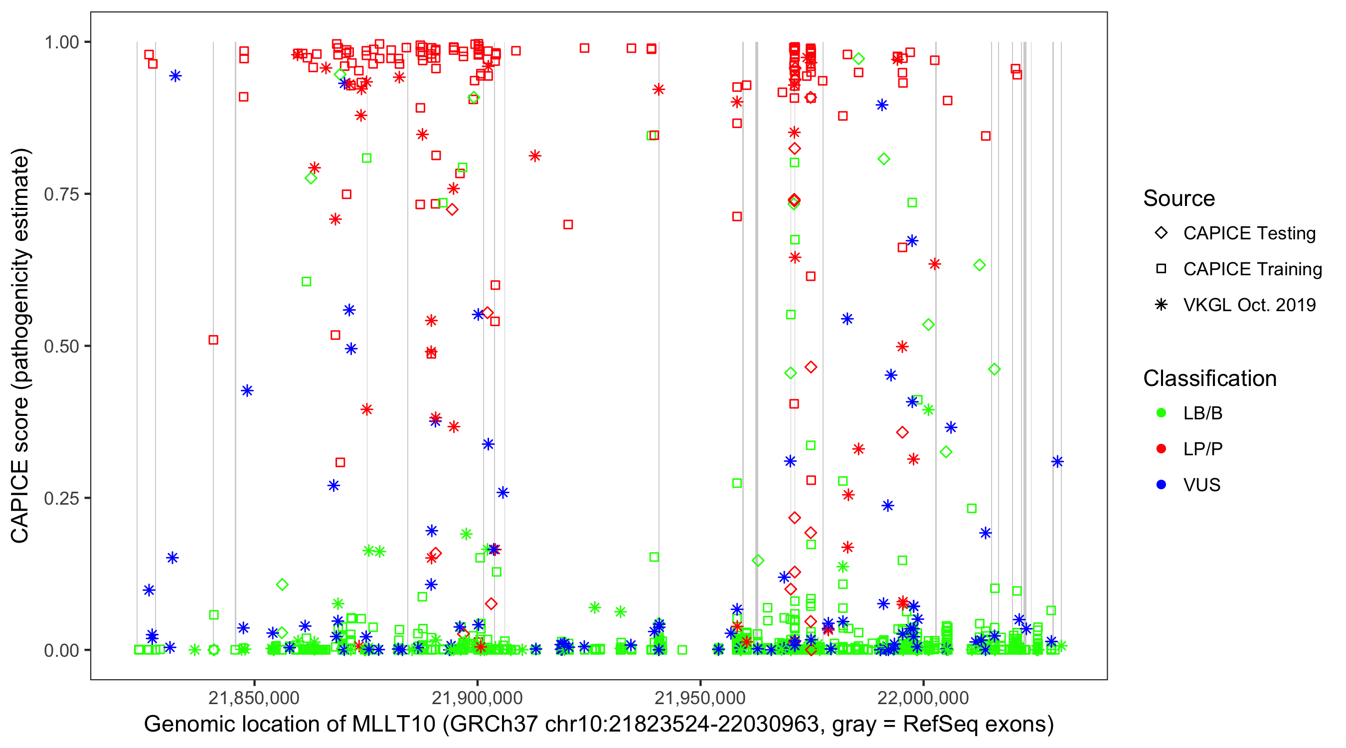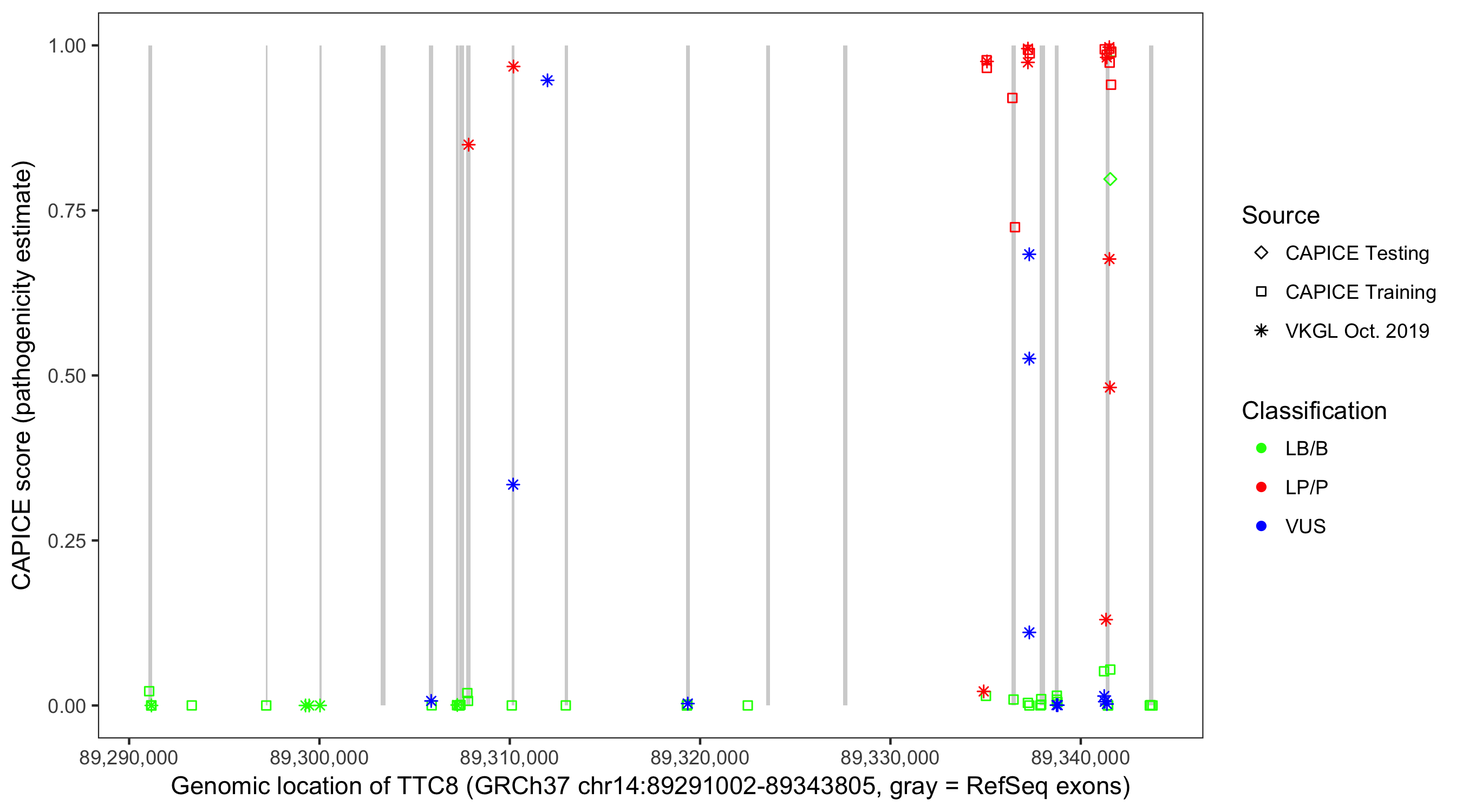 Shown are CAPICE train/test variants plus VKGL Oct 2019.