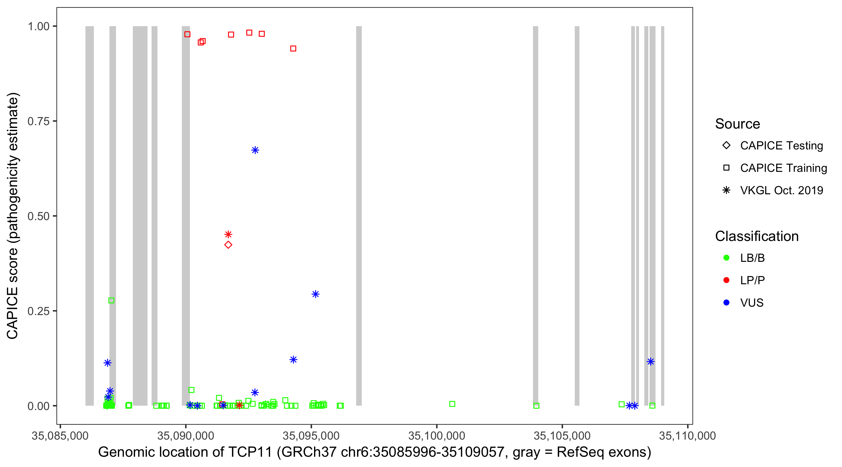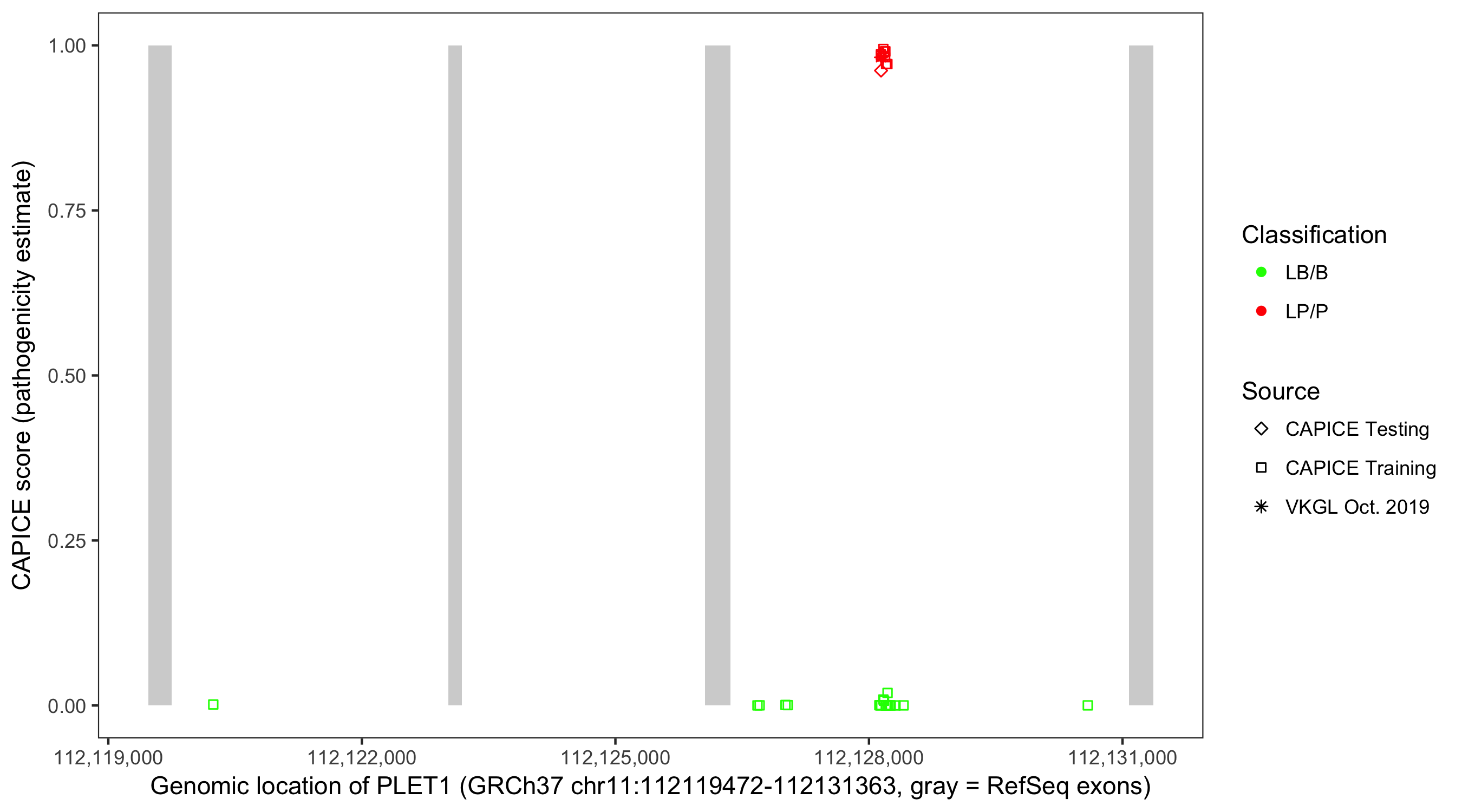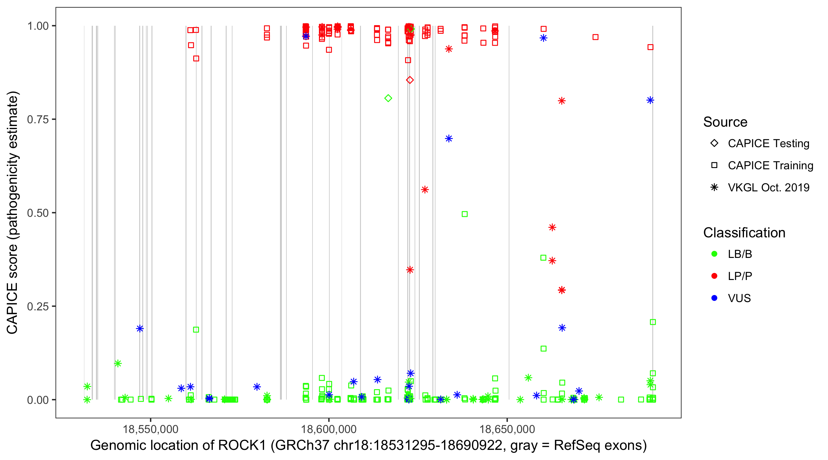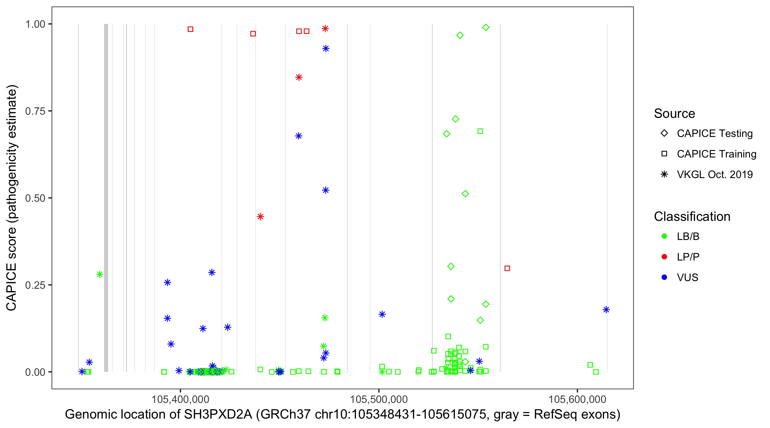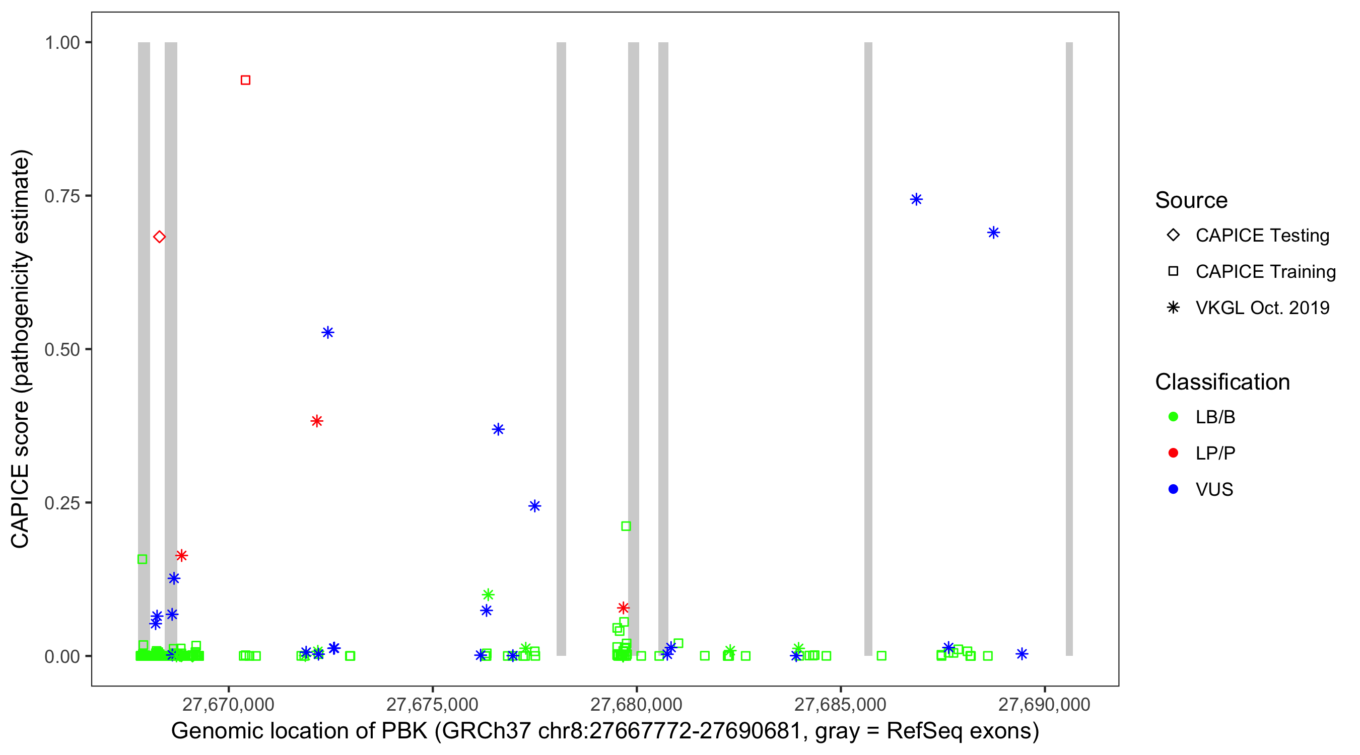 Shown are CAPICE train/test variants plus VKGL Oct 2019.