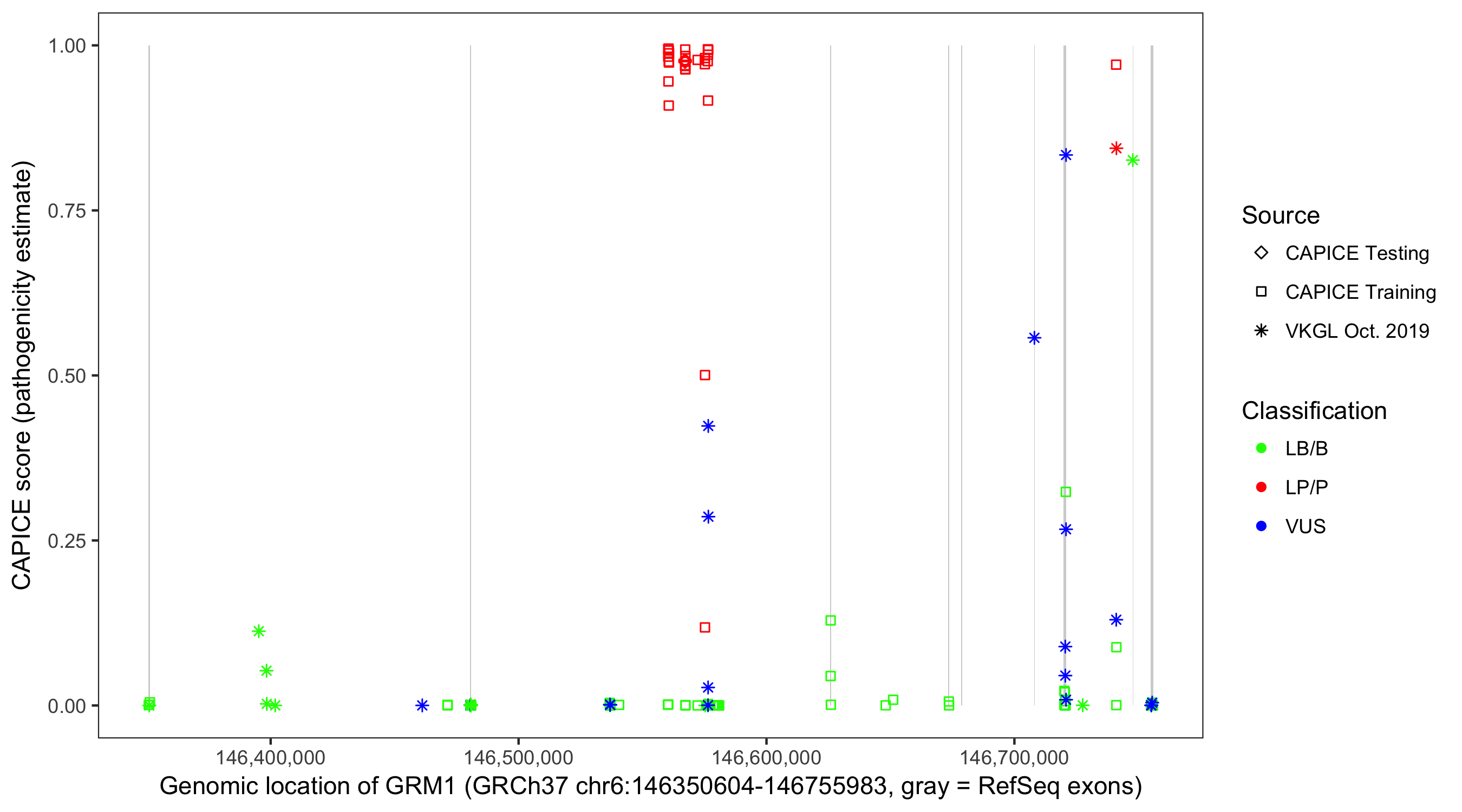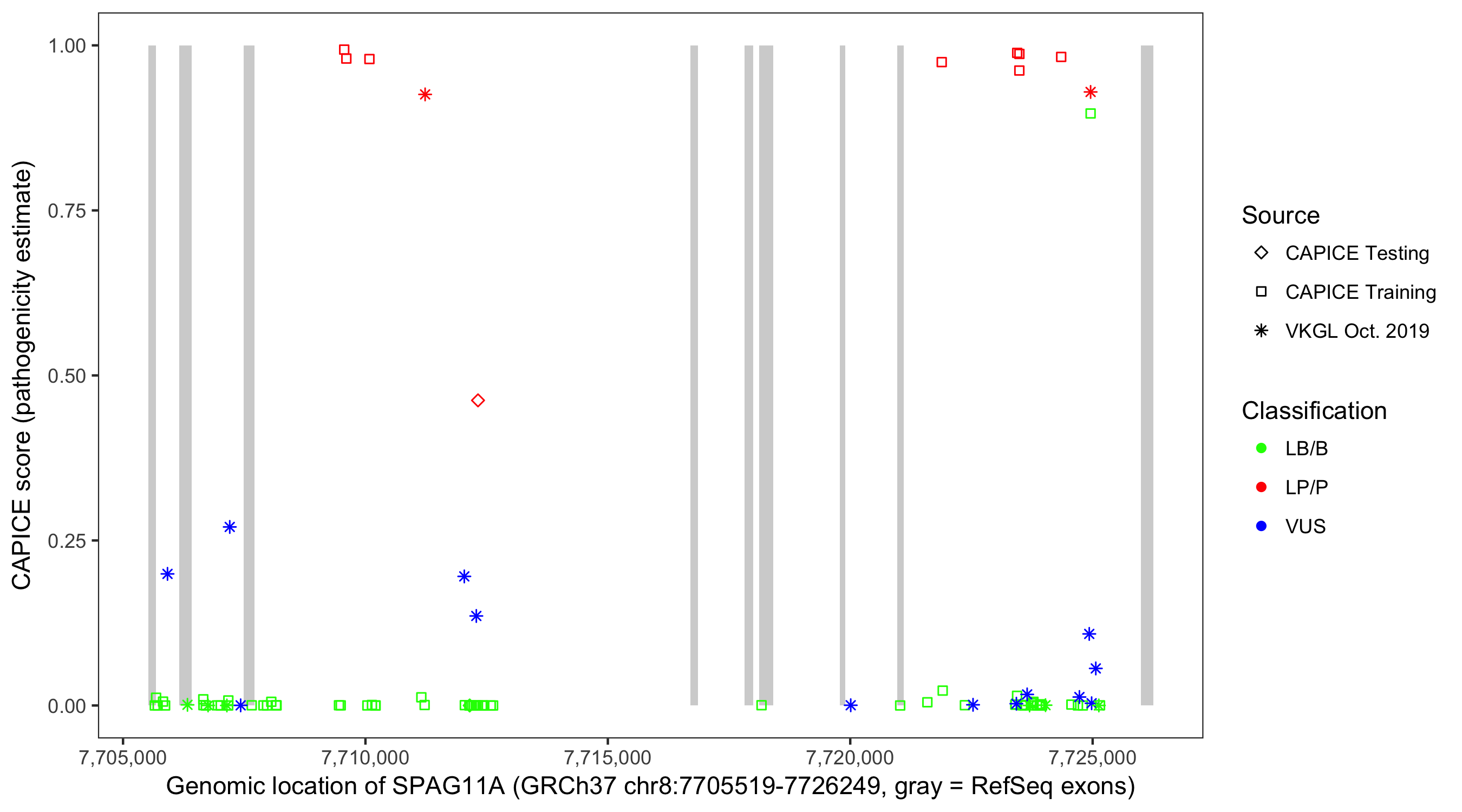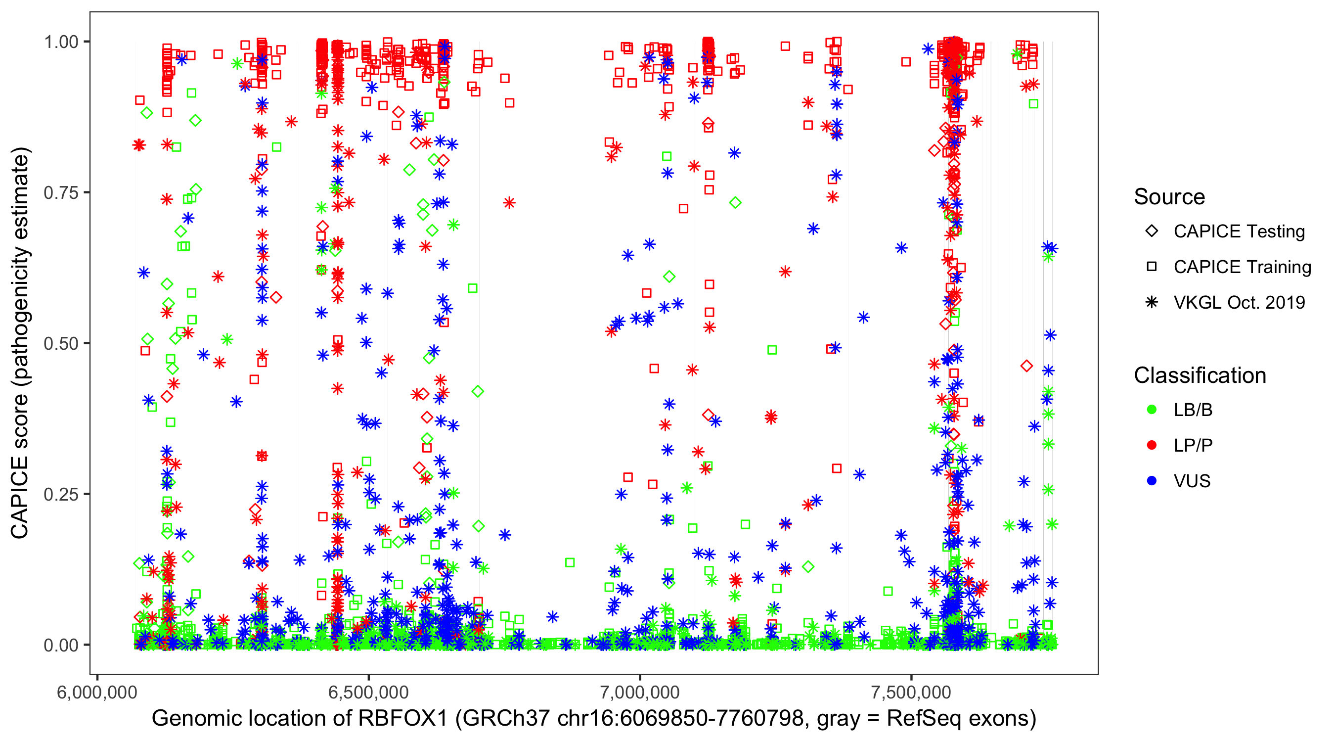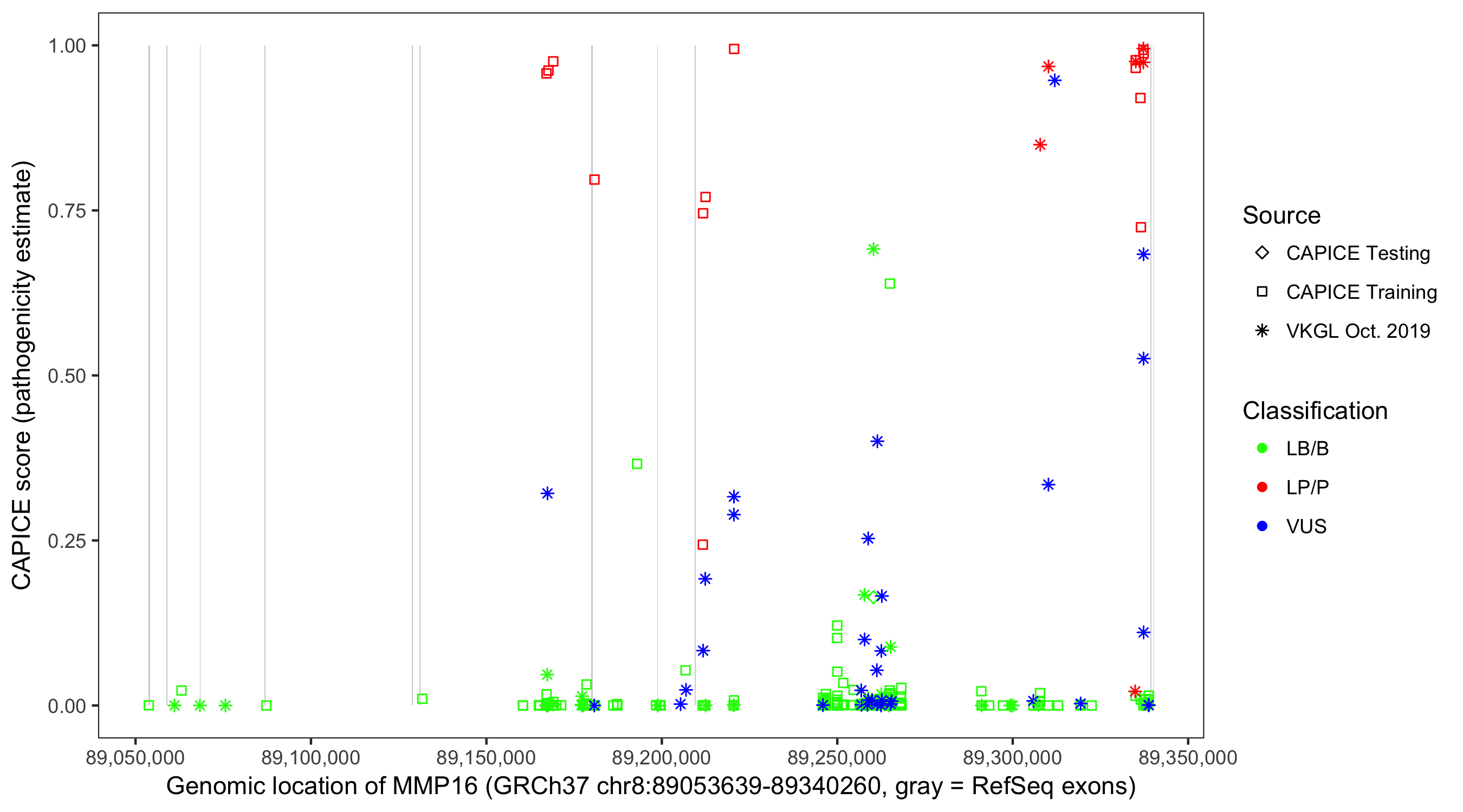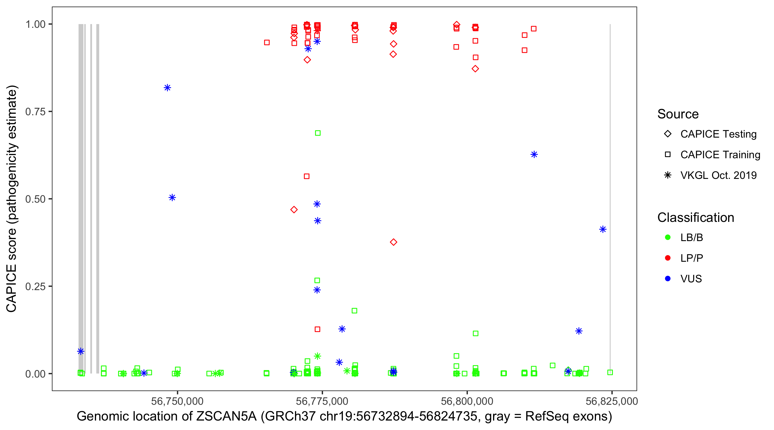 Shown are CAPICE train/test variants plus VKGL Oct 2019.
