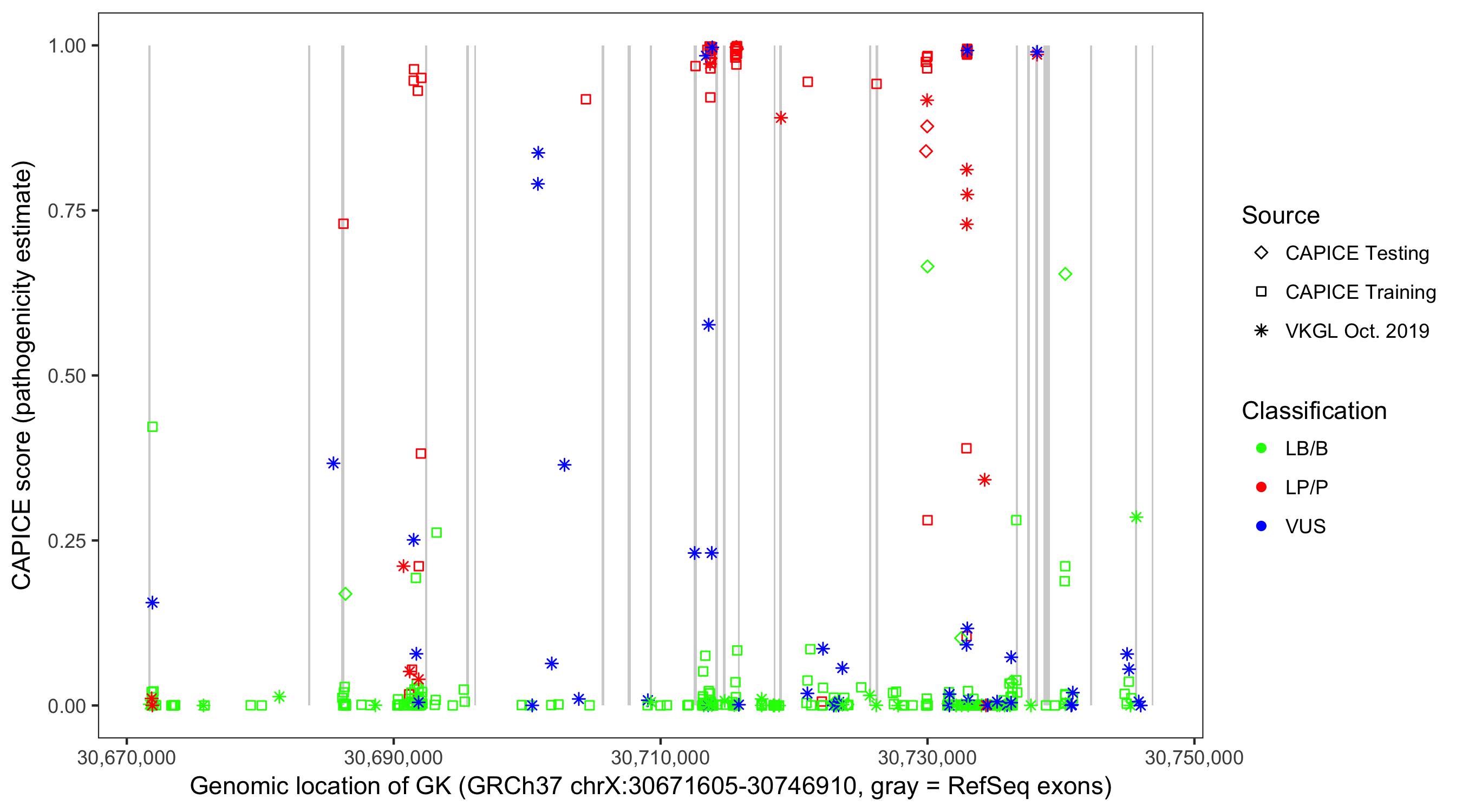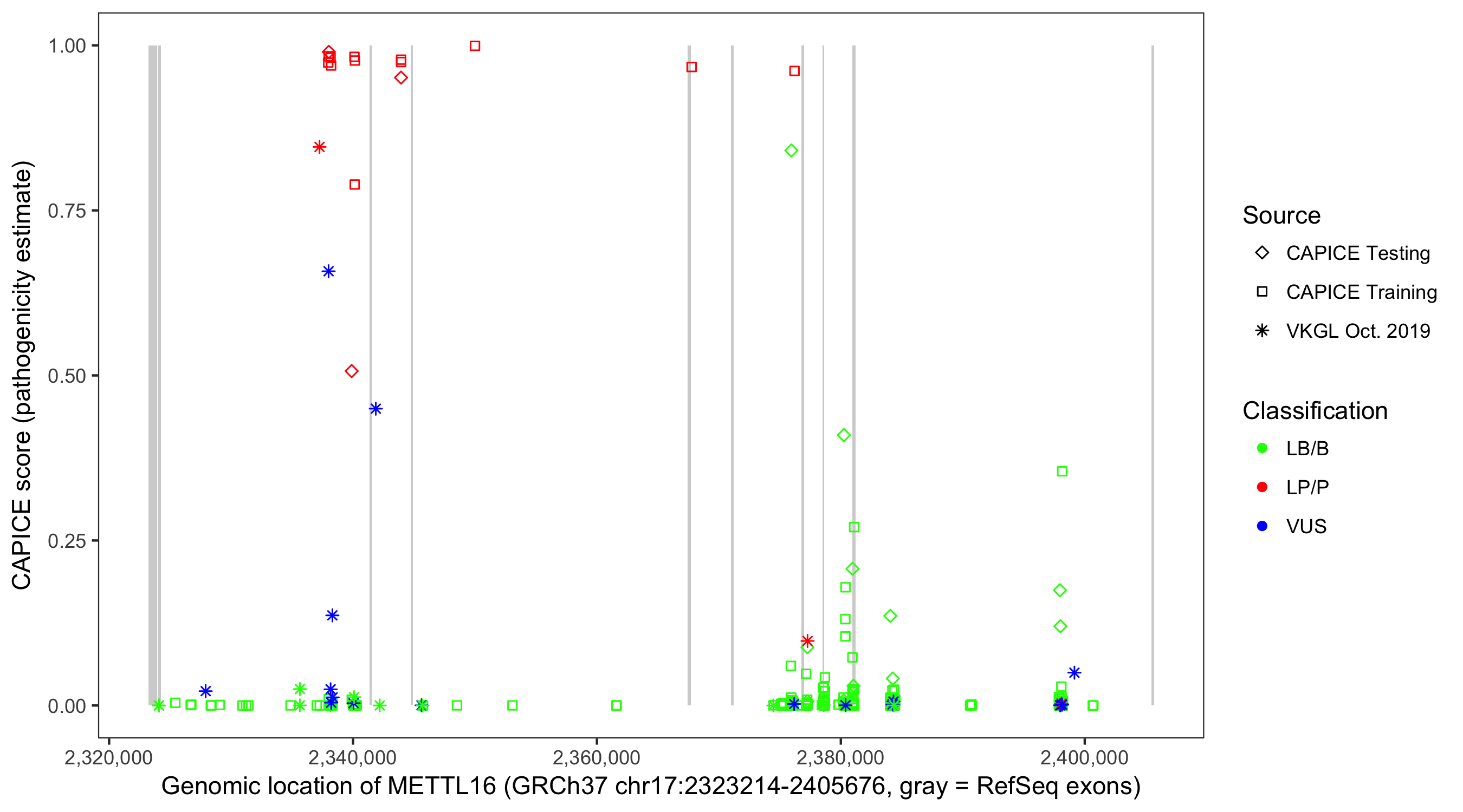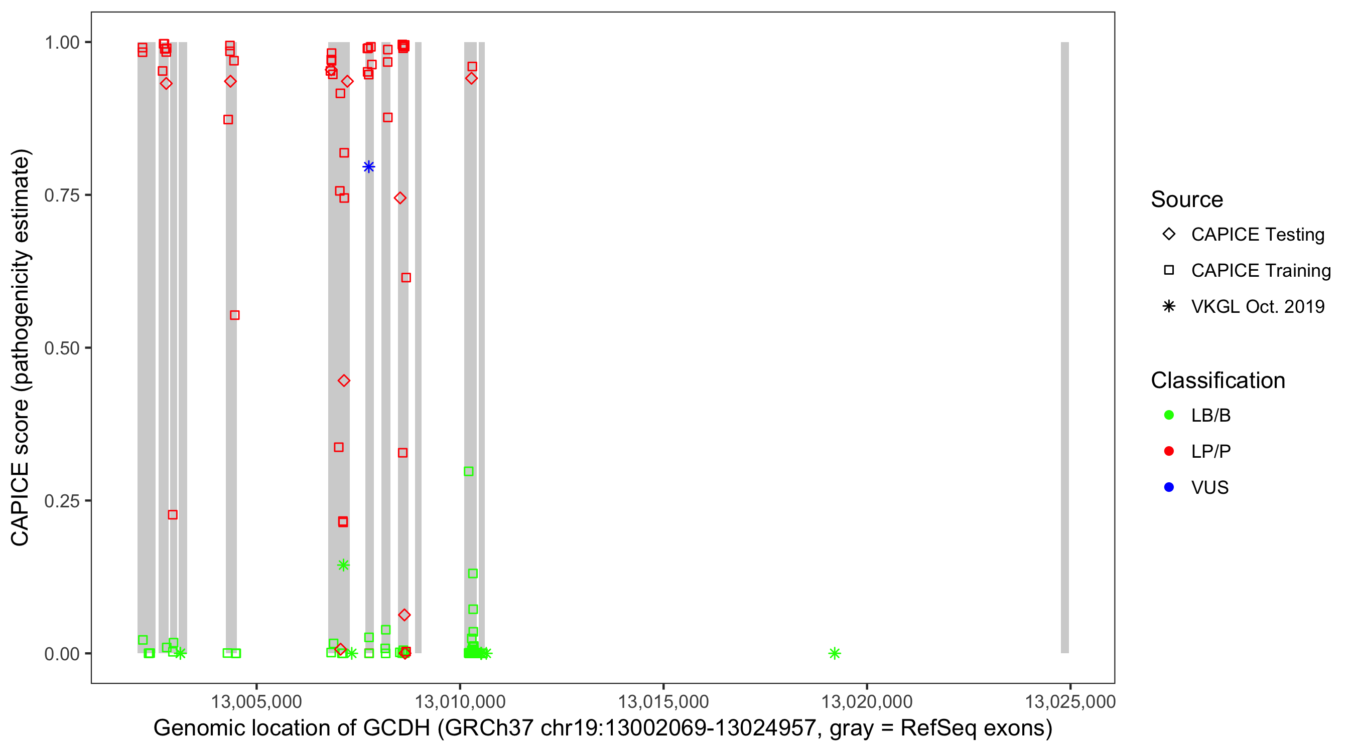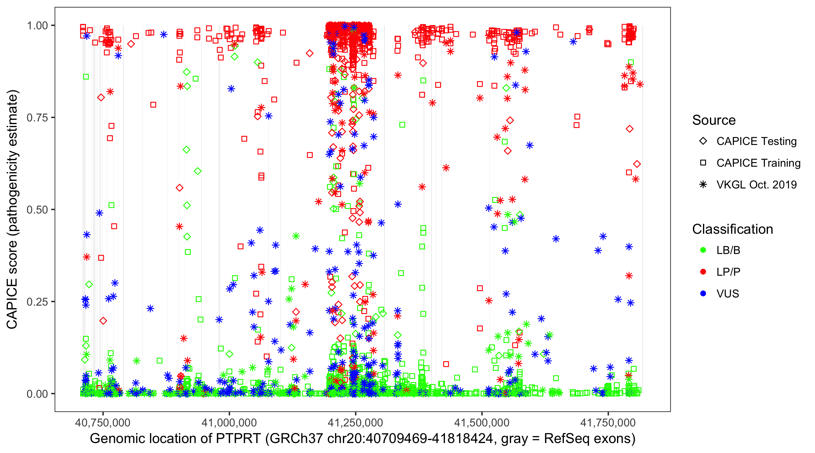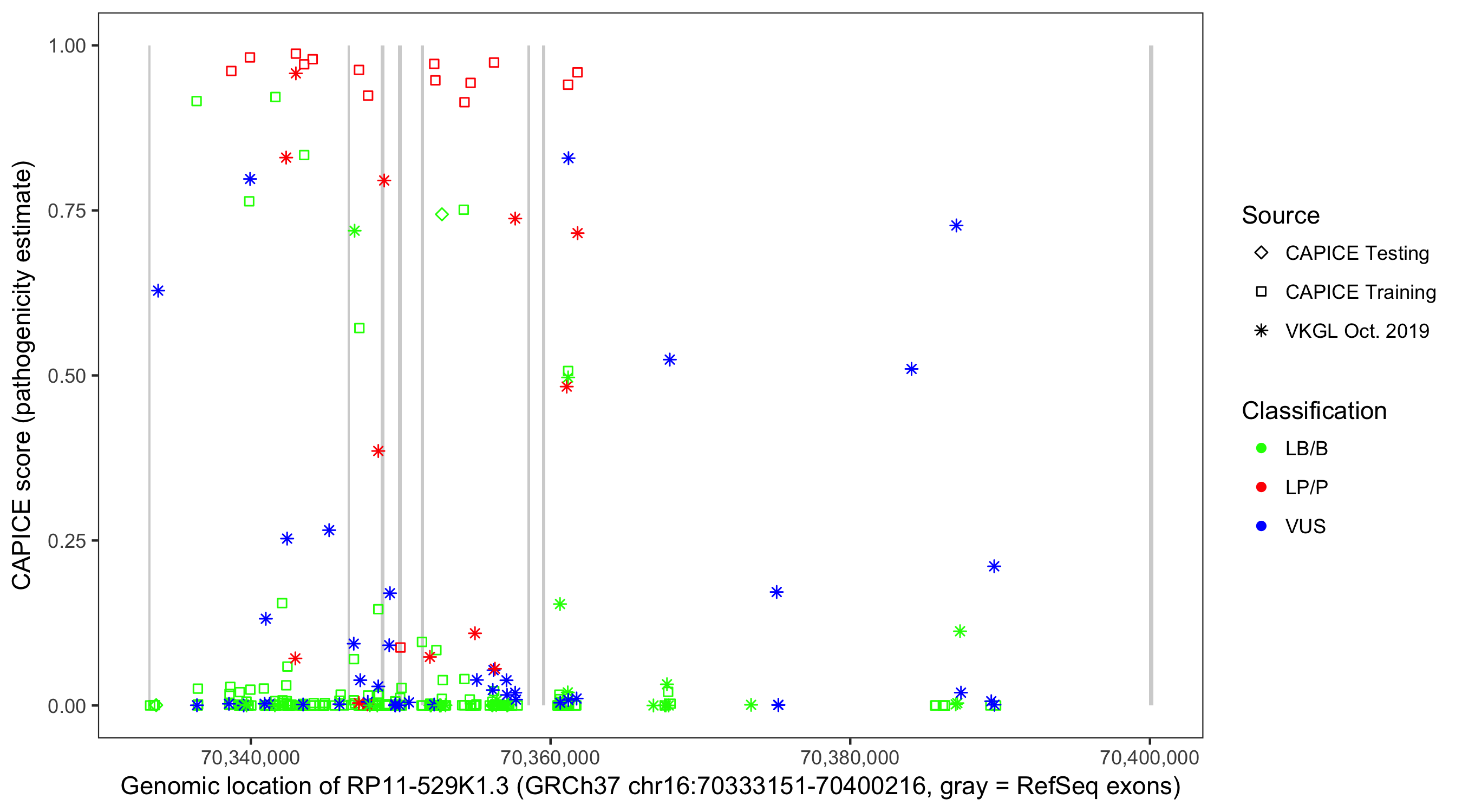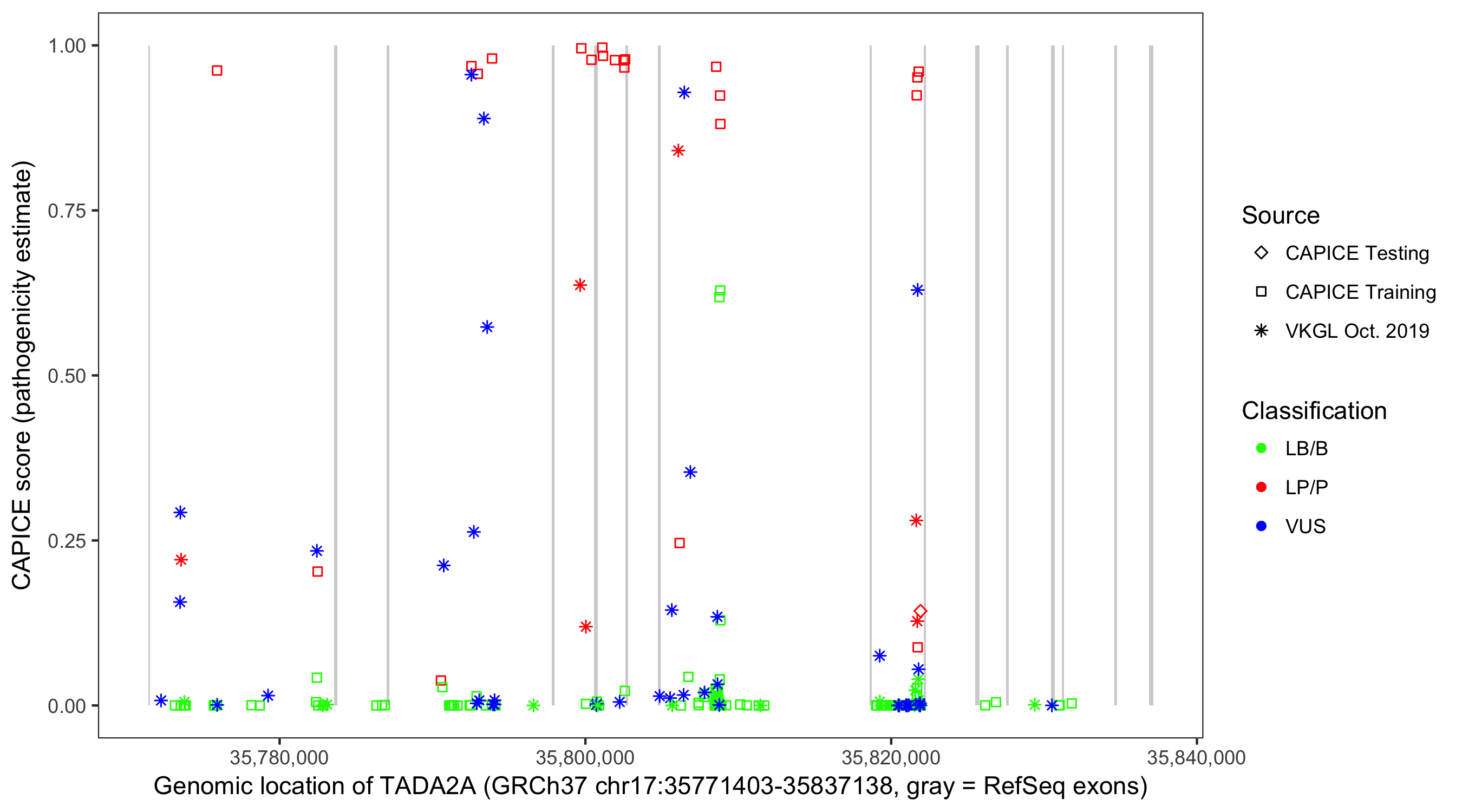 Shown are CAPICE train/test variants plus VKGL Oct 2019.
