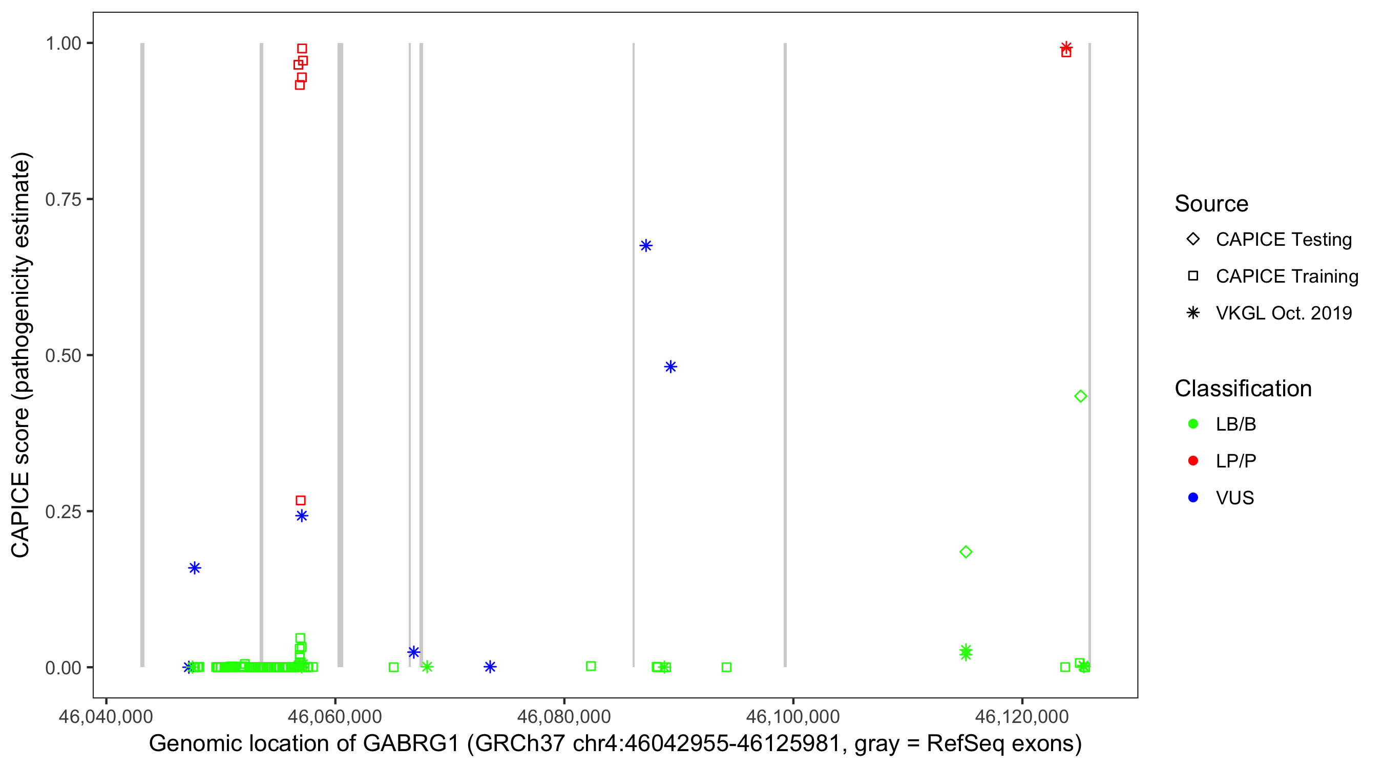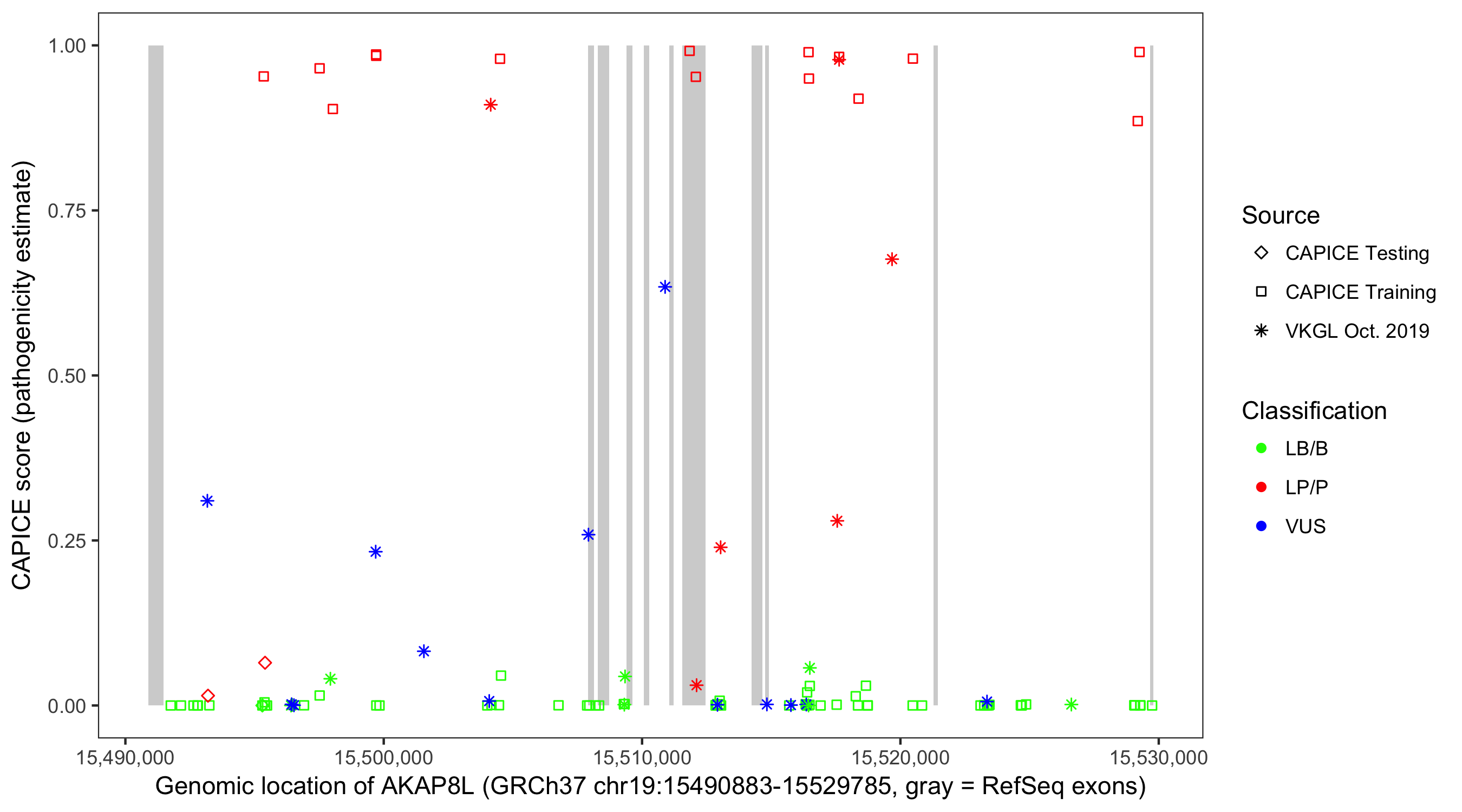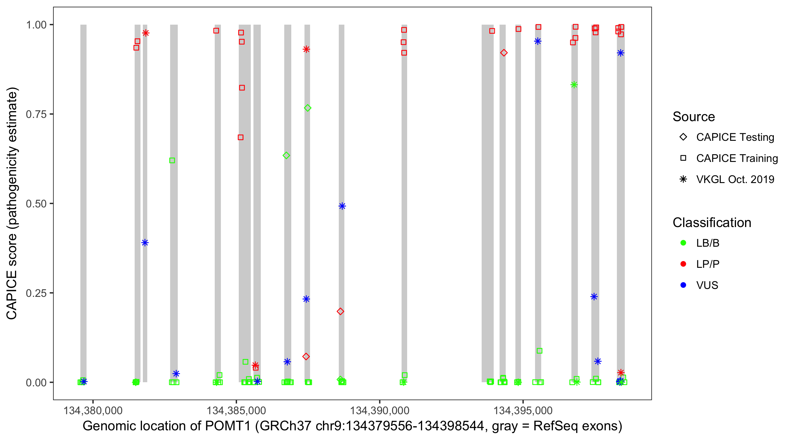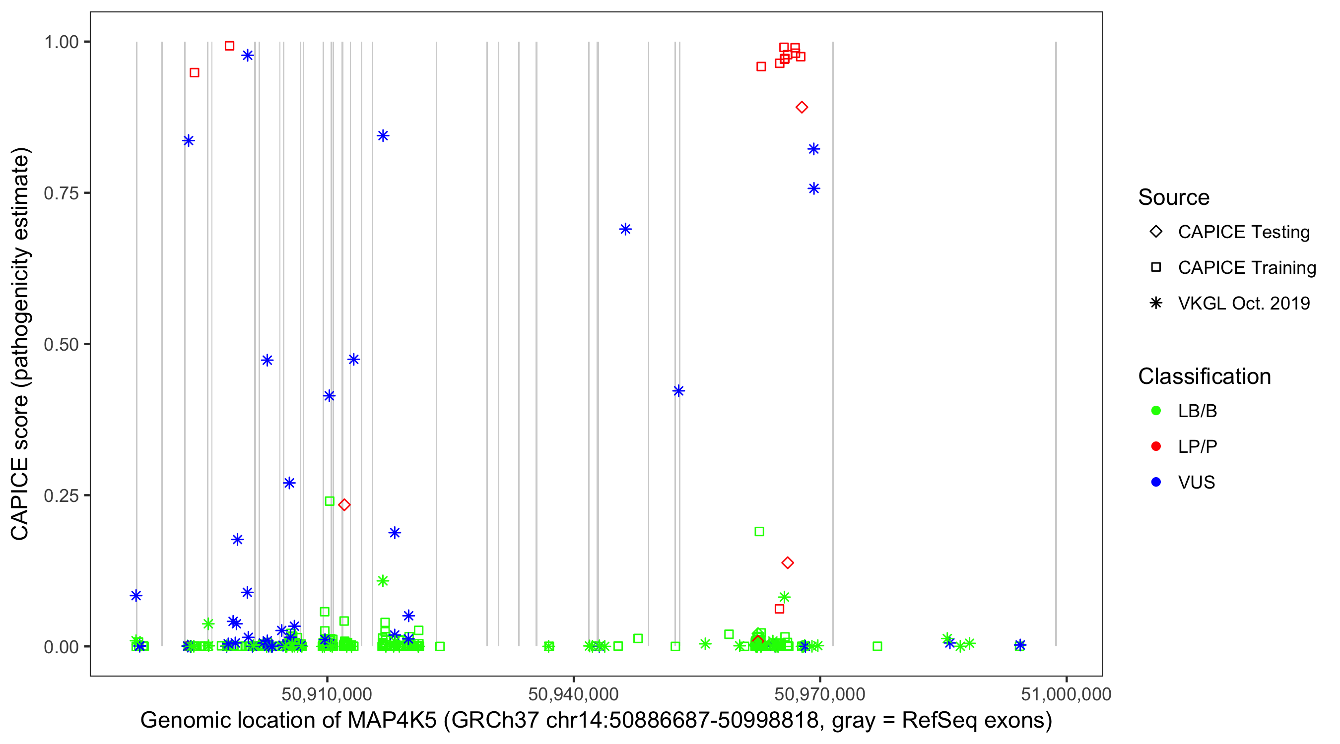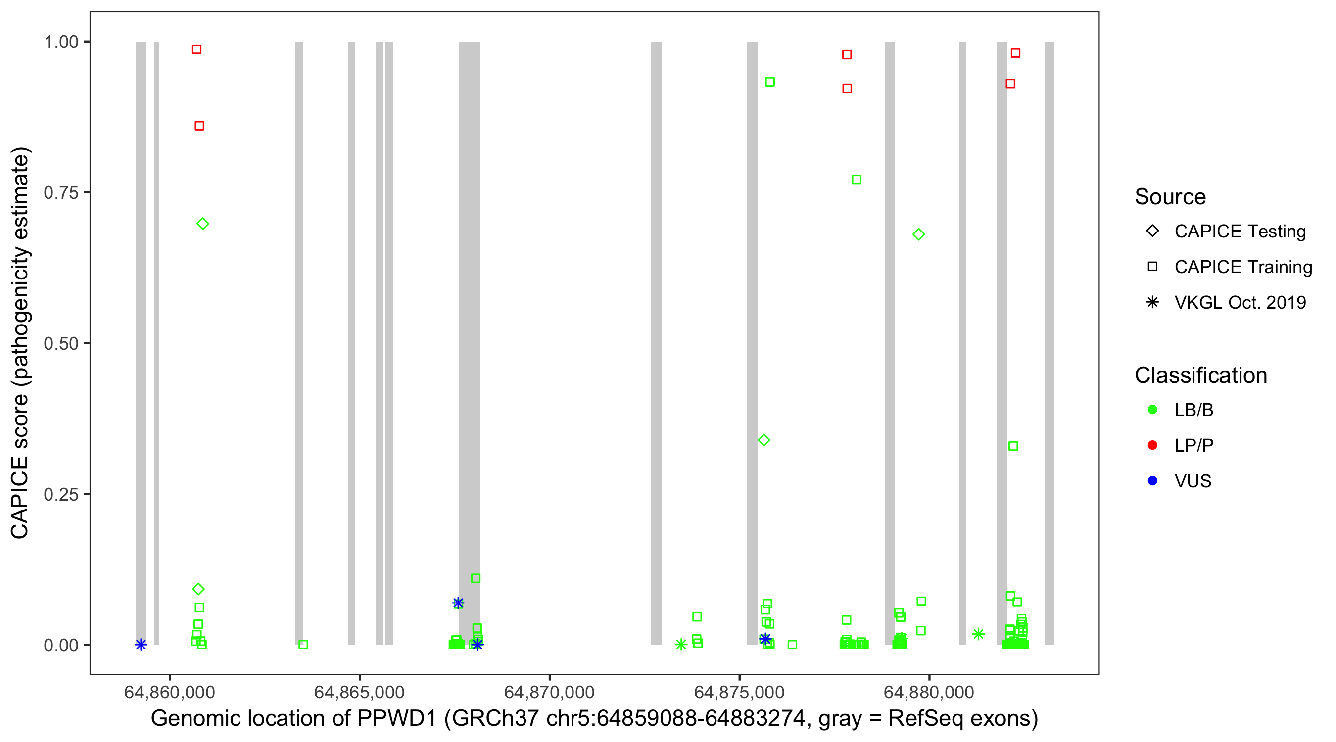 Shown are CAPICE train/test variants plus VKGL Oct 2019.