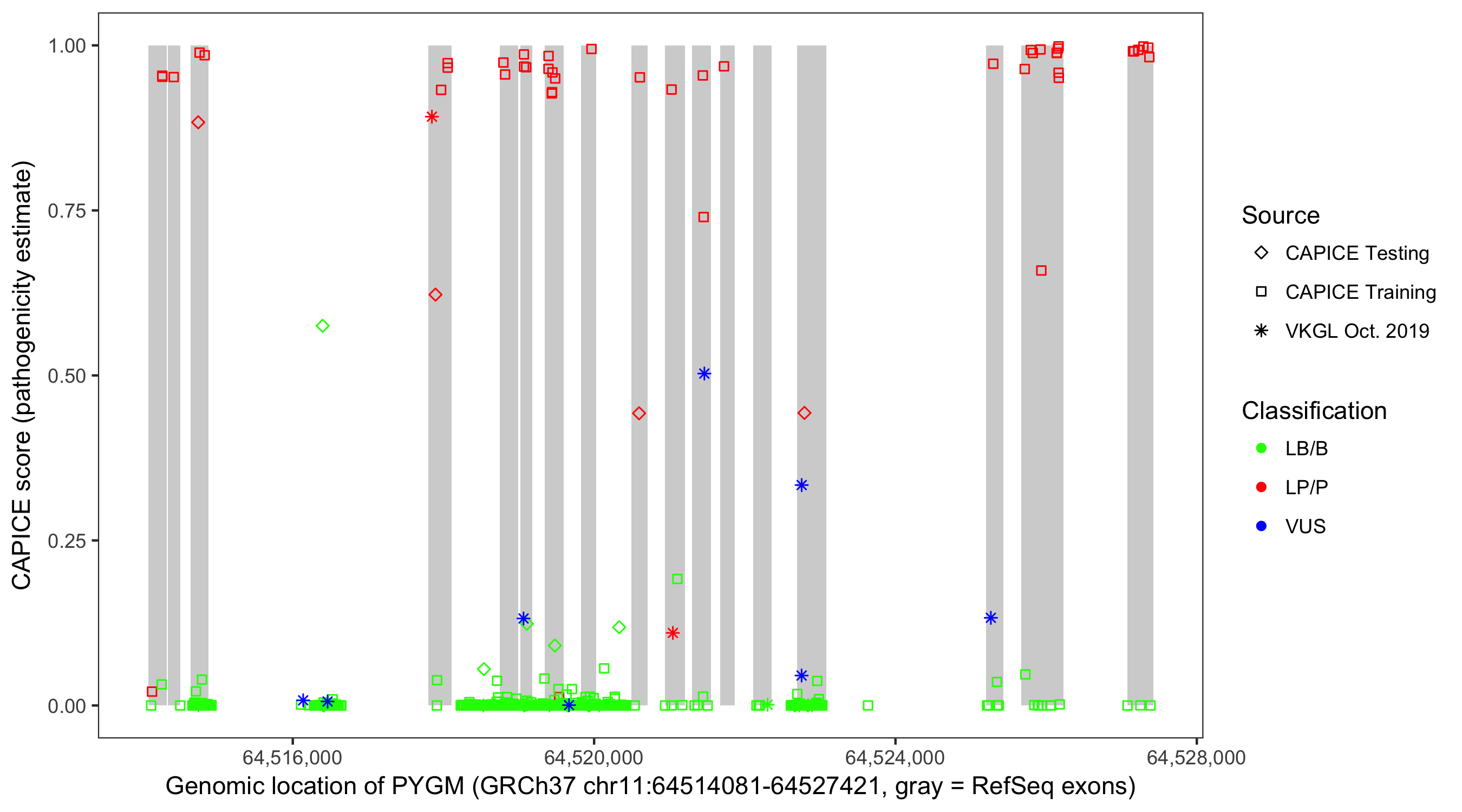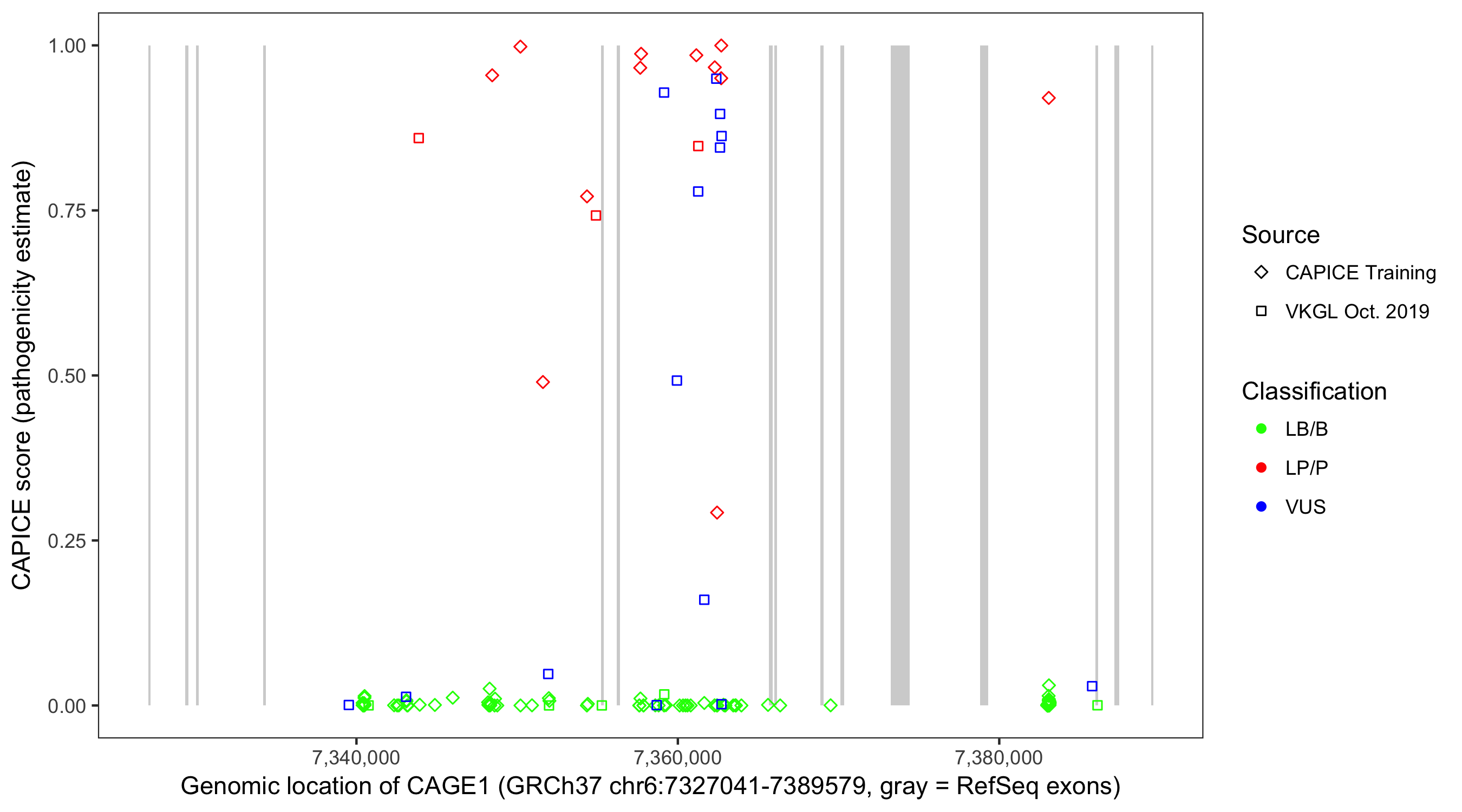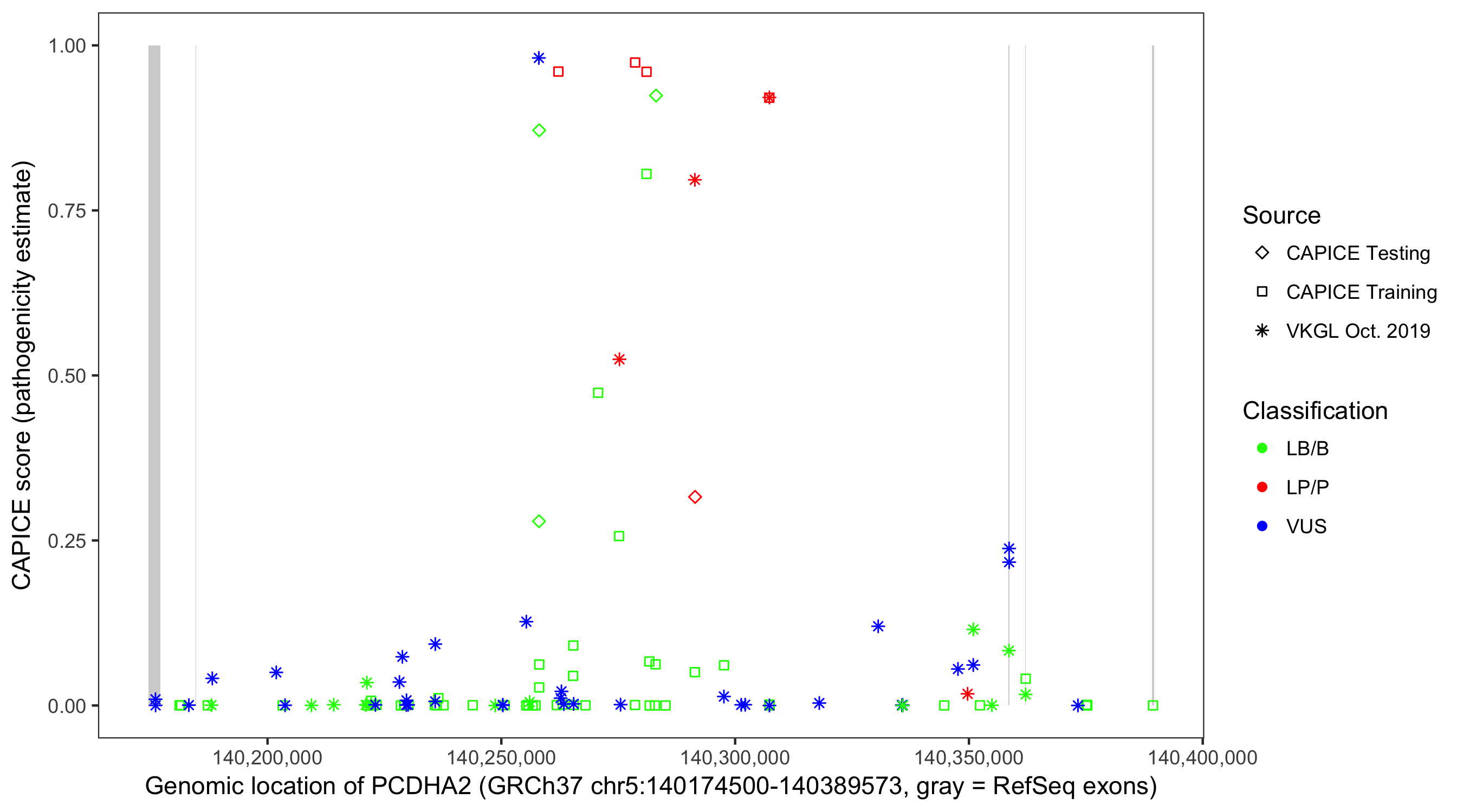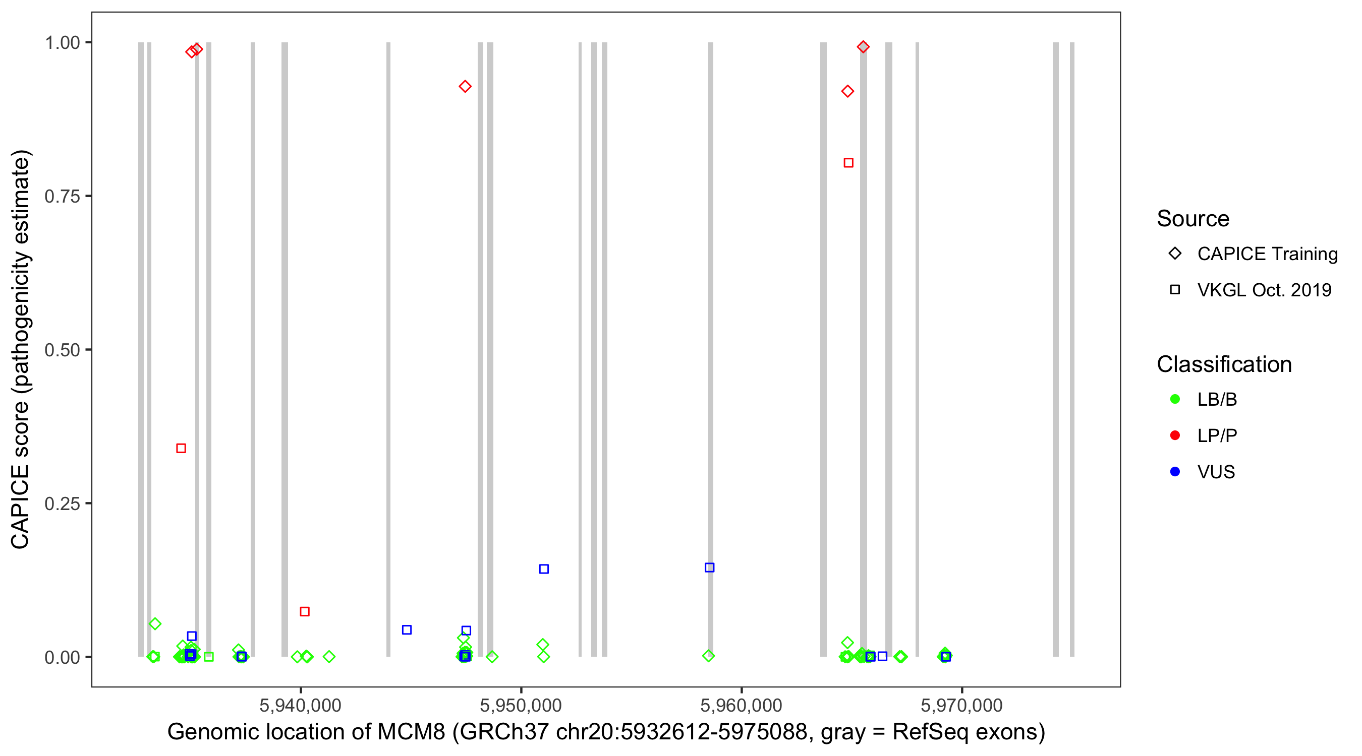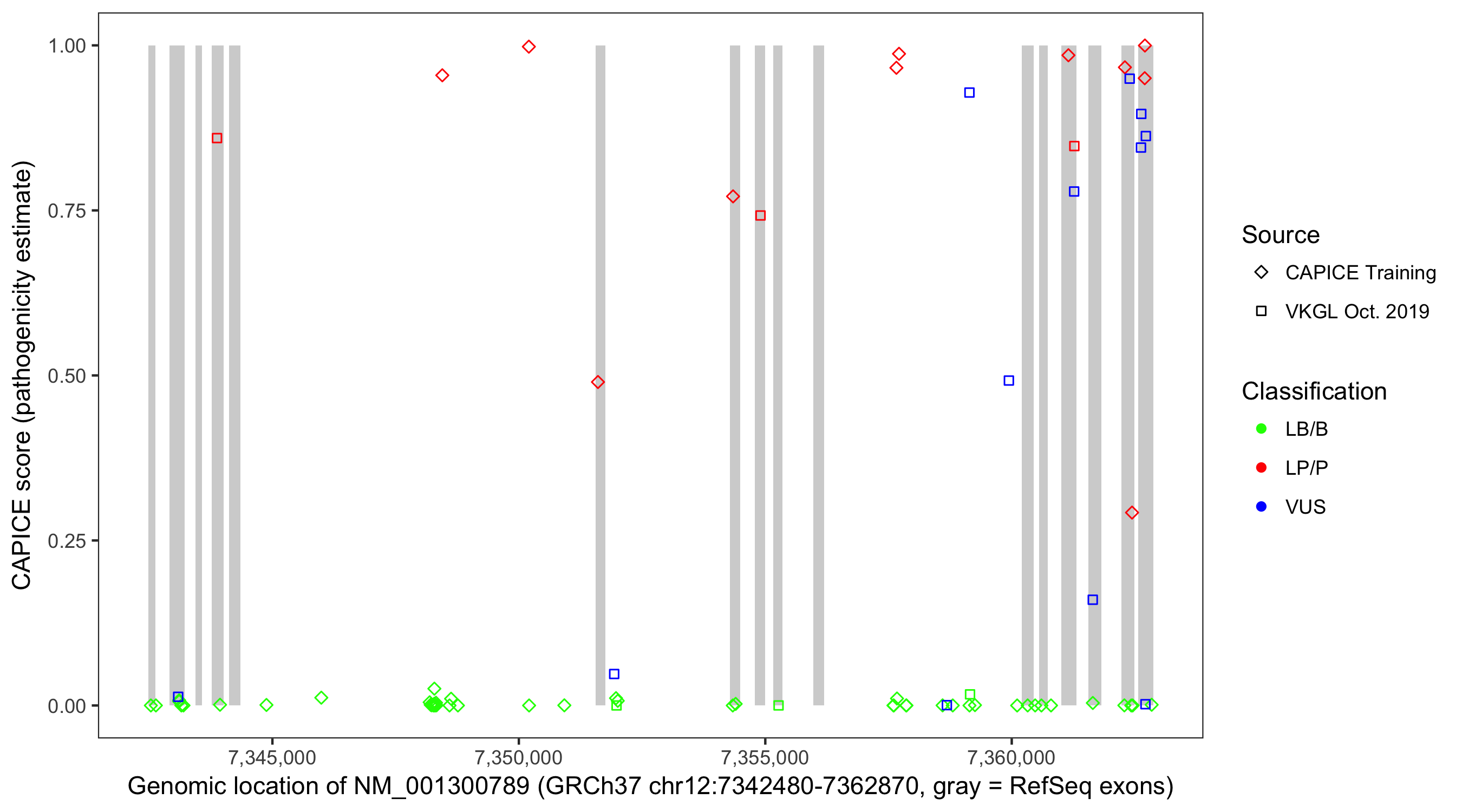 Shown are CAPICE train/test variants plus VKGL Oct 2019.