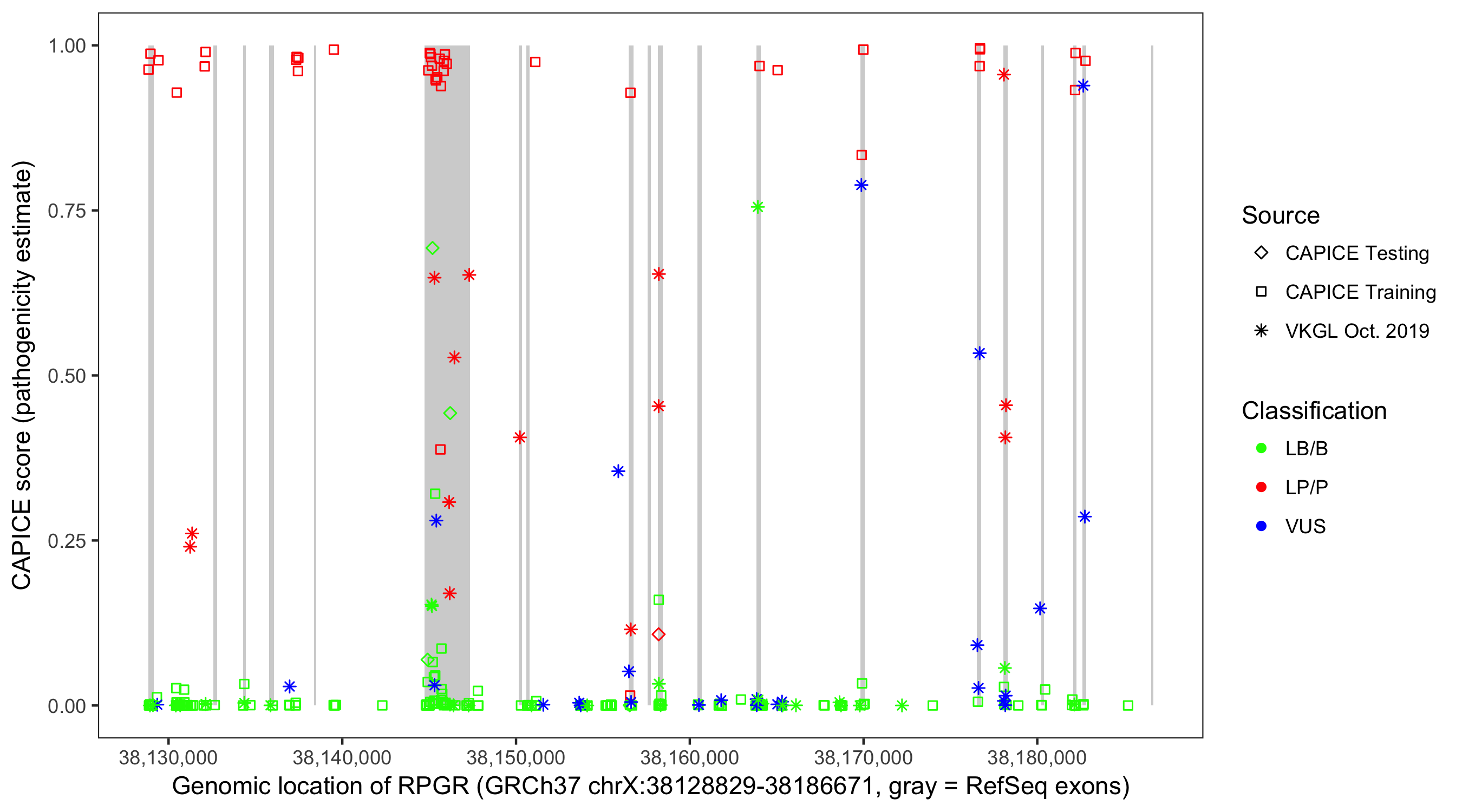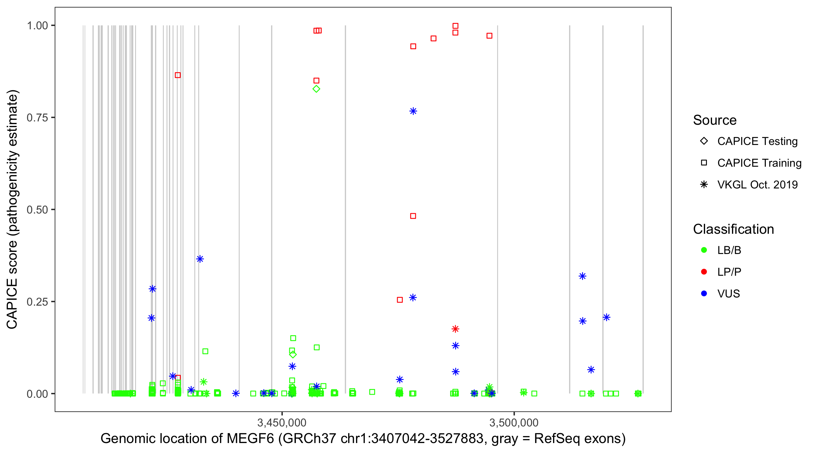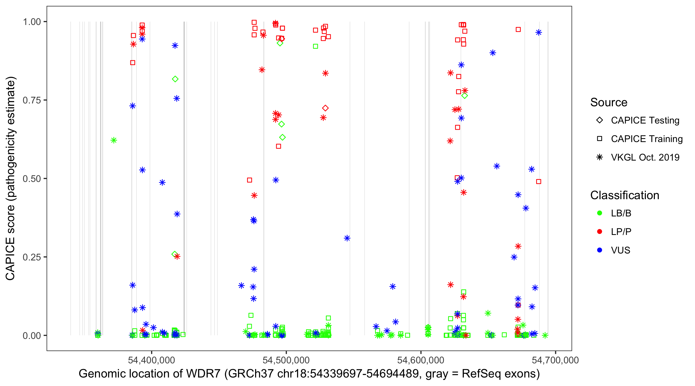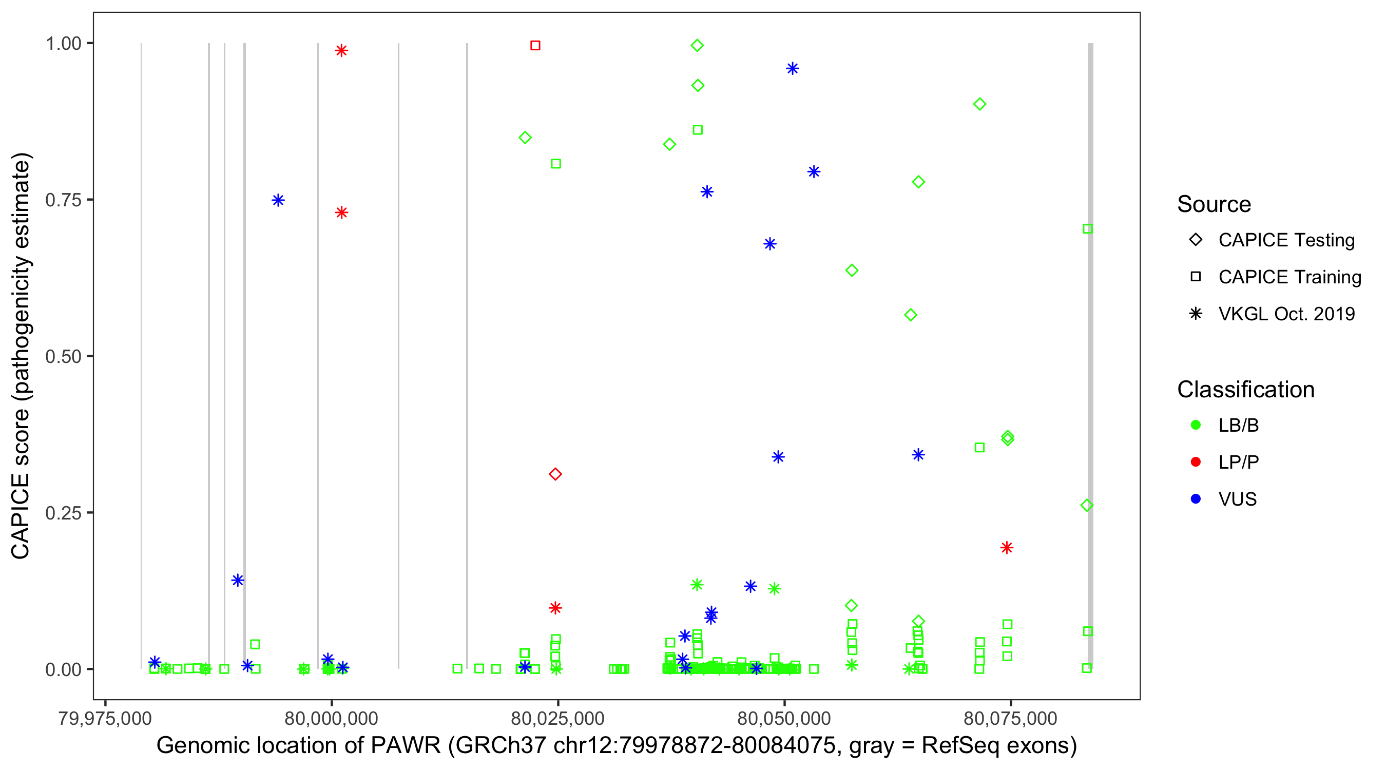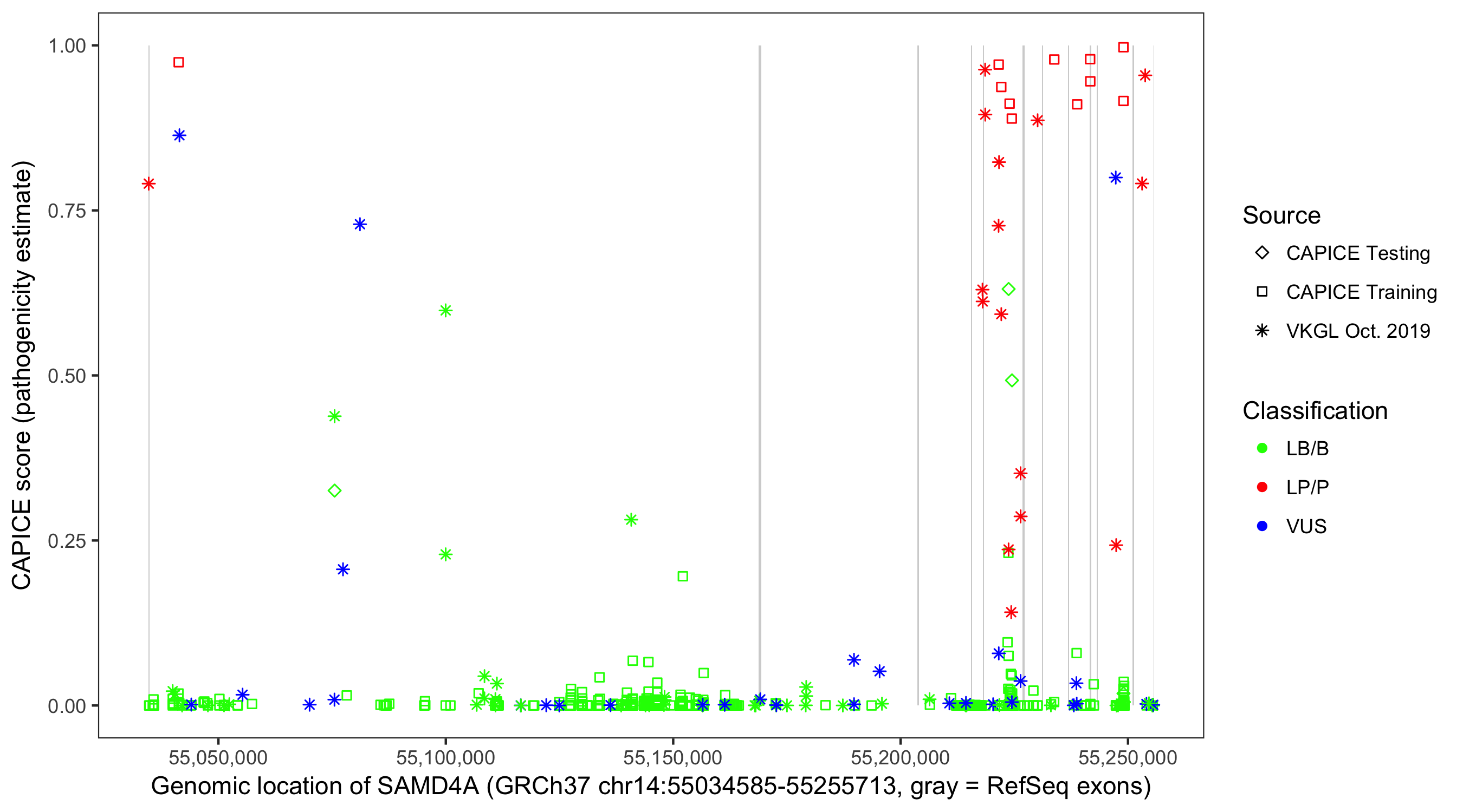 Shown are CAPICE train/test variants plus VKGL Oct 2019.
