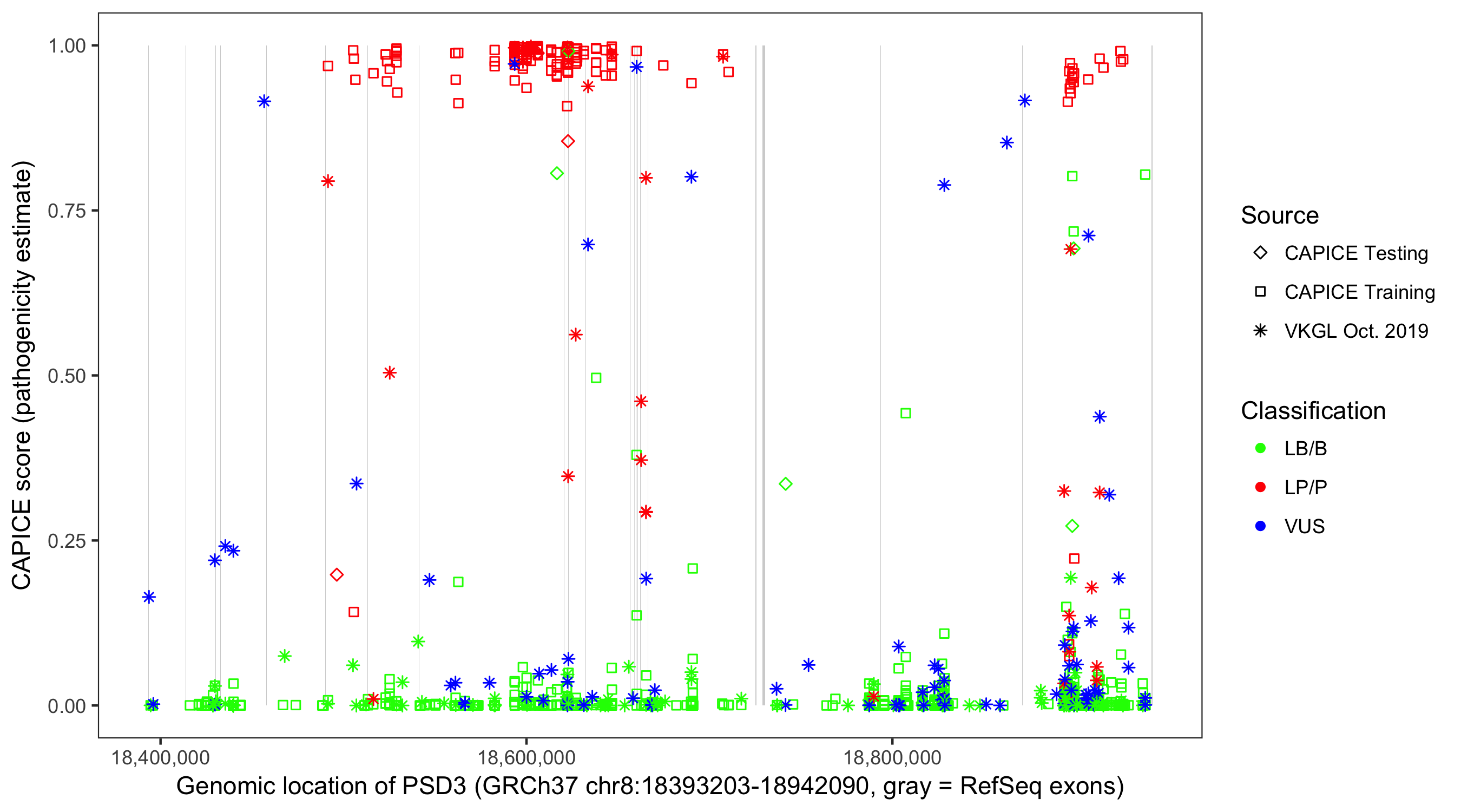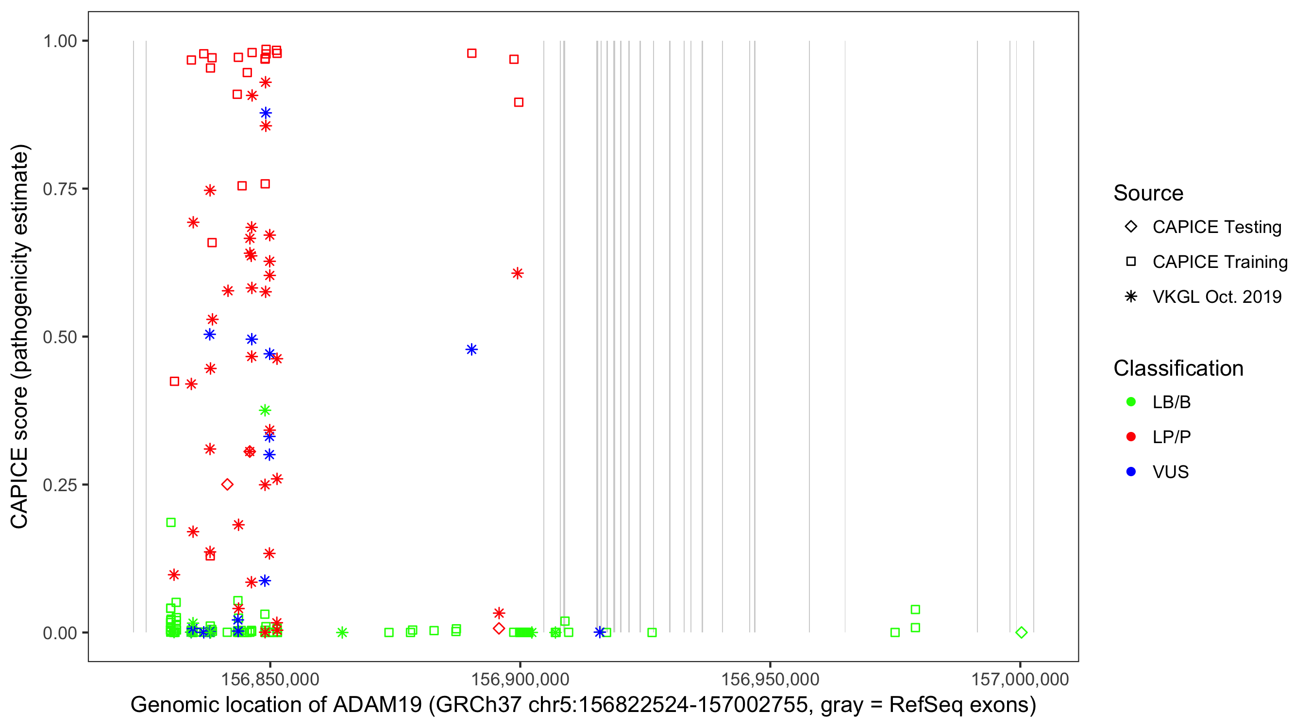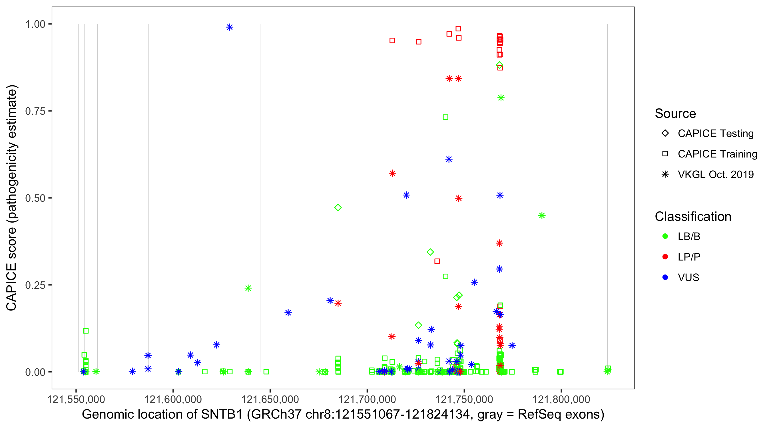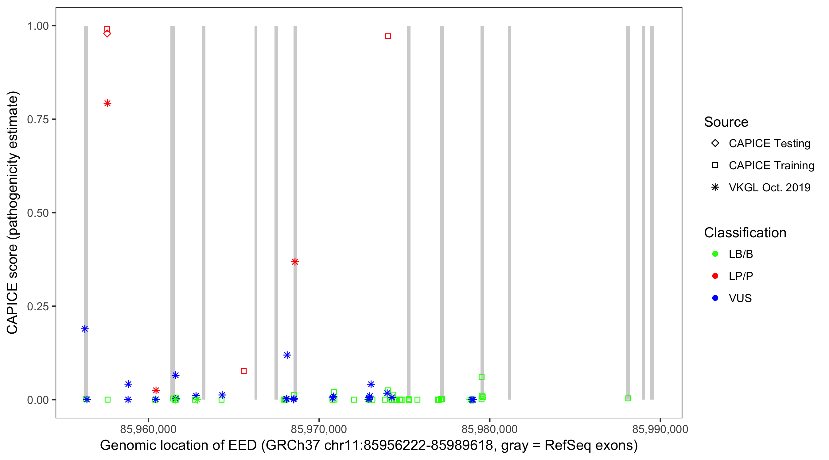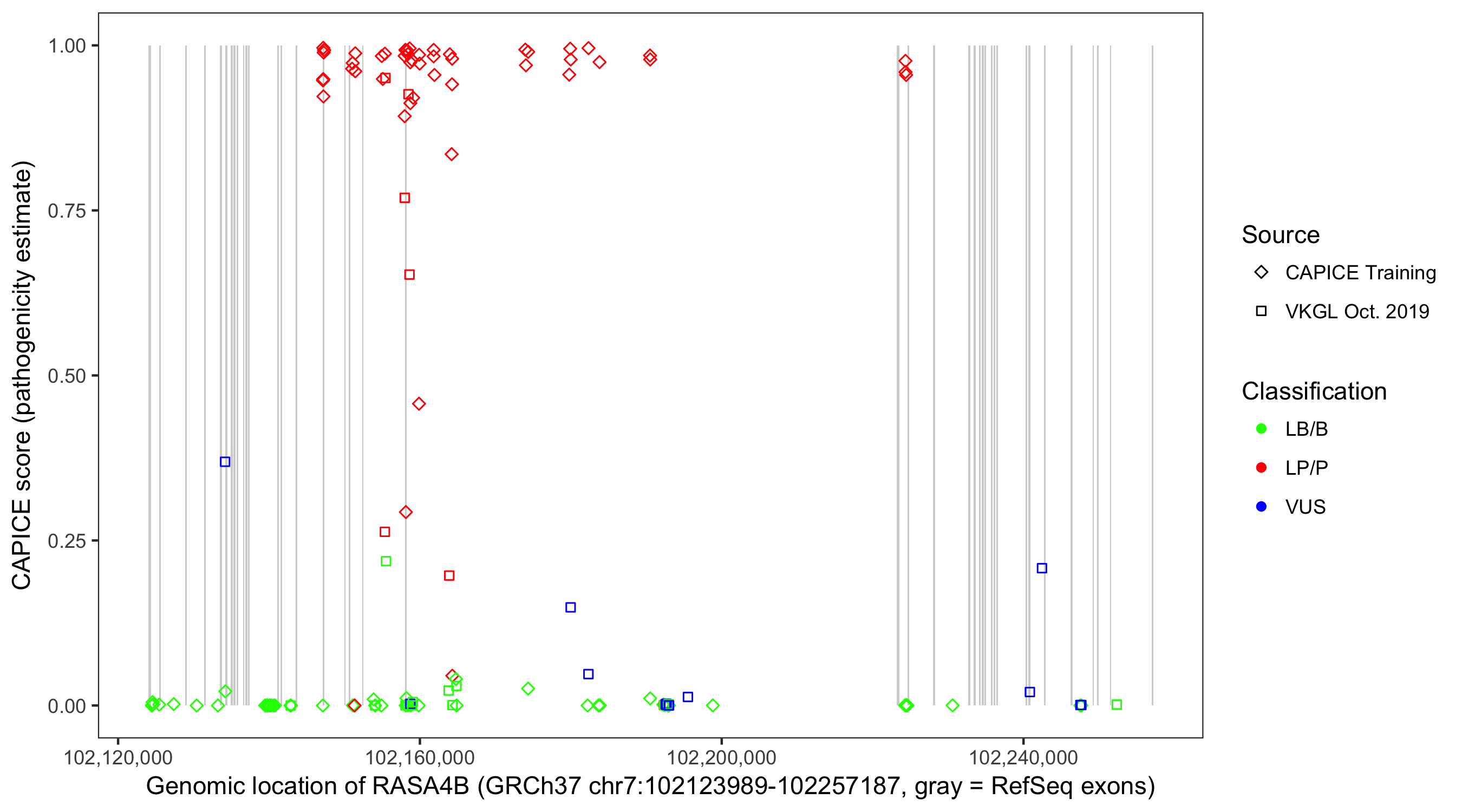 Shown are CAPICE train/test variants plus VKGL Oct 2019.