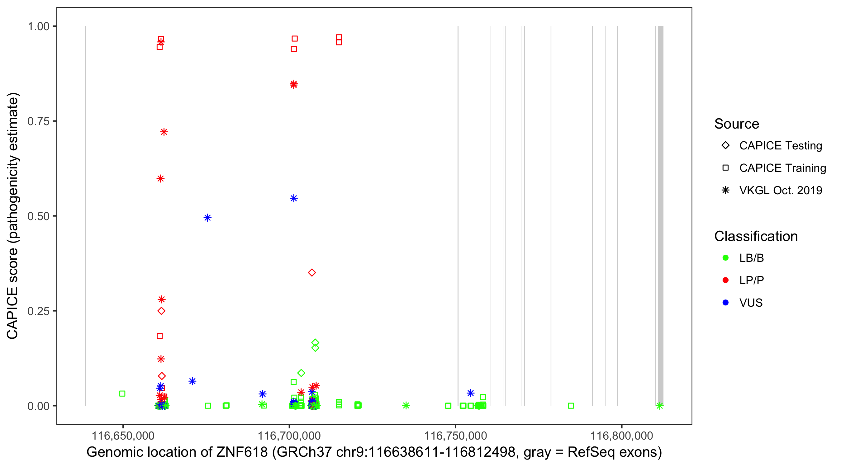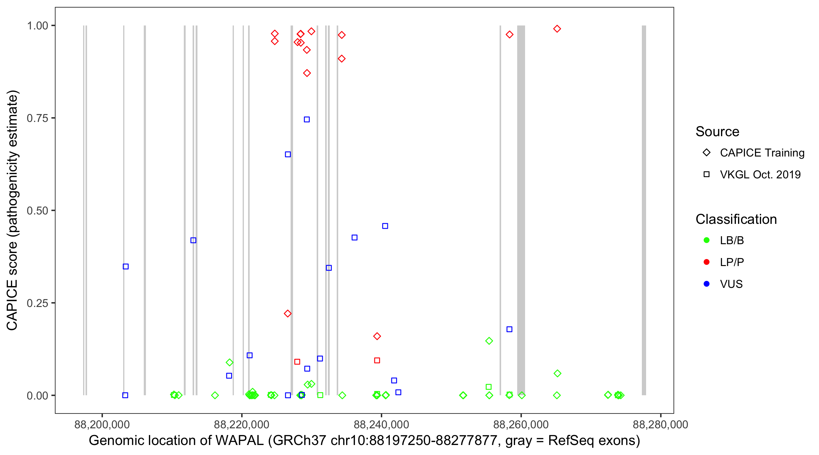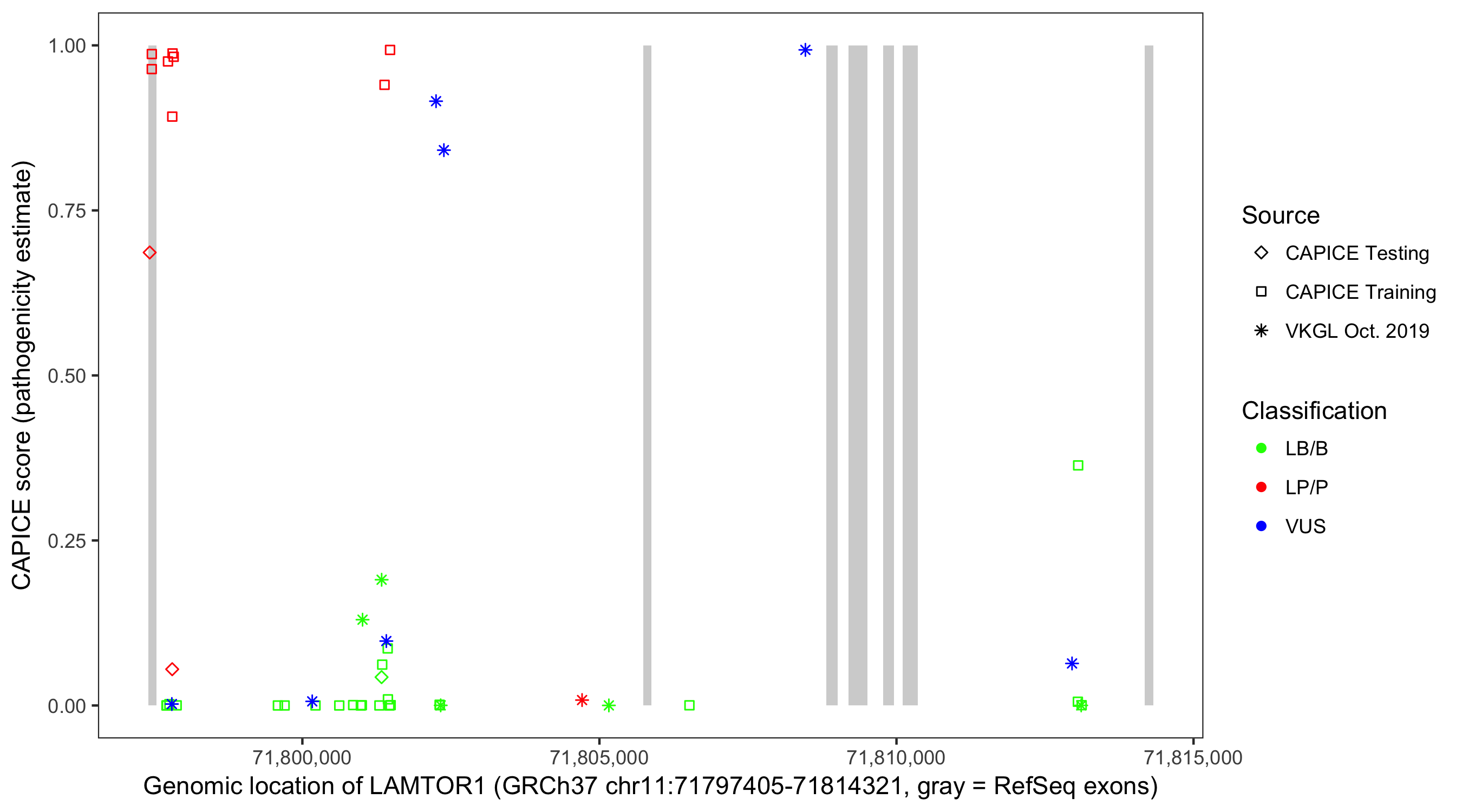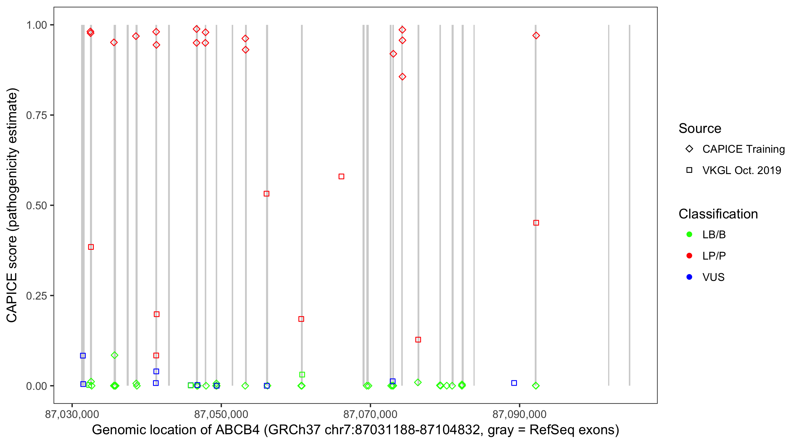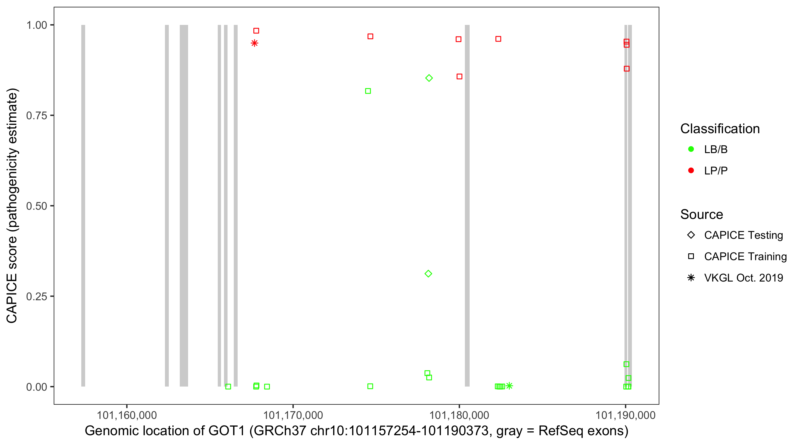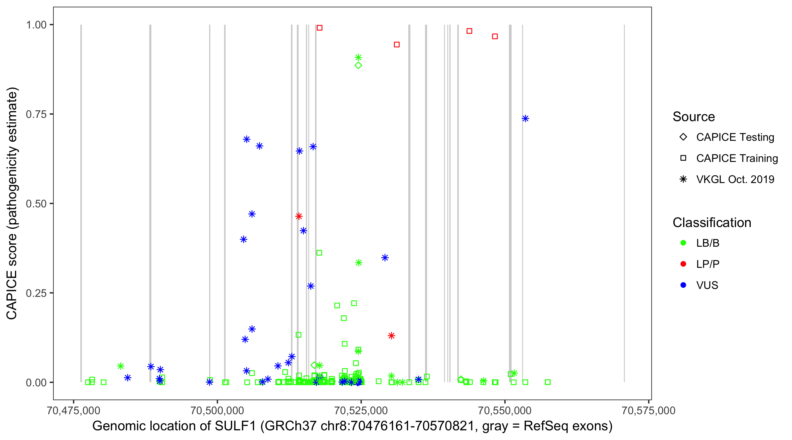 Shown are CAPICE train/test variants plus VKGL Oct 2019.