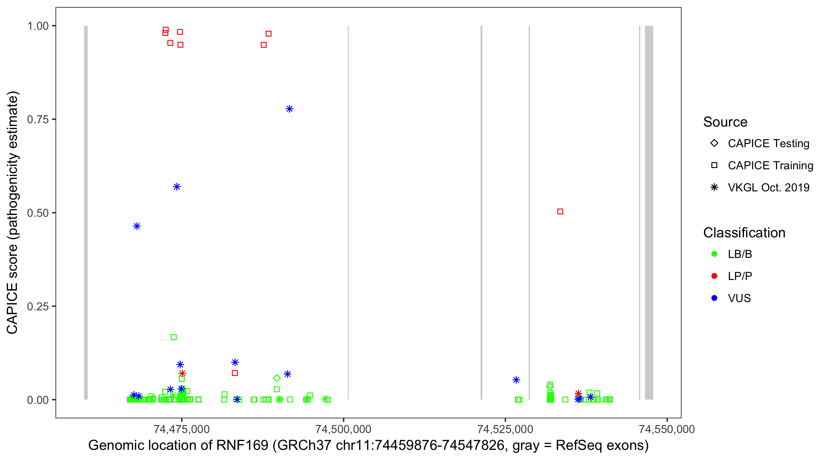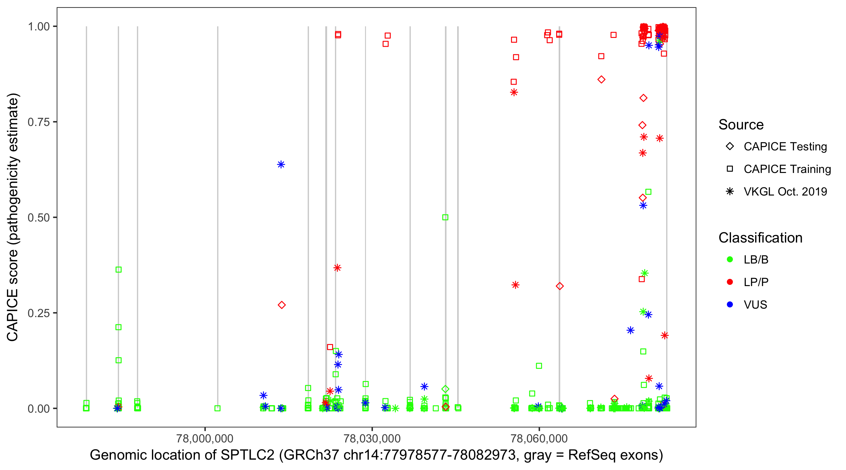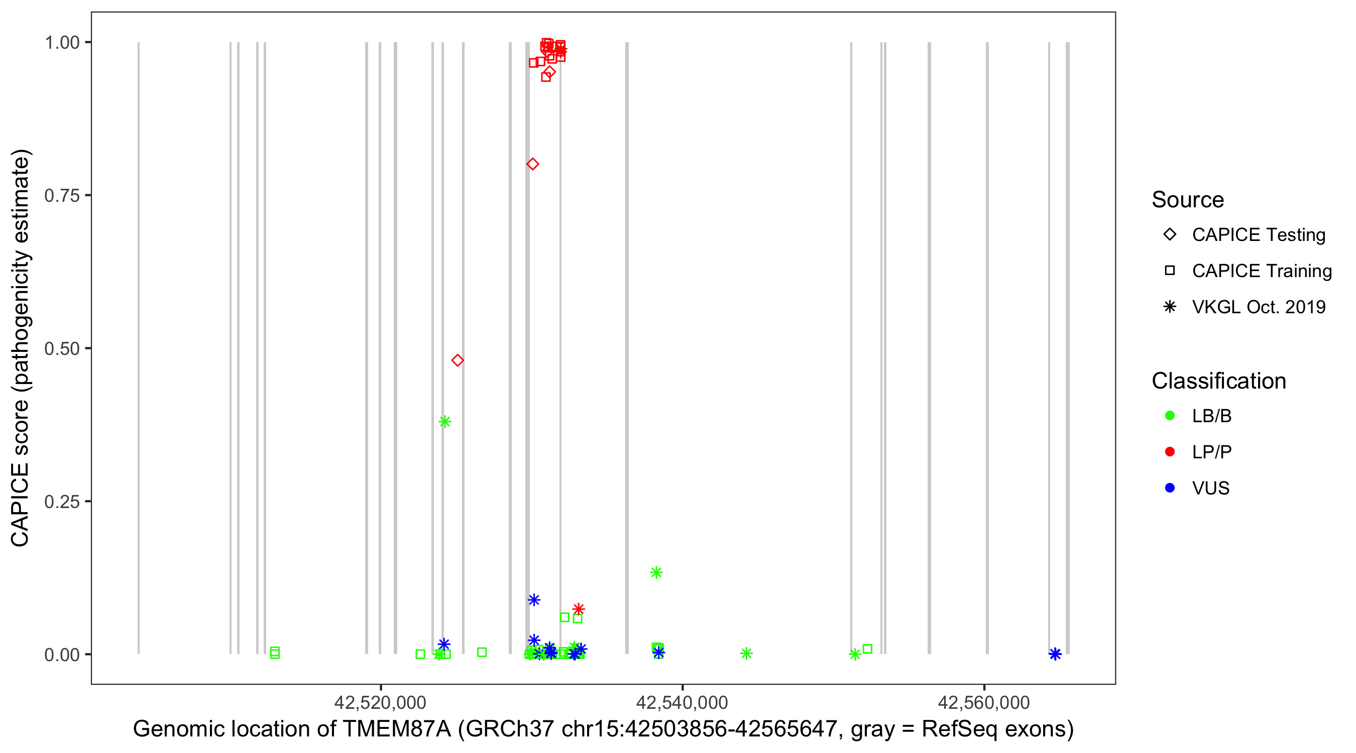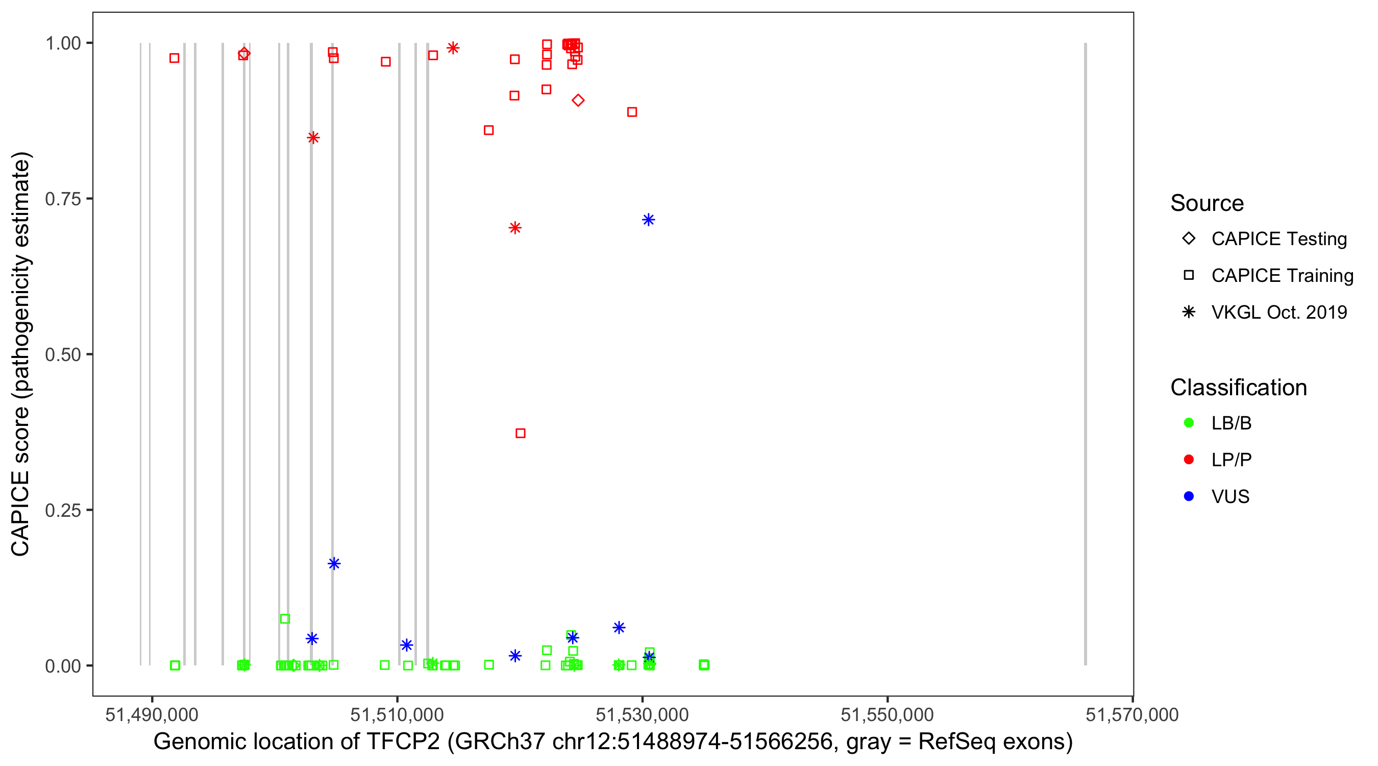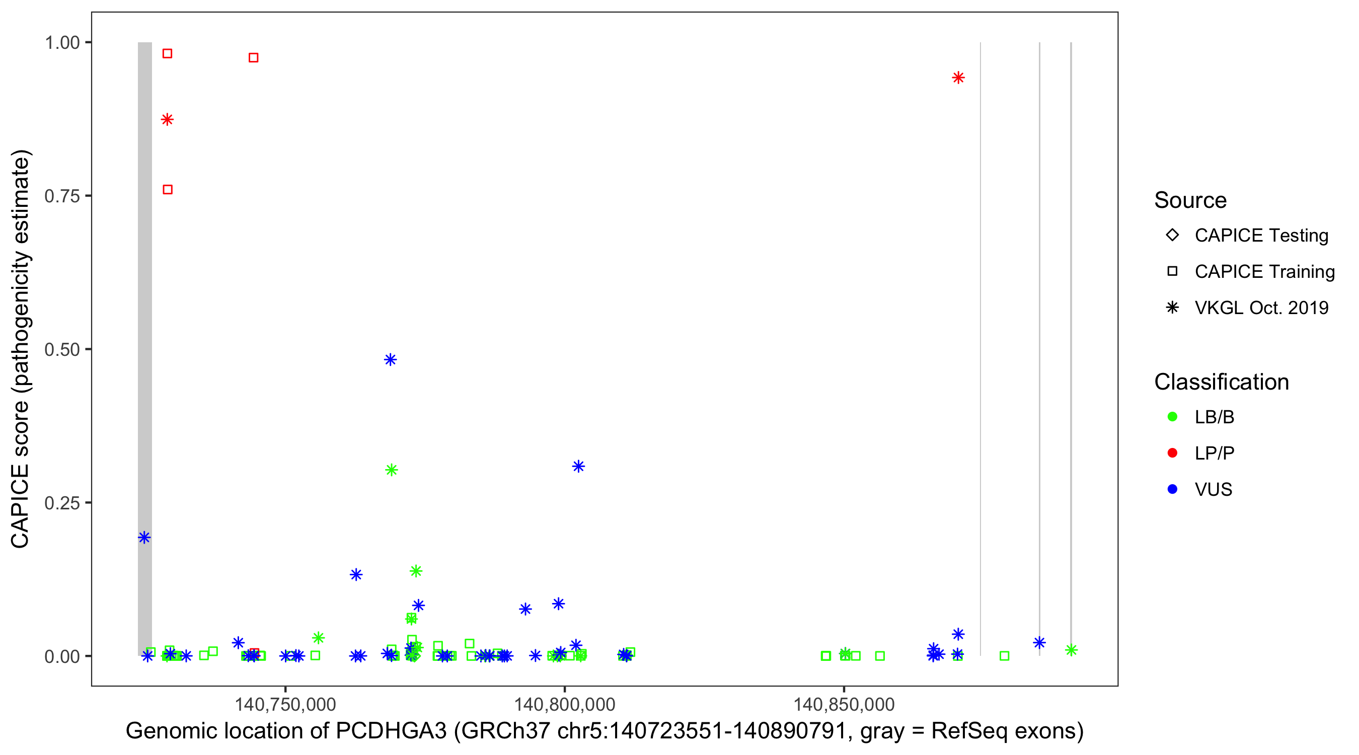 Shown are CAPICE train/test variants plus VKGL Oct 2019.