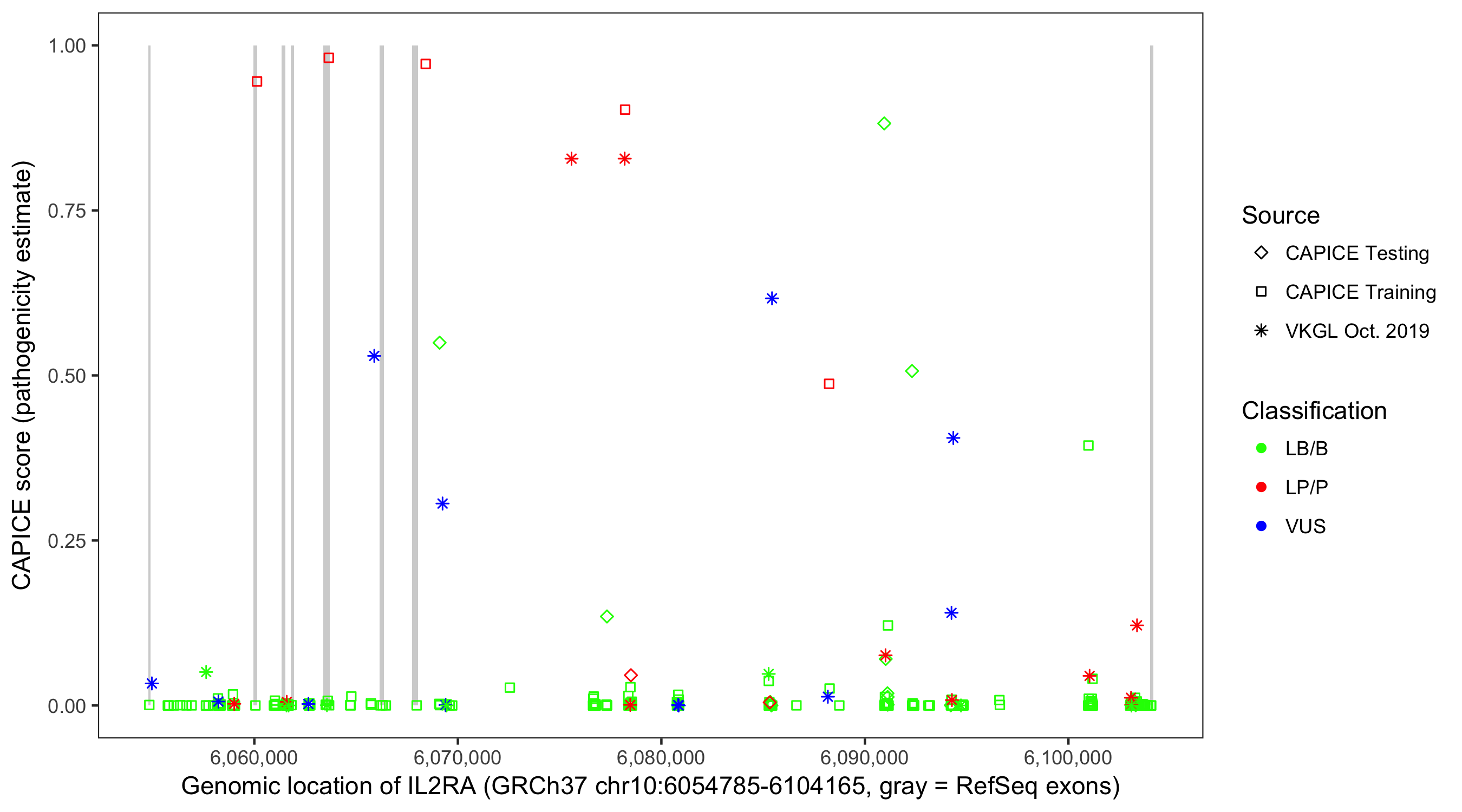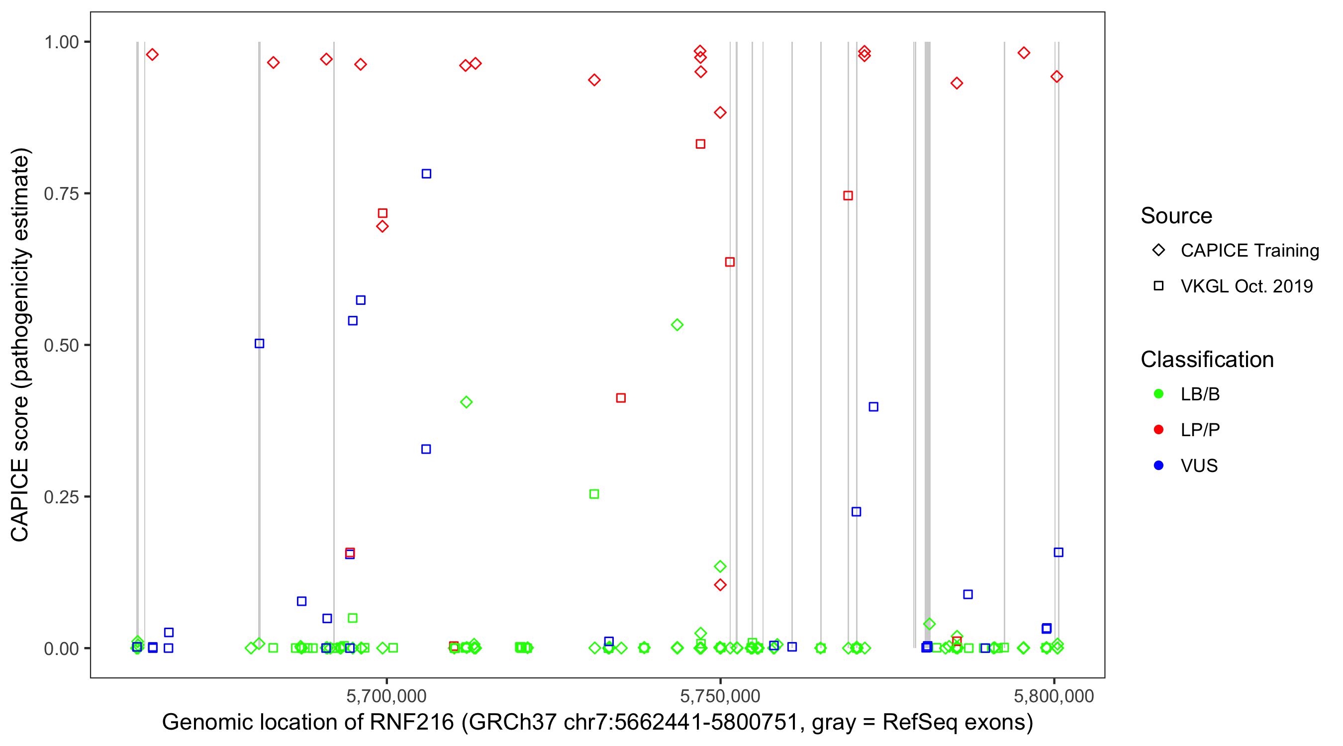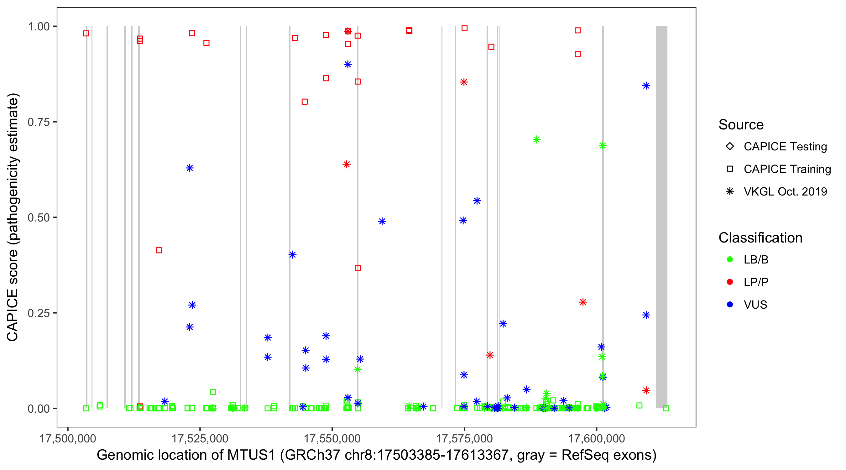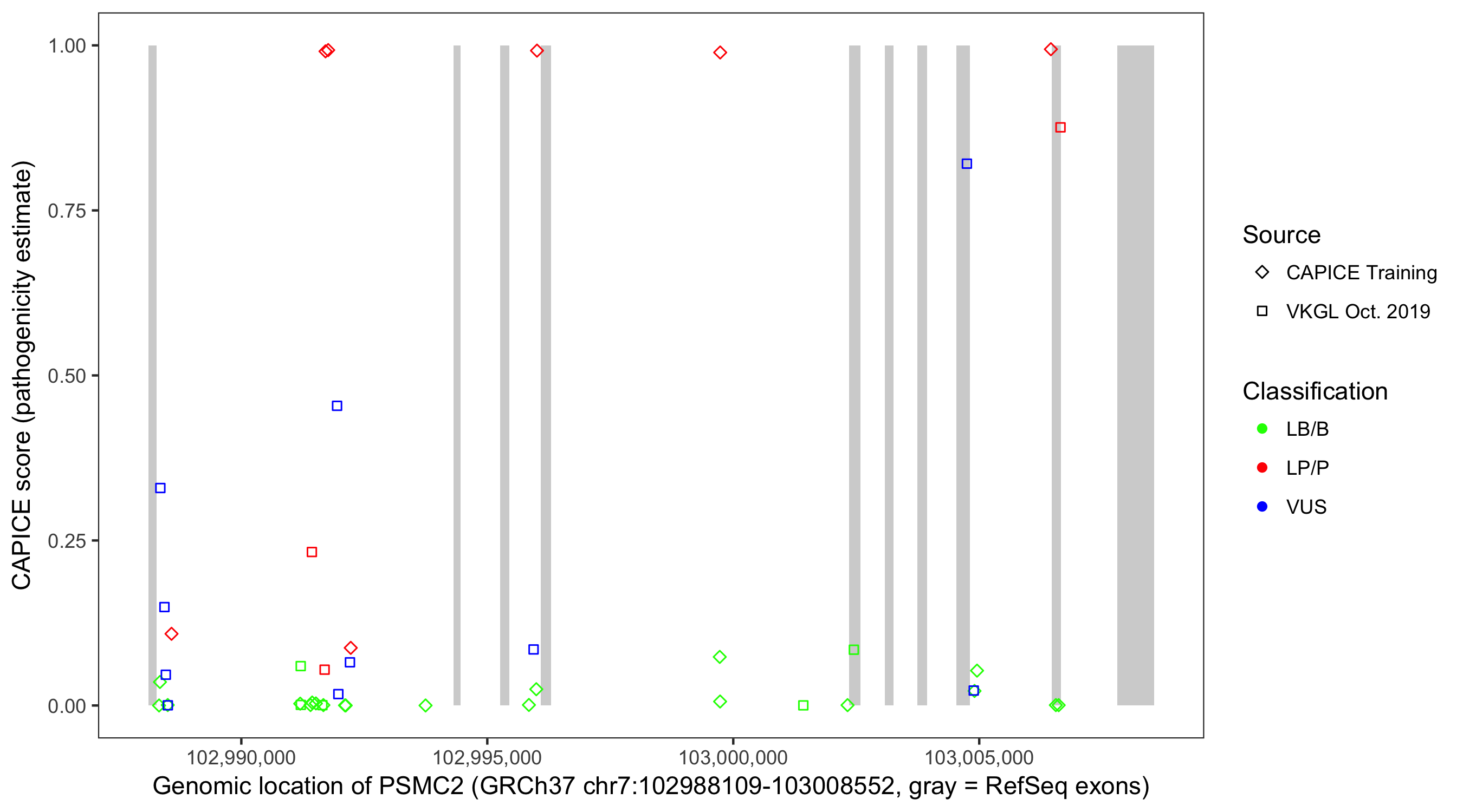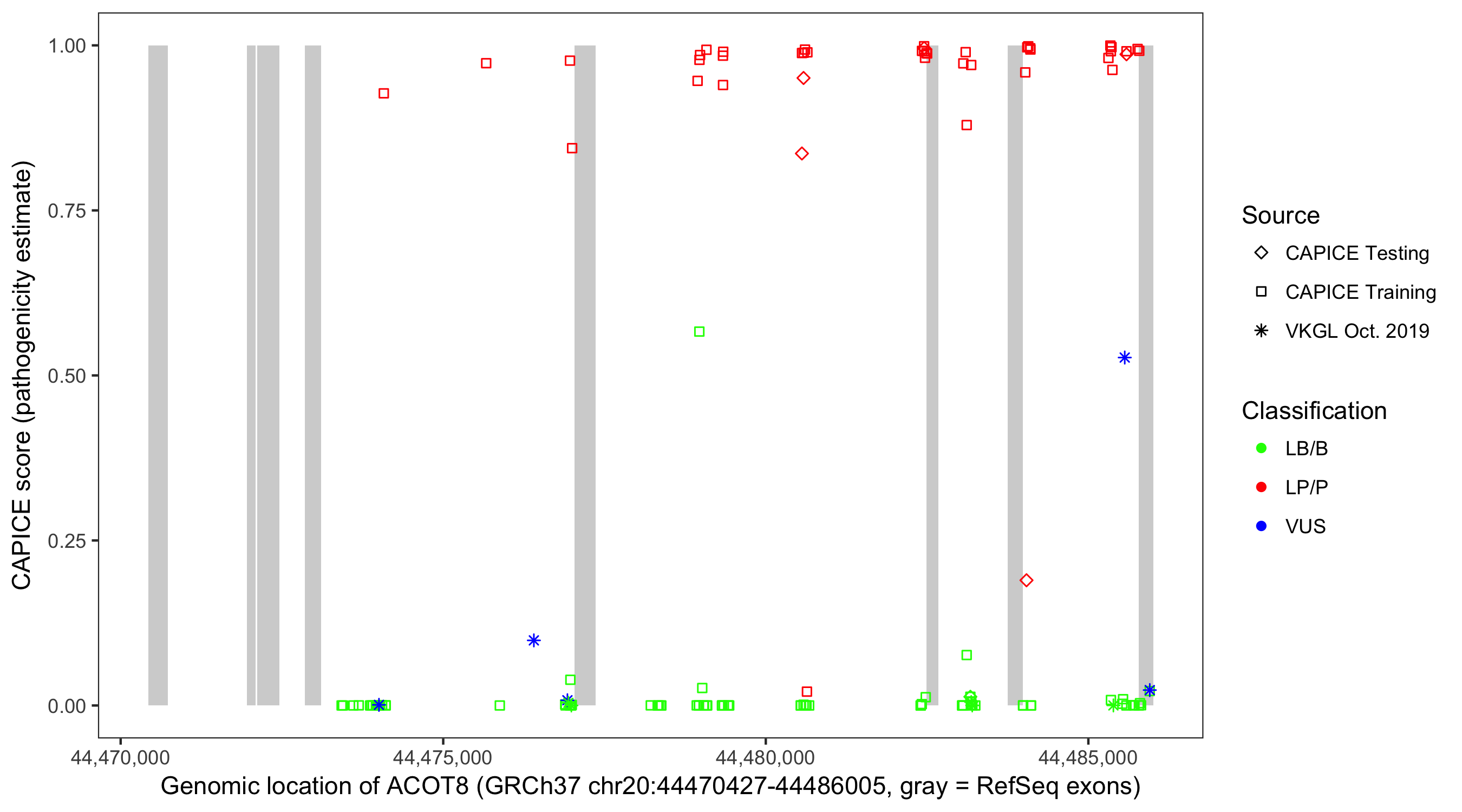 Shown are CAPICE train/test variants plus VKGL Oct 2019.