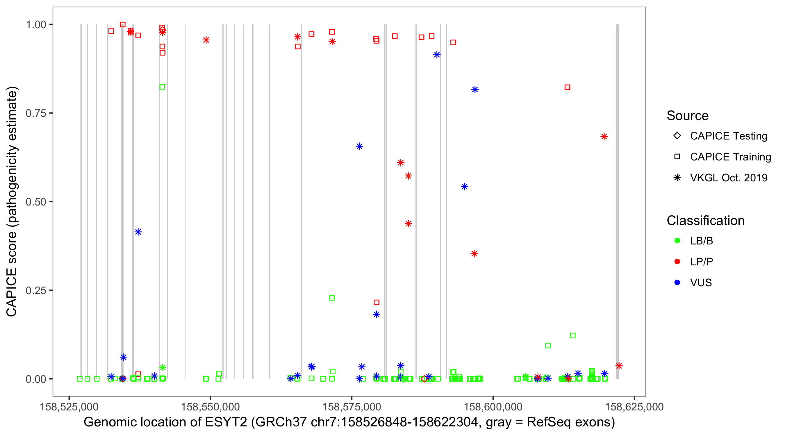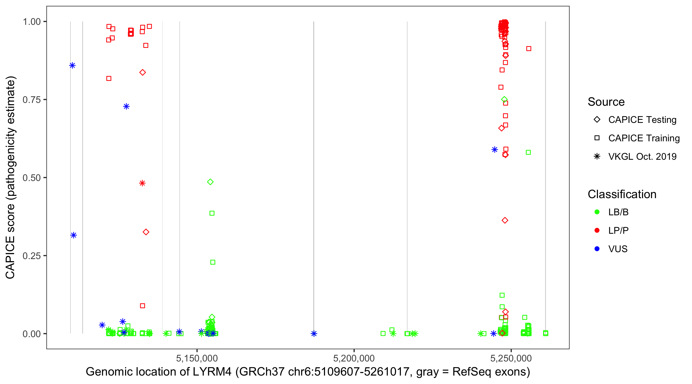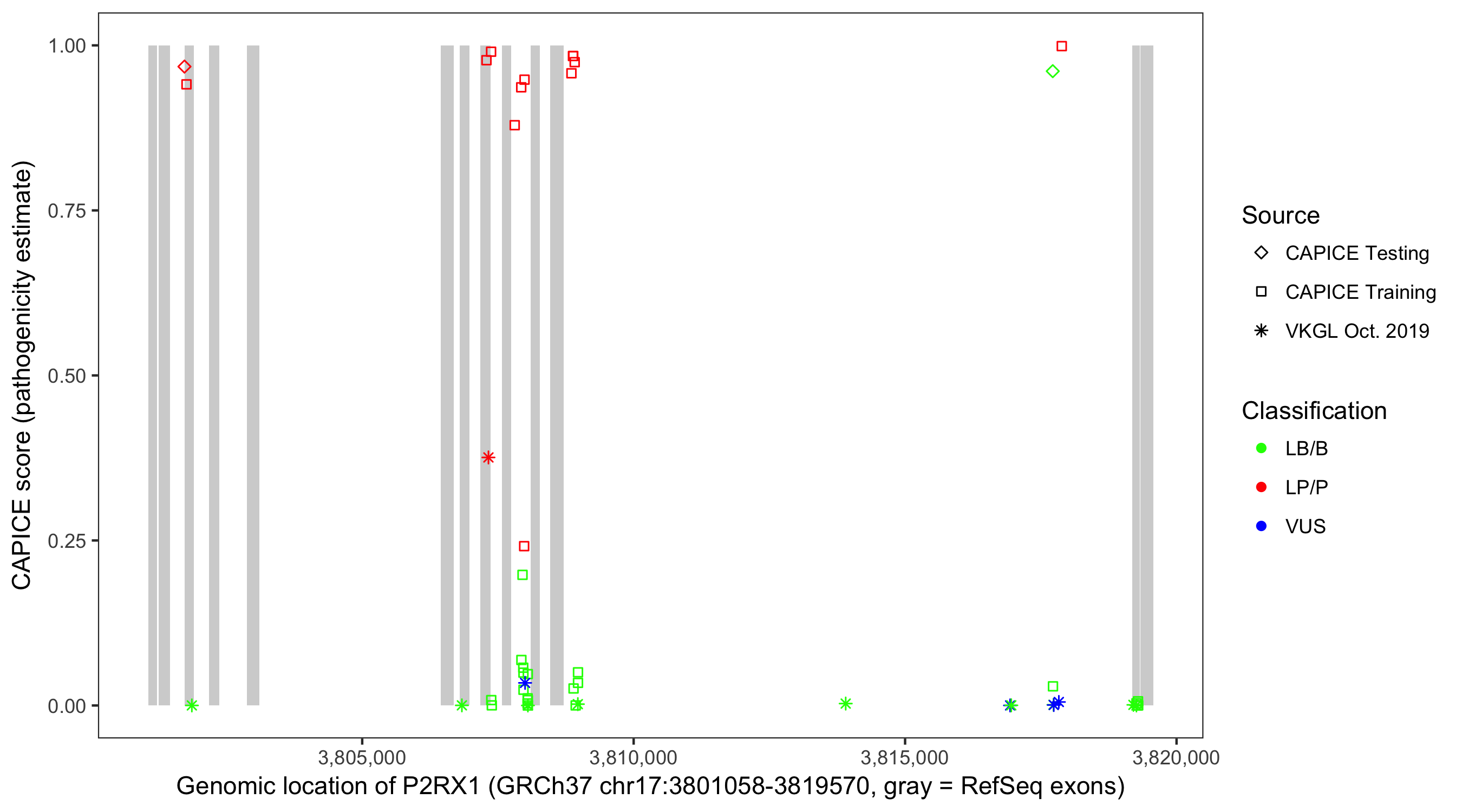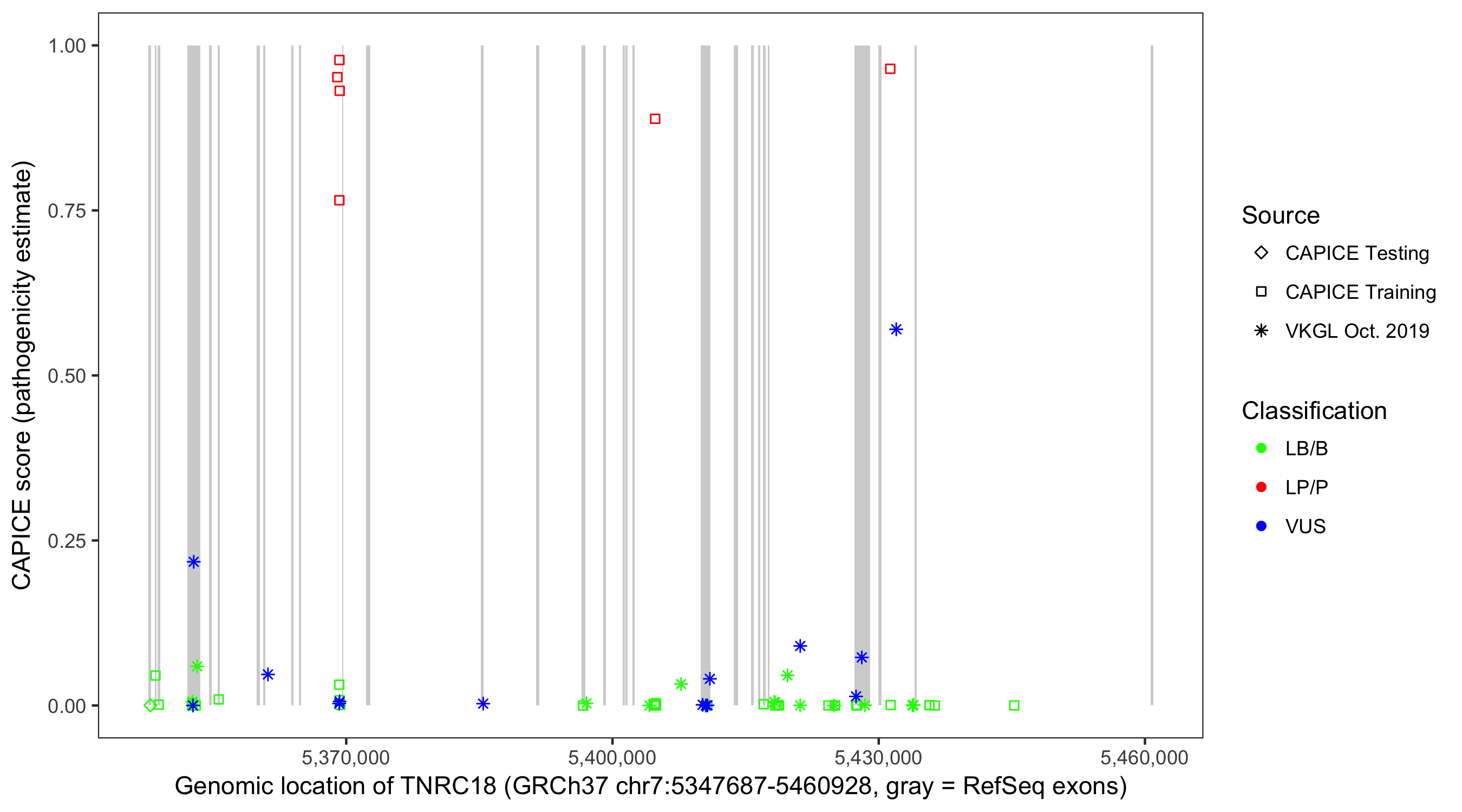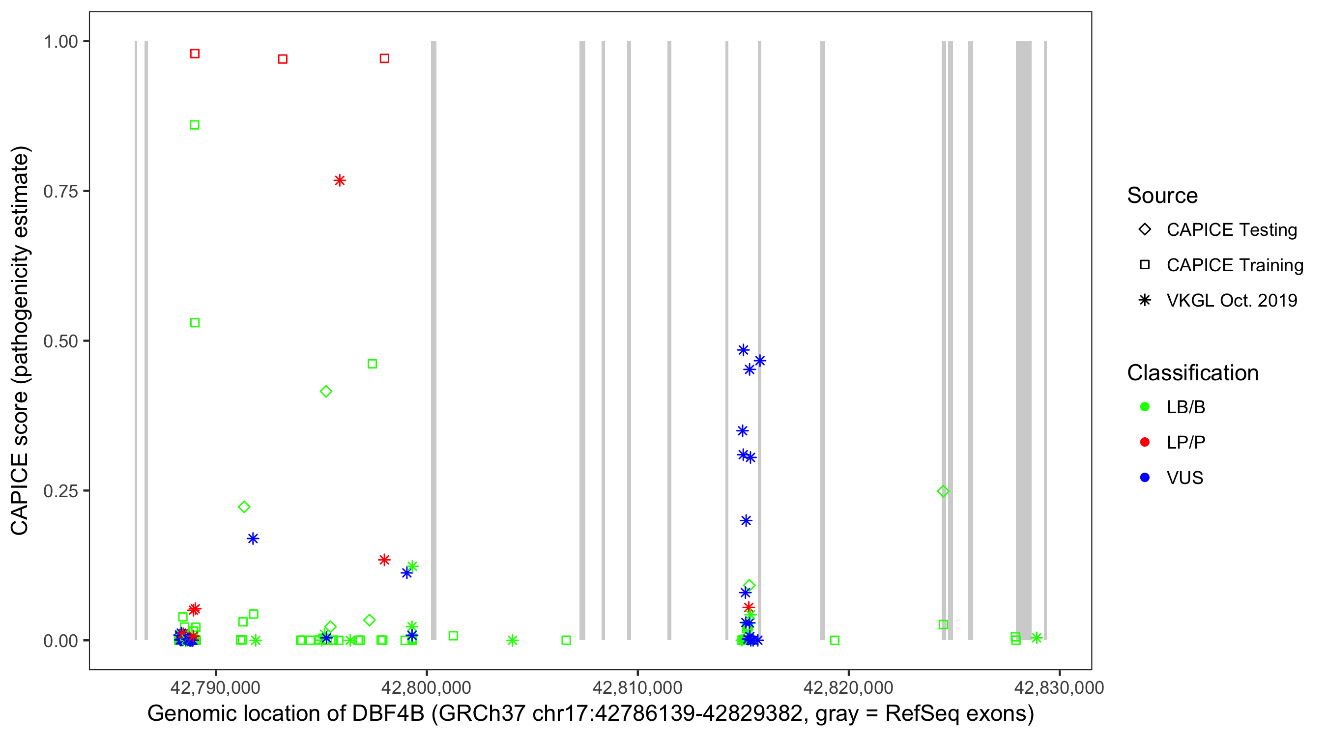 Shown are CAPICE train/test variants plus VKGL Oct 2019.