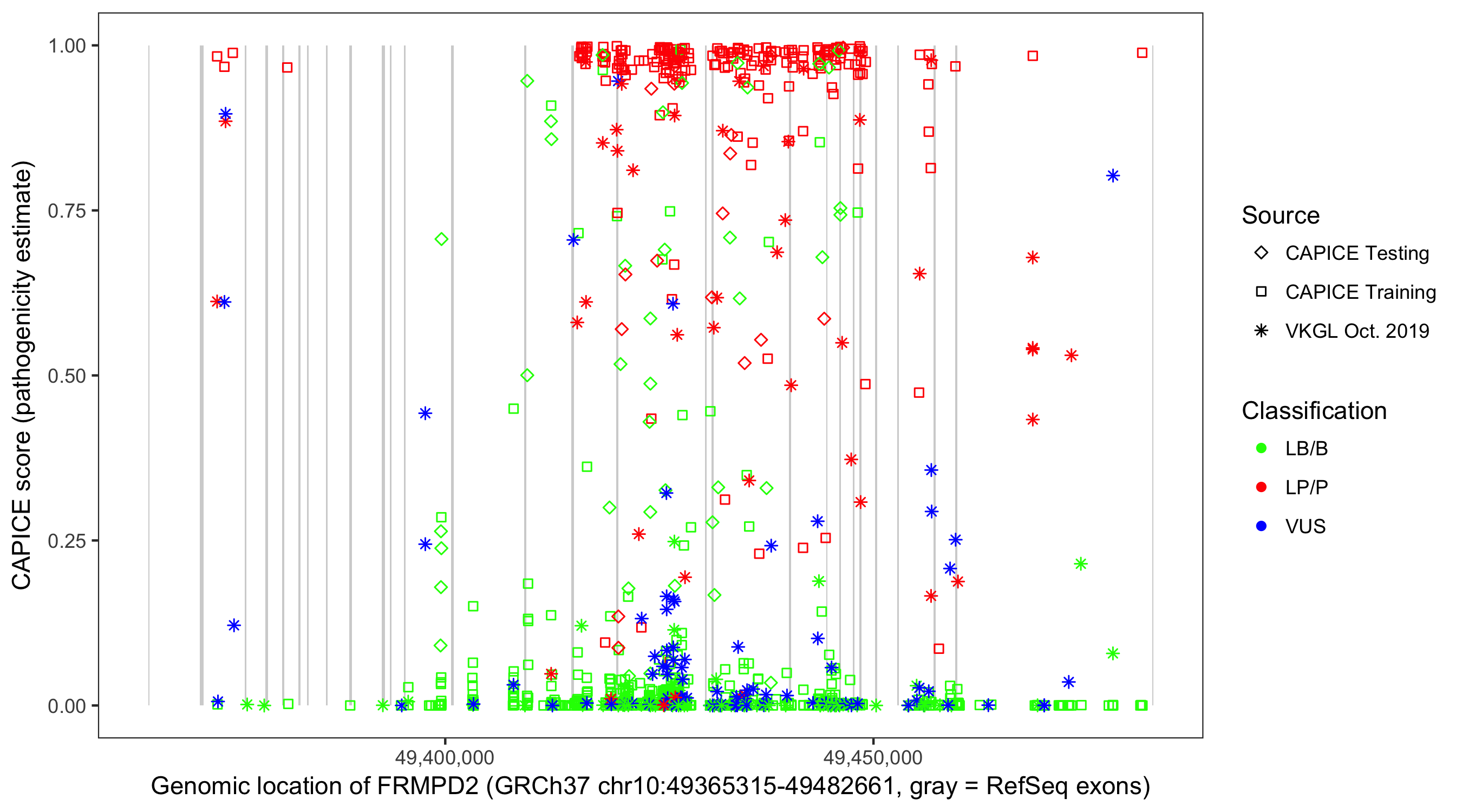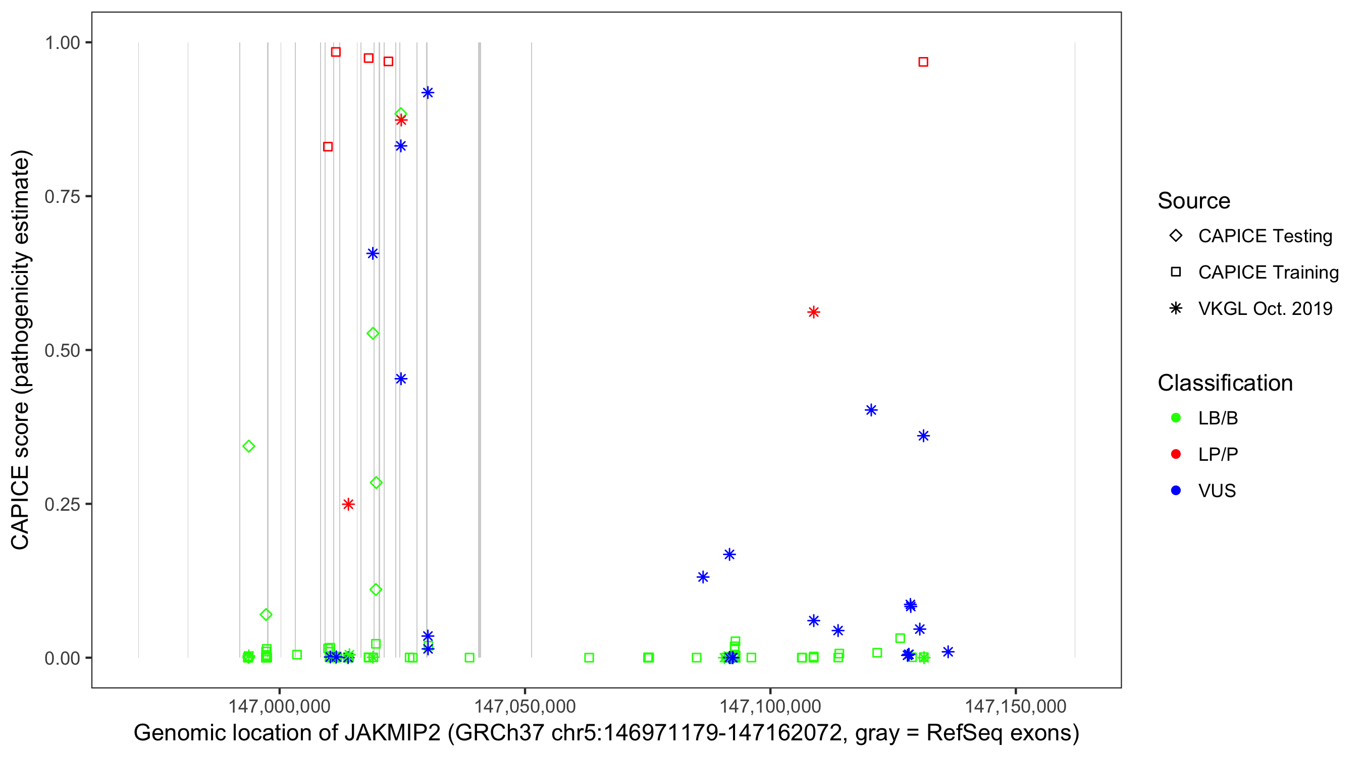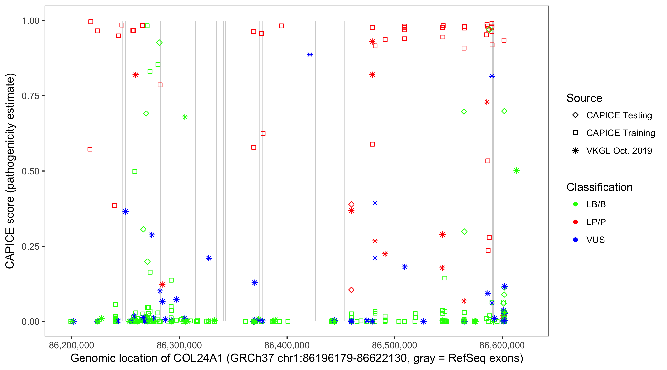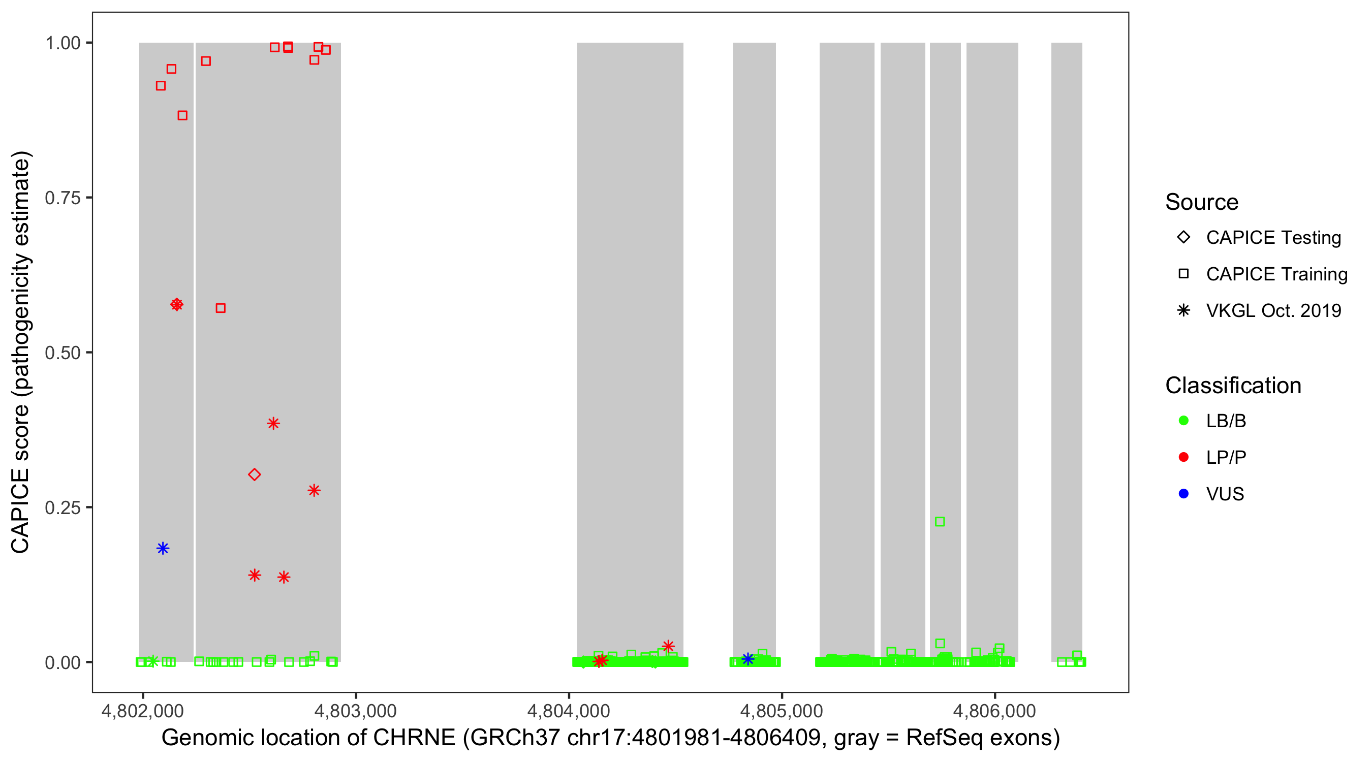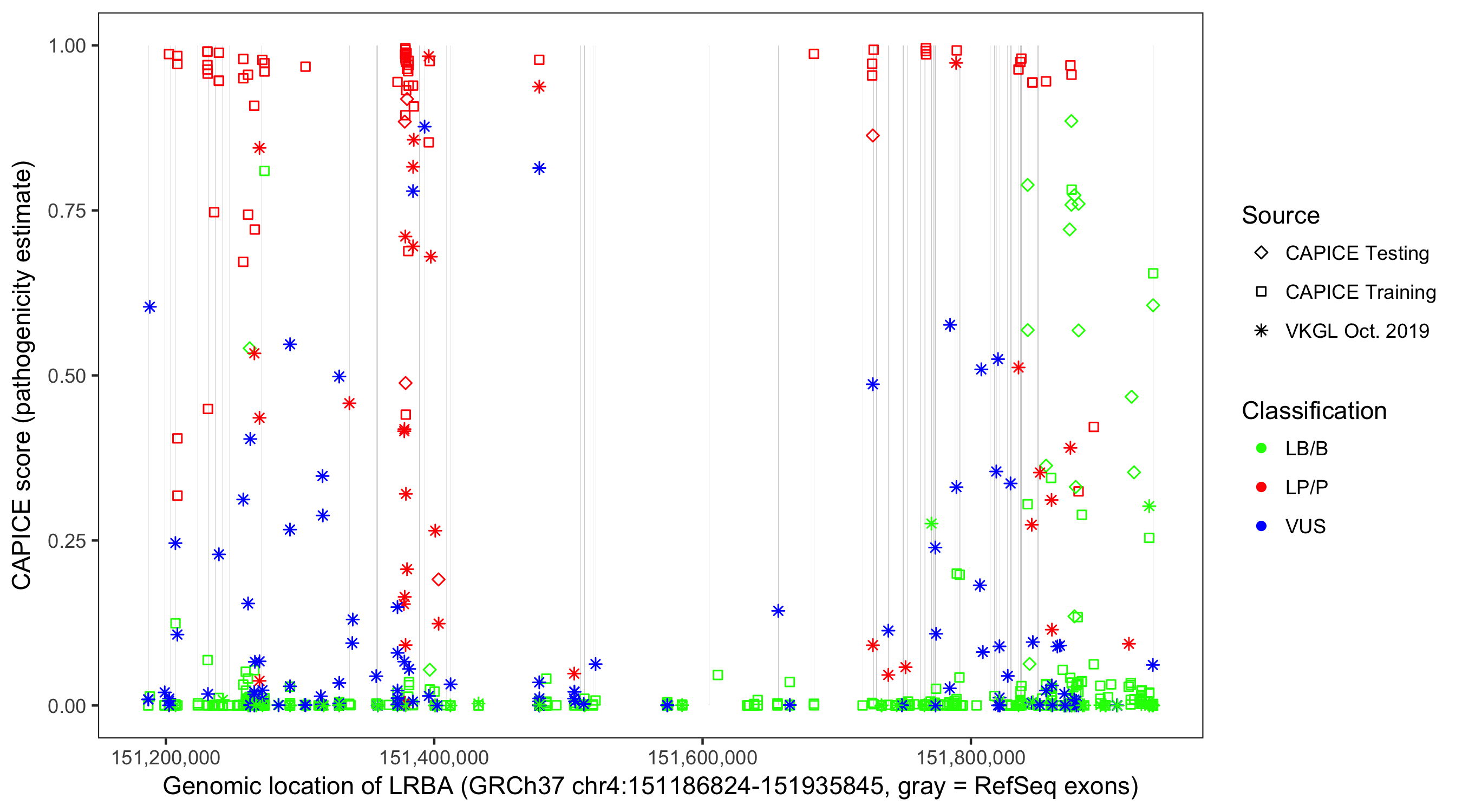 Shown are CAPICE train/test variants plus VKGL Oct 2019.