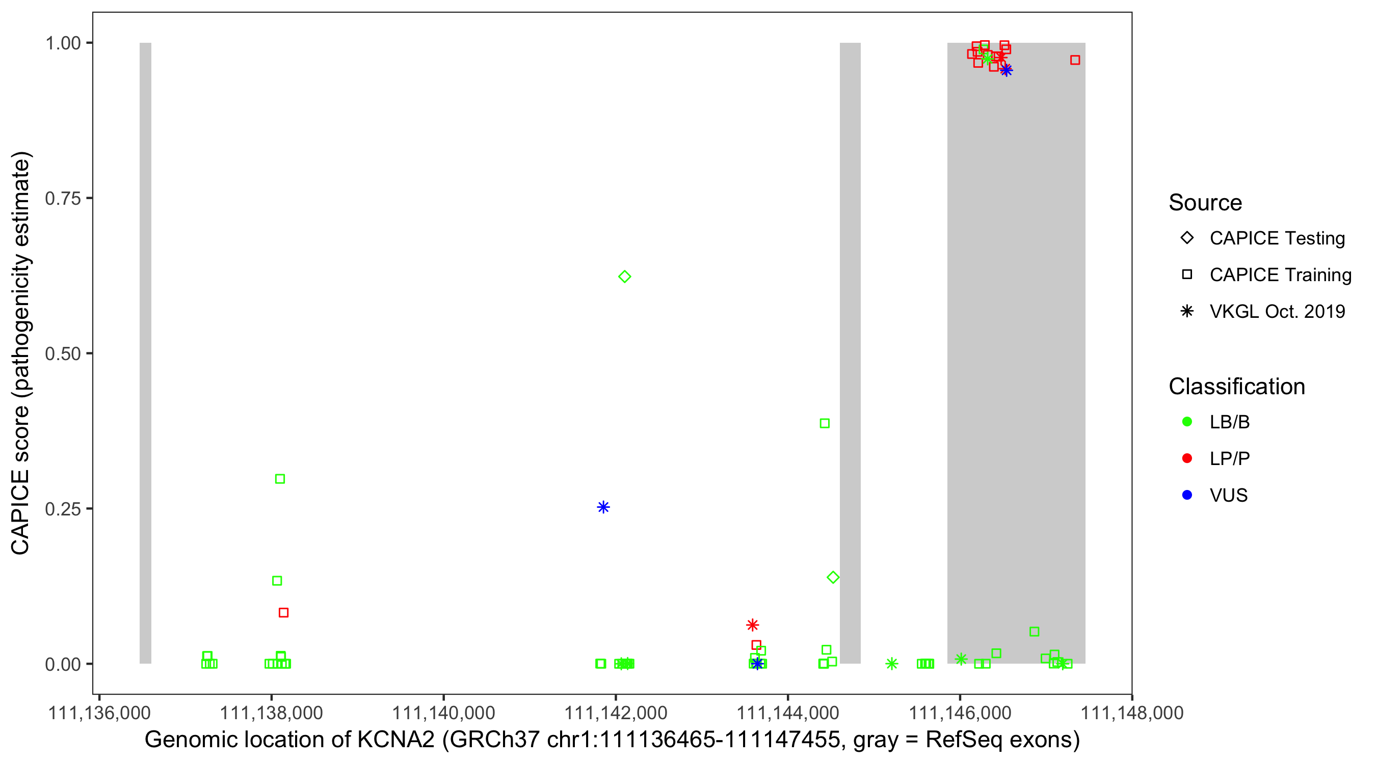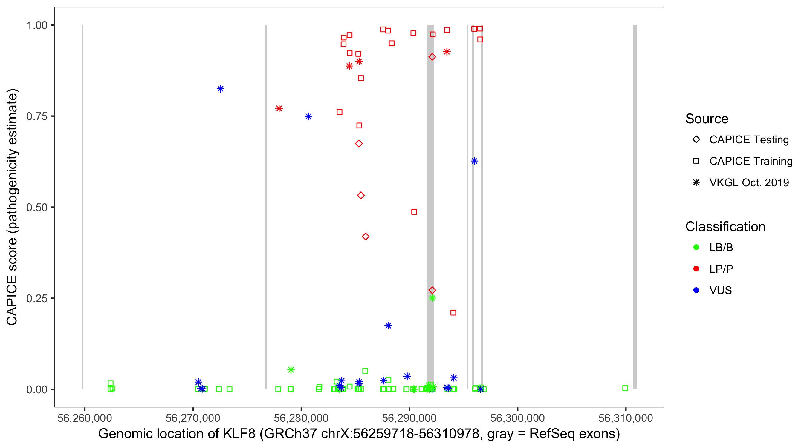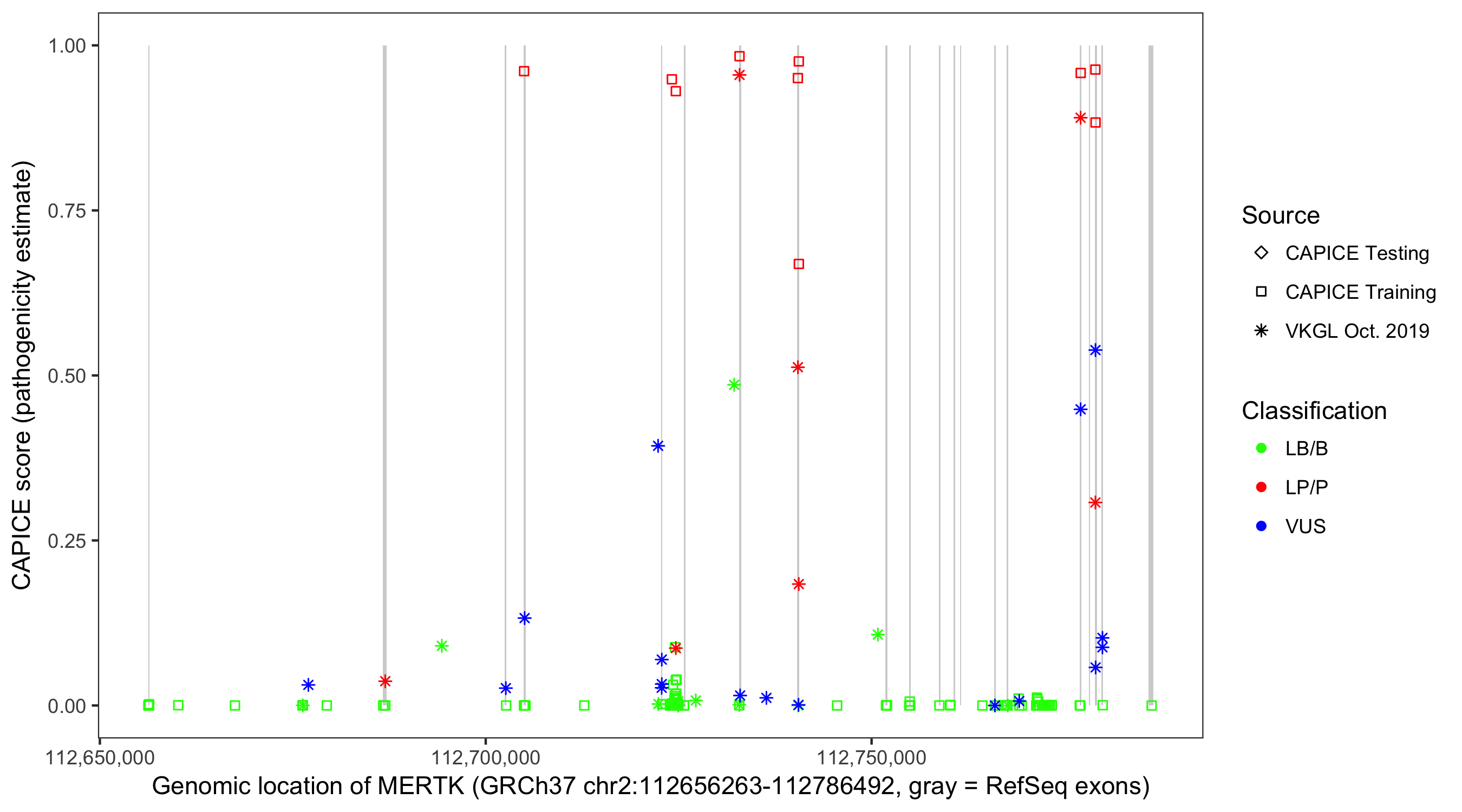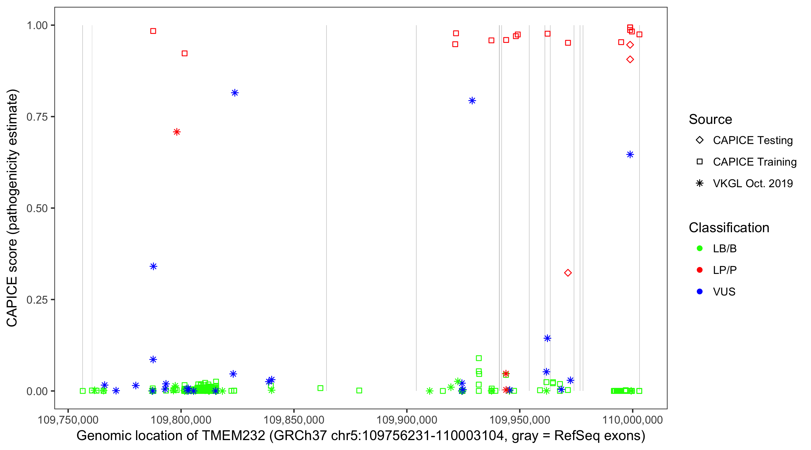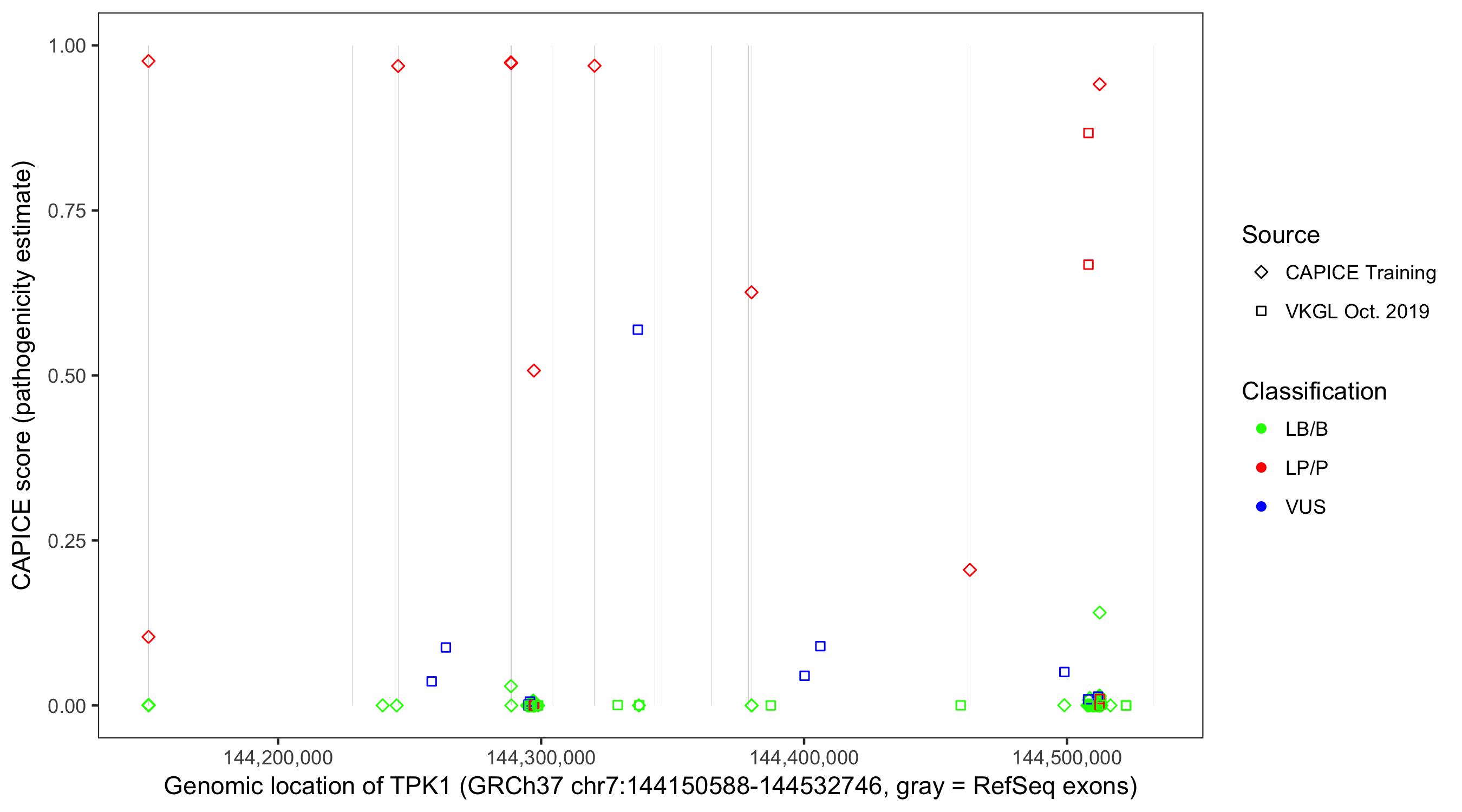 Shown are CAPICE train/test variants plus VKGL Oct 2019.