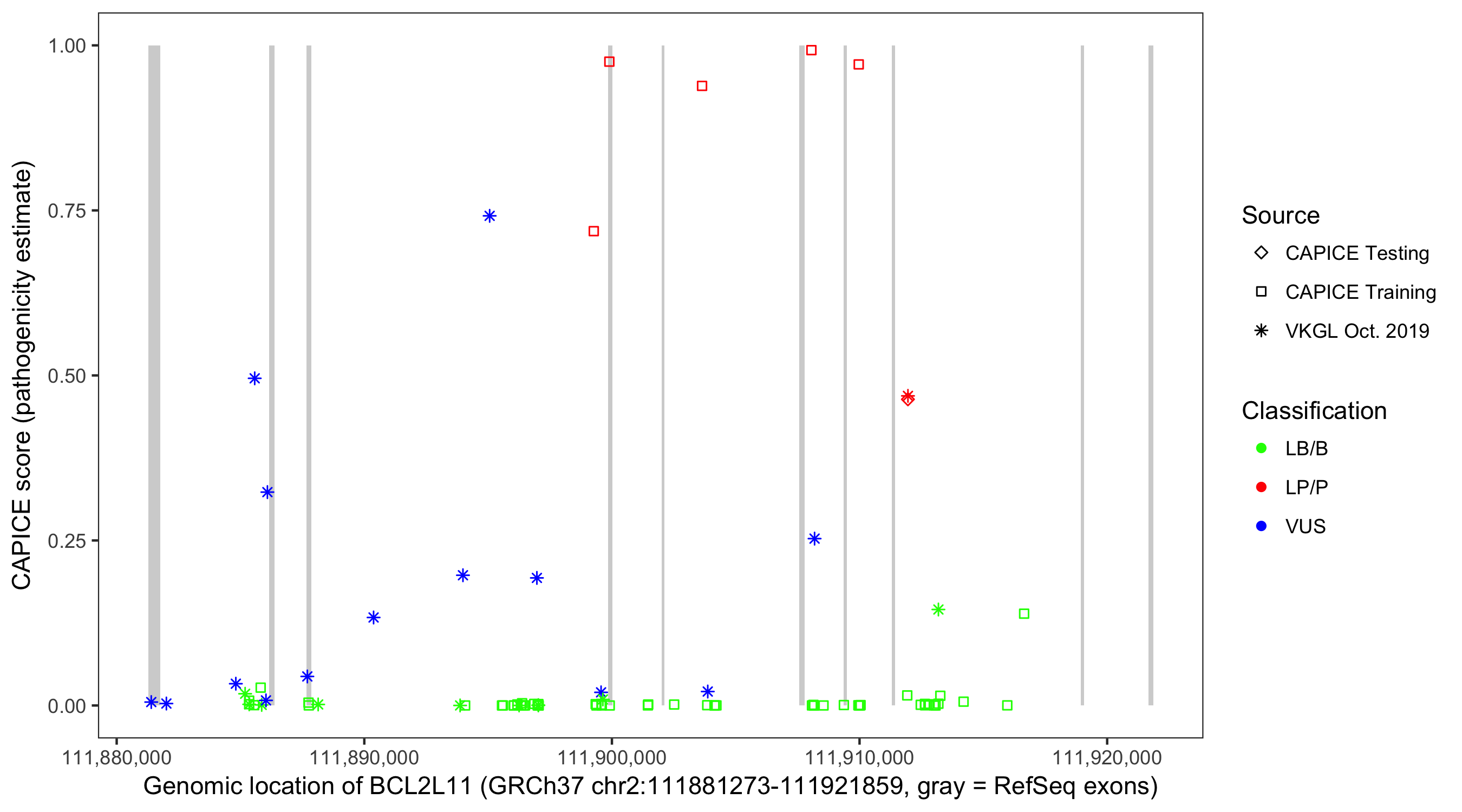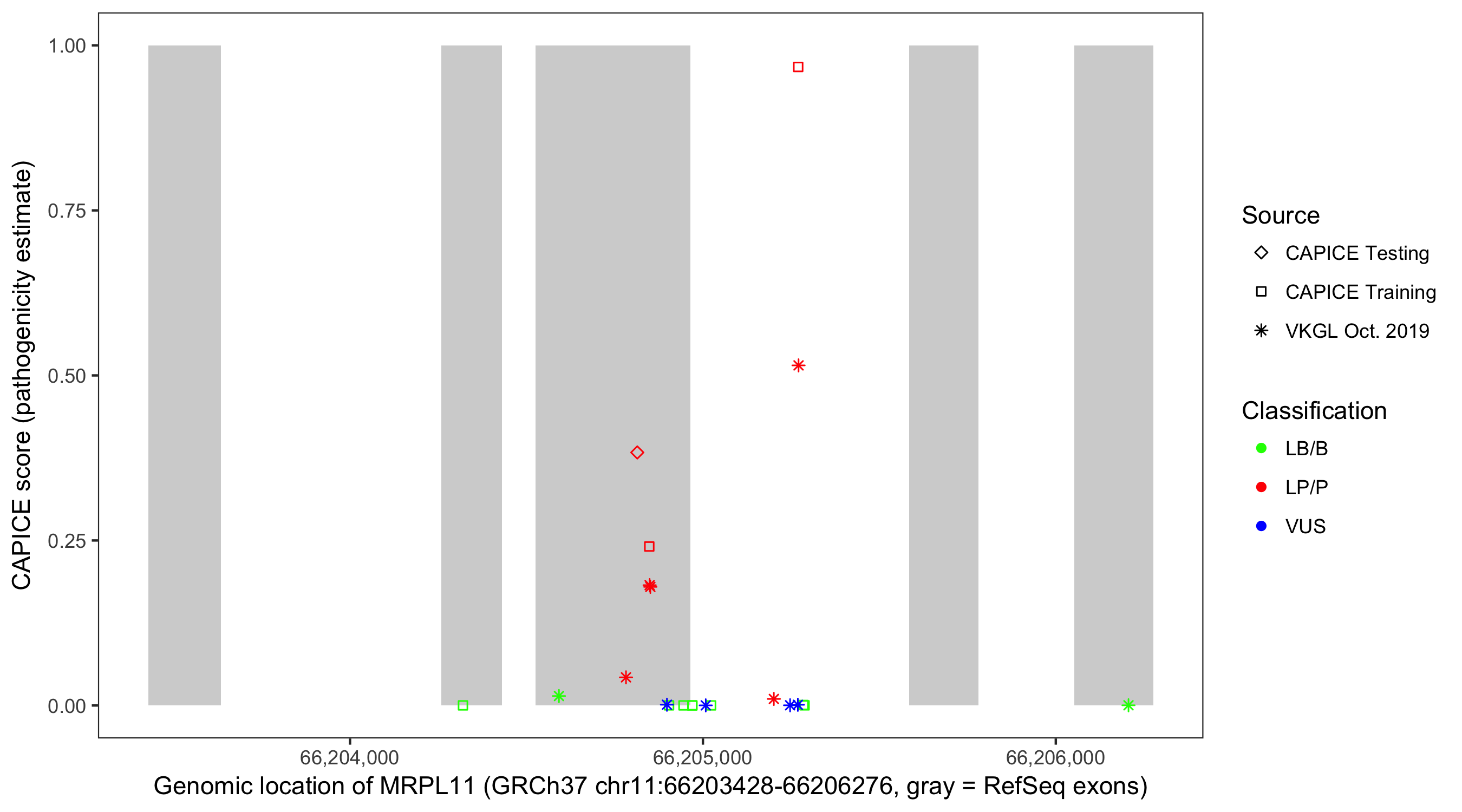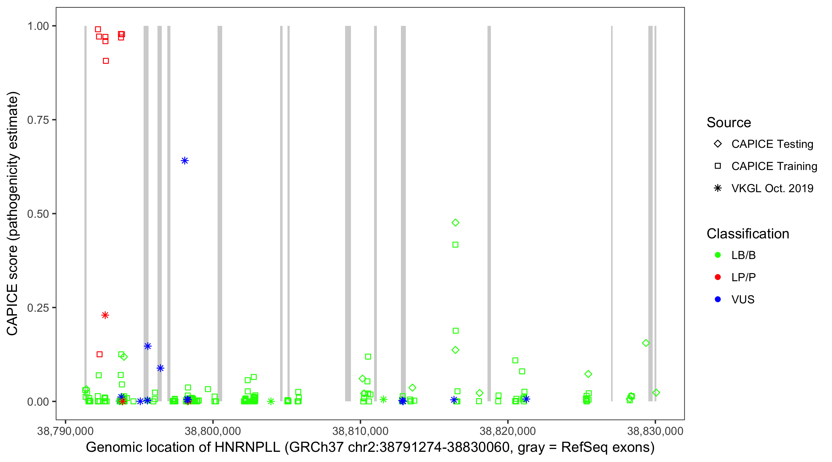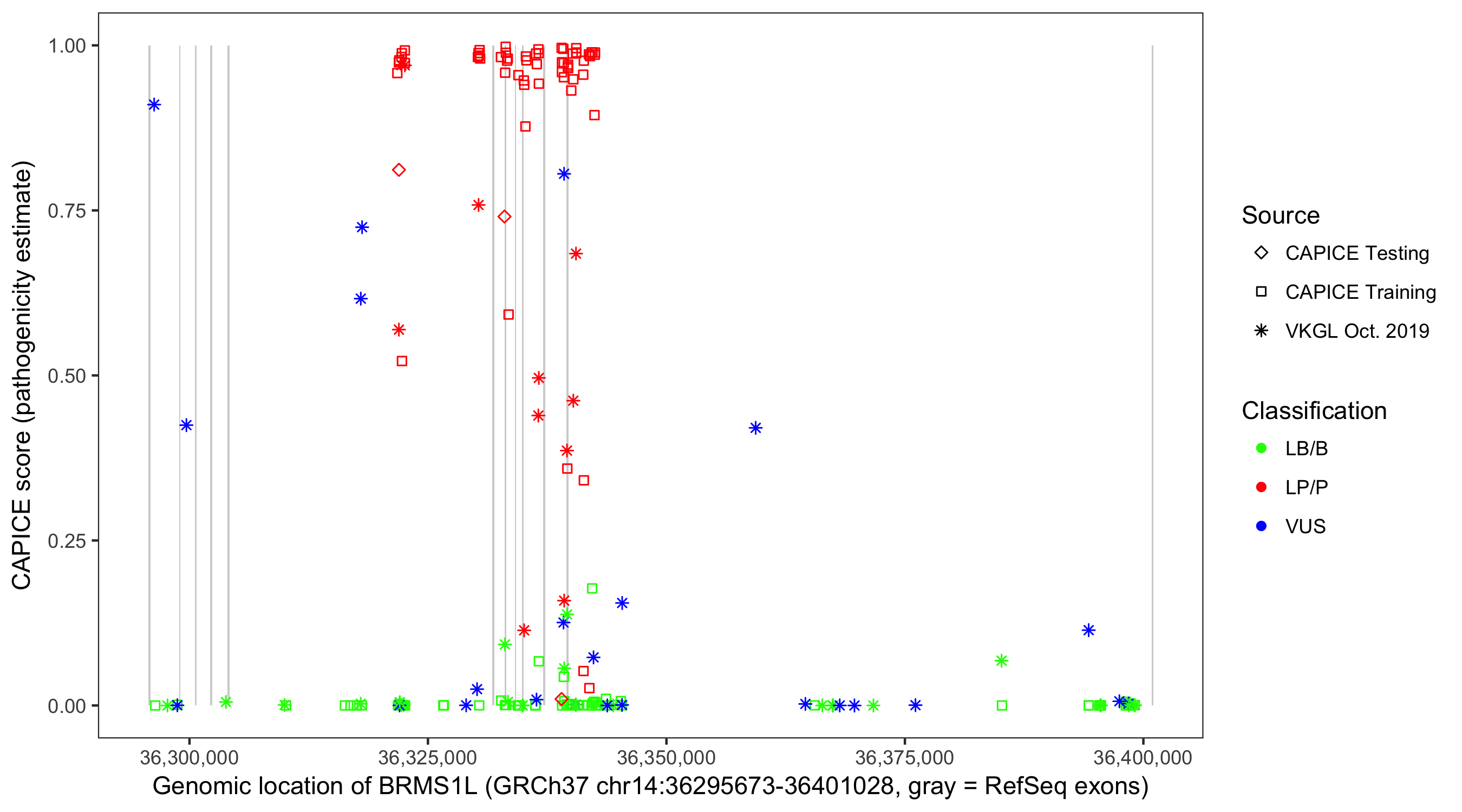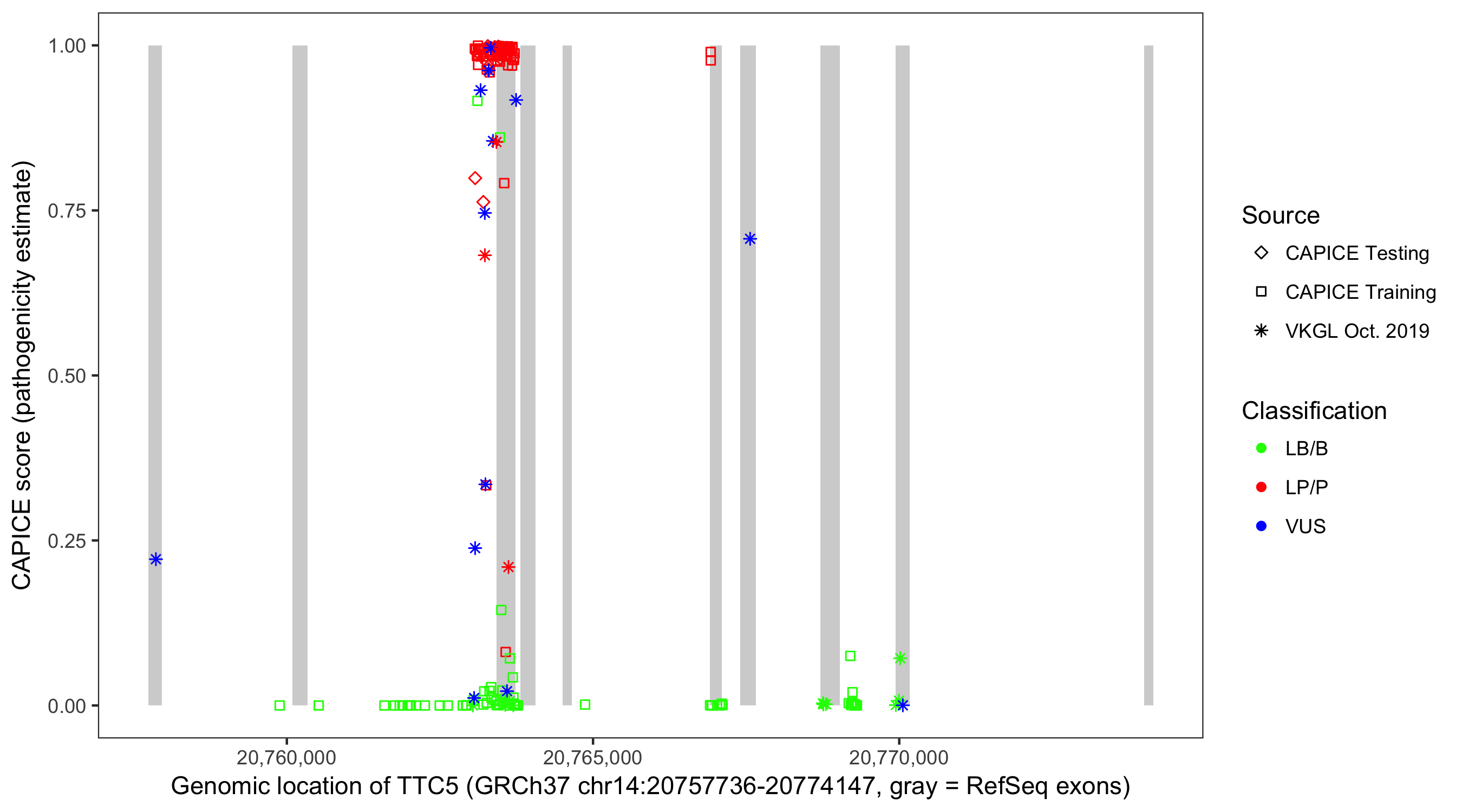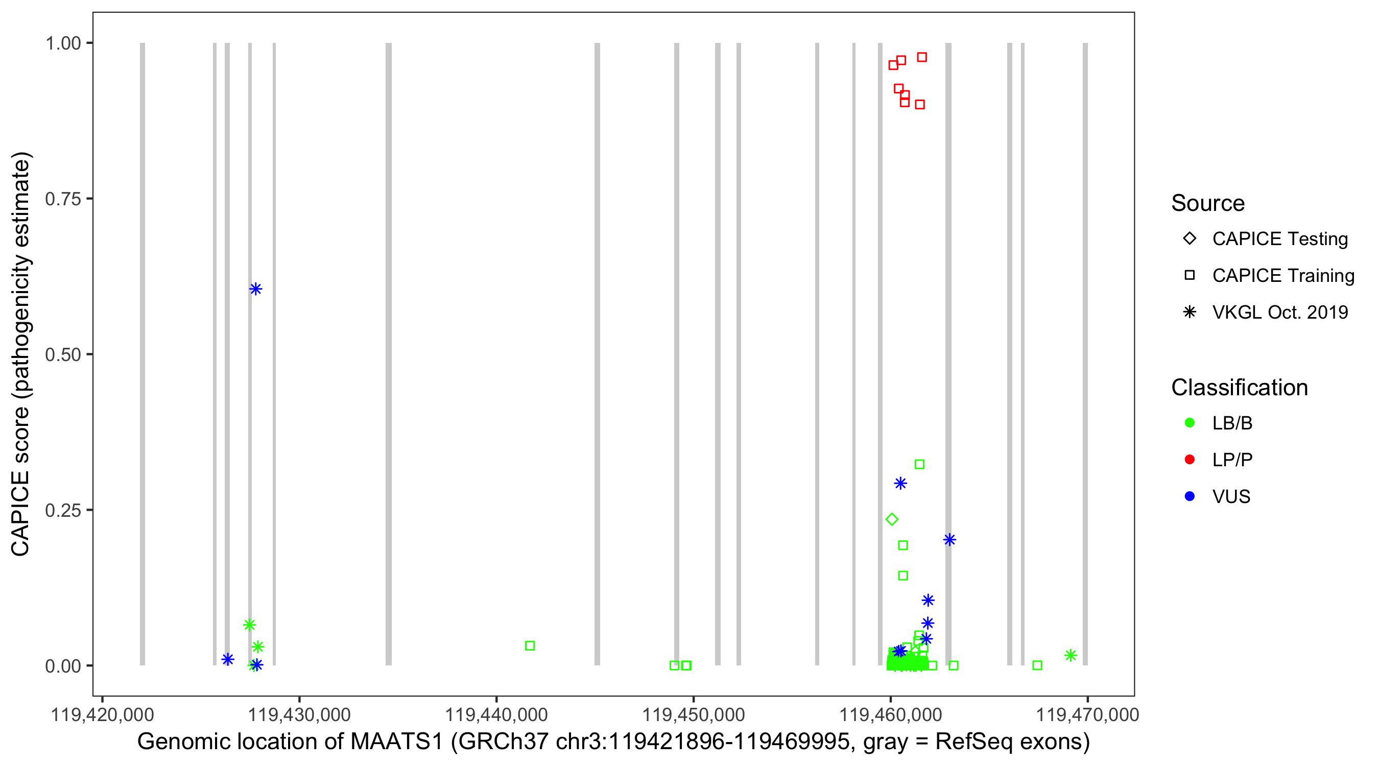 Shown are CAPICE train/test variants plus VKGL Oct 2019.