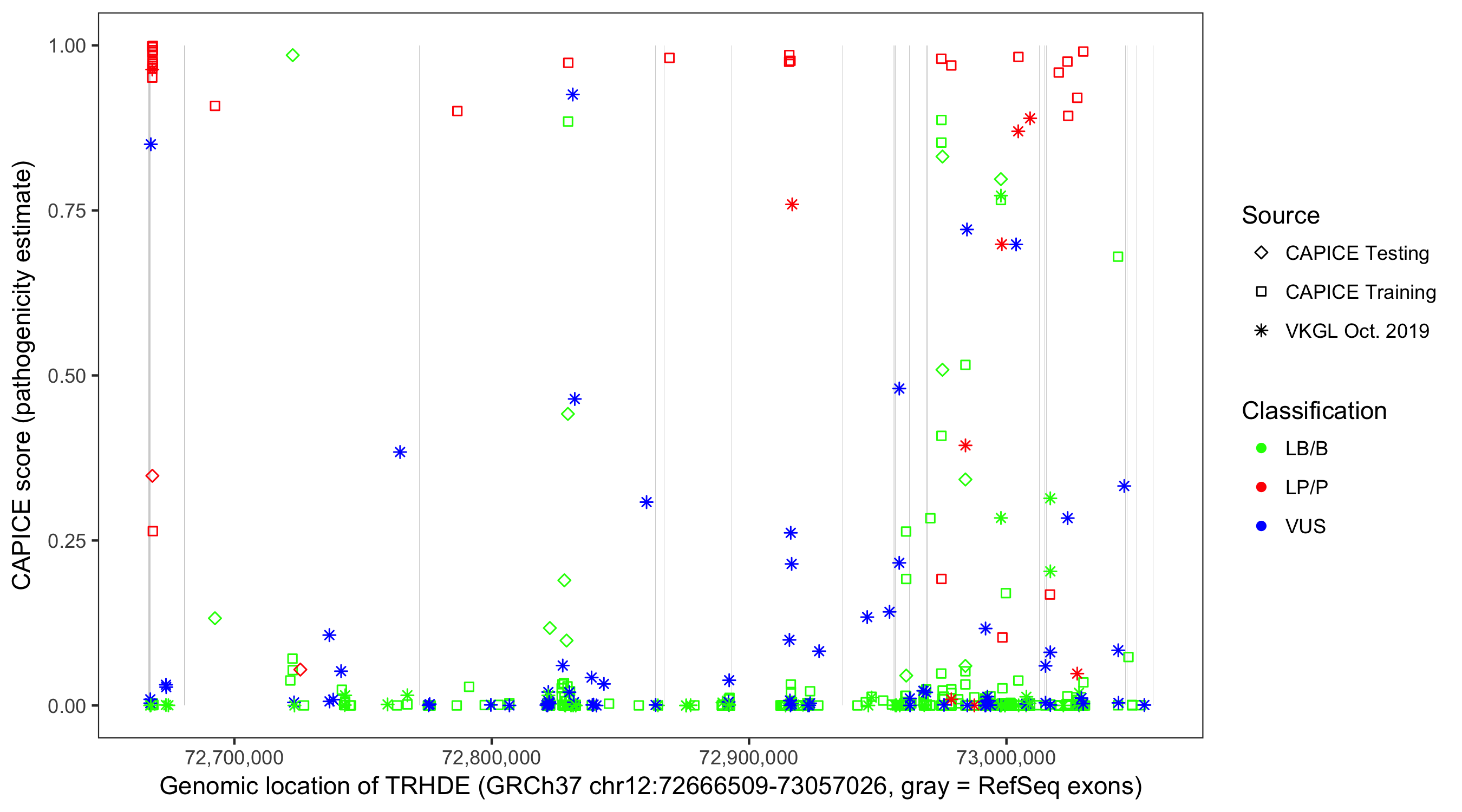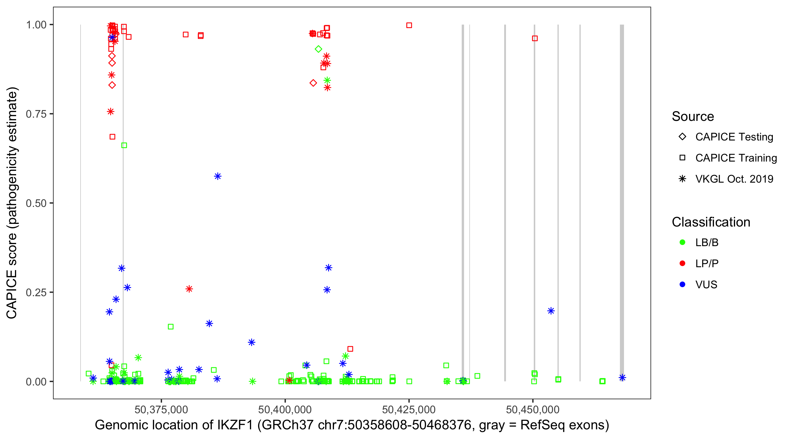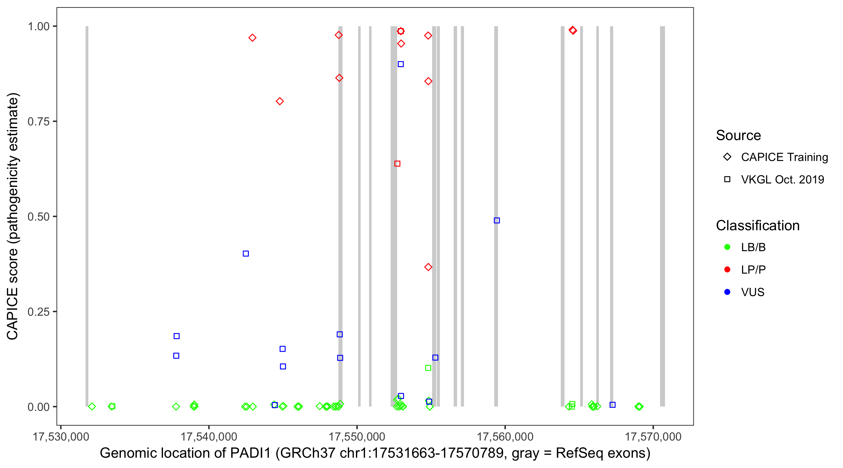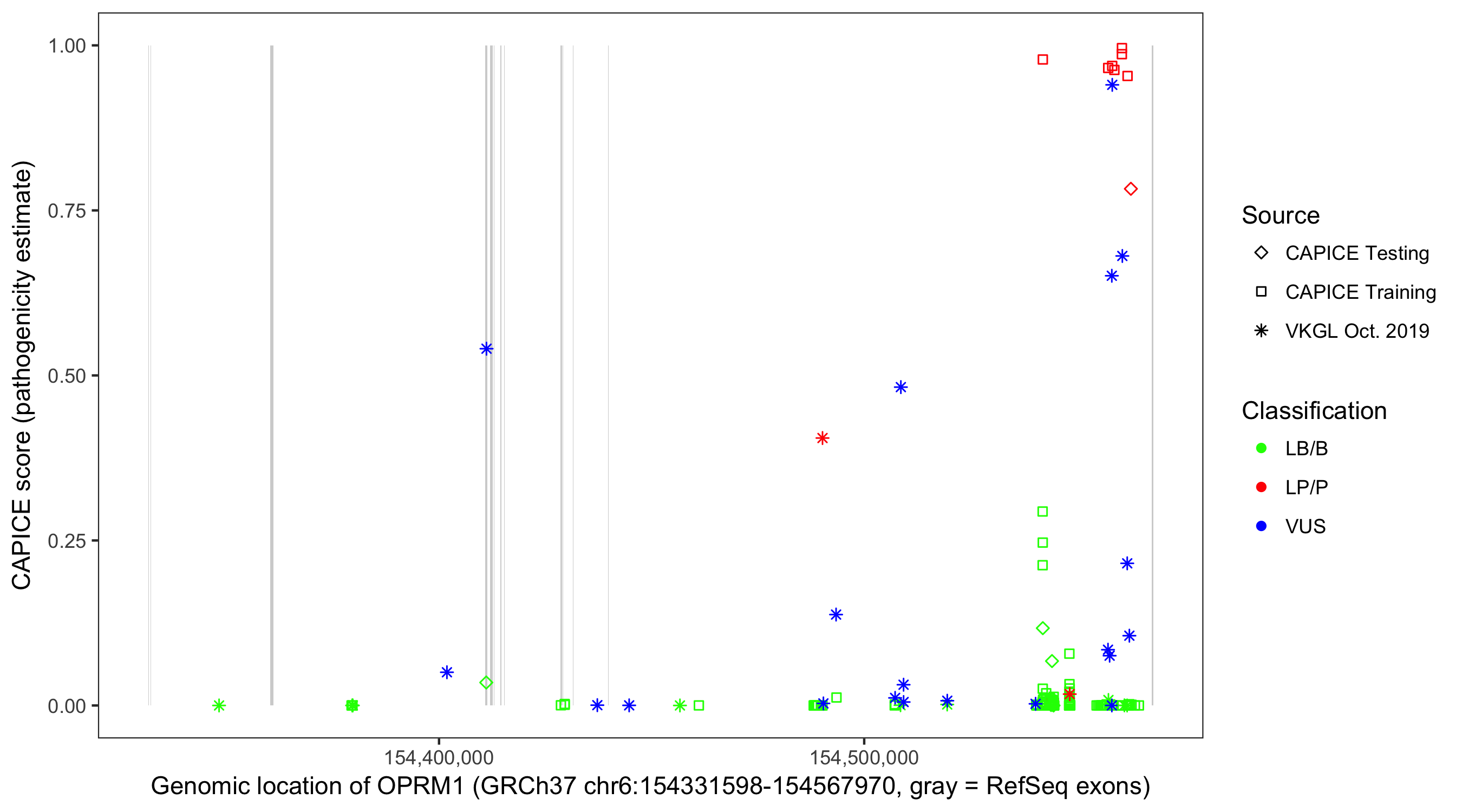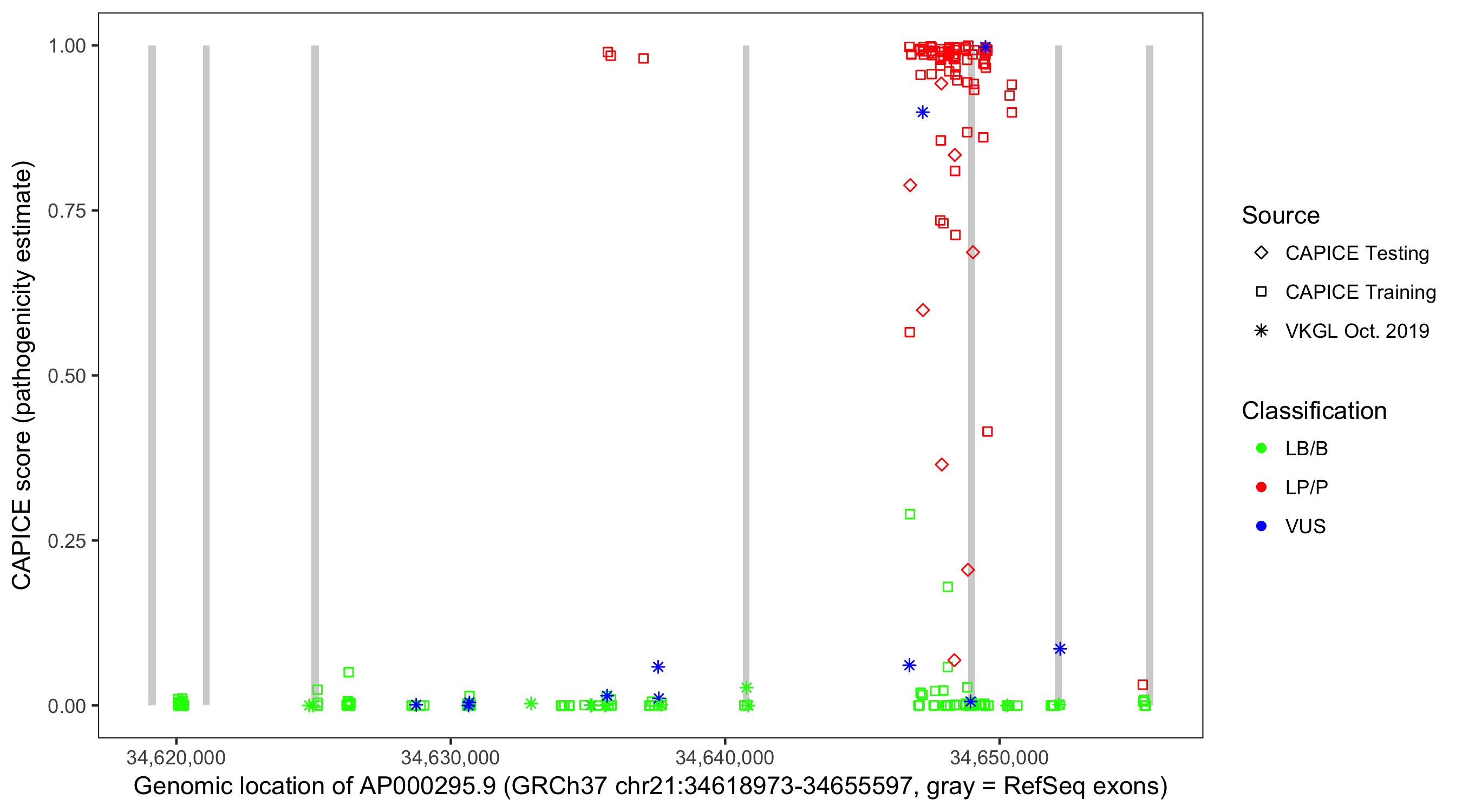 Shown are CAPICE train/test variants plus VKGL Oct 2019.