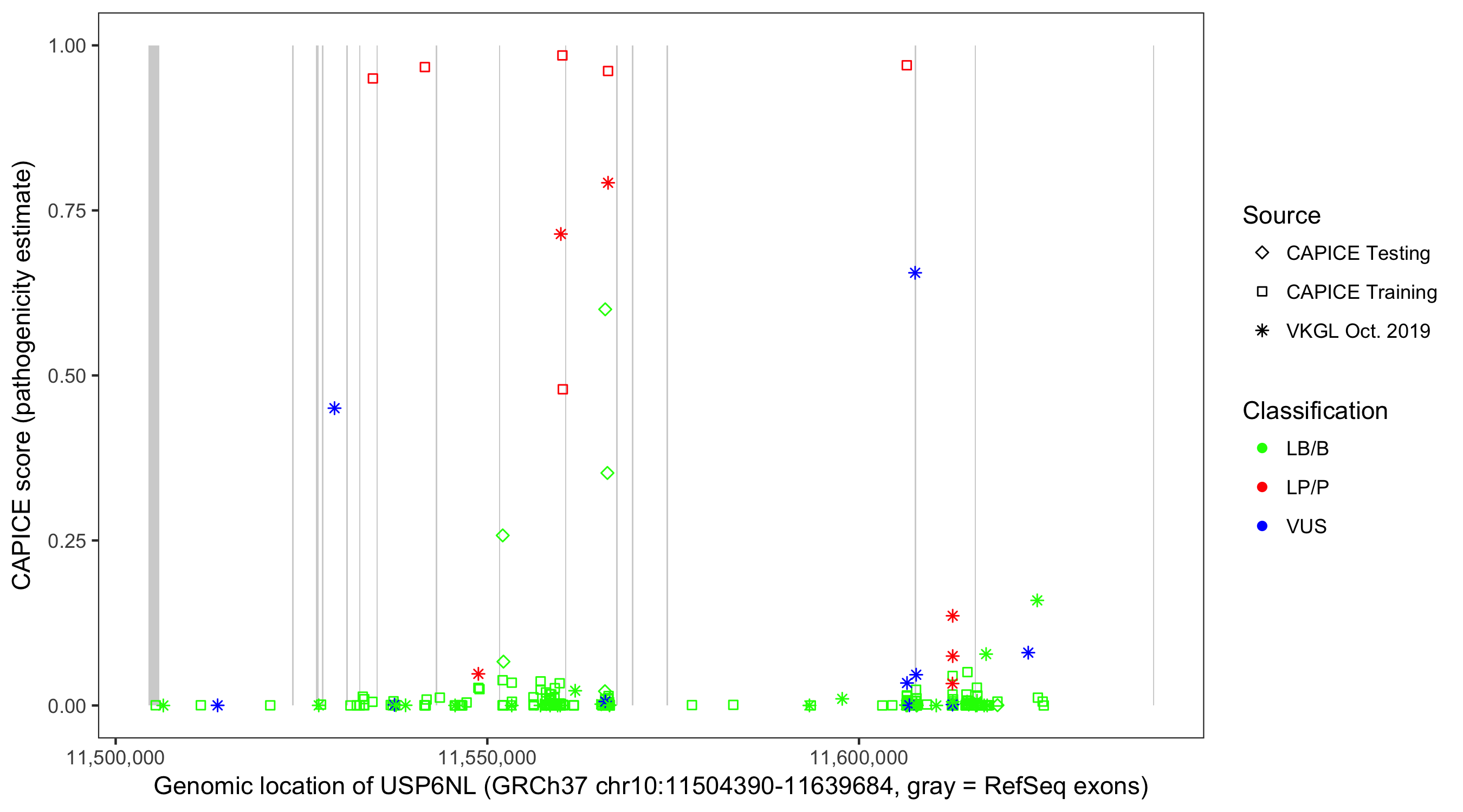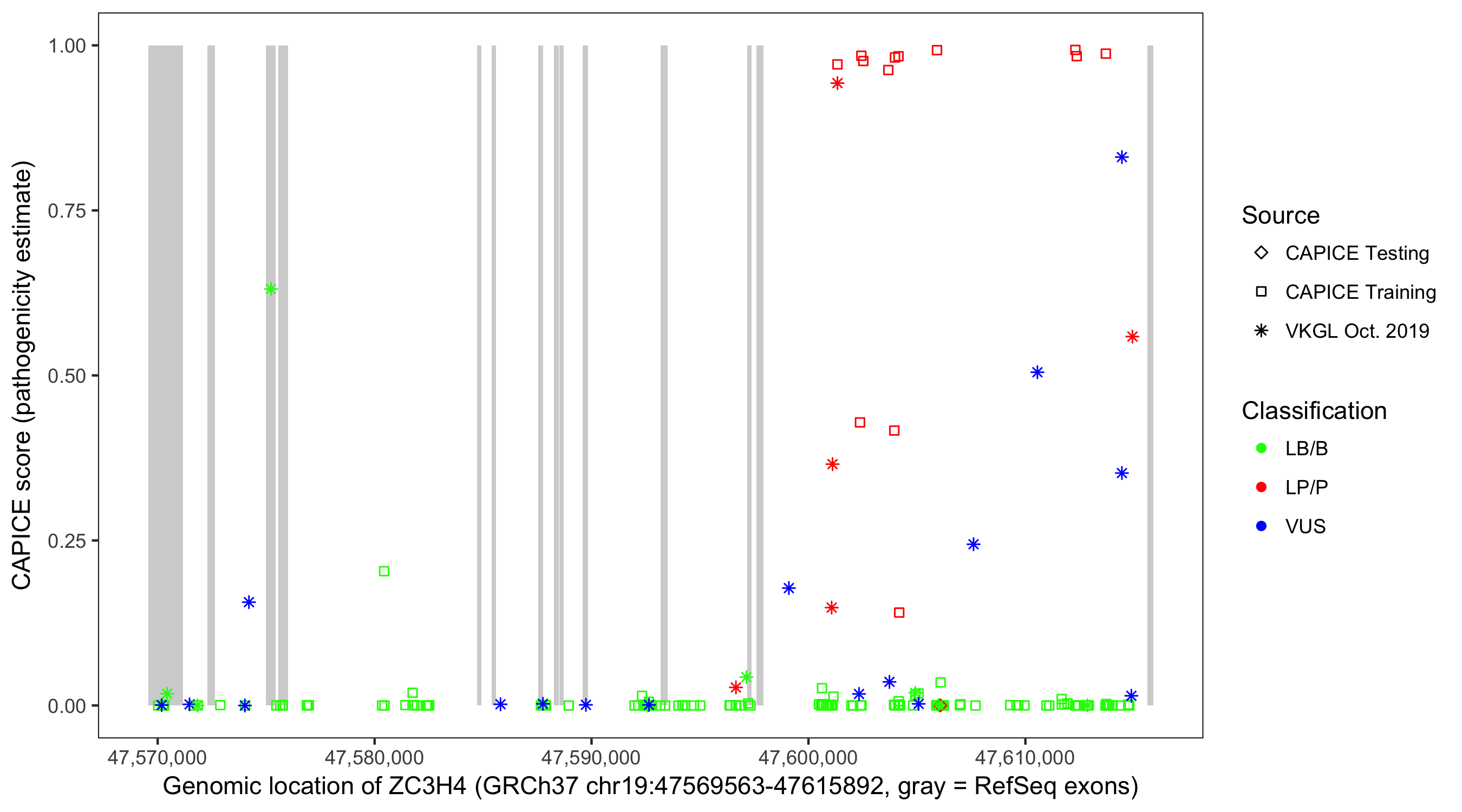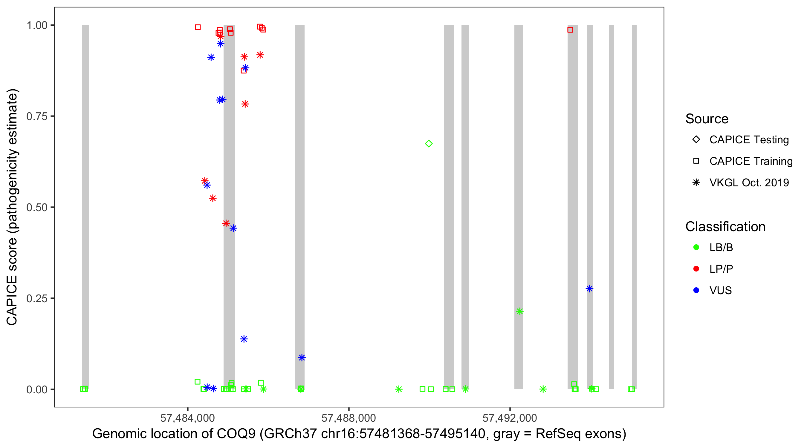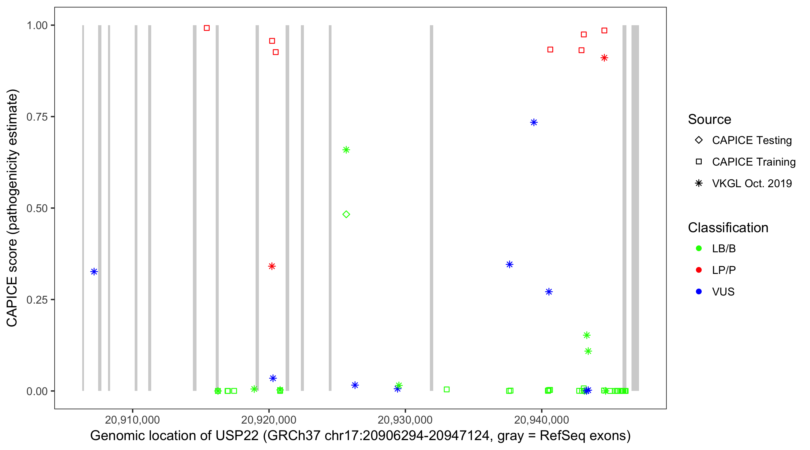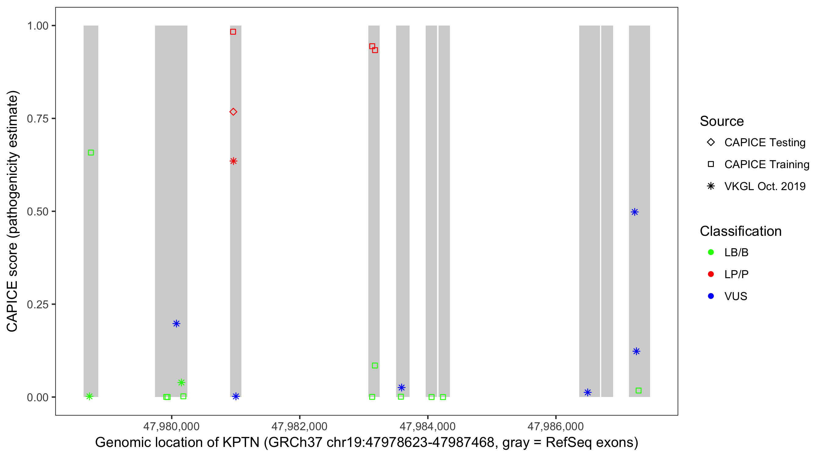 Shown are CAPICE train/test variants plus VKGL Oct 2019.