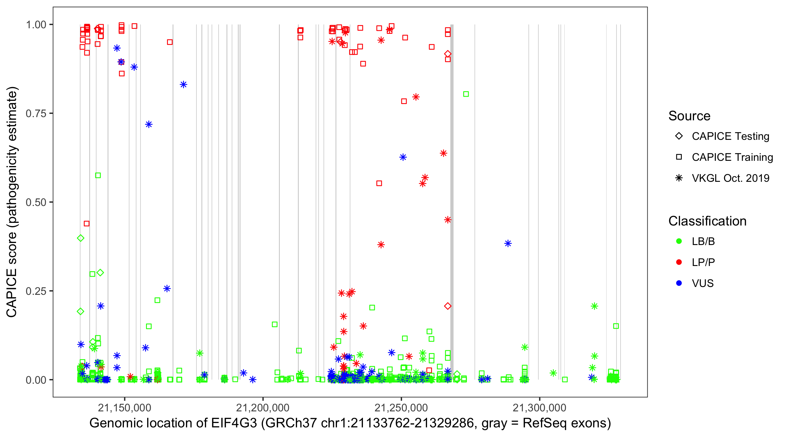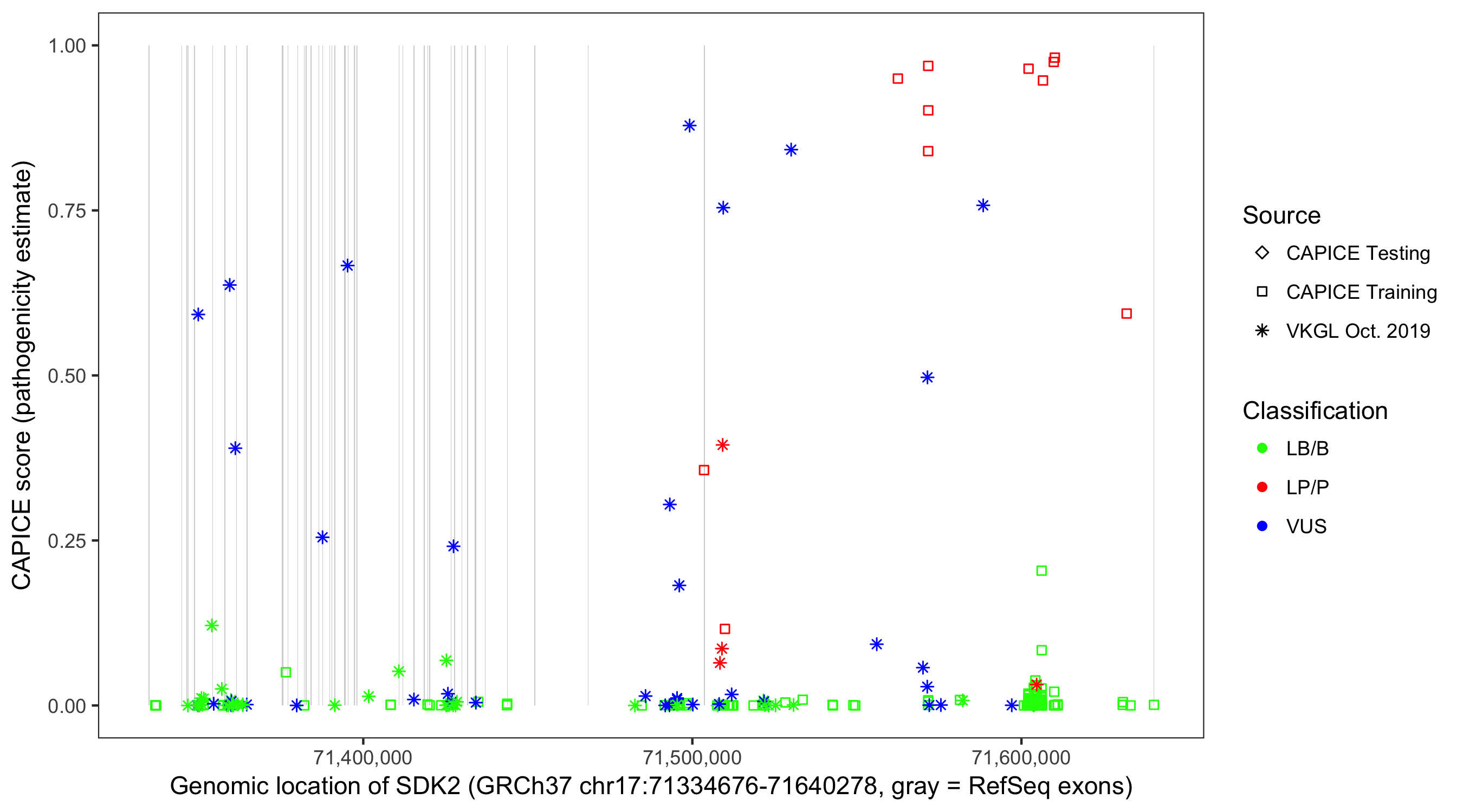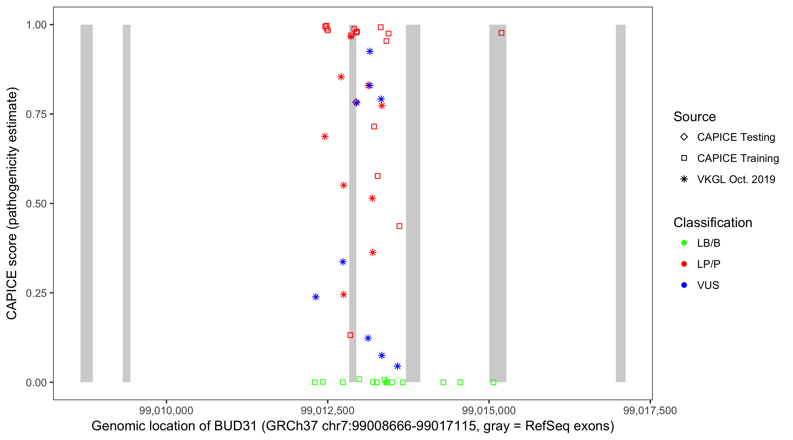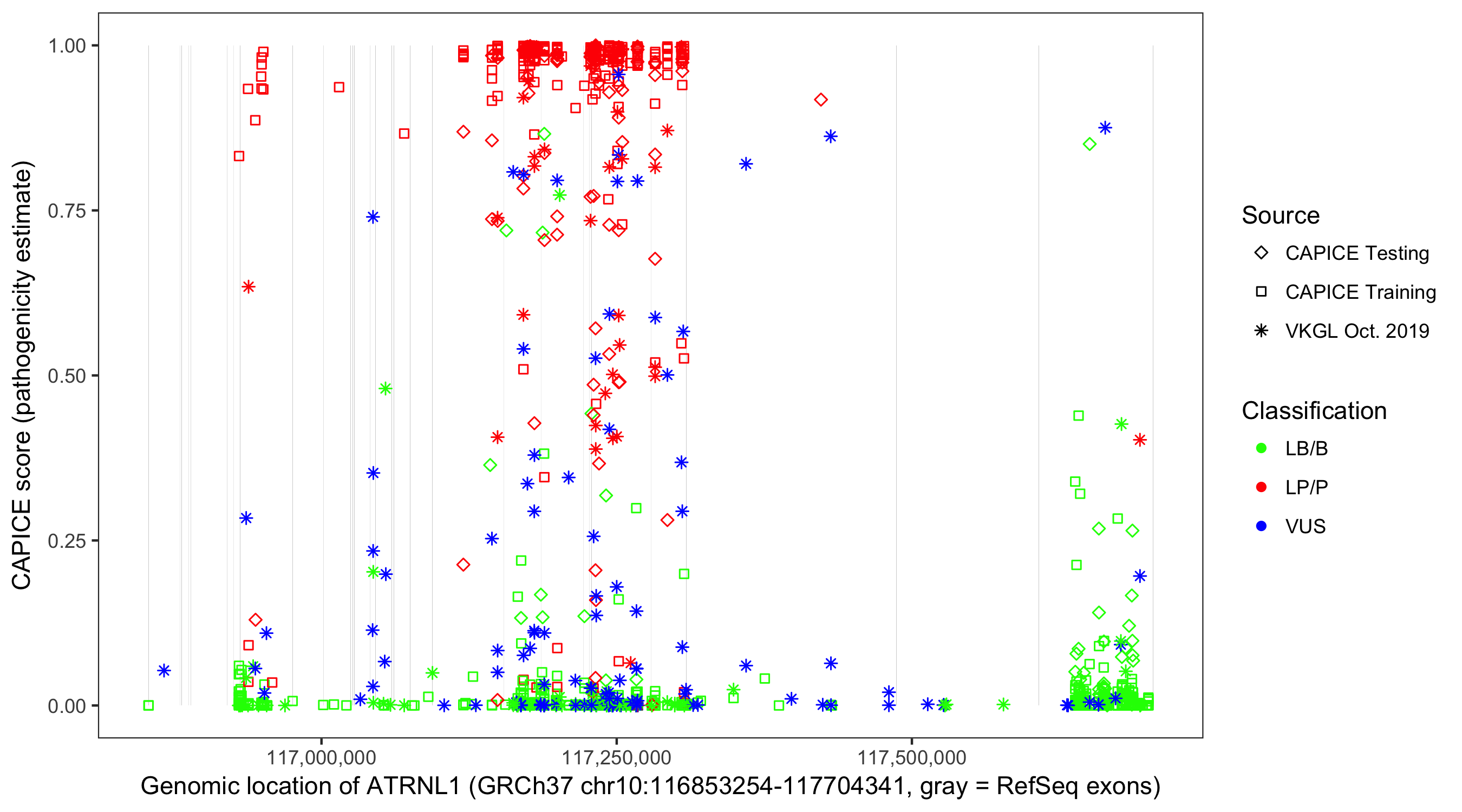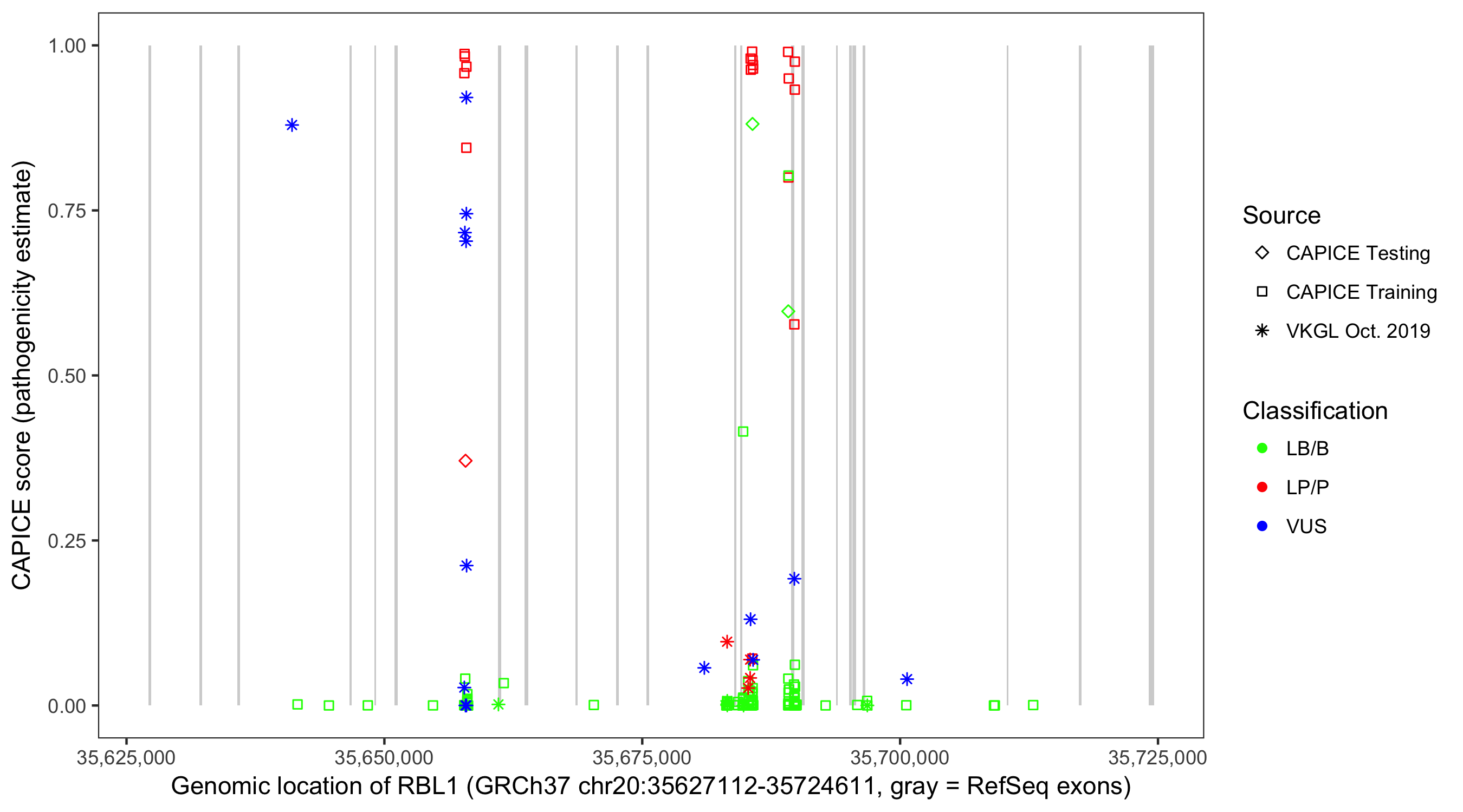 Shown are CAPICE train/test variants plus VKGL Oct 2019.