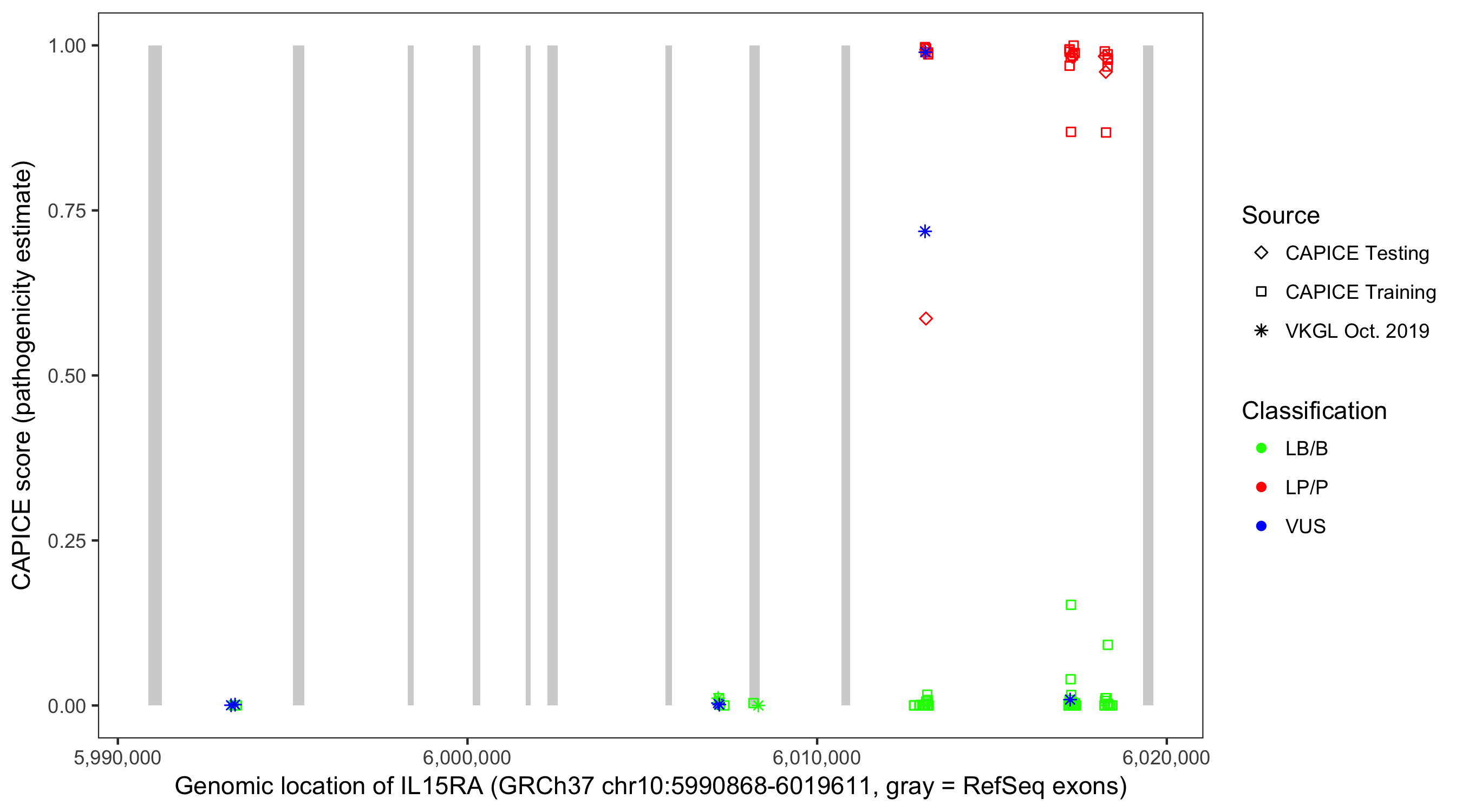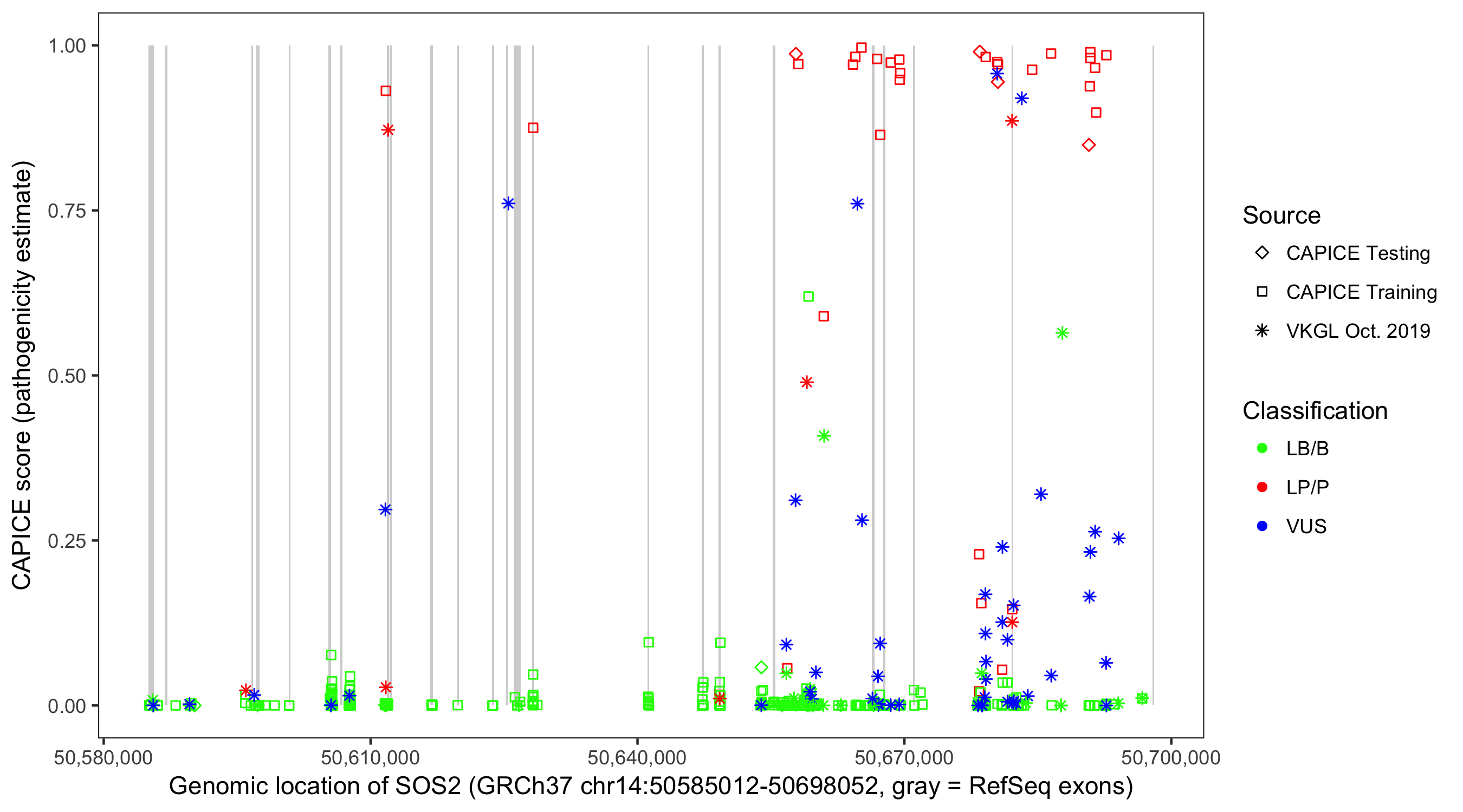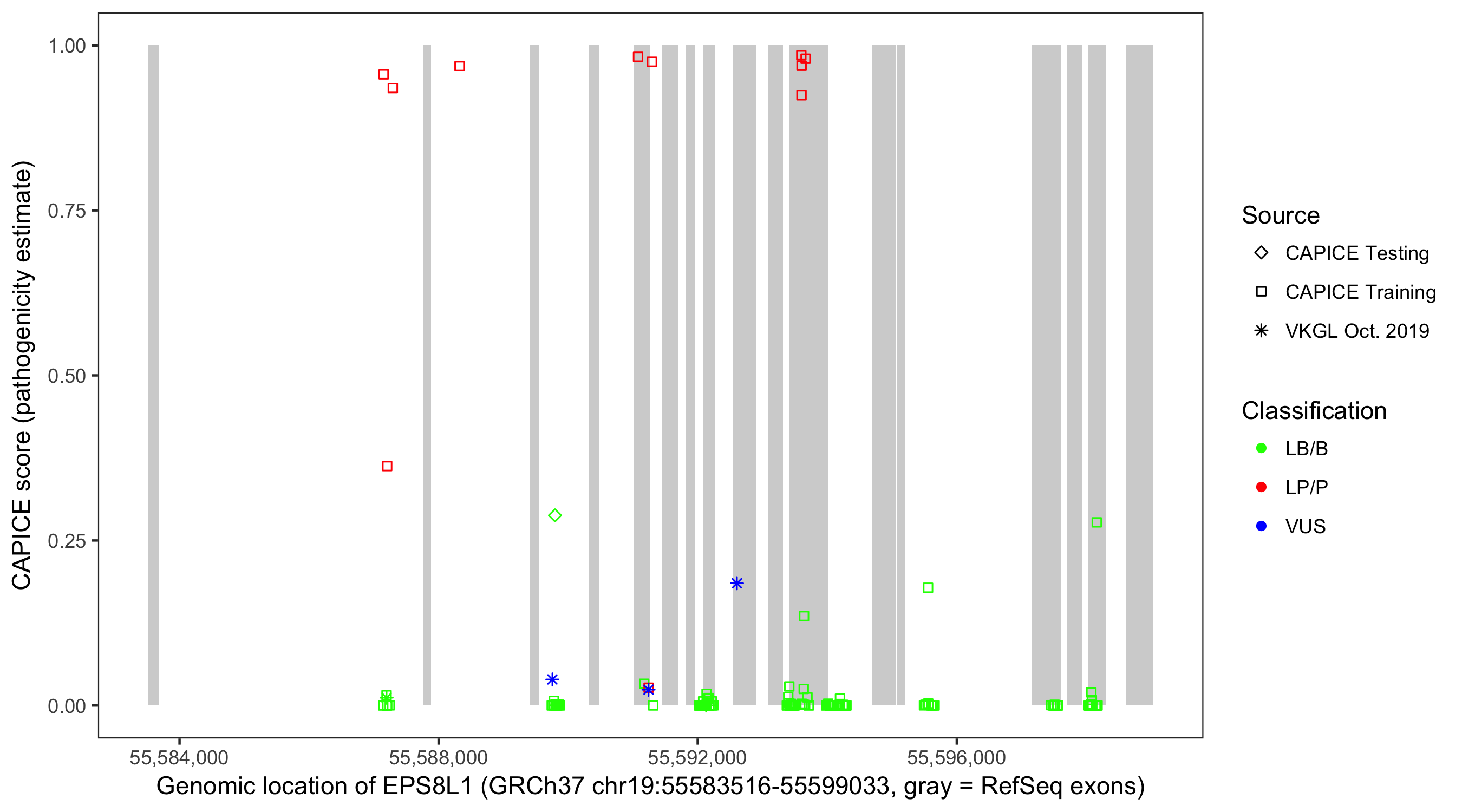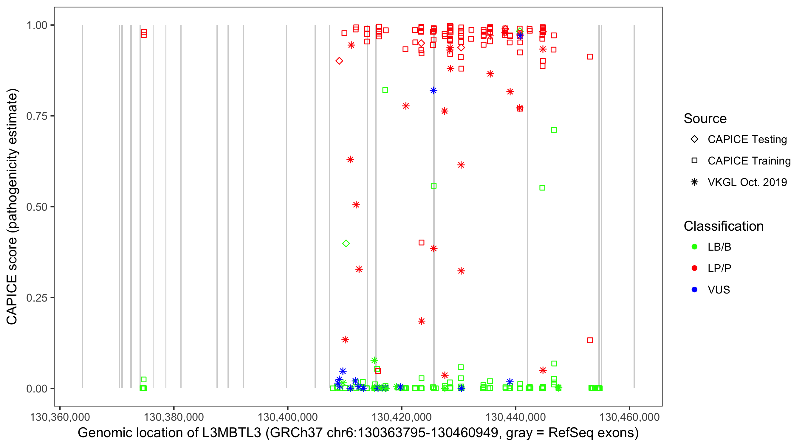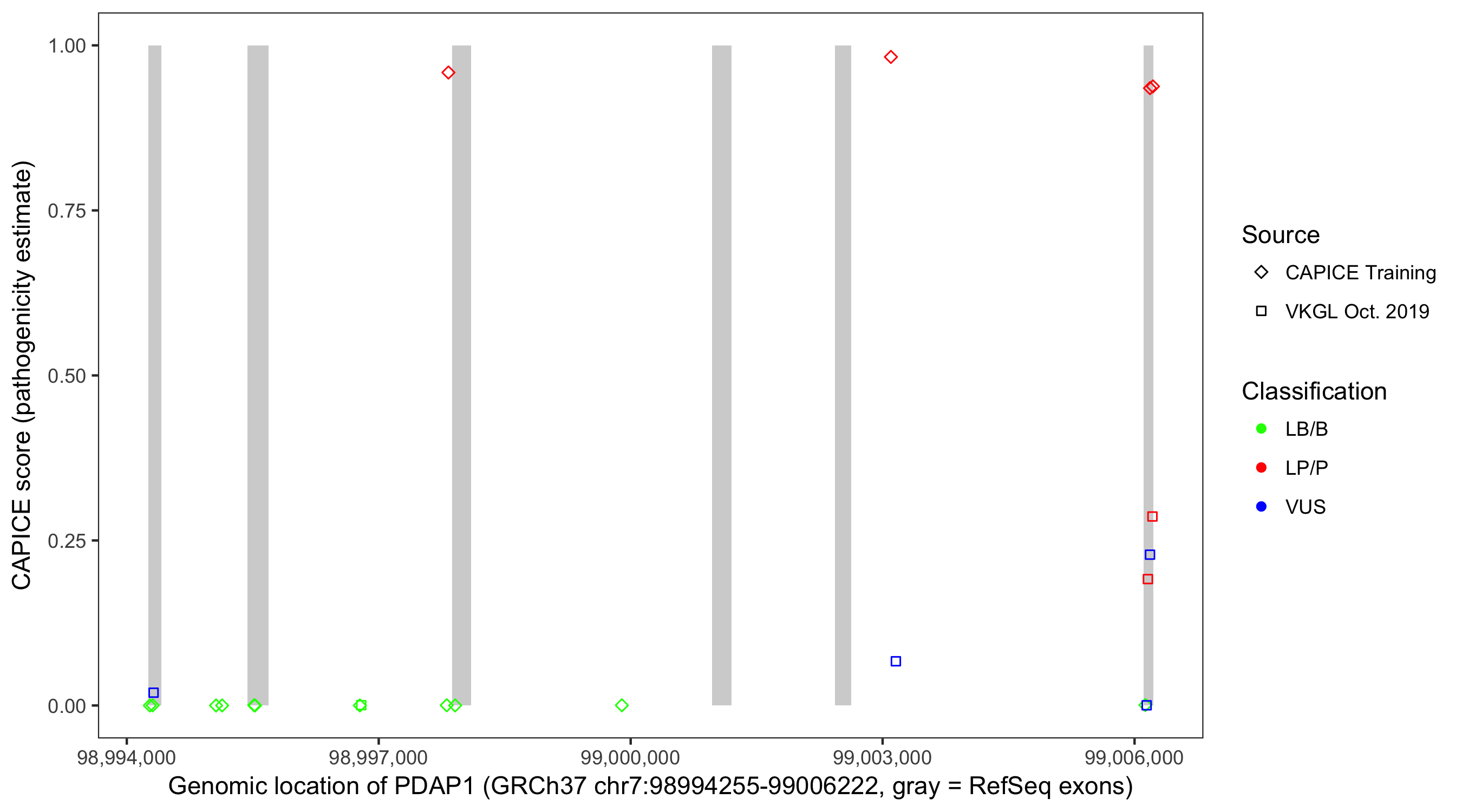 Shown are CAPICE train/test variants plus VKGL Oct 2019.