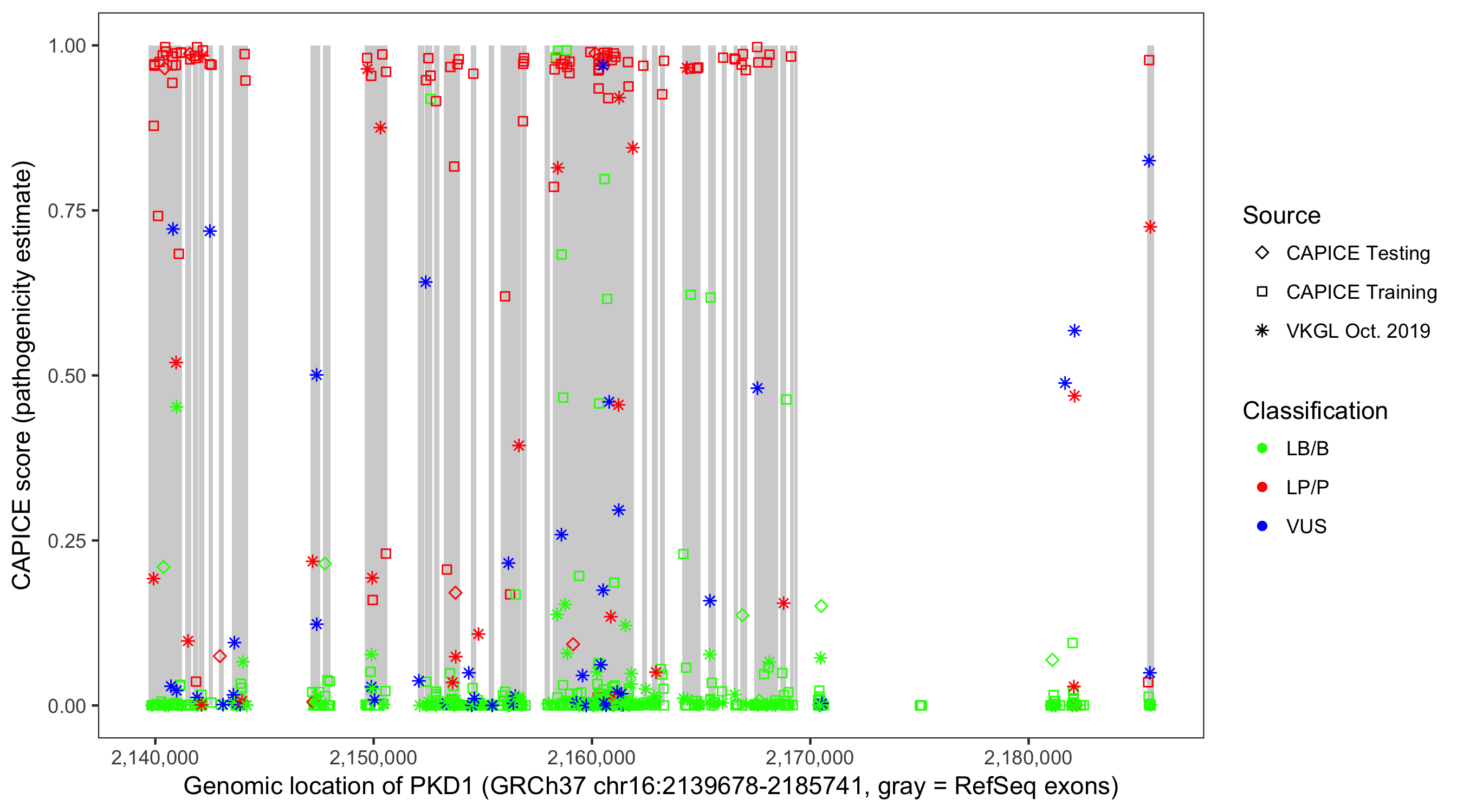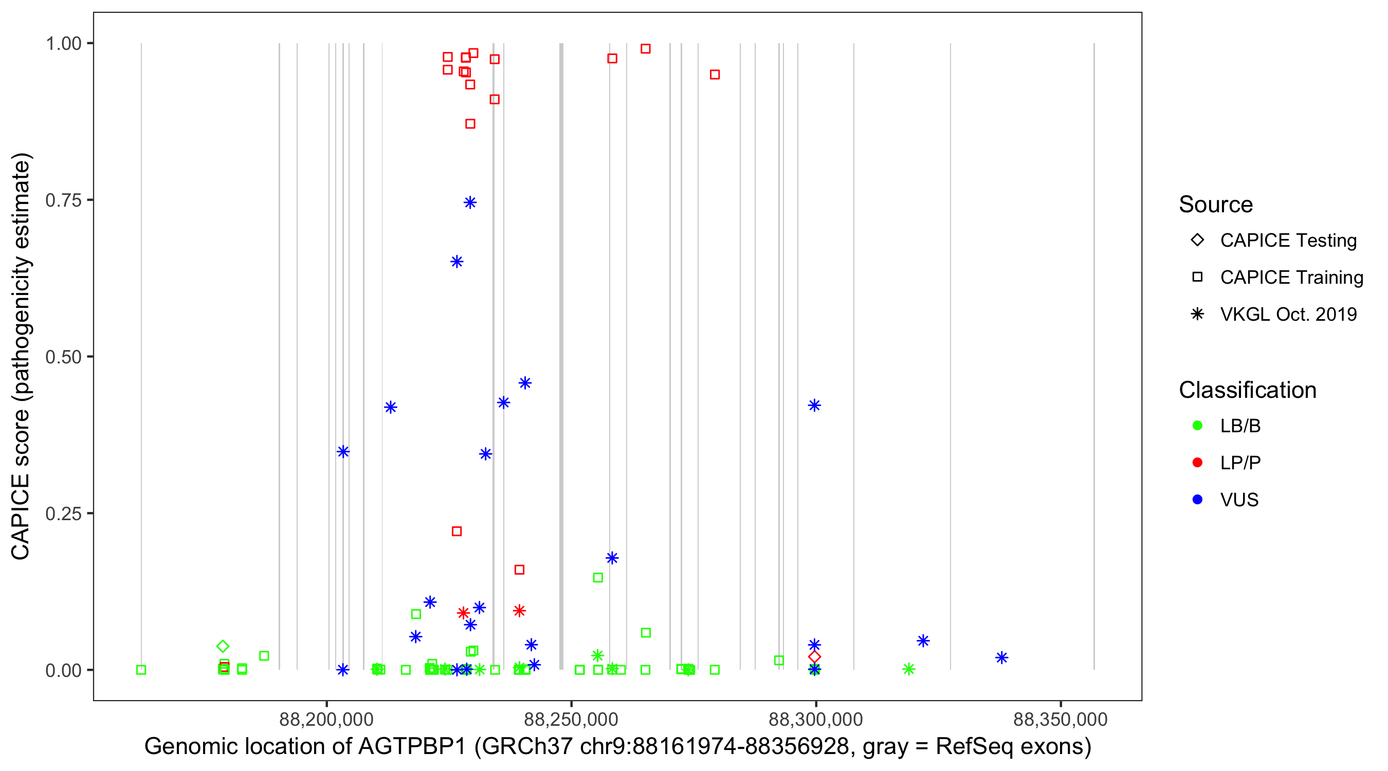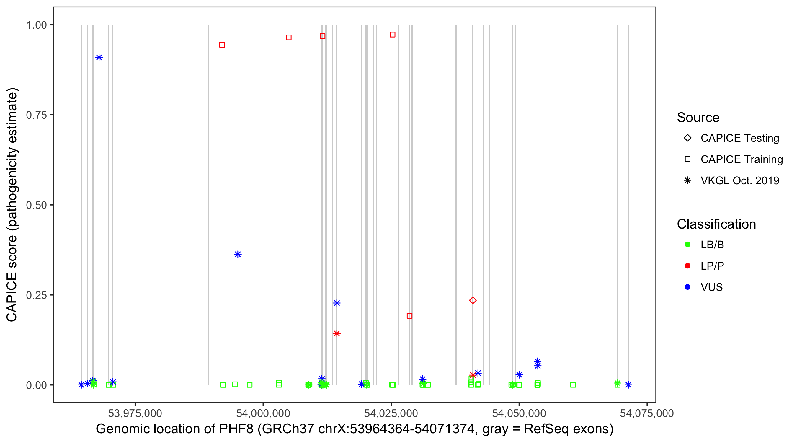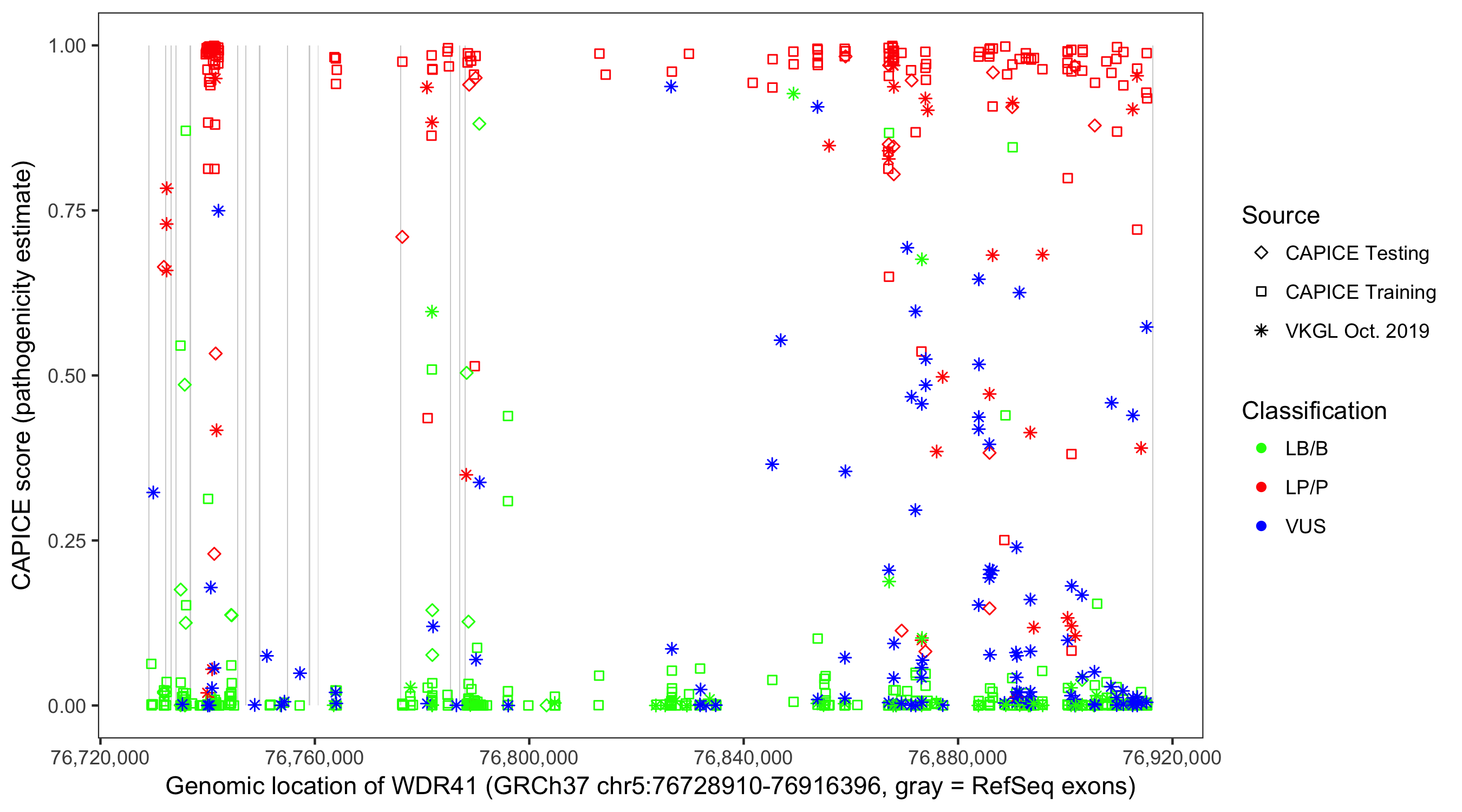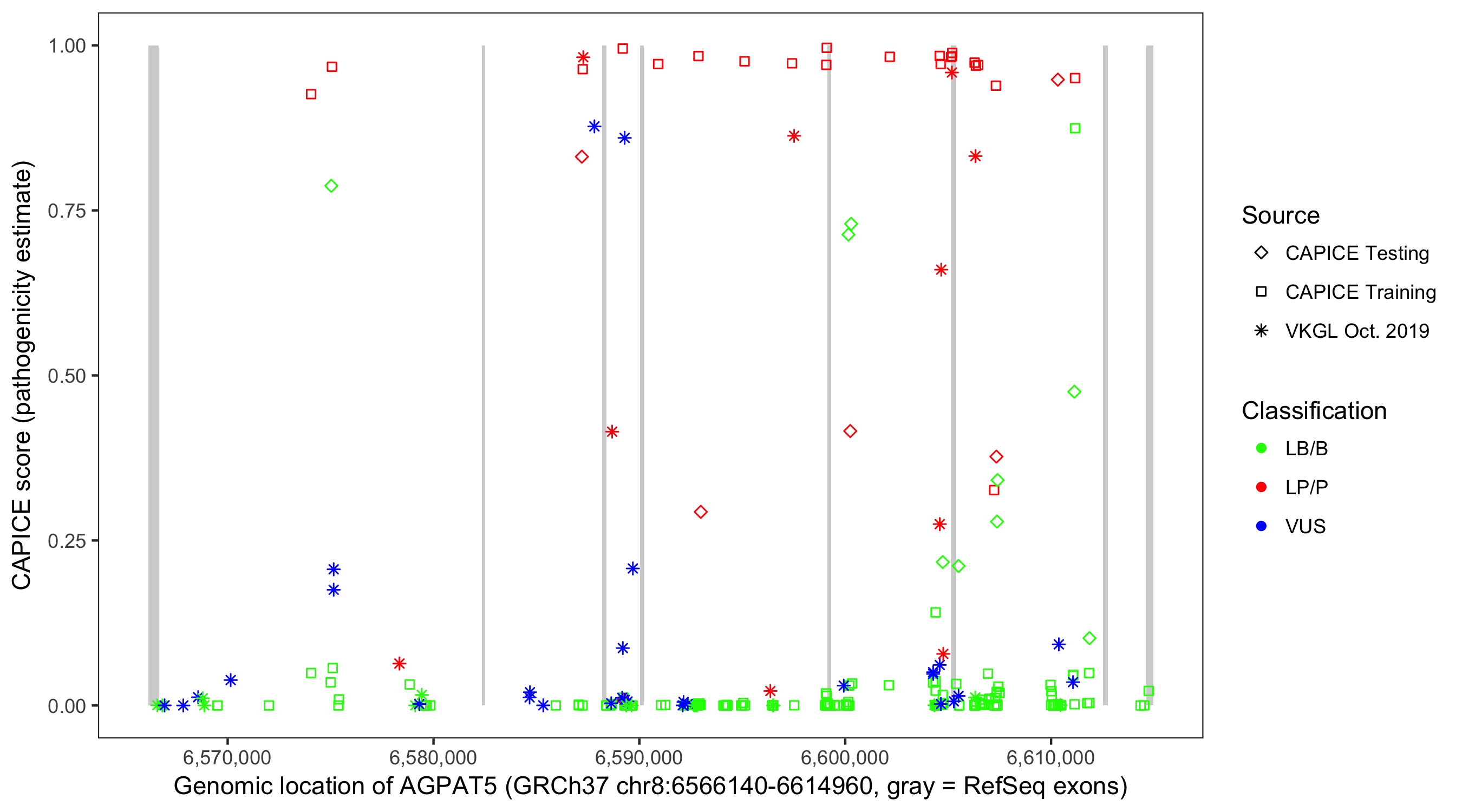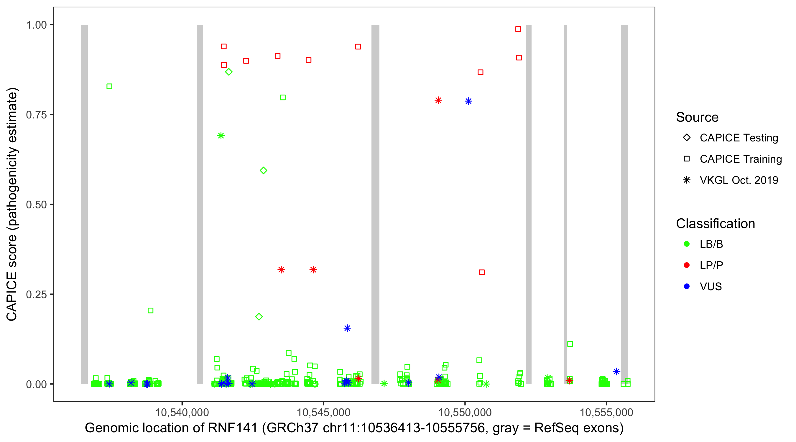Shown are CAPICE train/test variants plus VKGL Oct 2019.