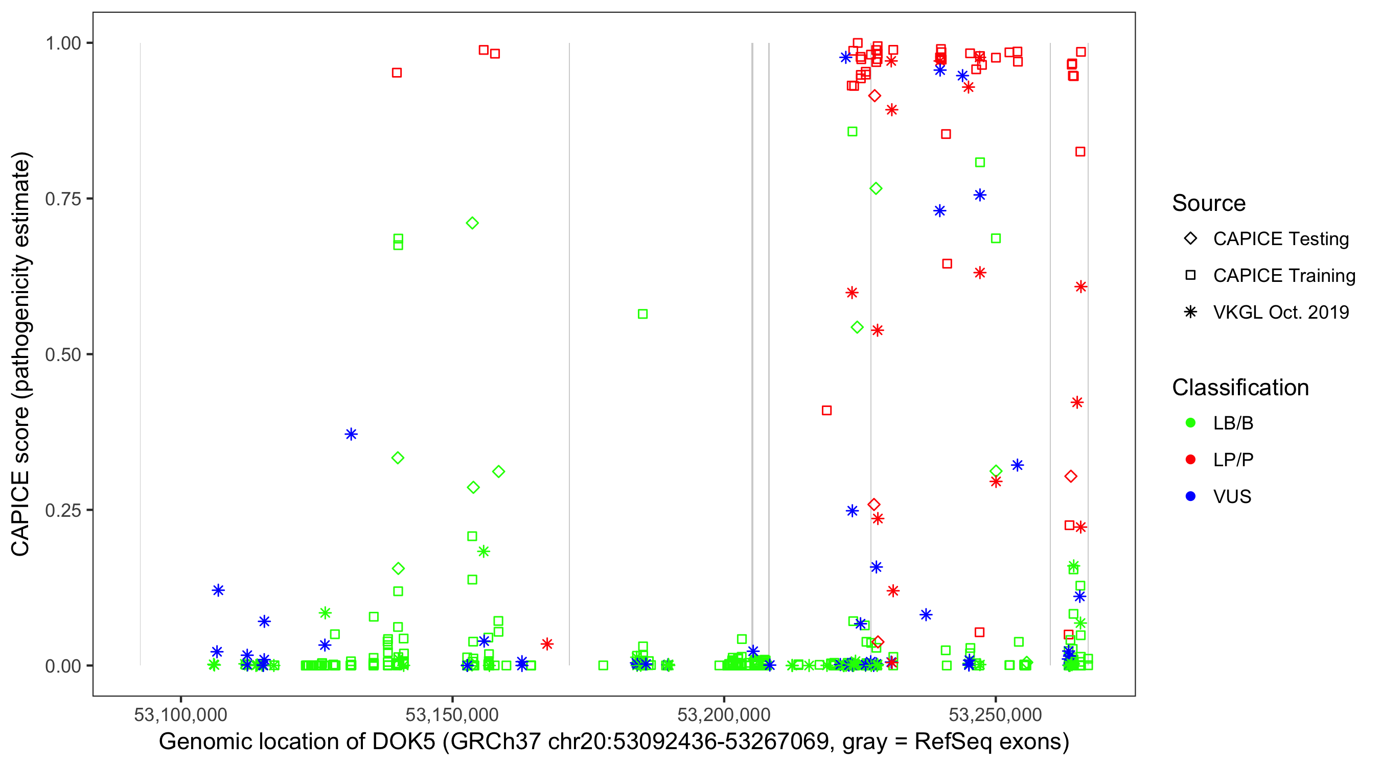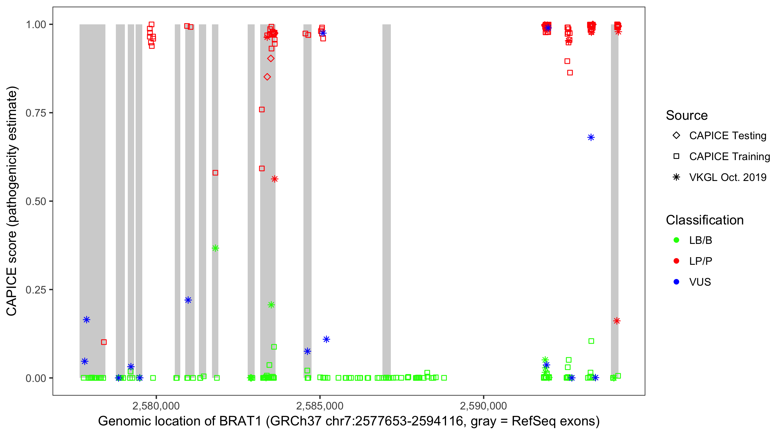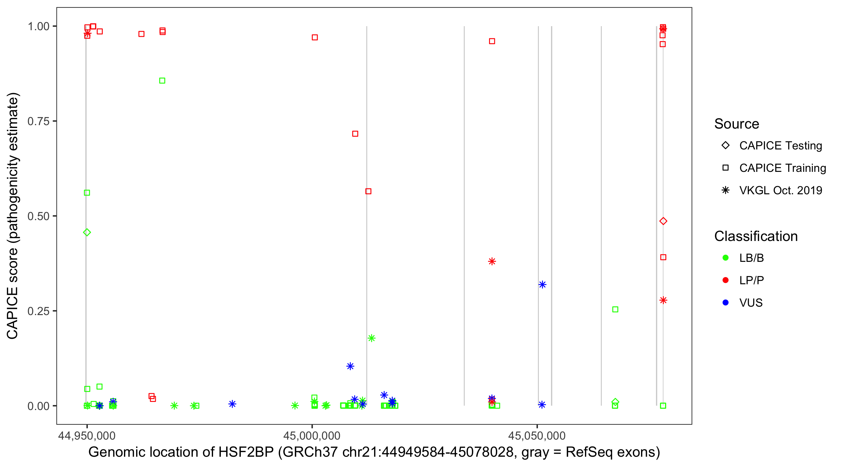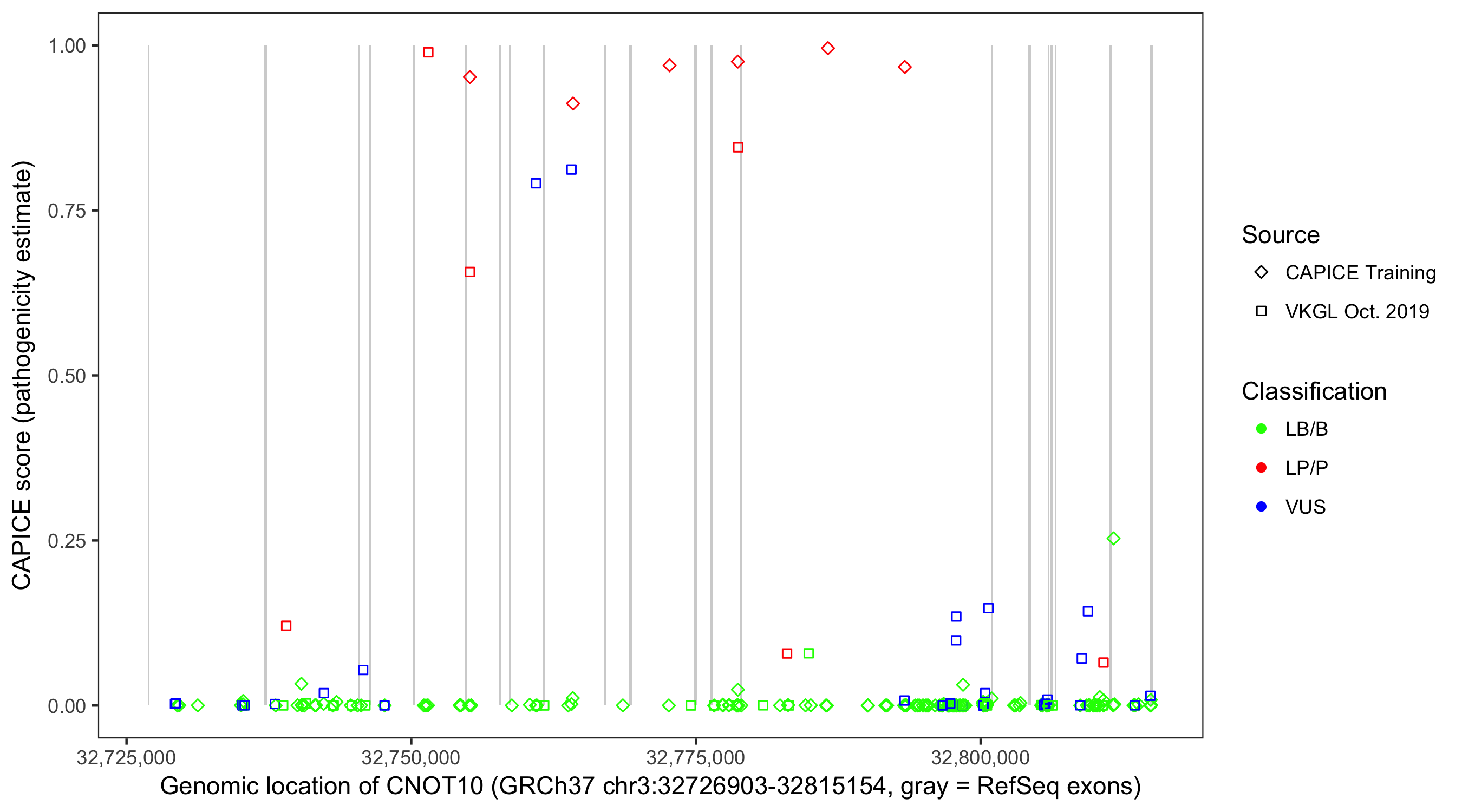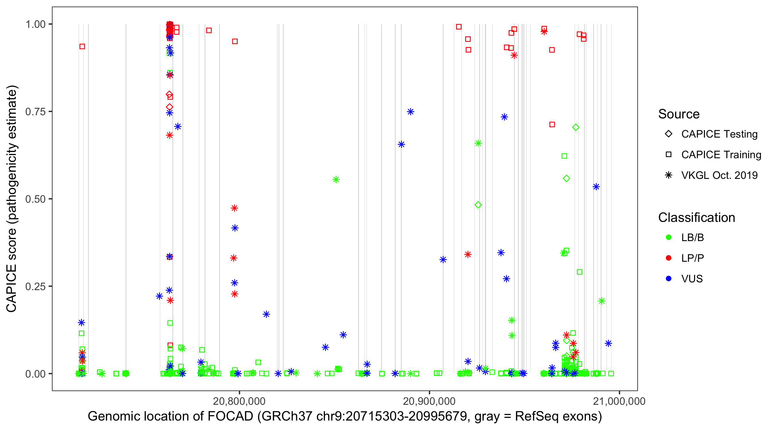 Shown are CAPICE train/test variants plus VKGL Oct 2019.