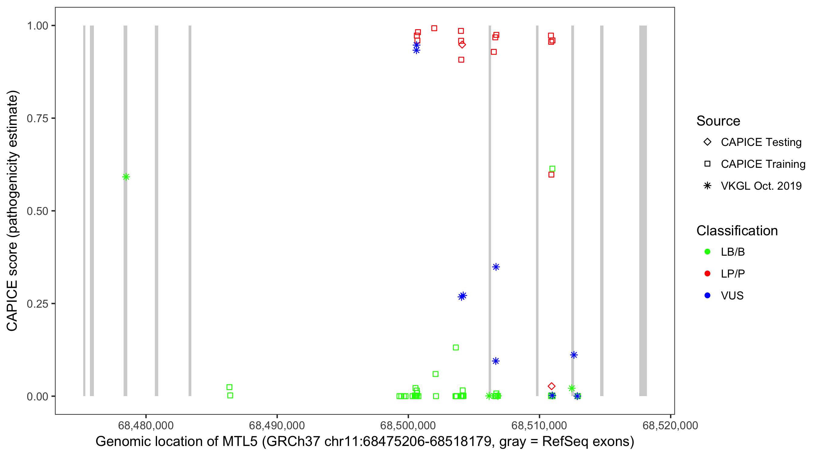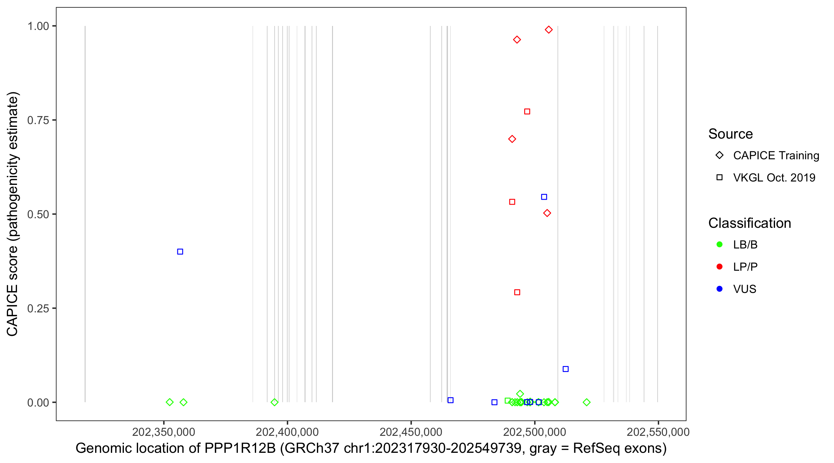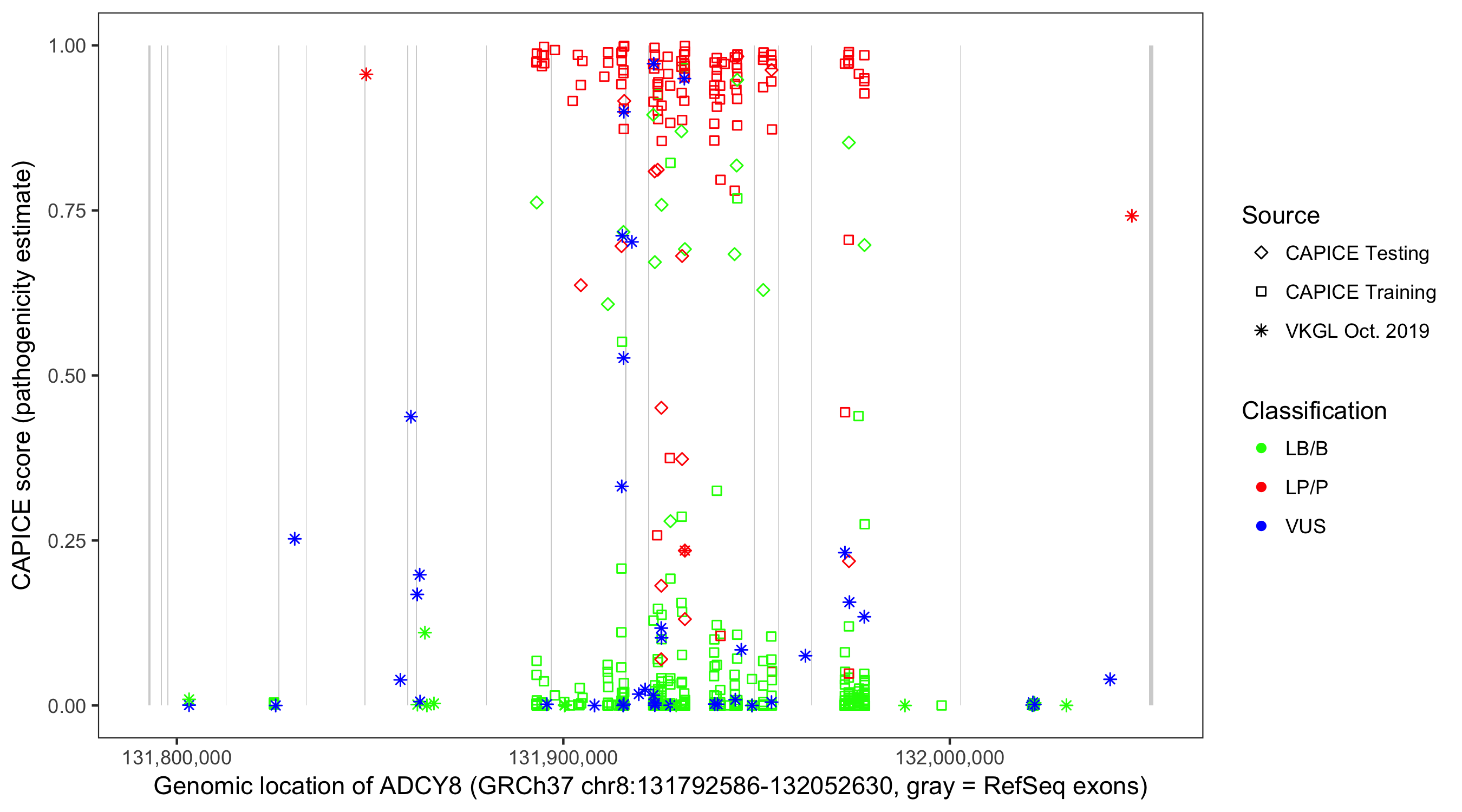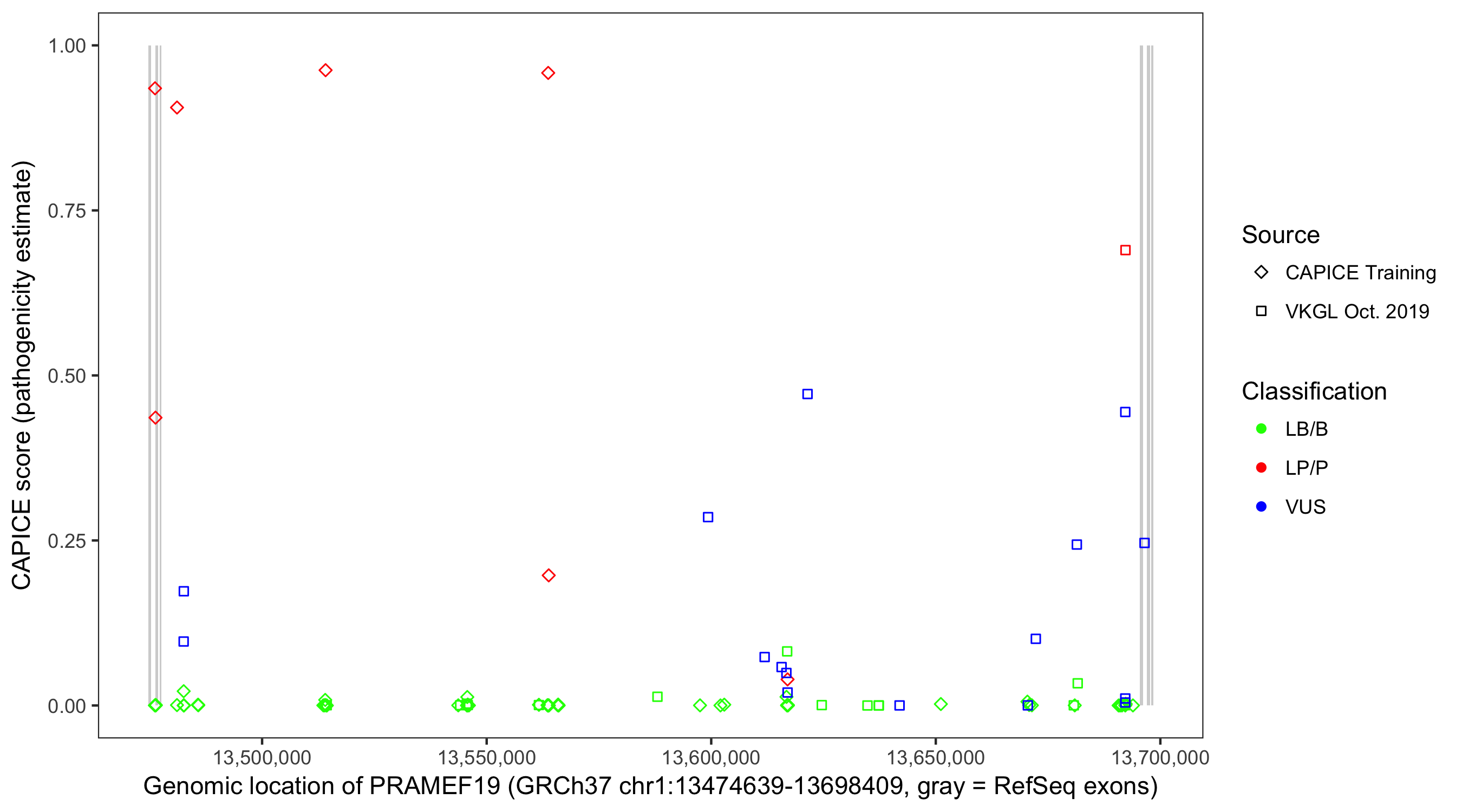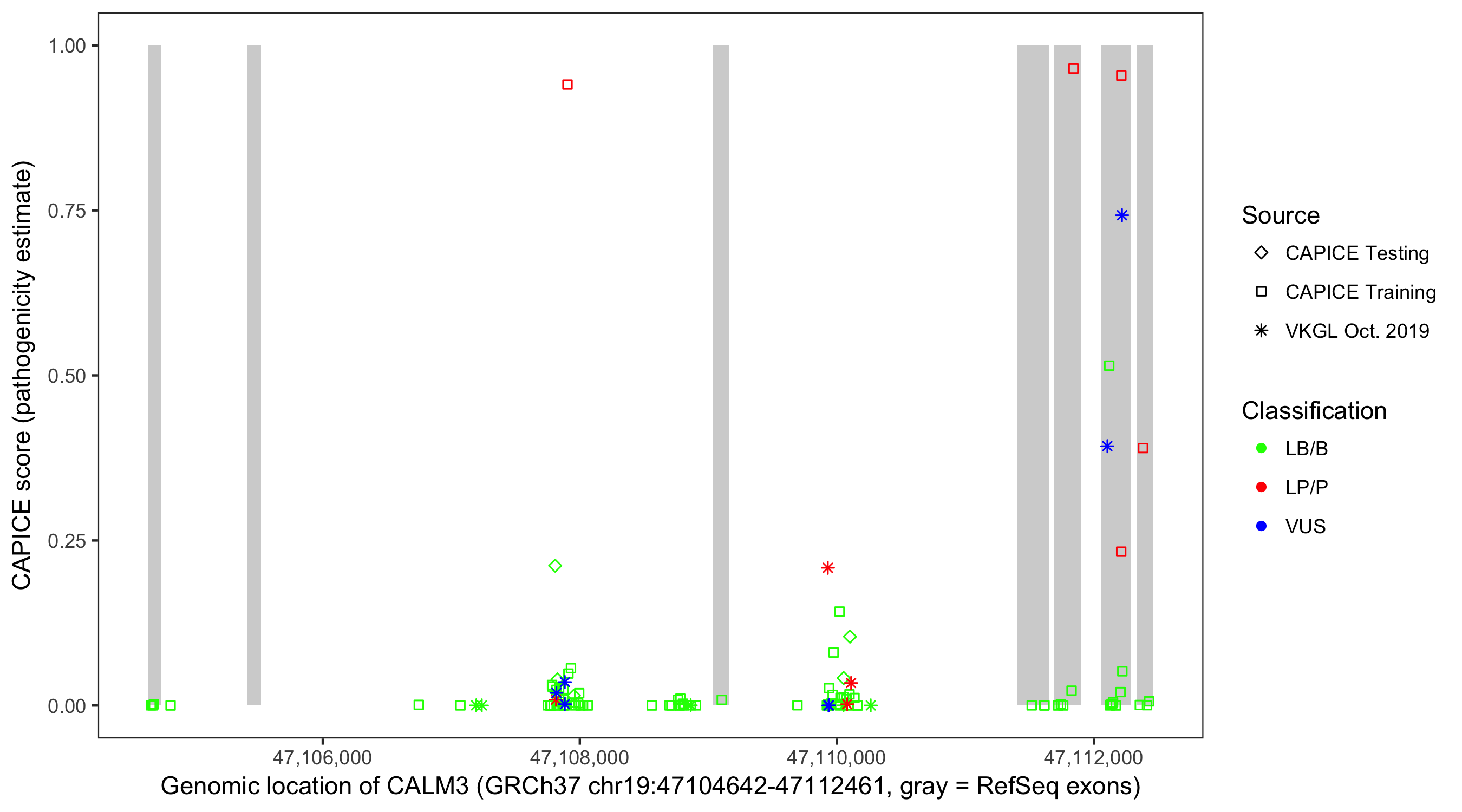 Shown are CAPICE train/test variants plus VKGL Oct 2019.