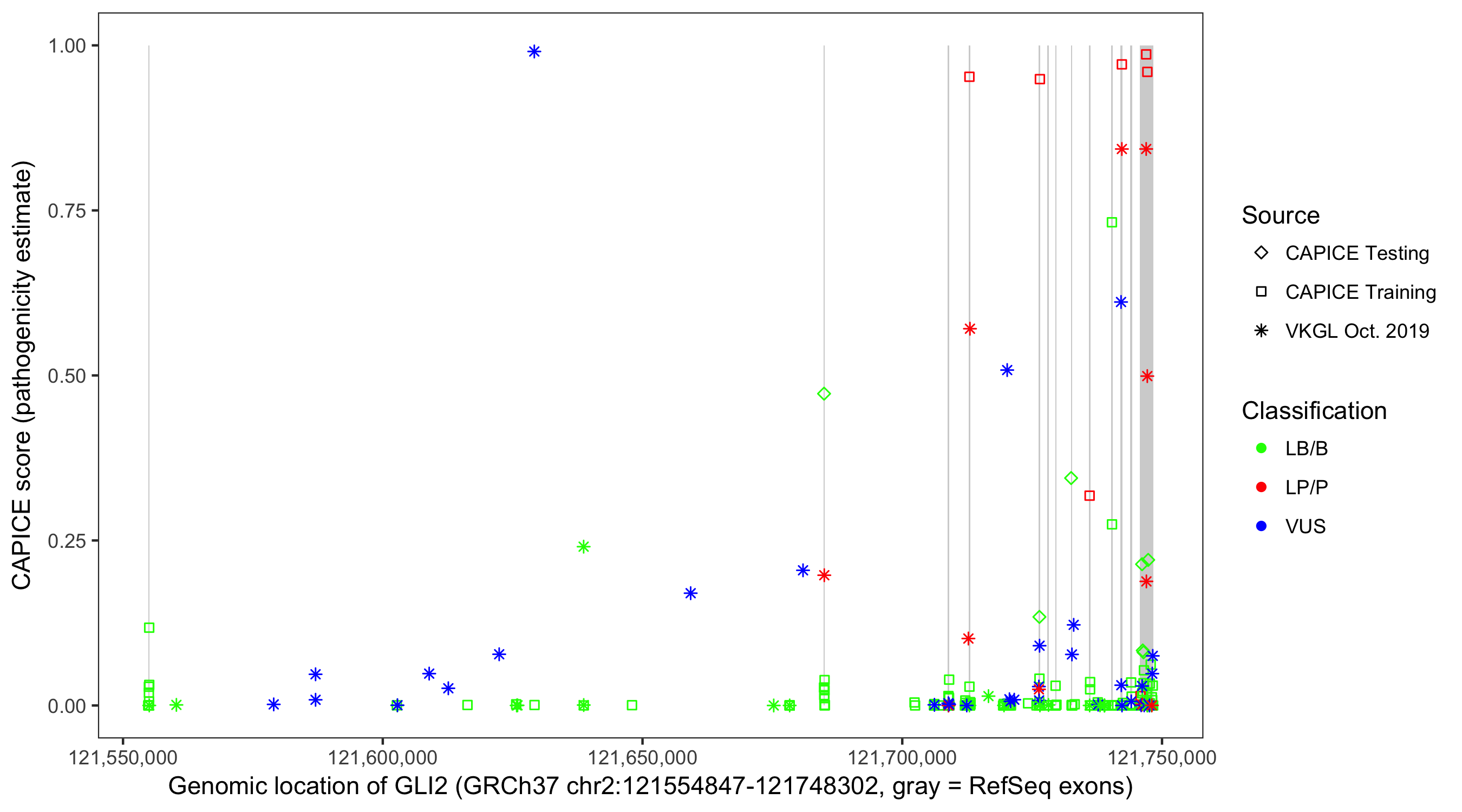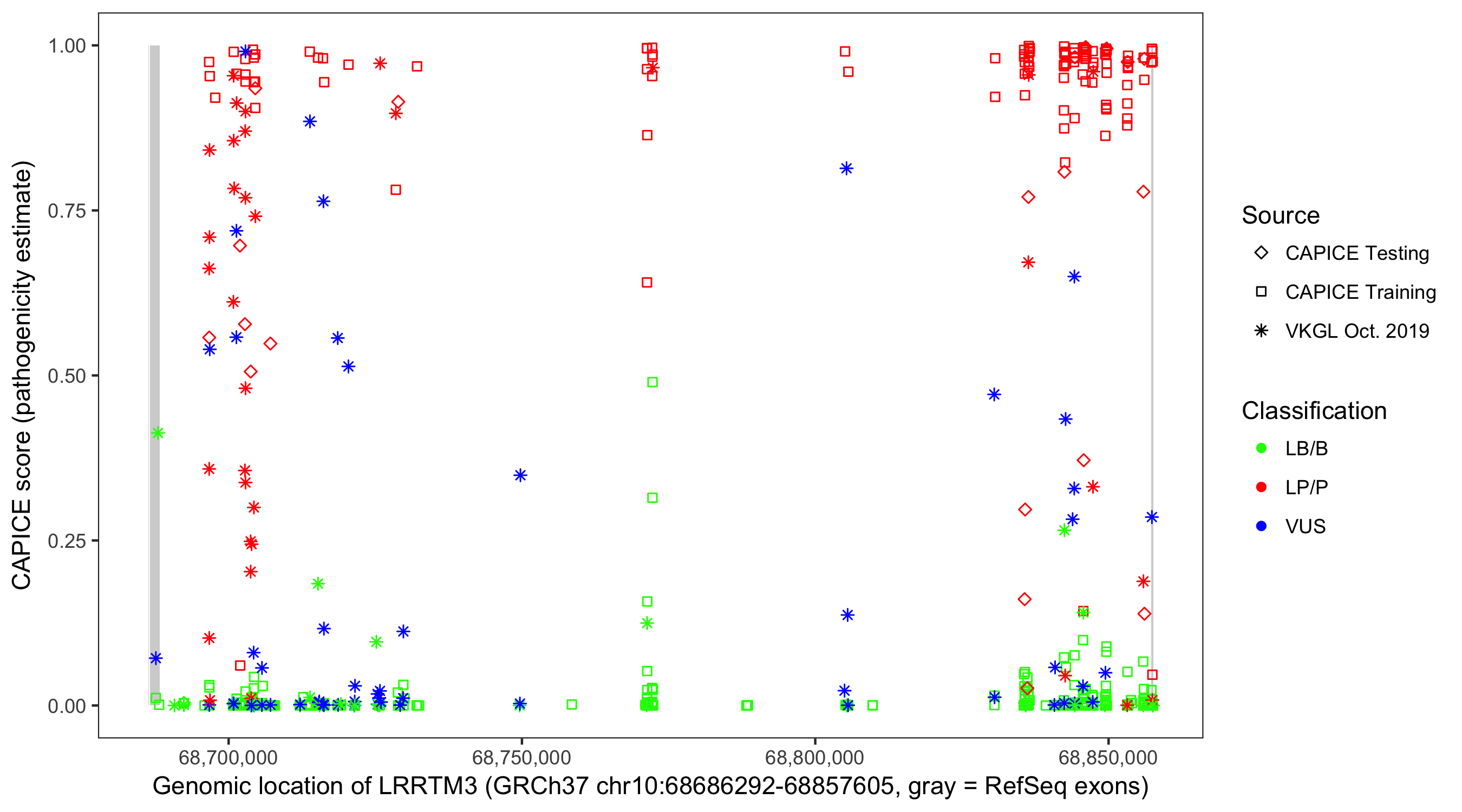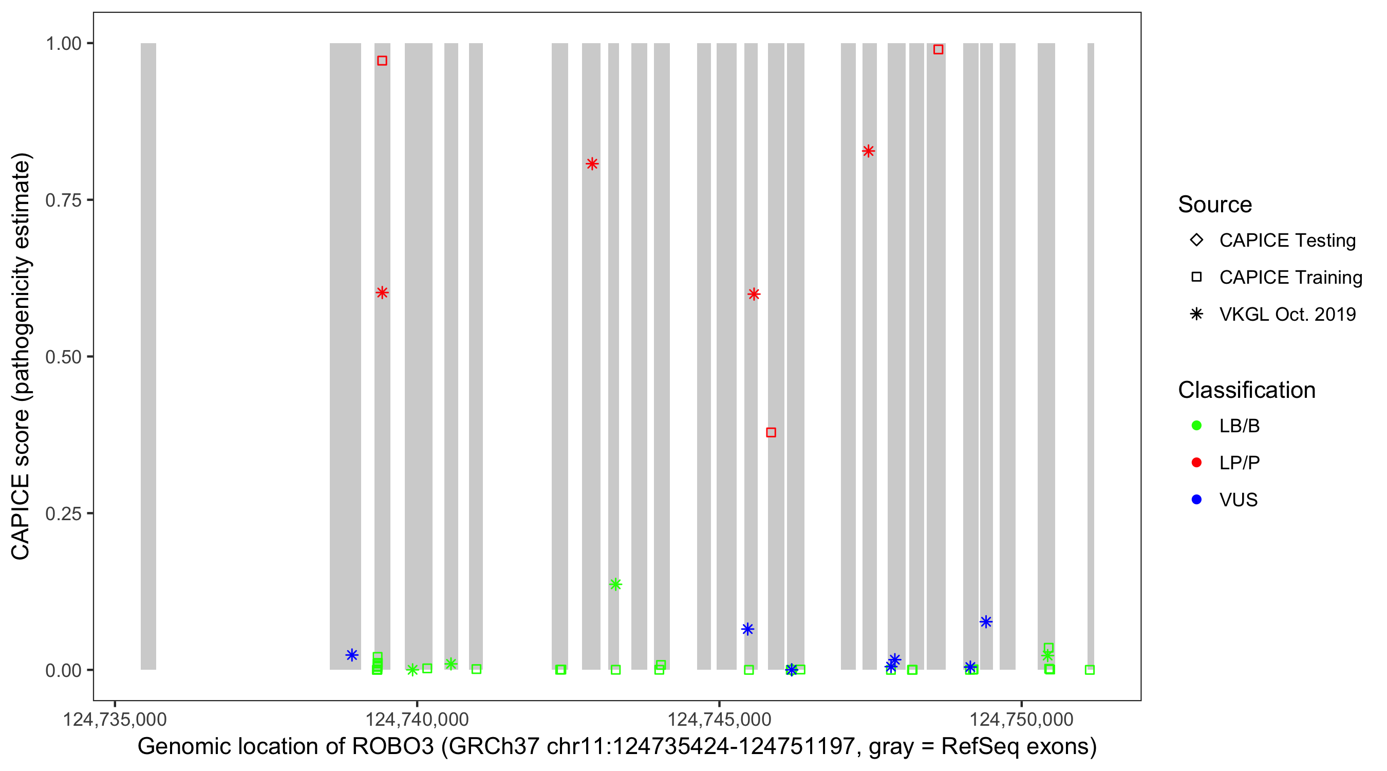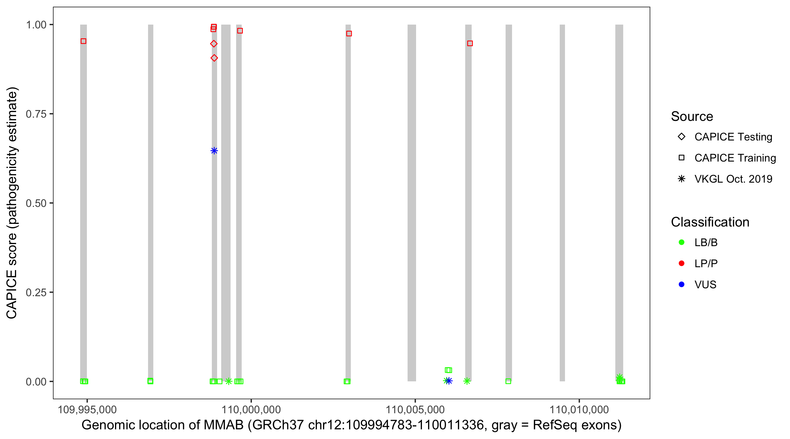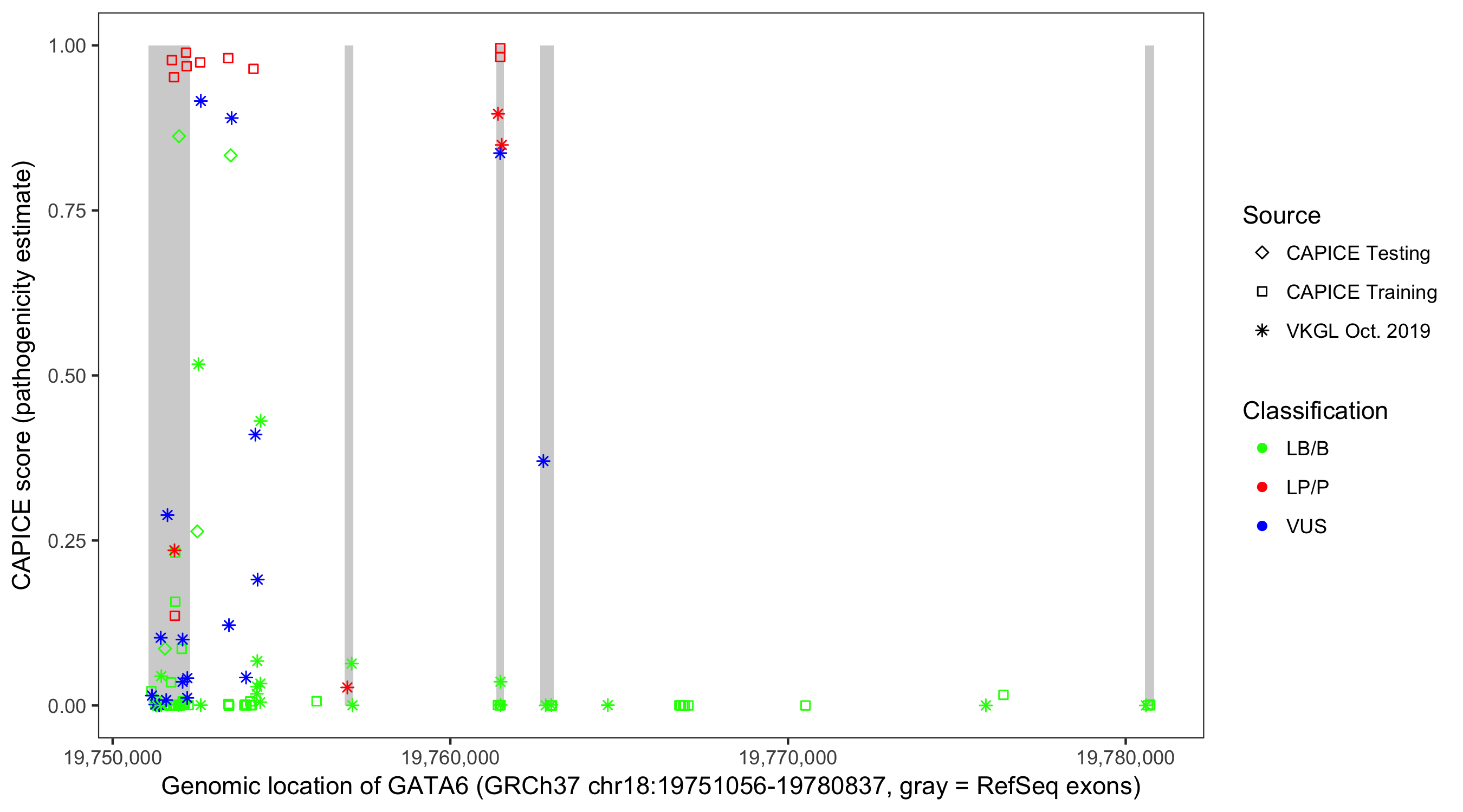 Shown are CAPICE train/test variants plus VKGL Oct 2019.