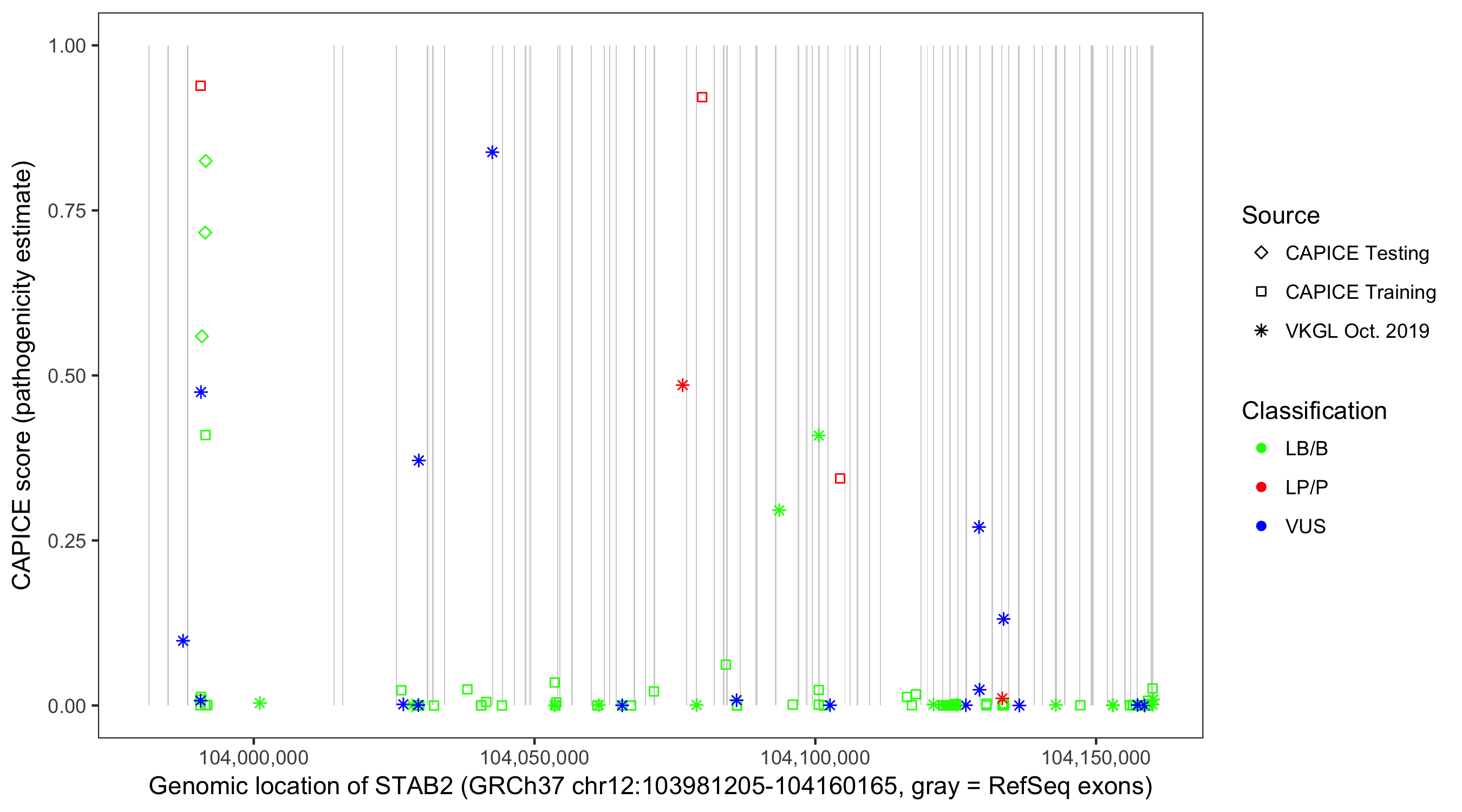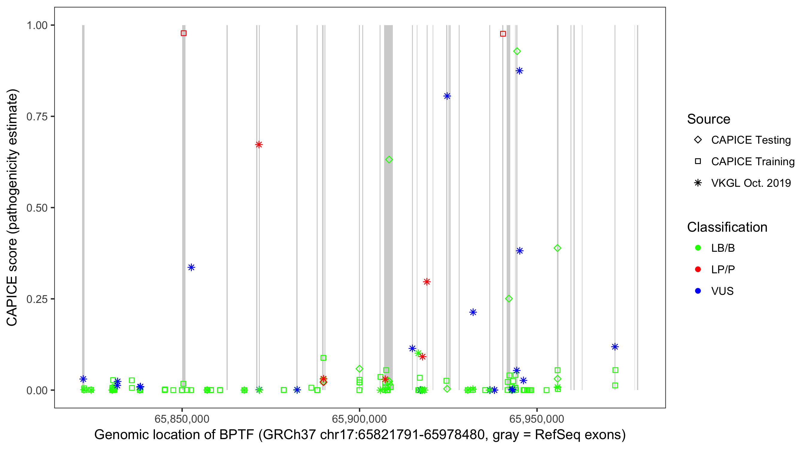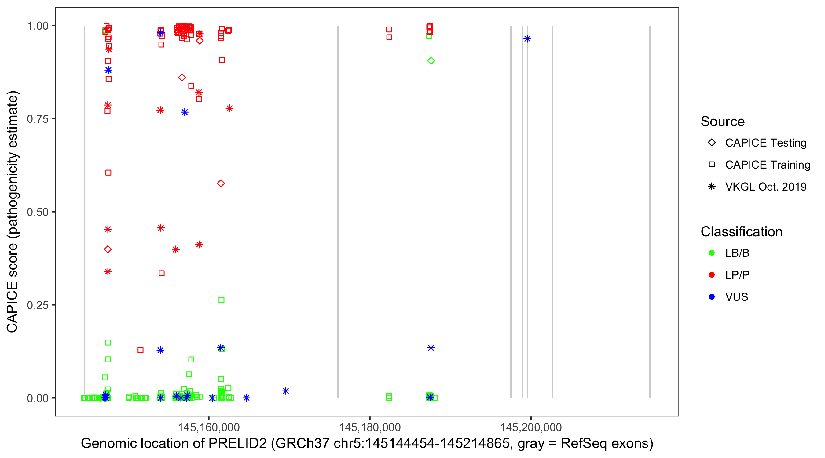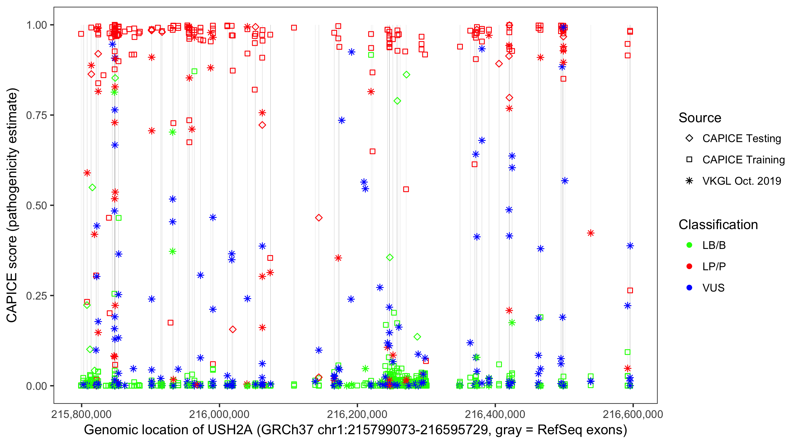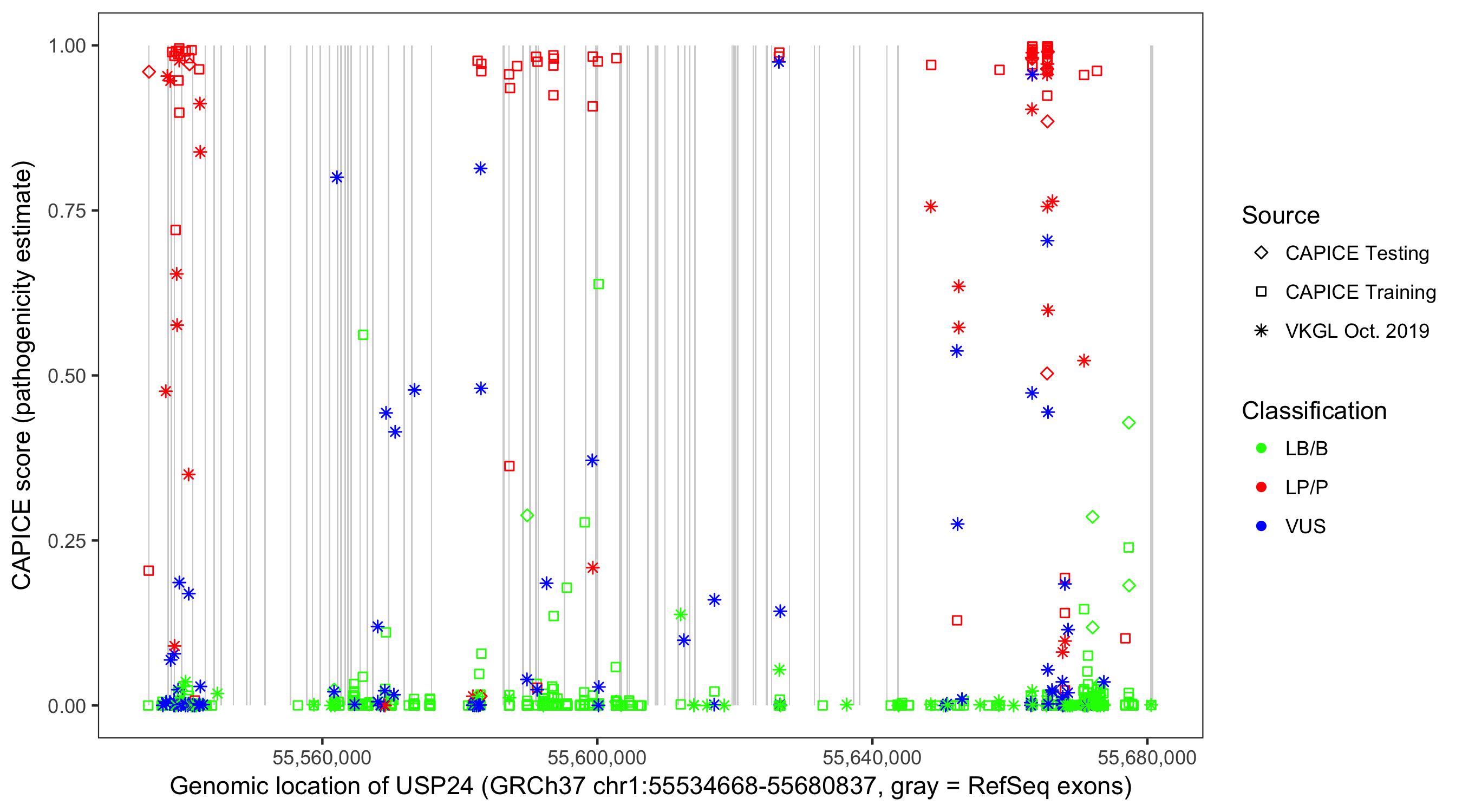 Shown are CAPICE train/test variants plus VKGL Oct 2019.