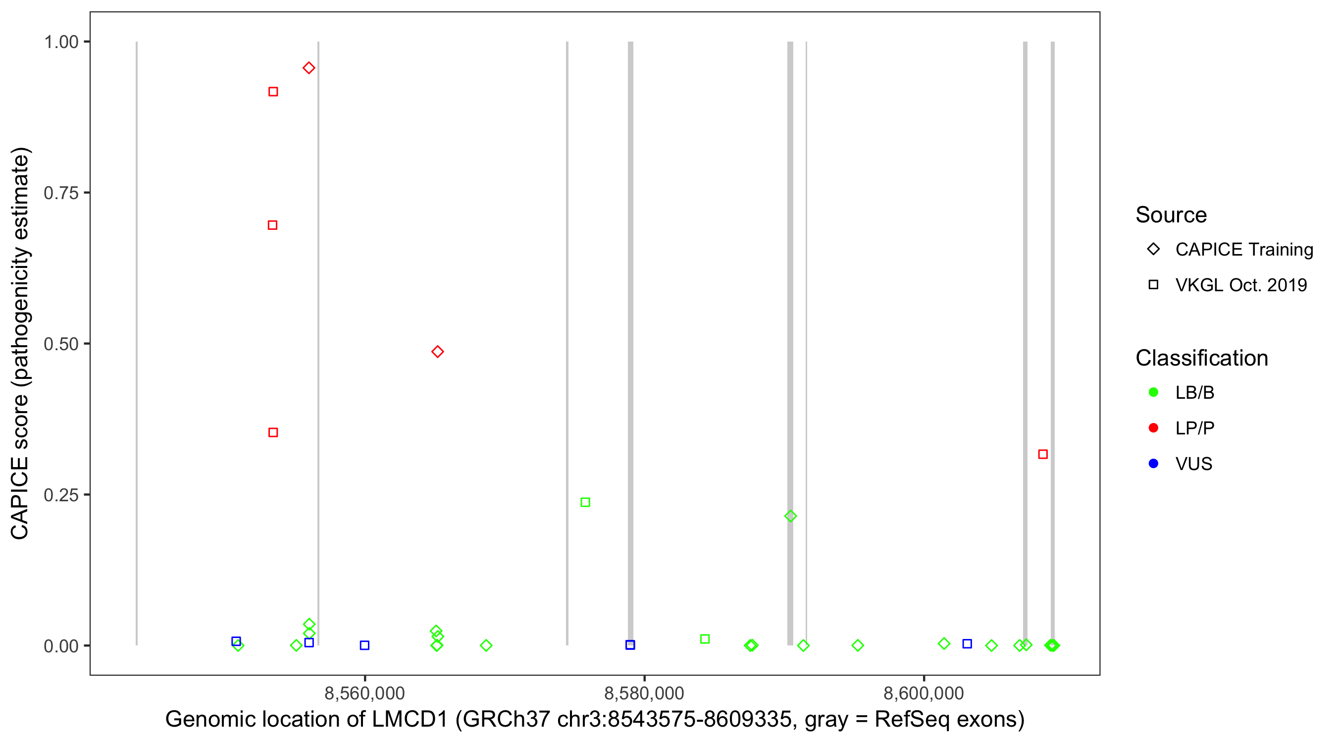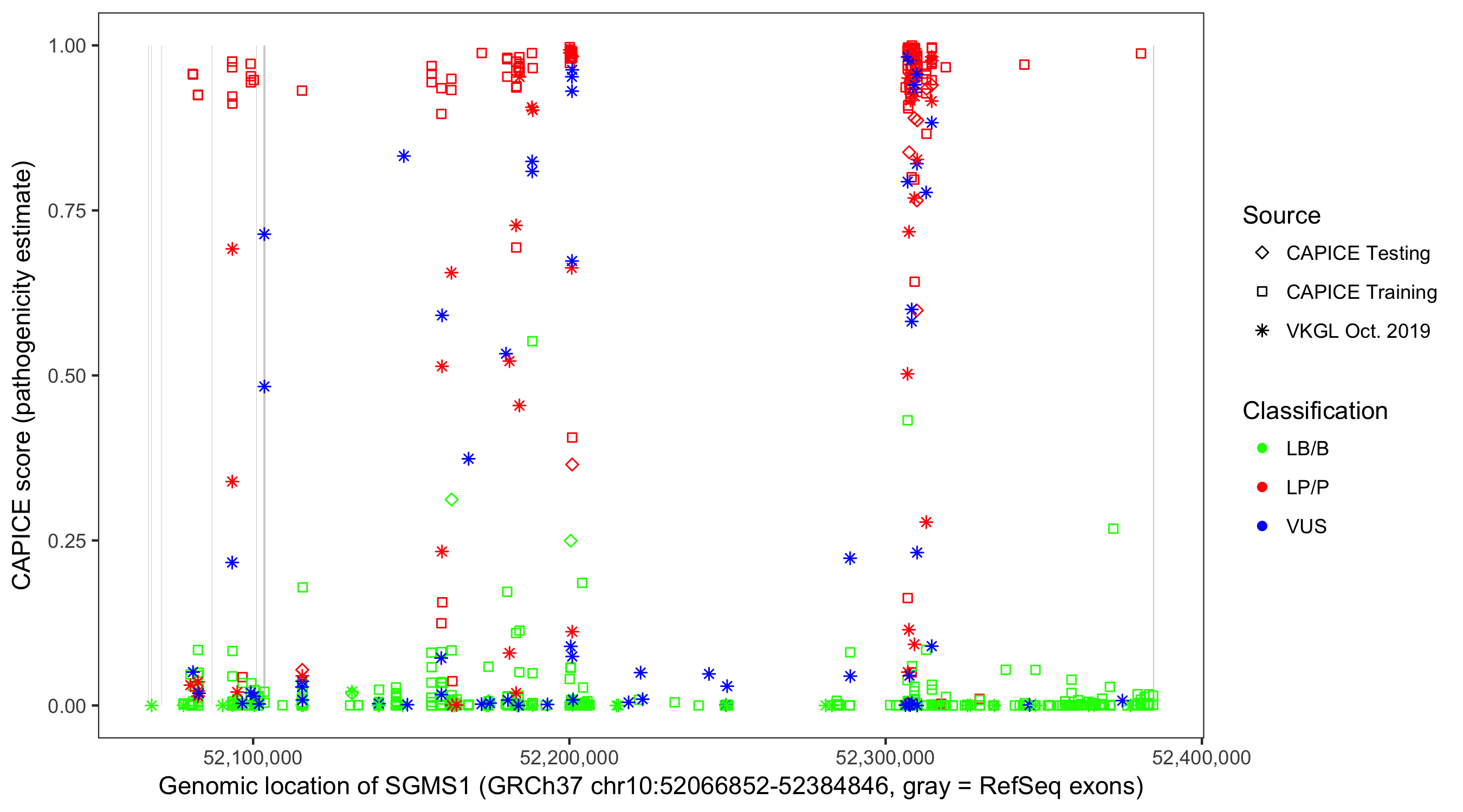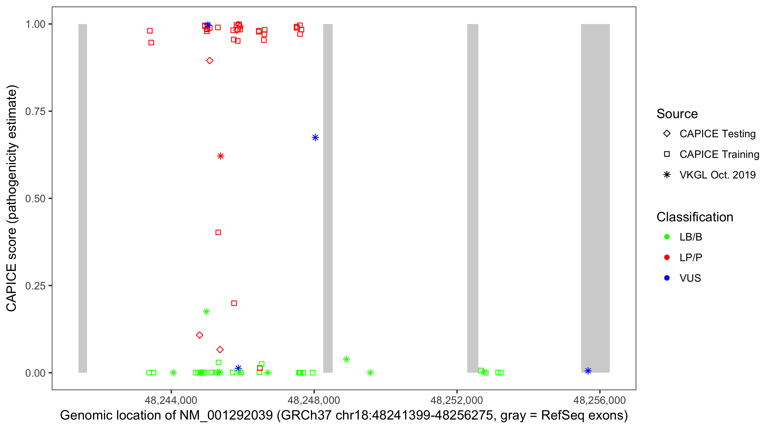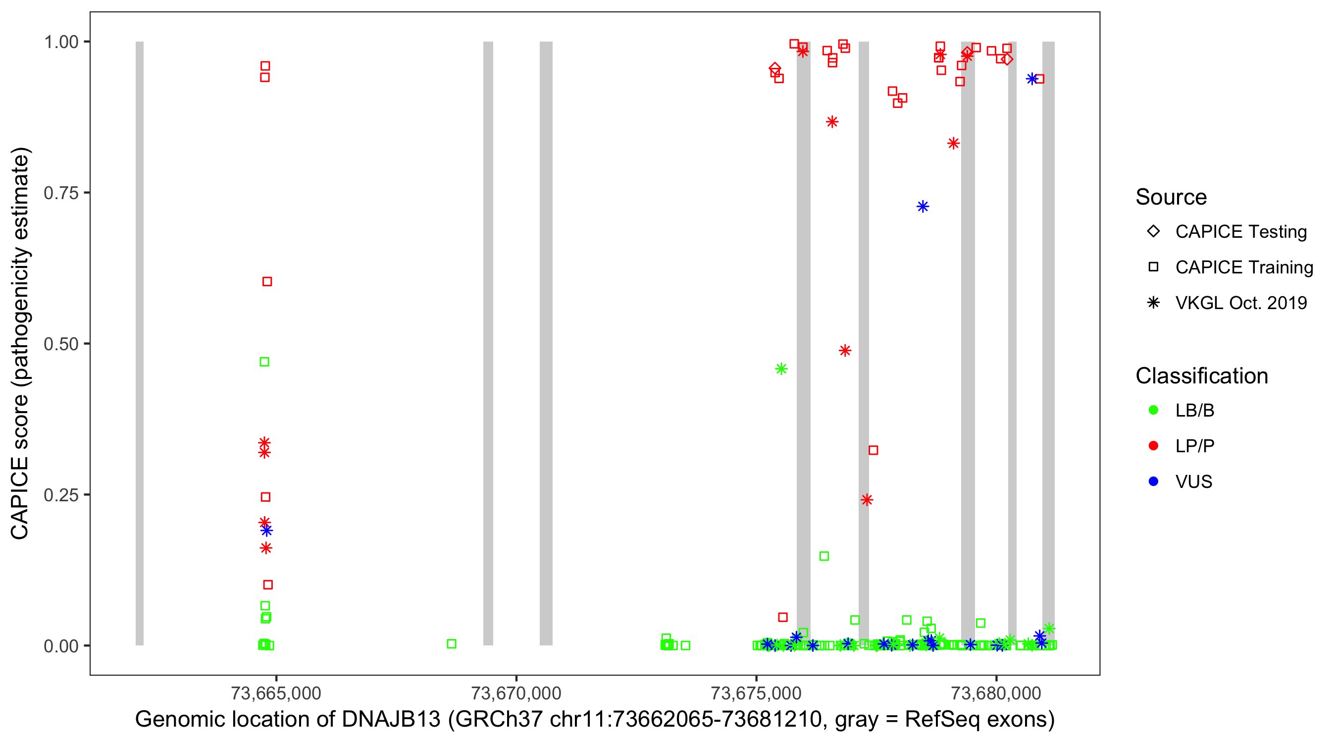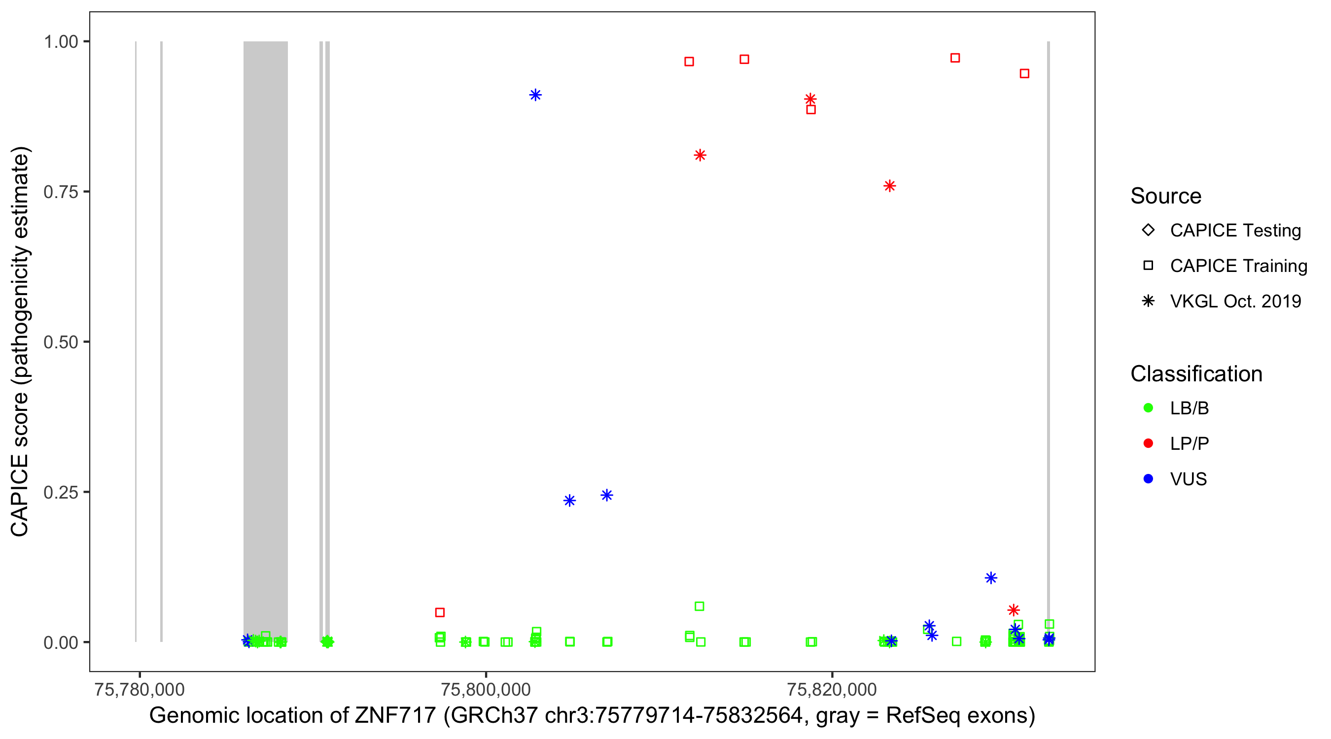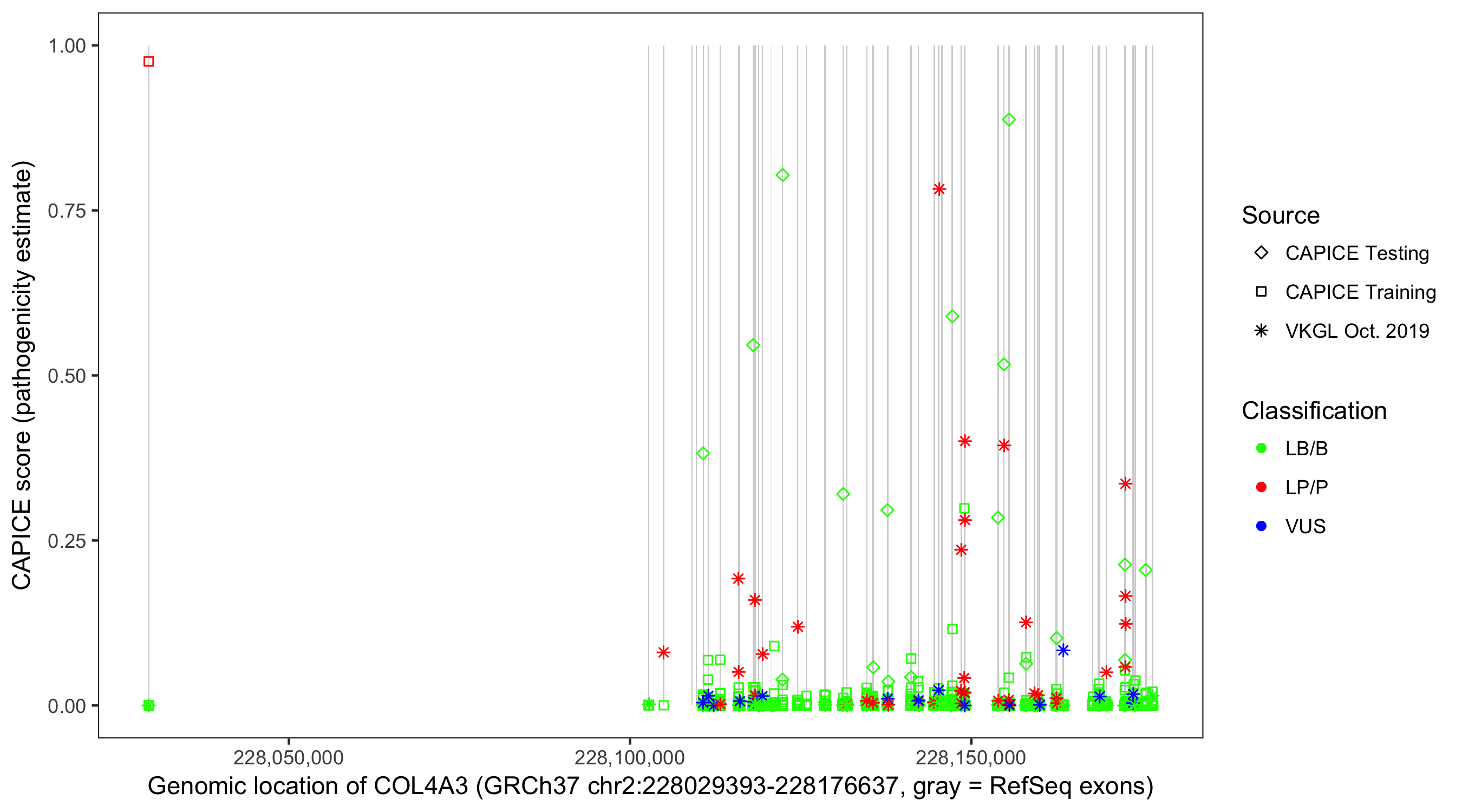 Shown are CAPICE train/test variants plus VKGL Oct 2019.