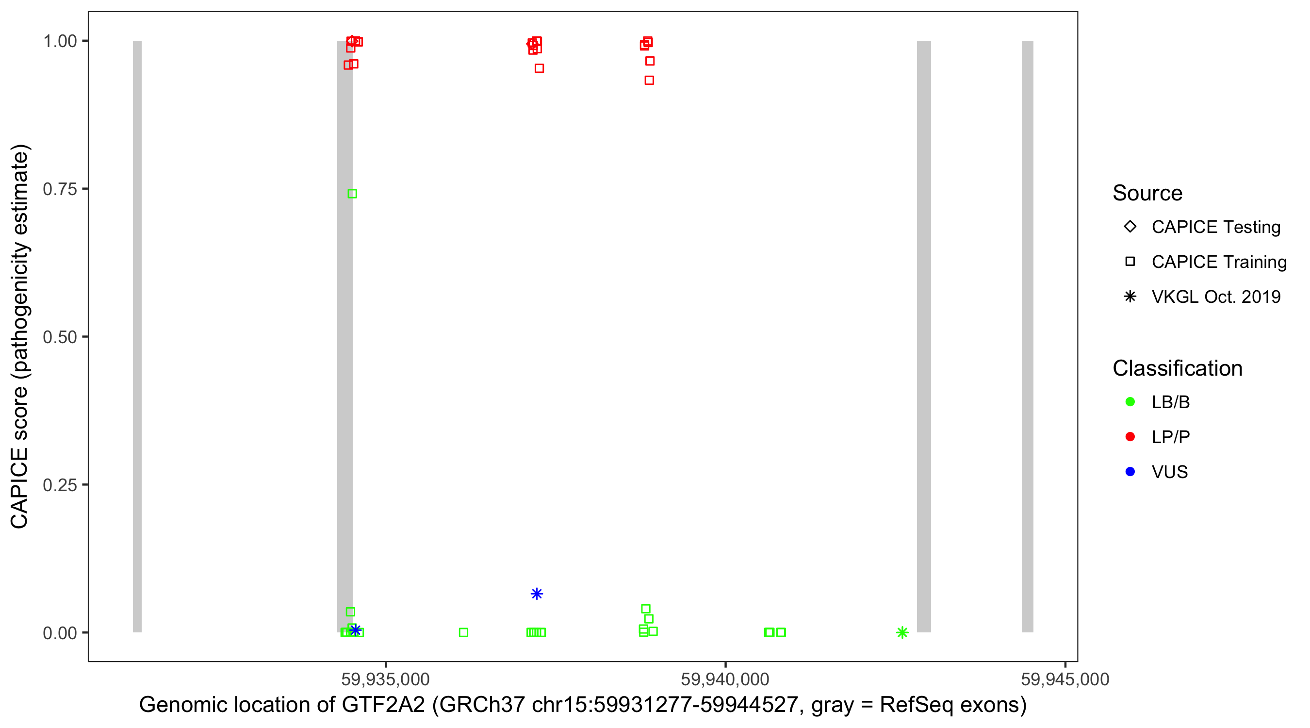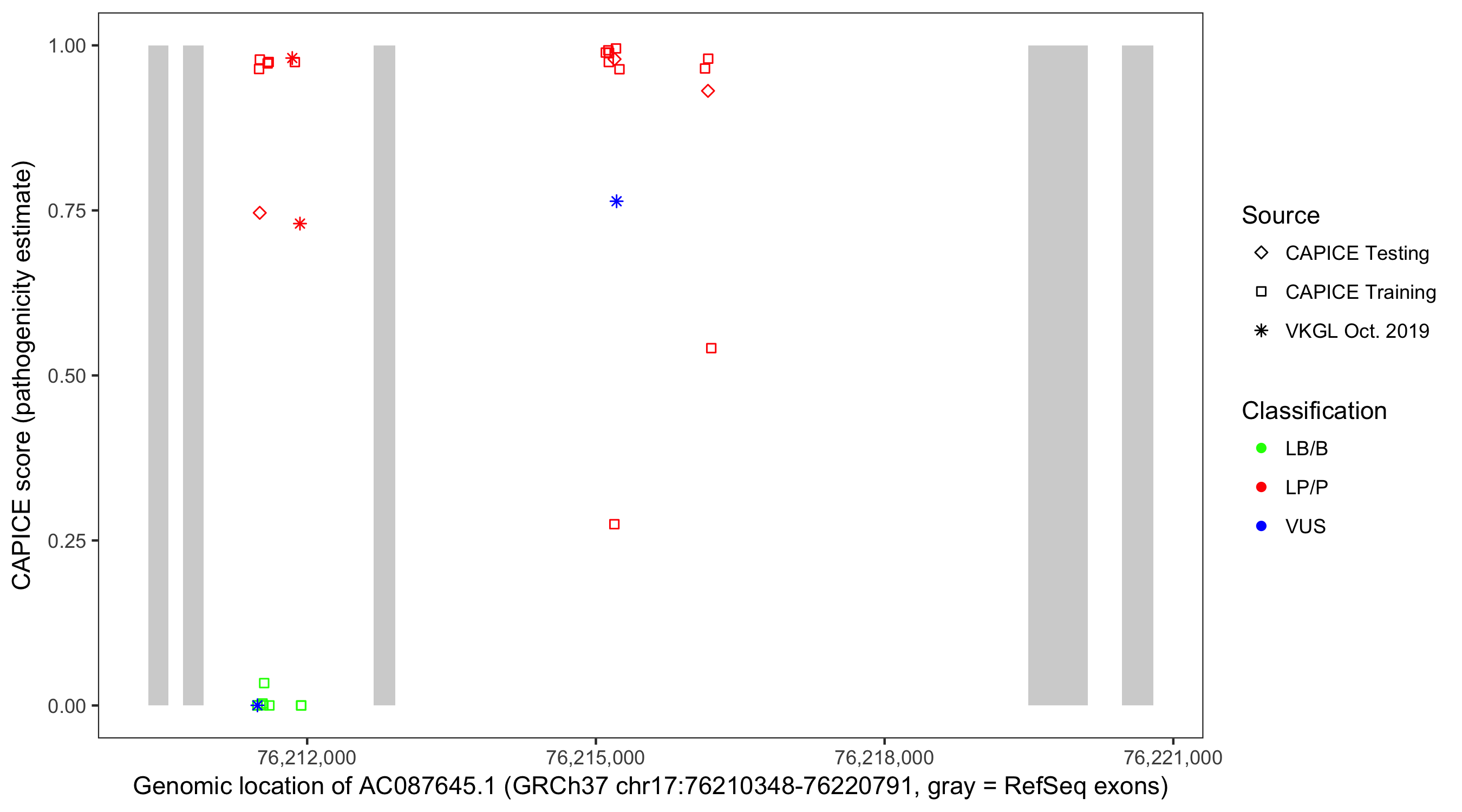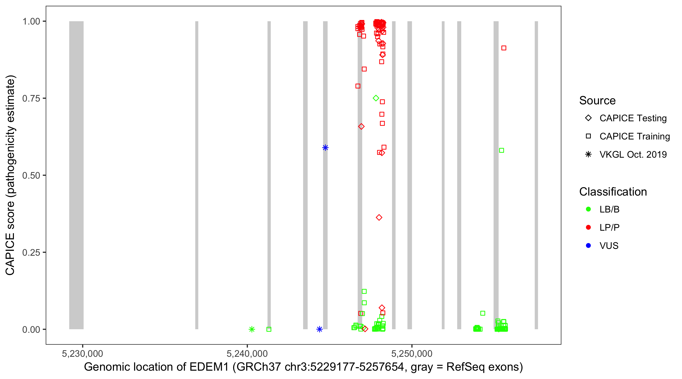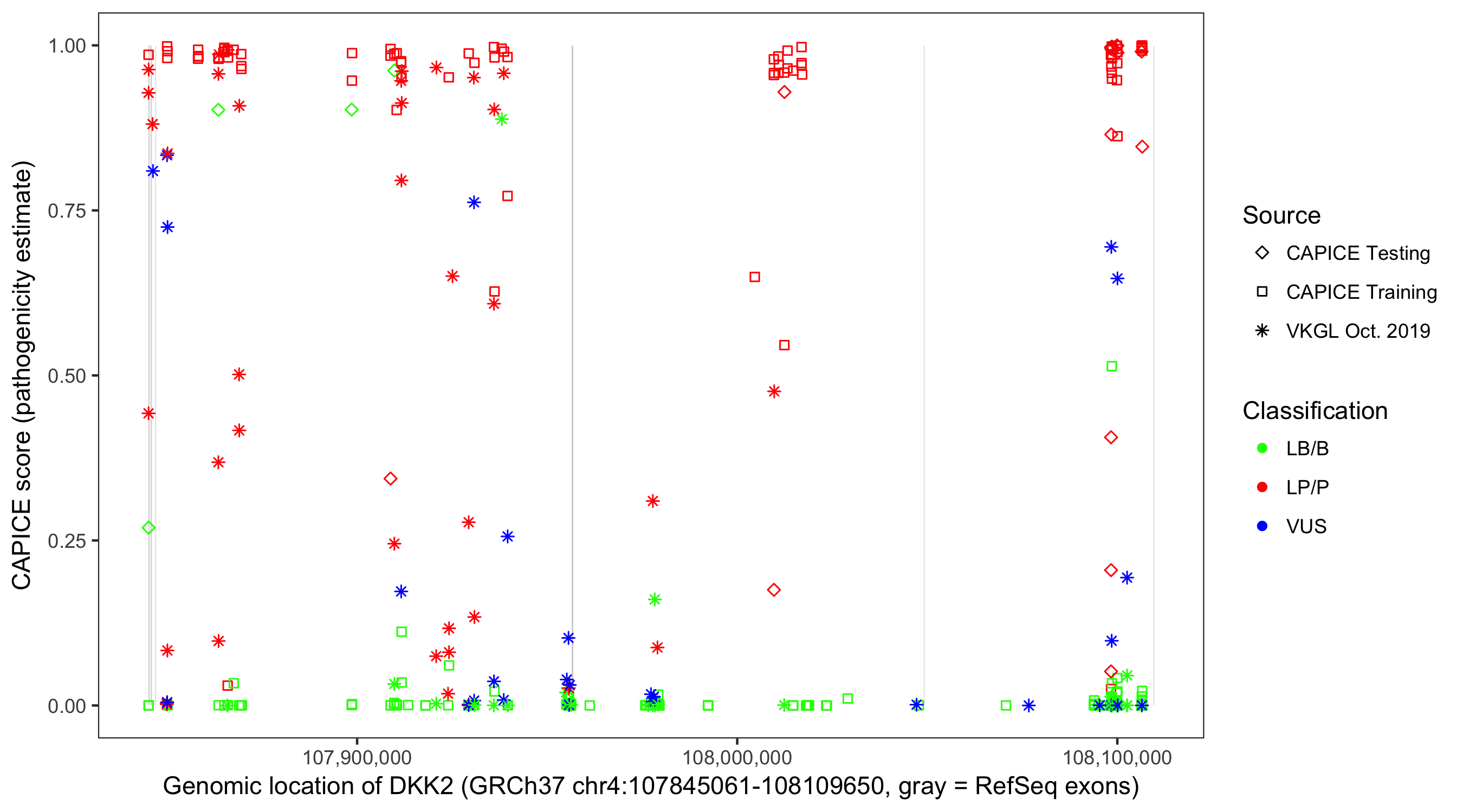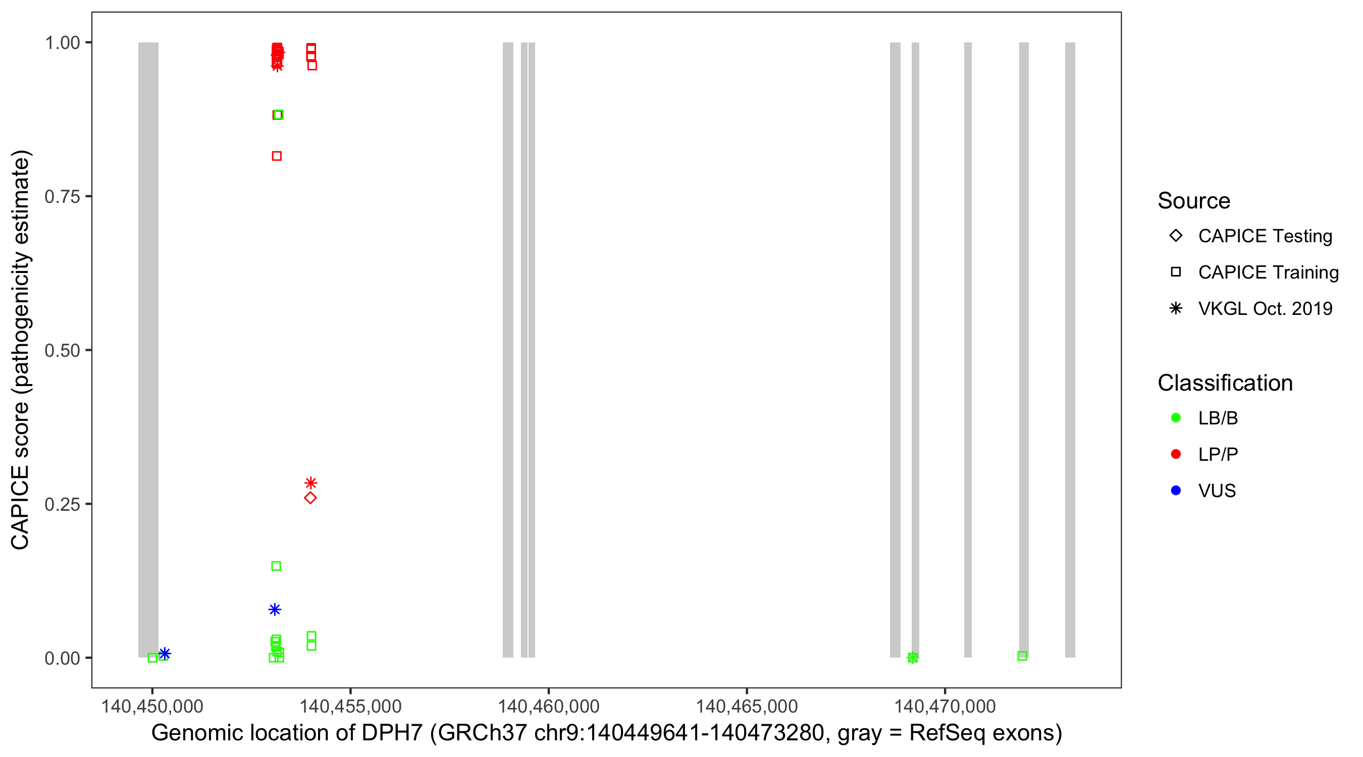Shown are CAPICE train/test variants plus VKGL Oct 2019.