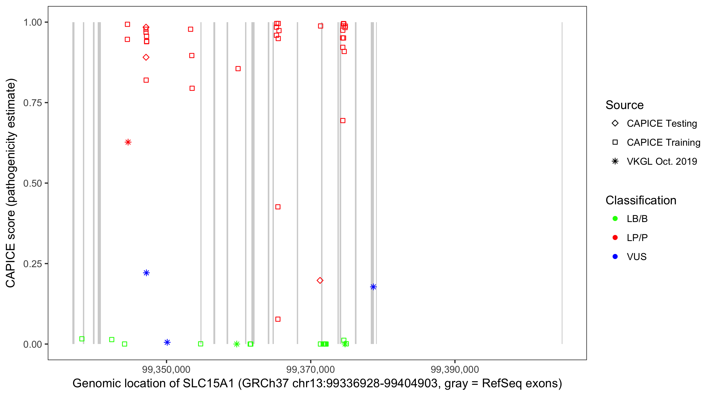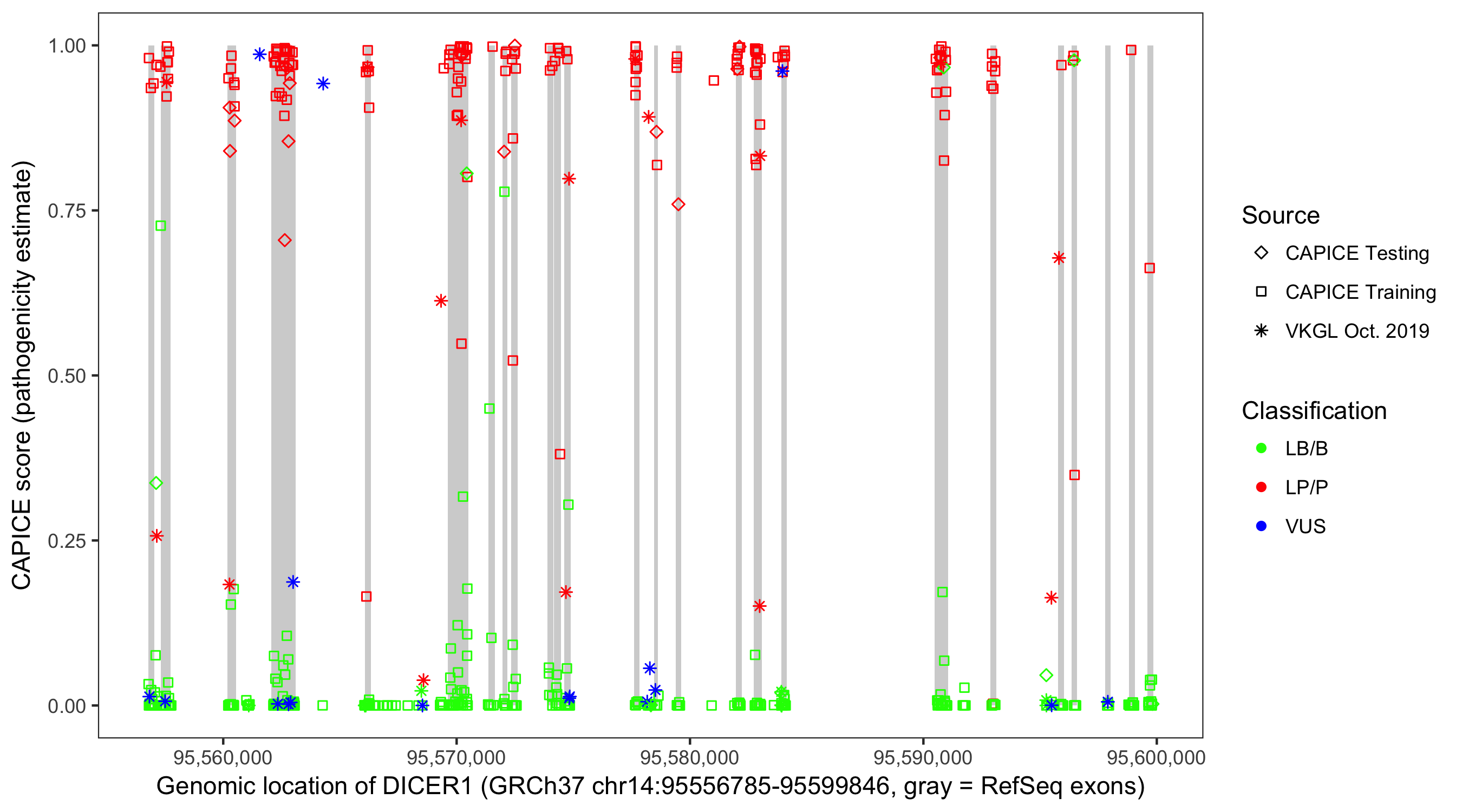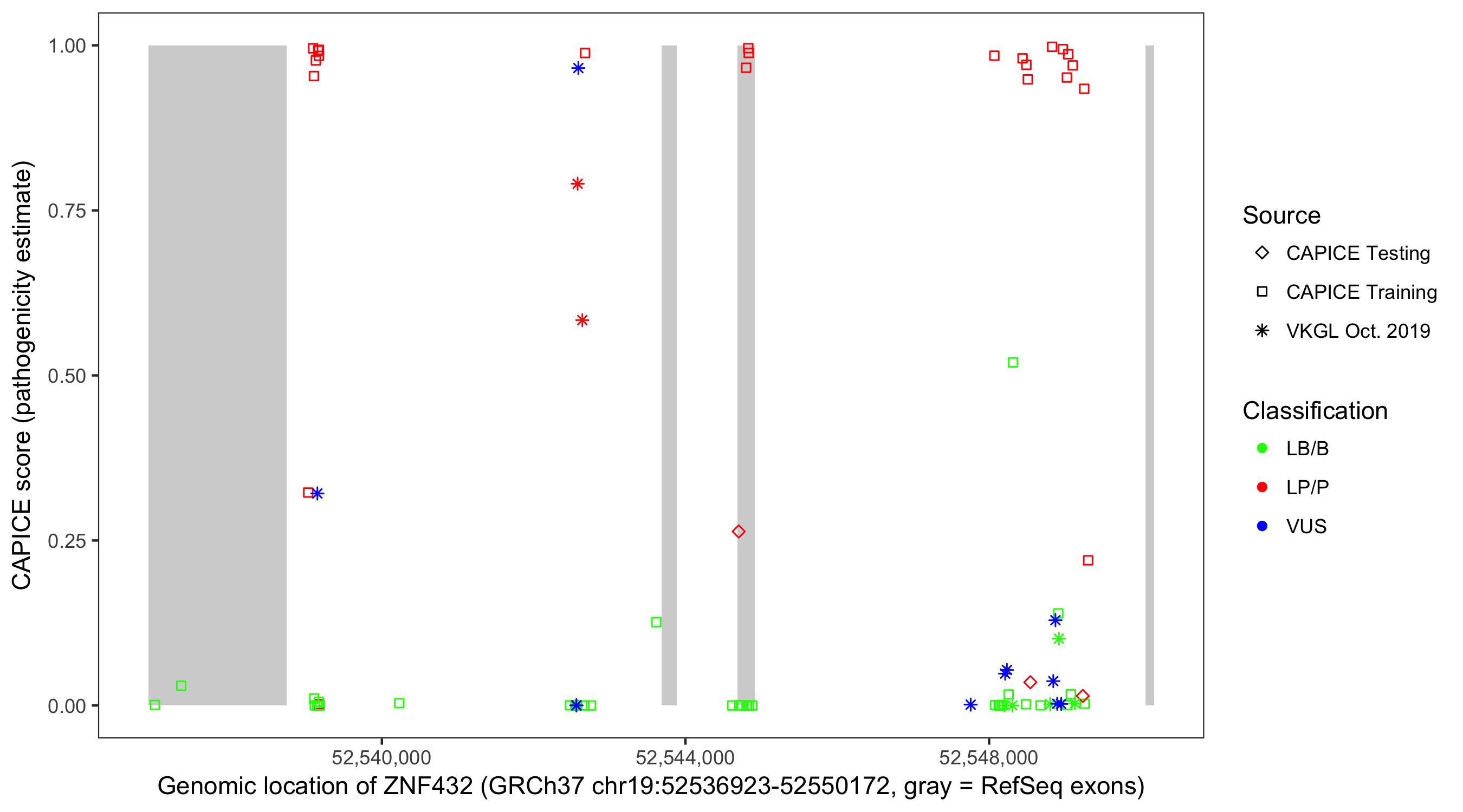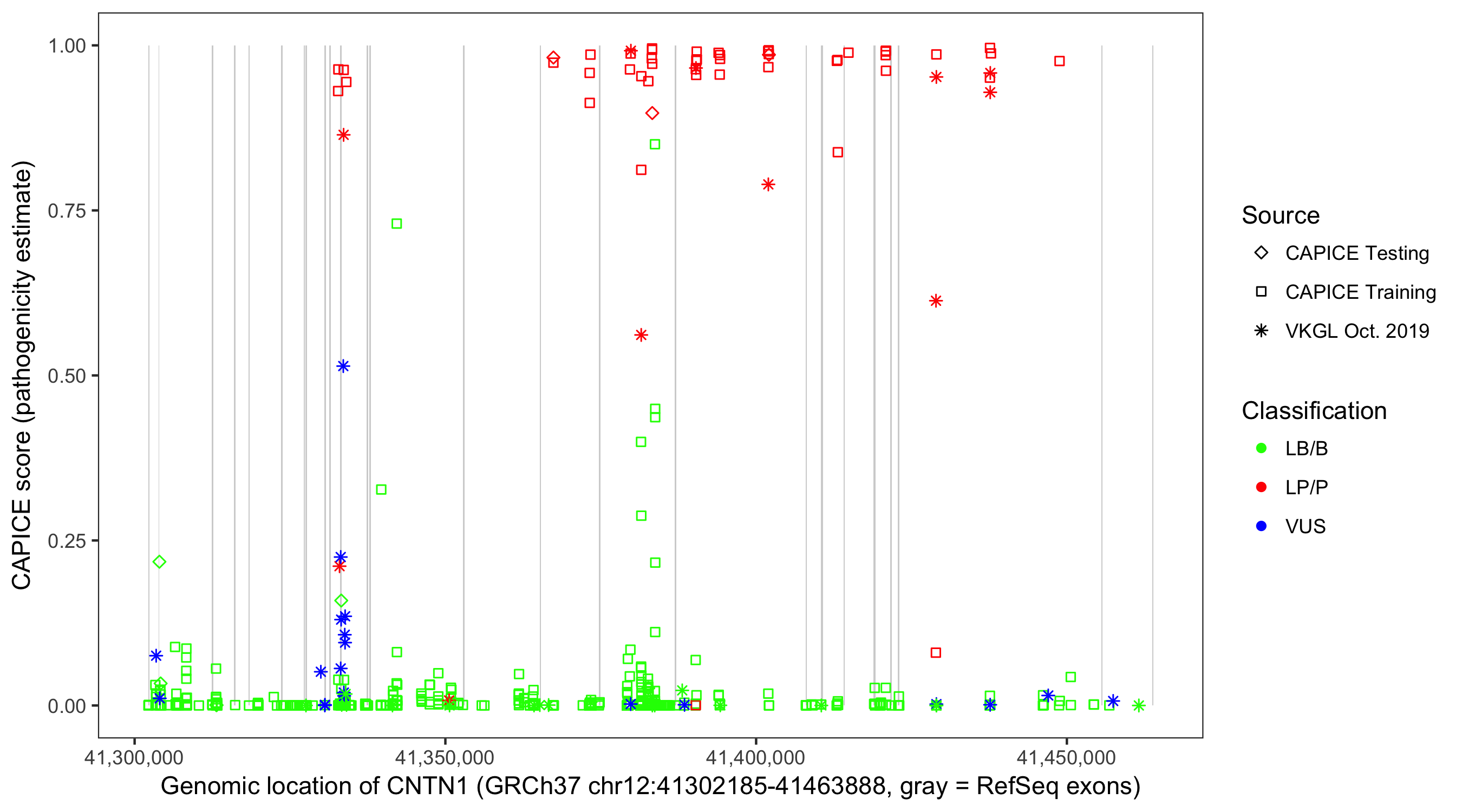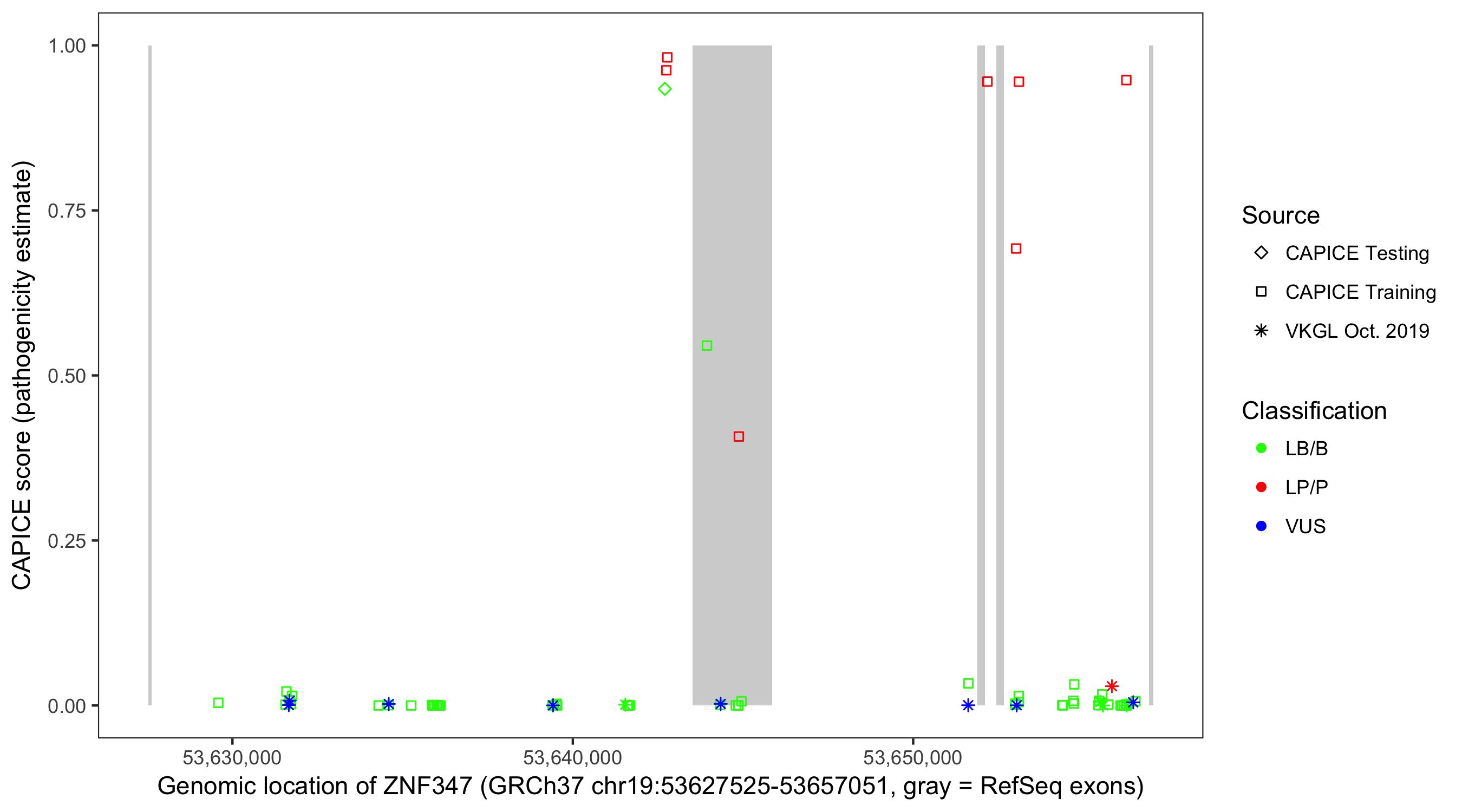 Shown are CAPICE train/test variants plus VKGL Oct 2019.