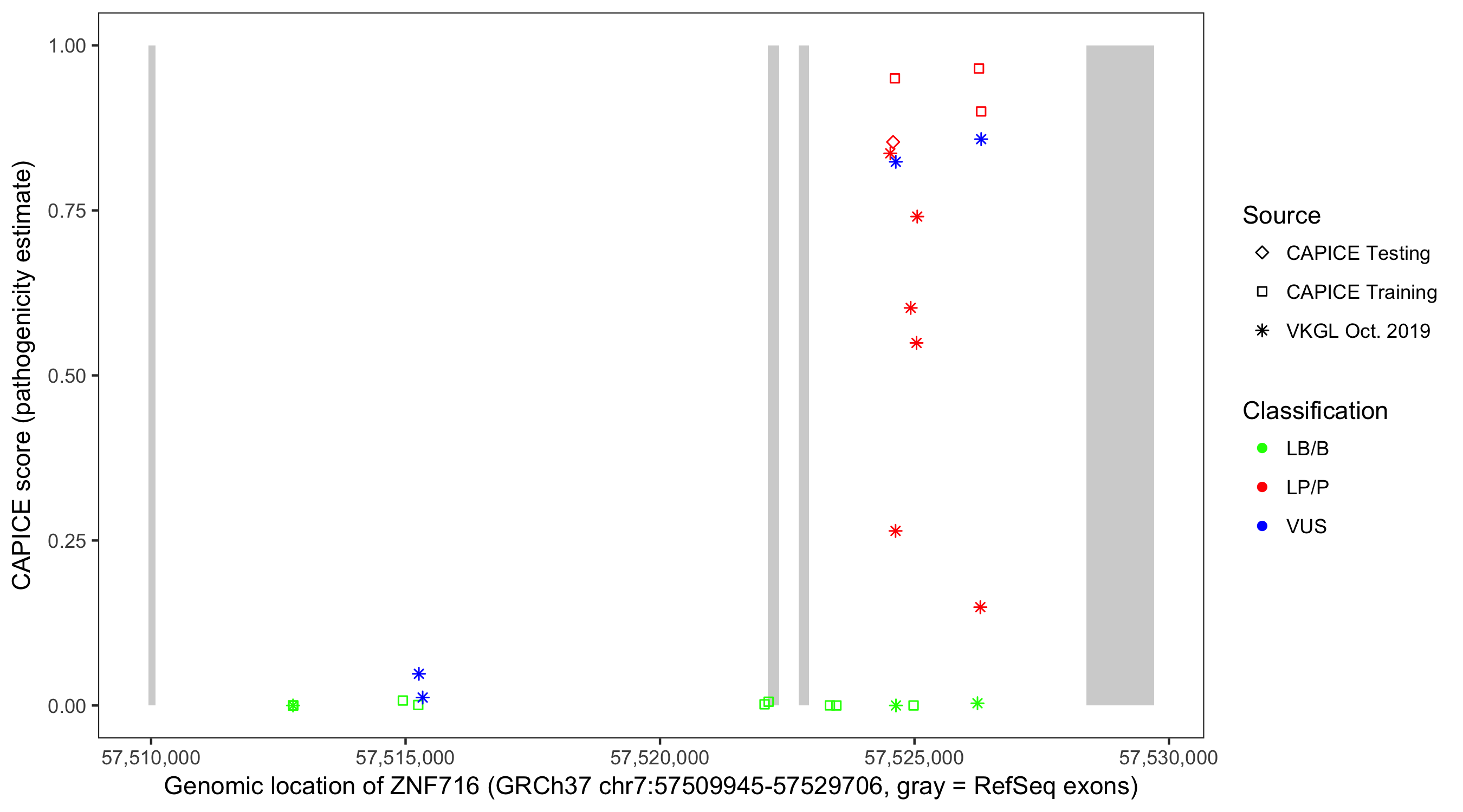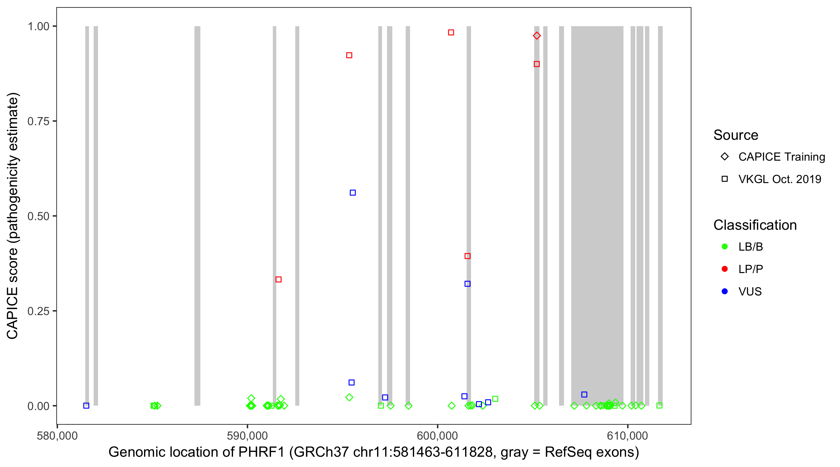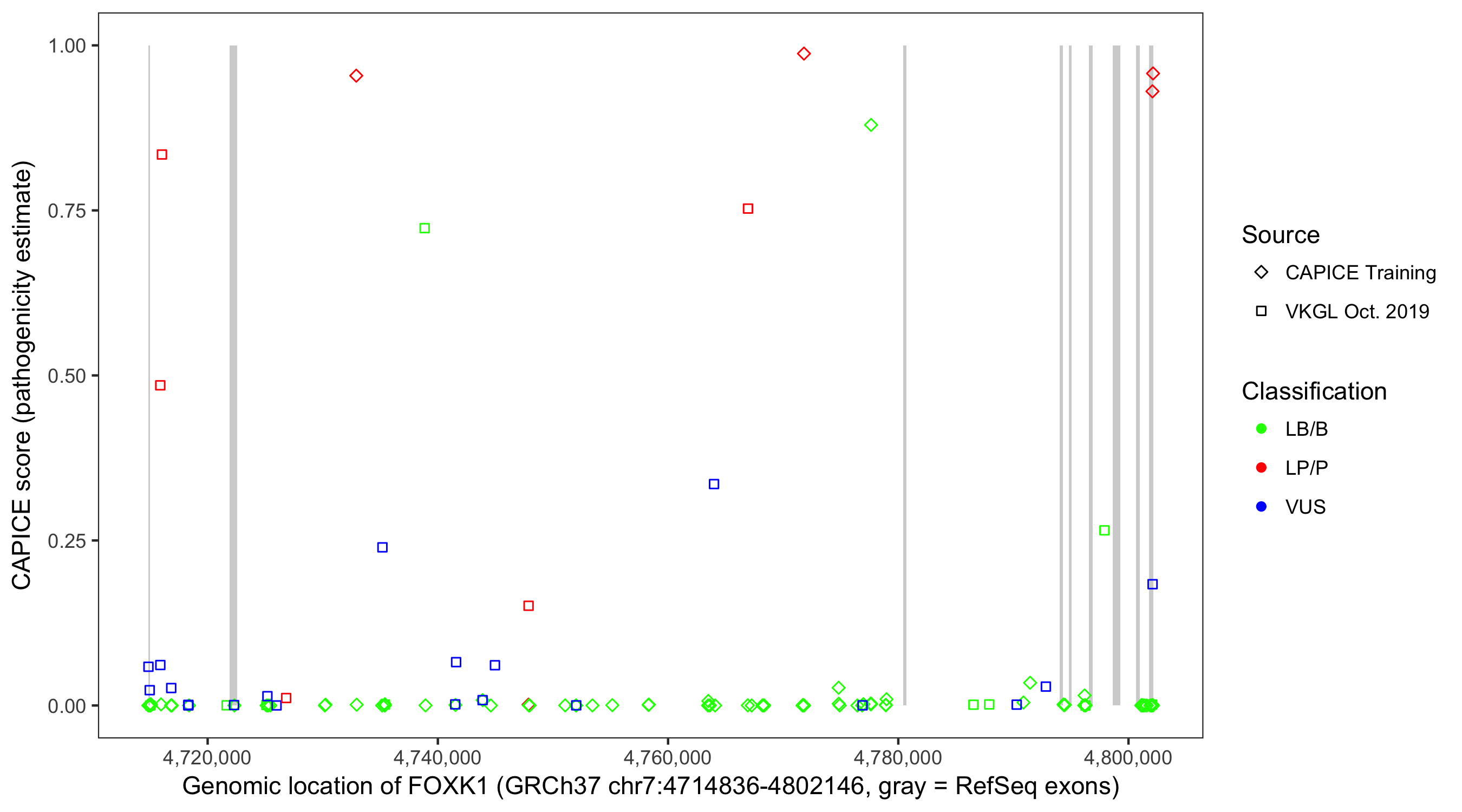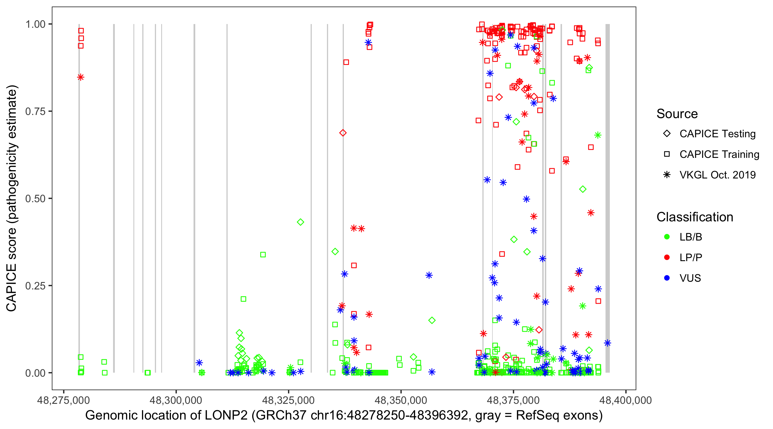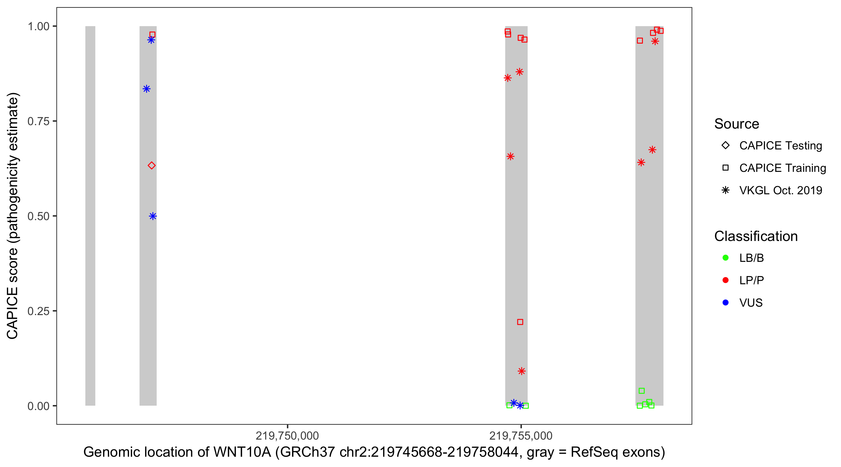 Shown are CAPICE train/test variants plus VKGL Oct 2019.