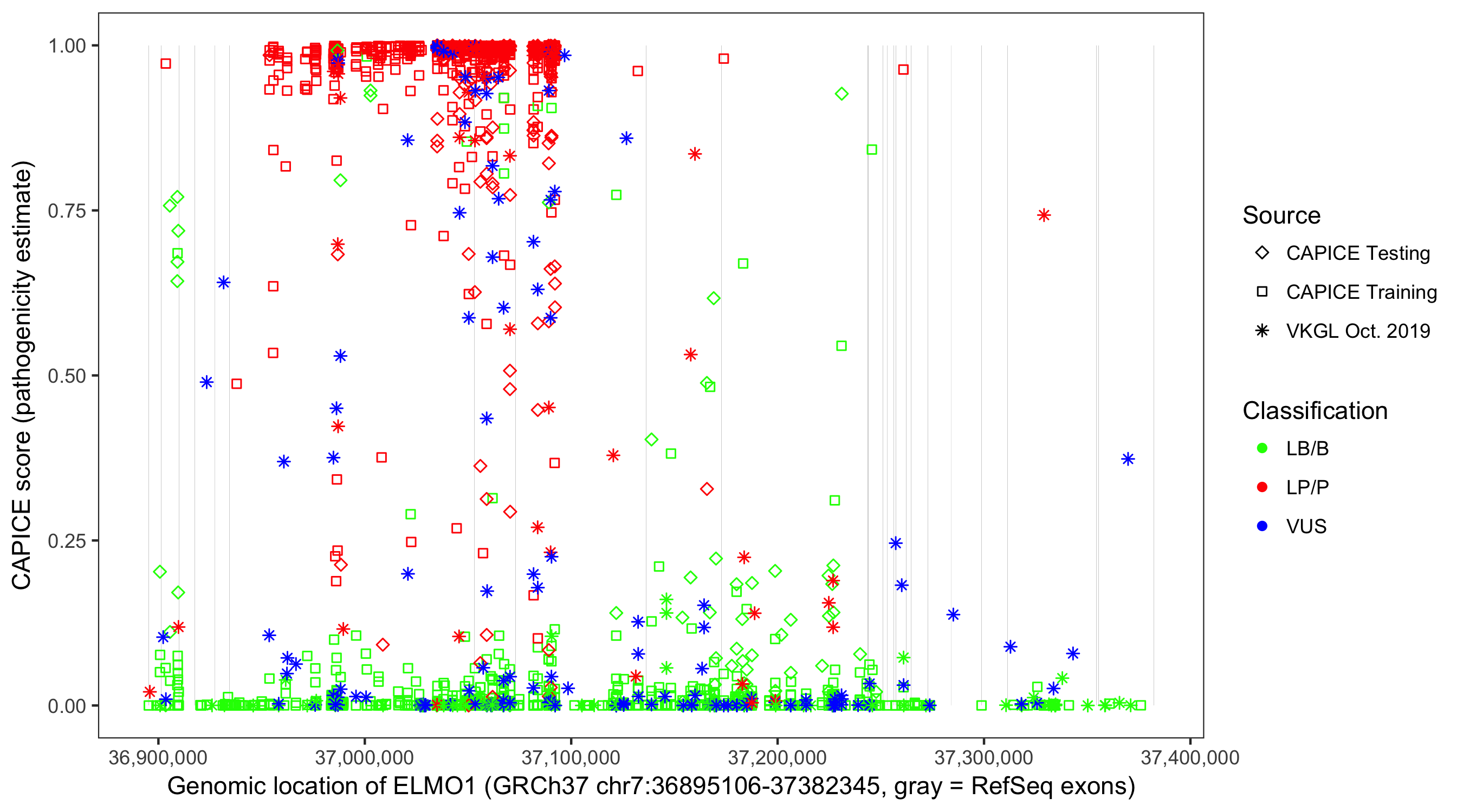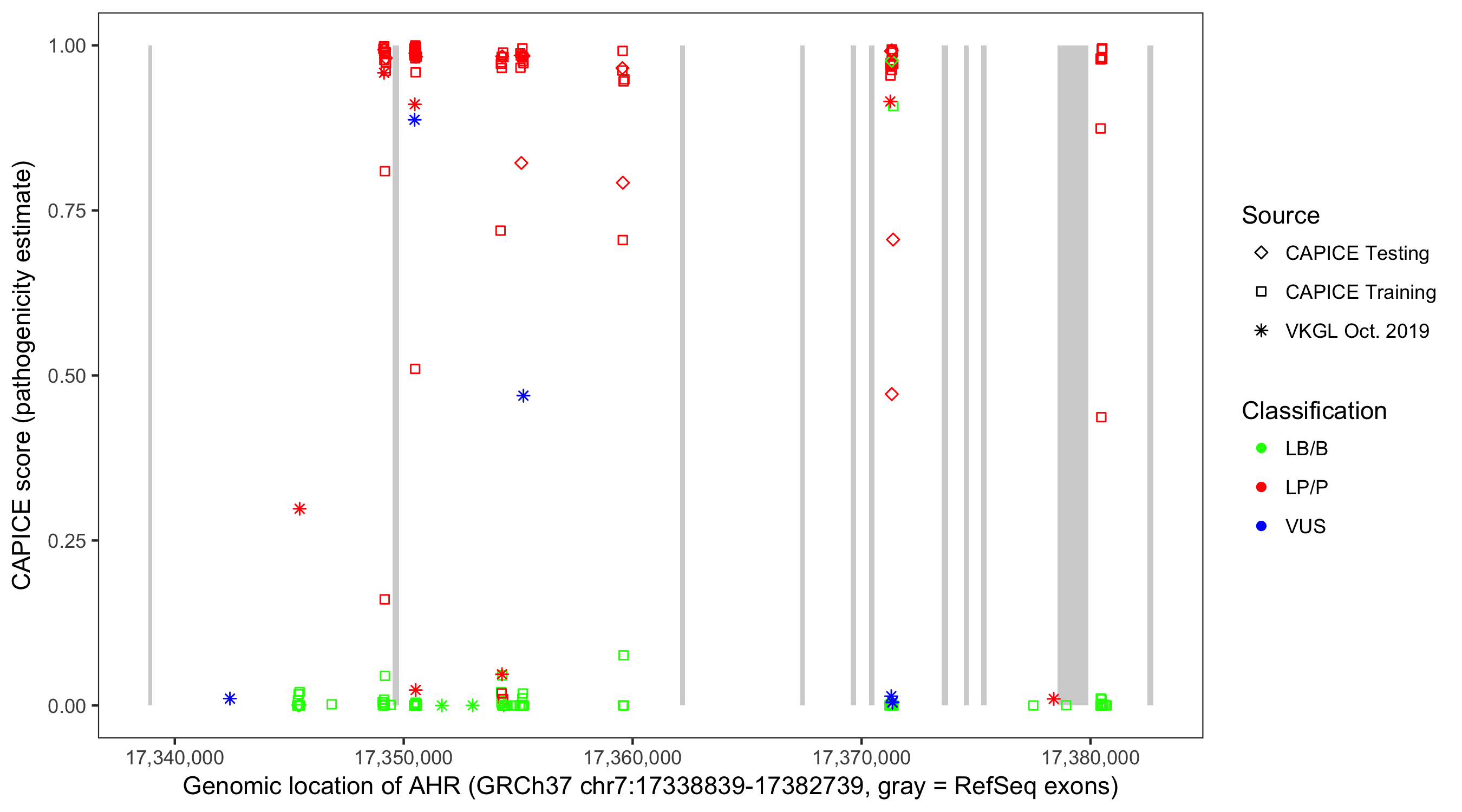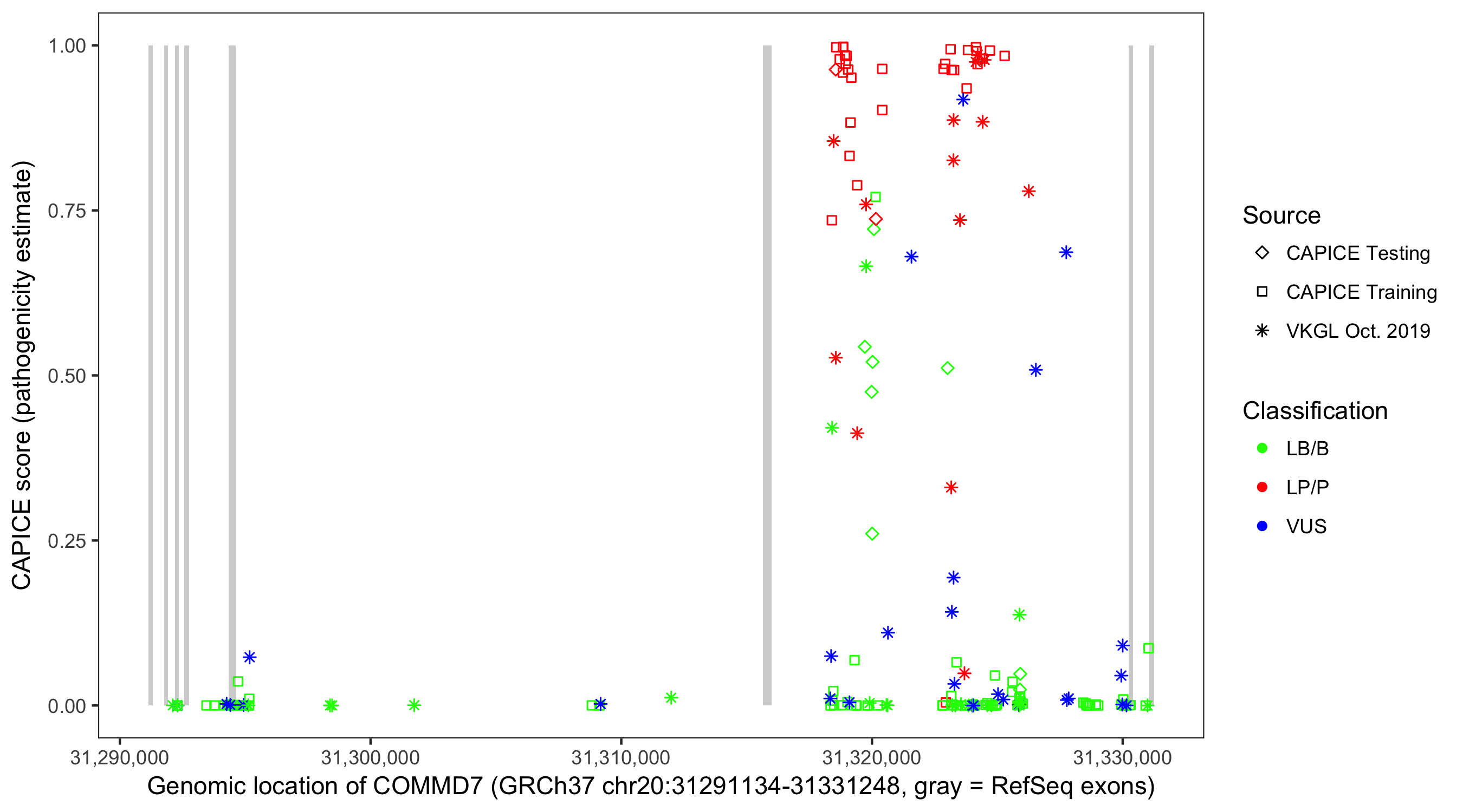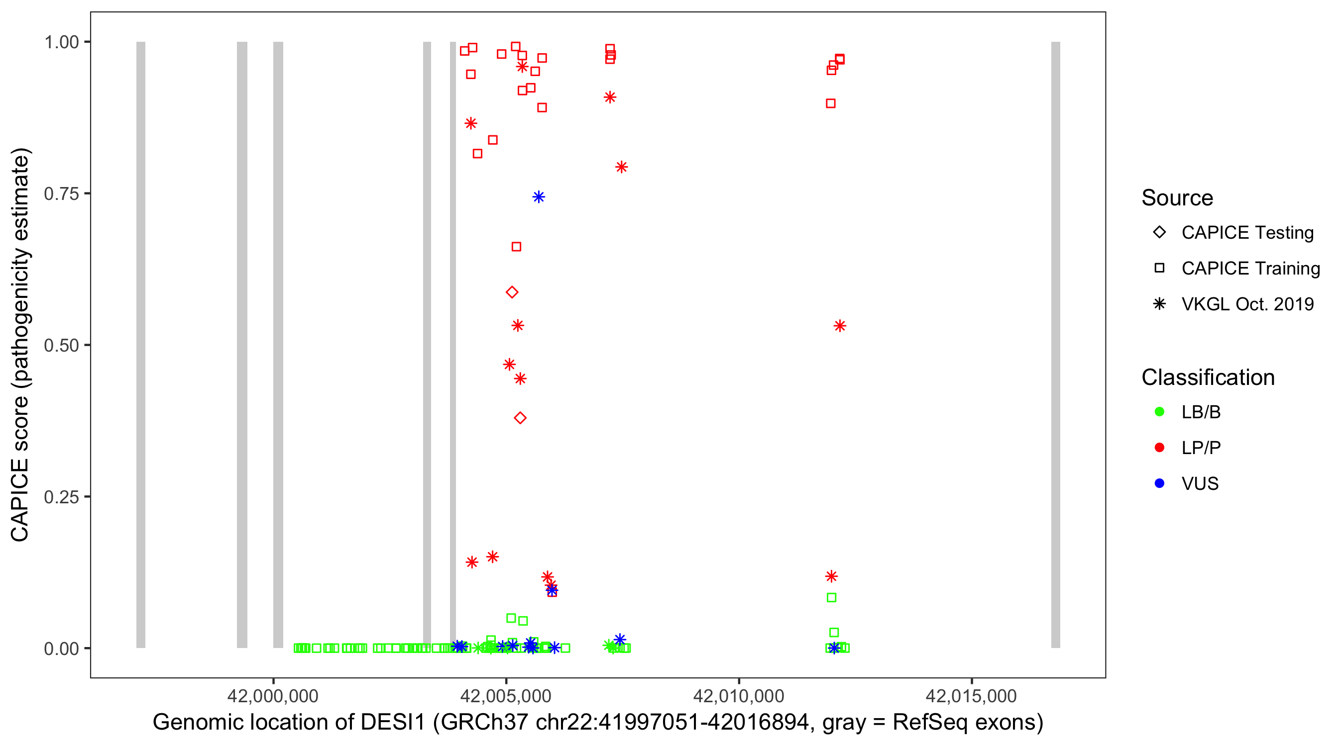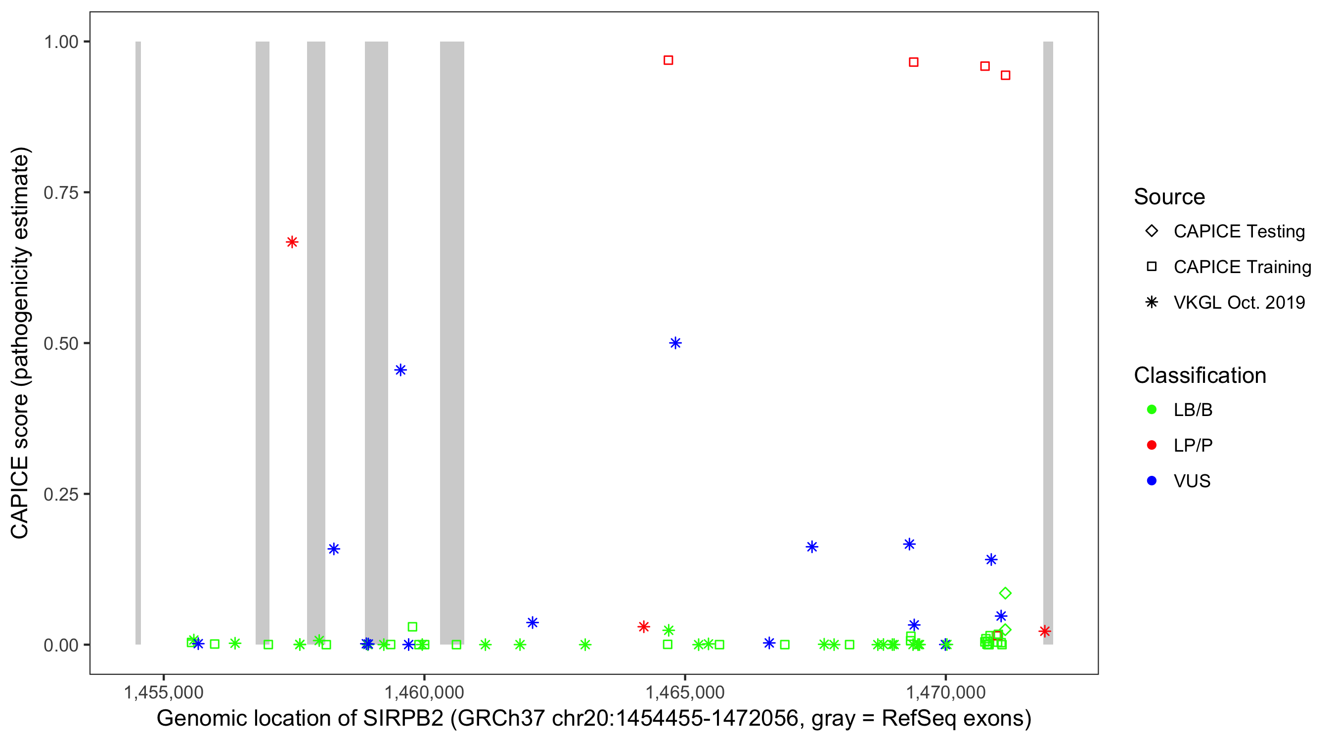 Shown are CAPICE train/test variants plus VKGL Oct 2019.