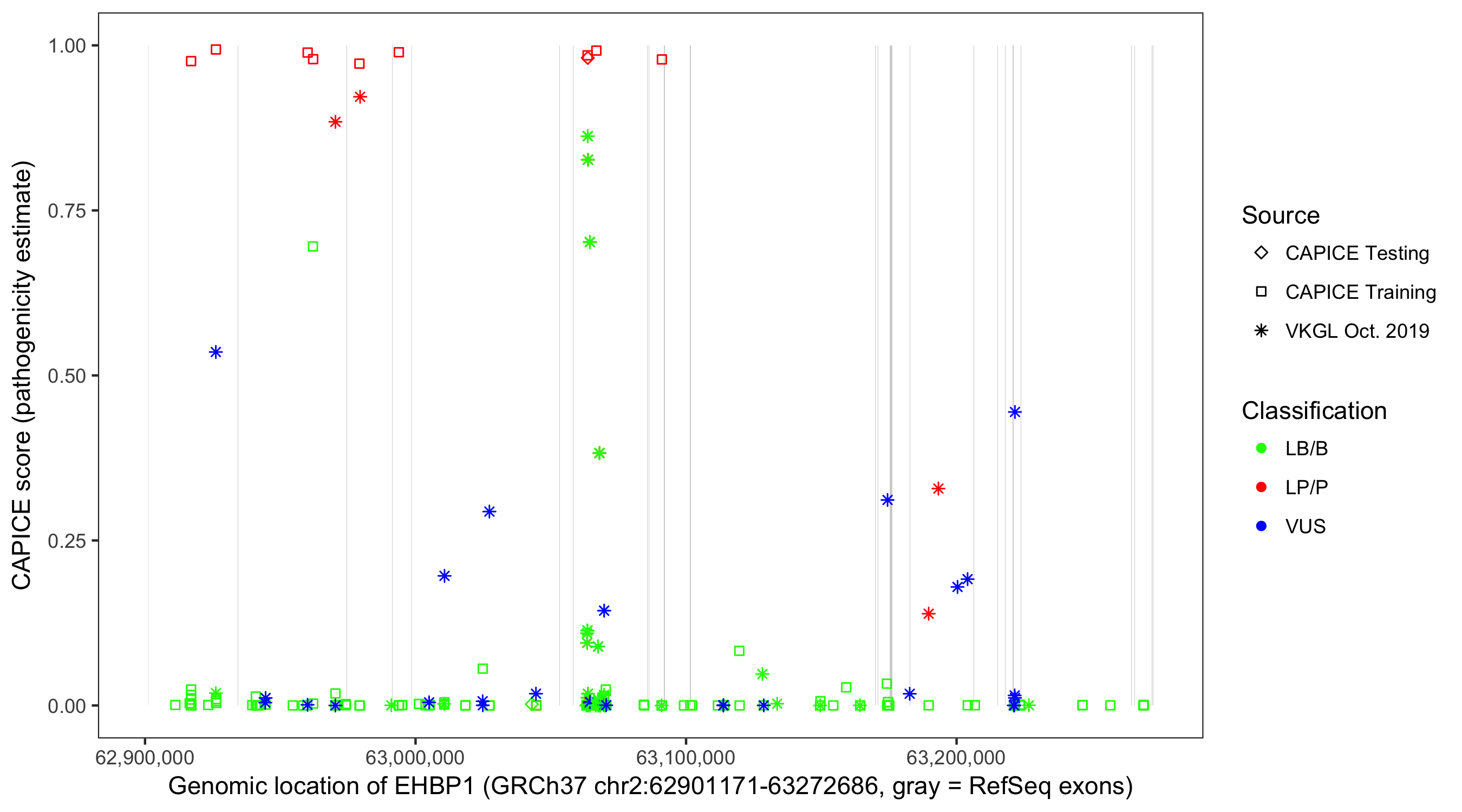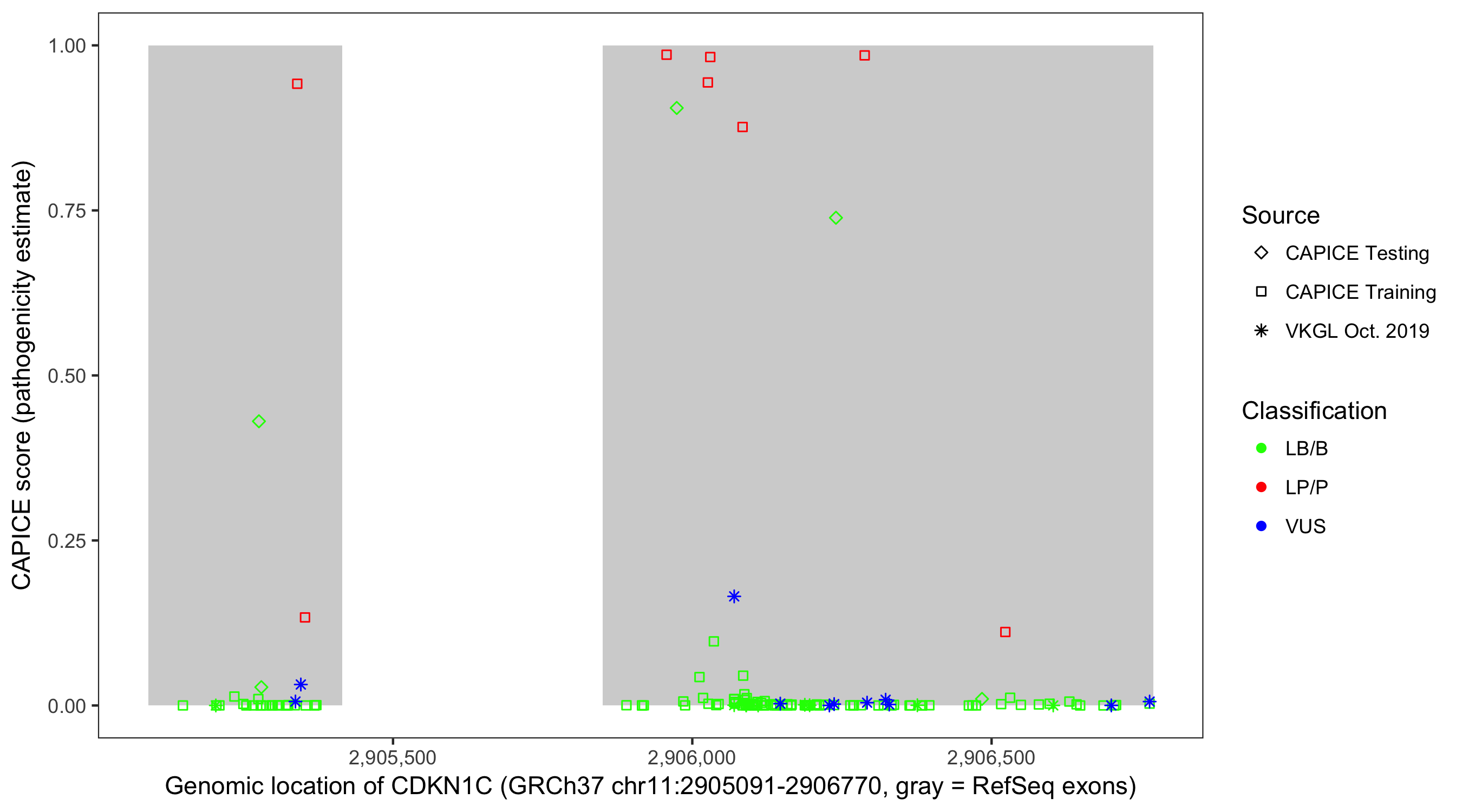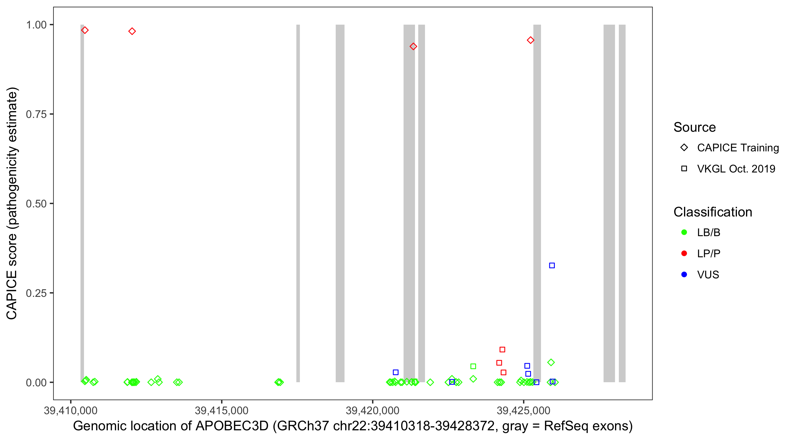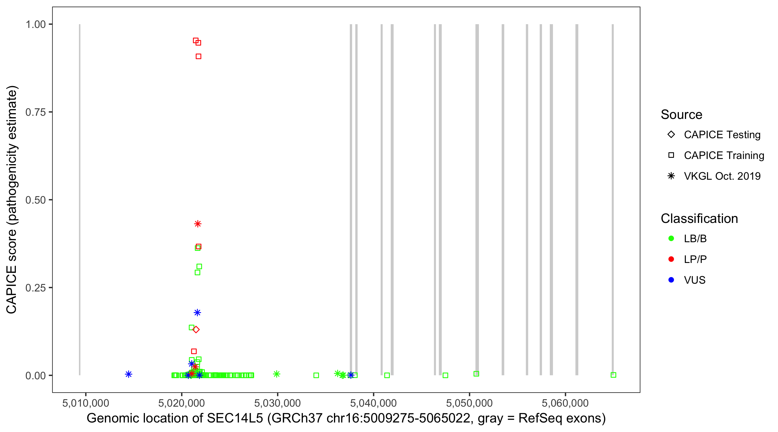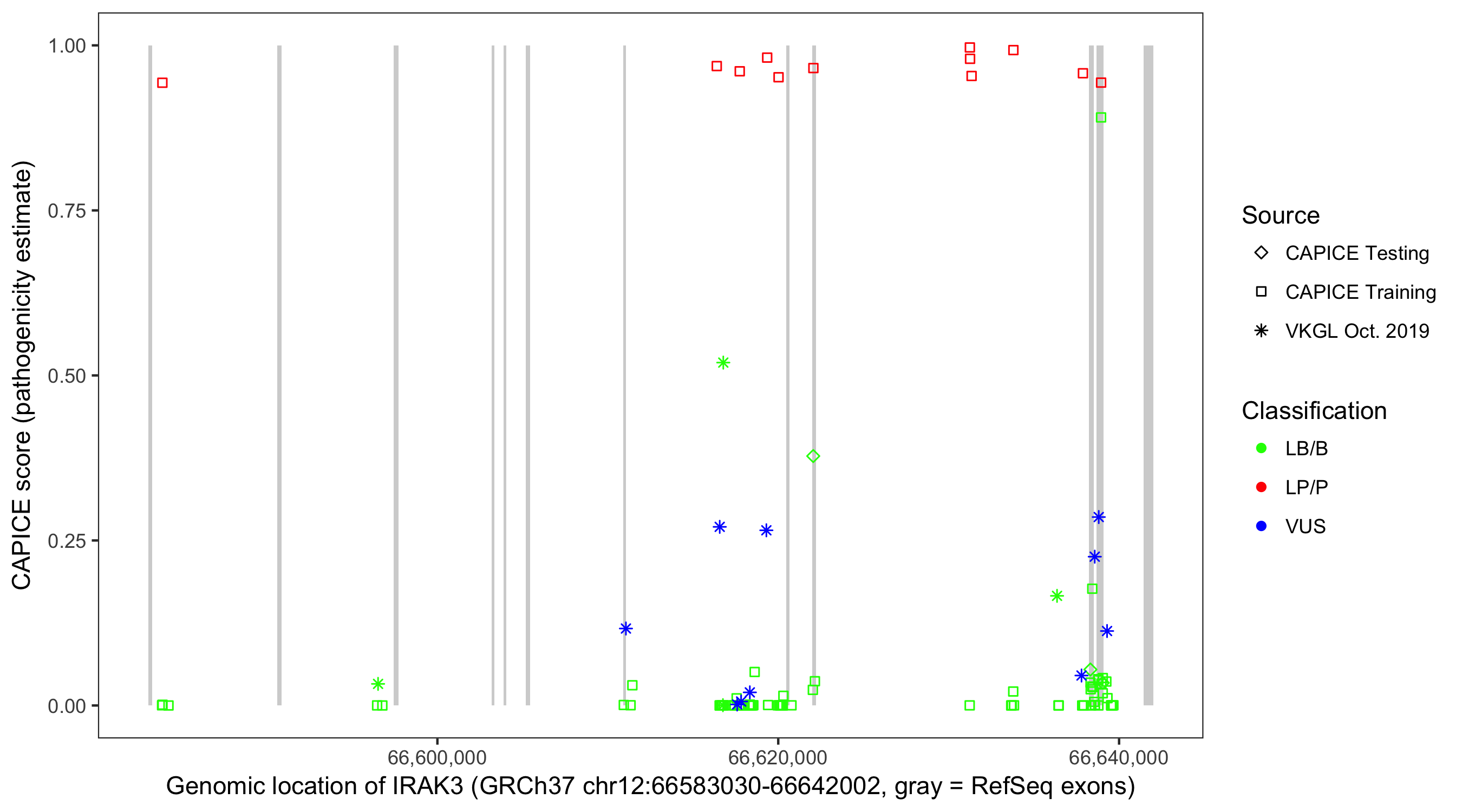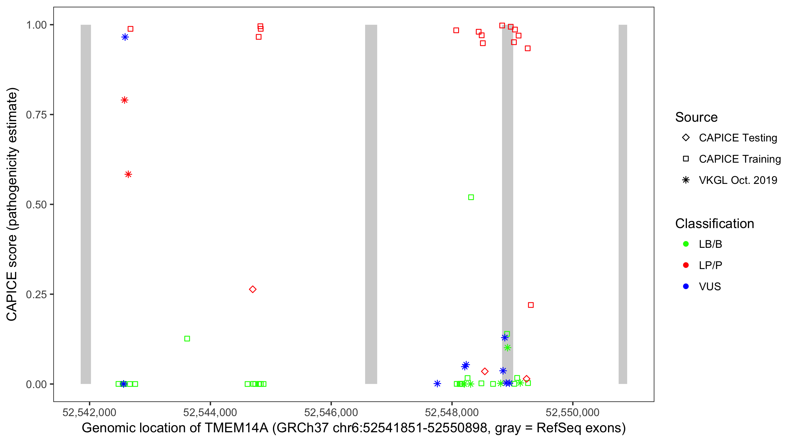 Shown are CAPICE train/test variants plus VKGL Oct 2019.