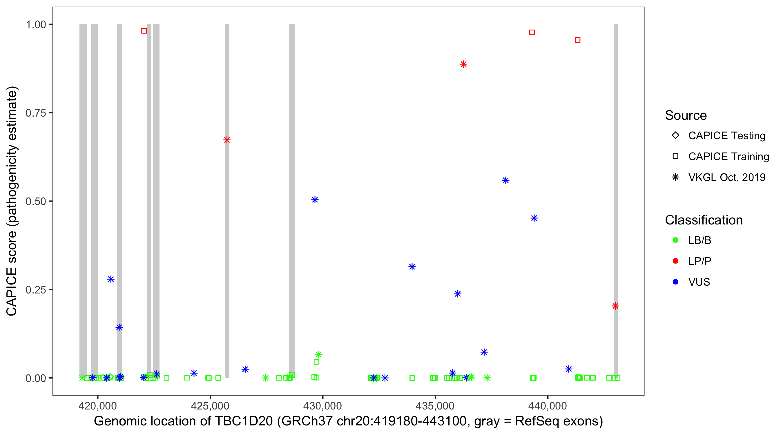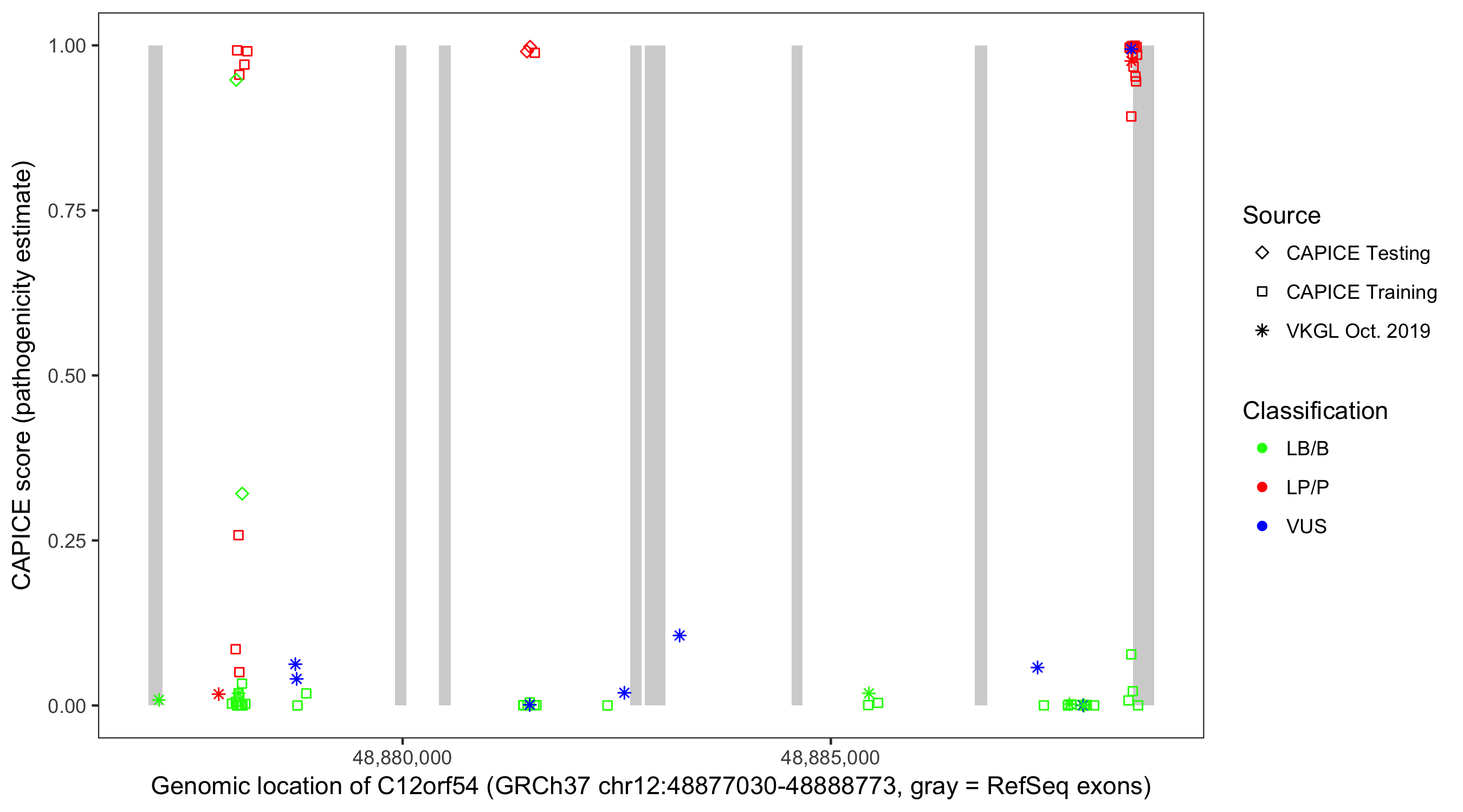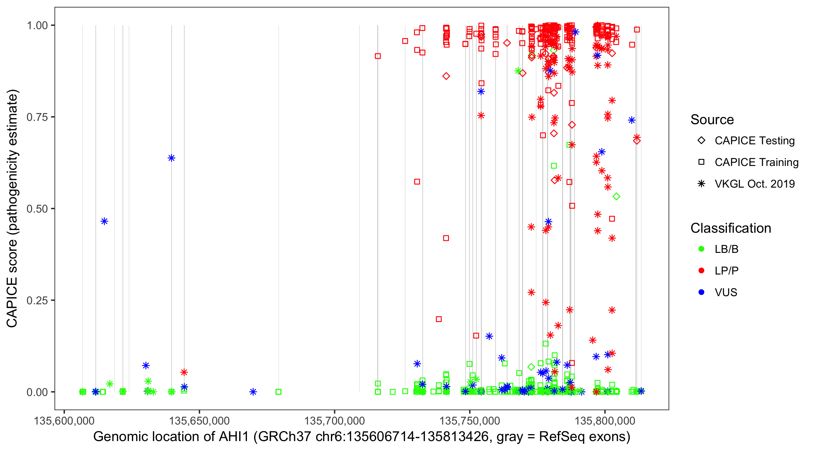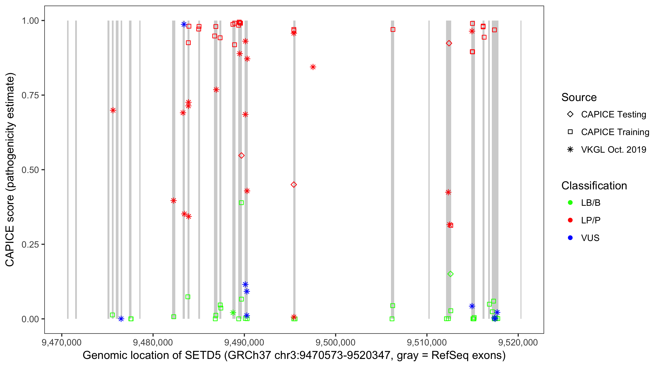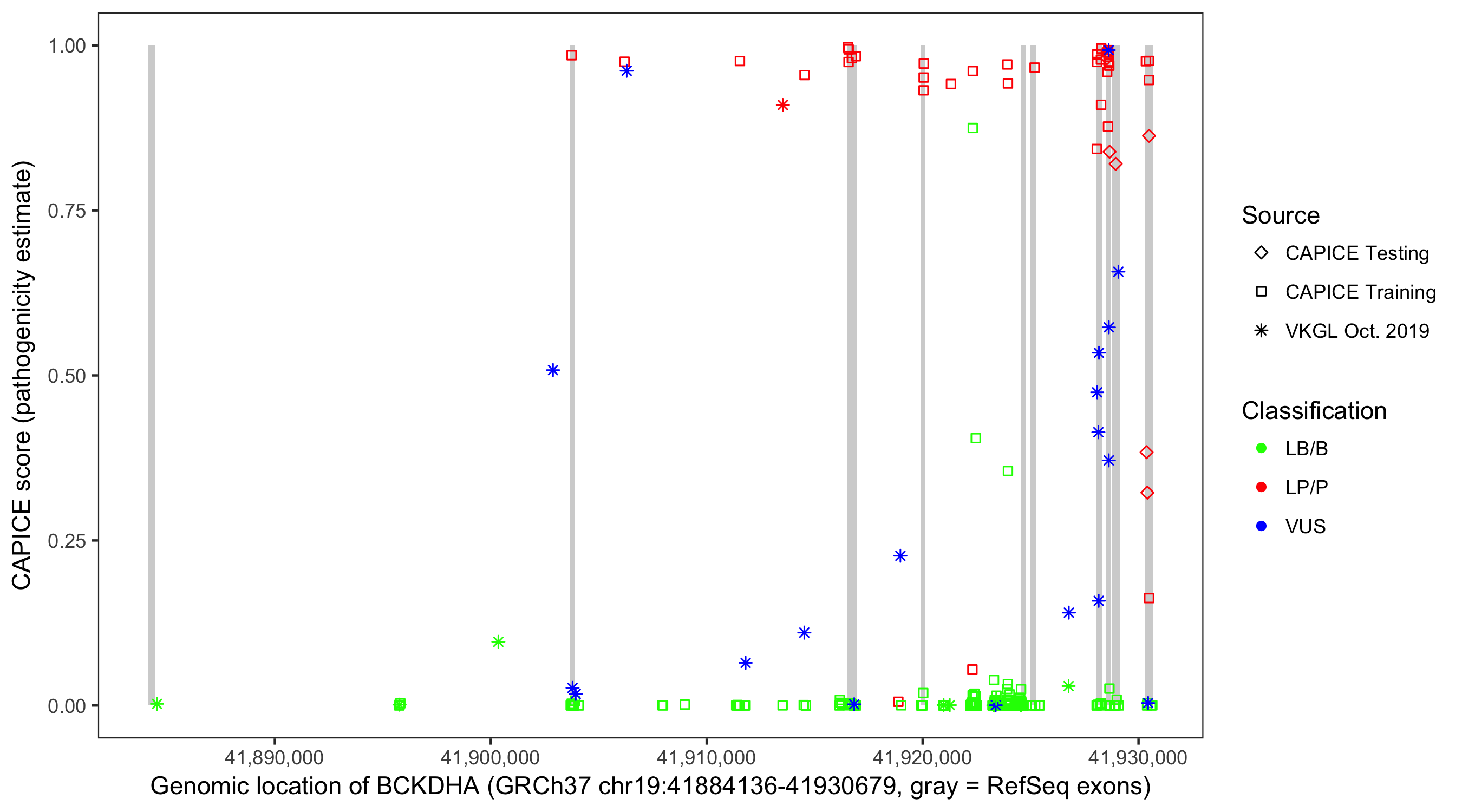 Shown are CAPICE train/test variants plus VKGL Oct 2019.