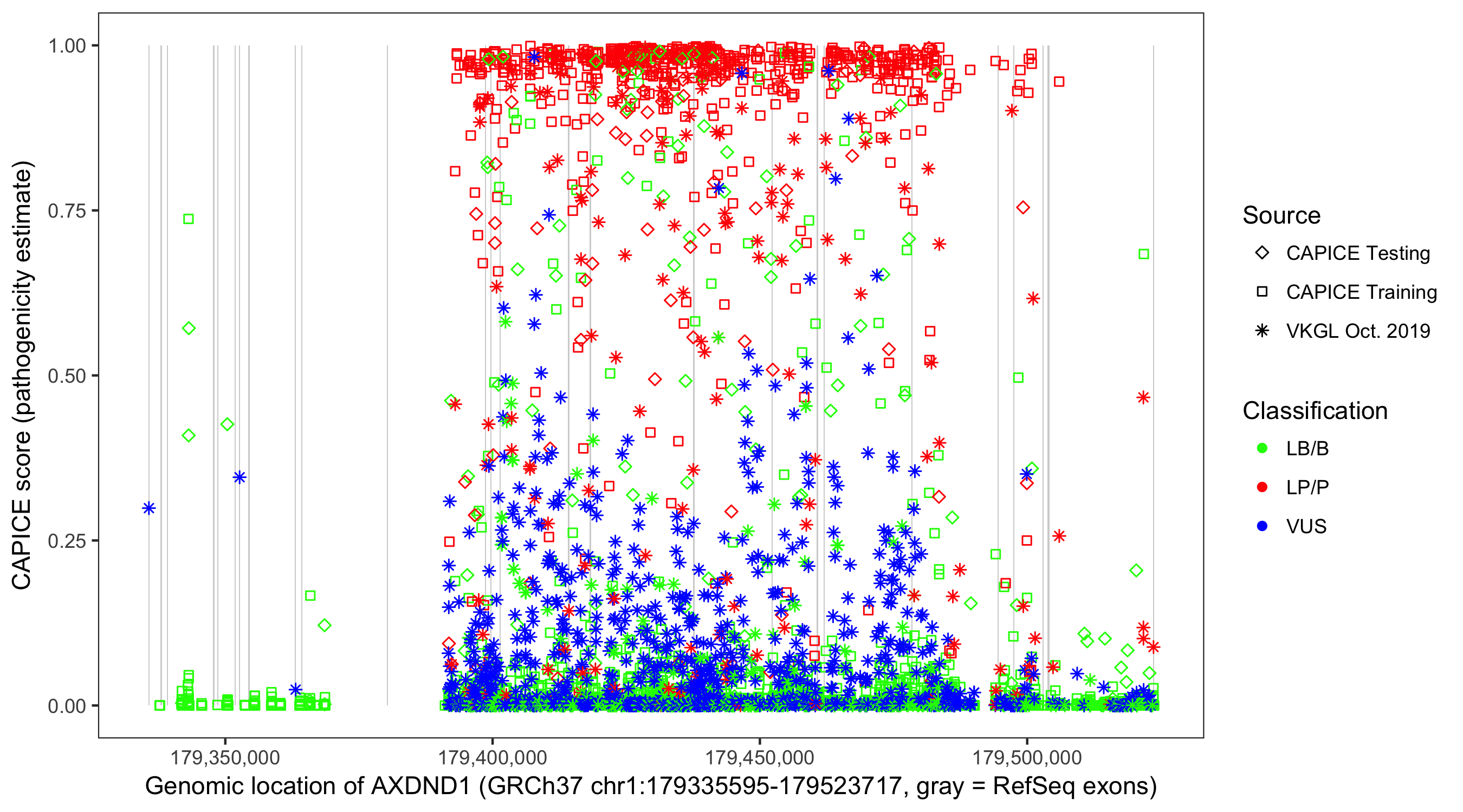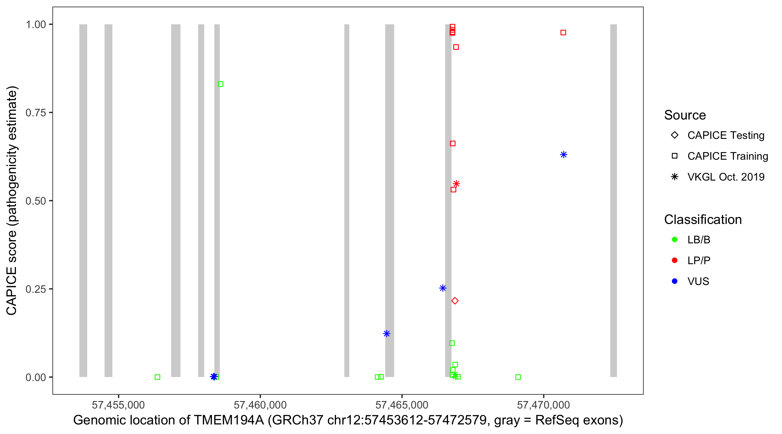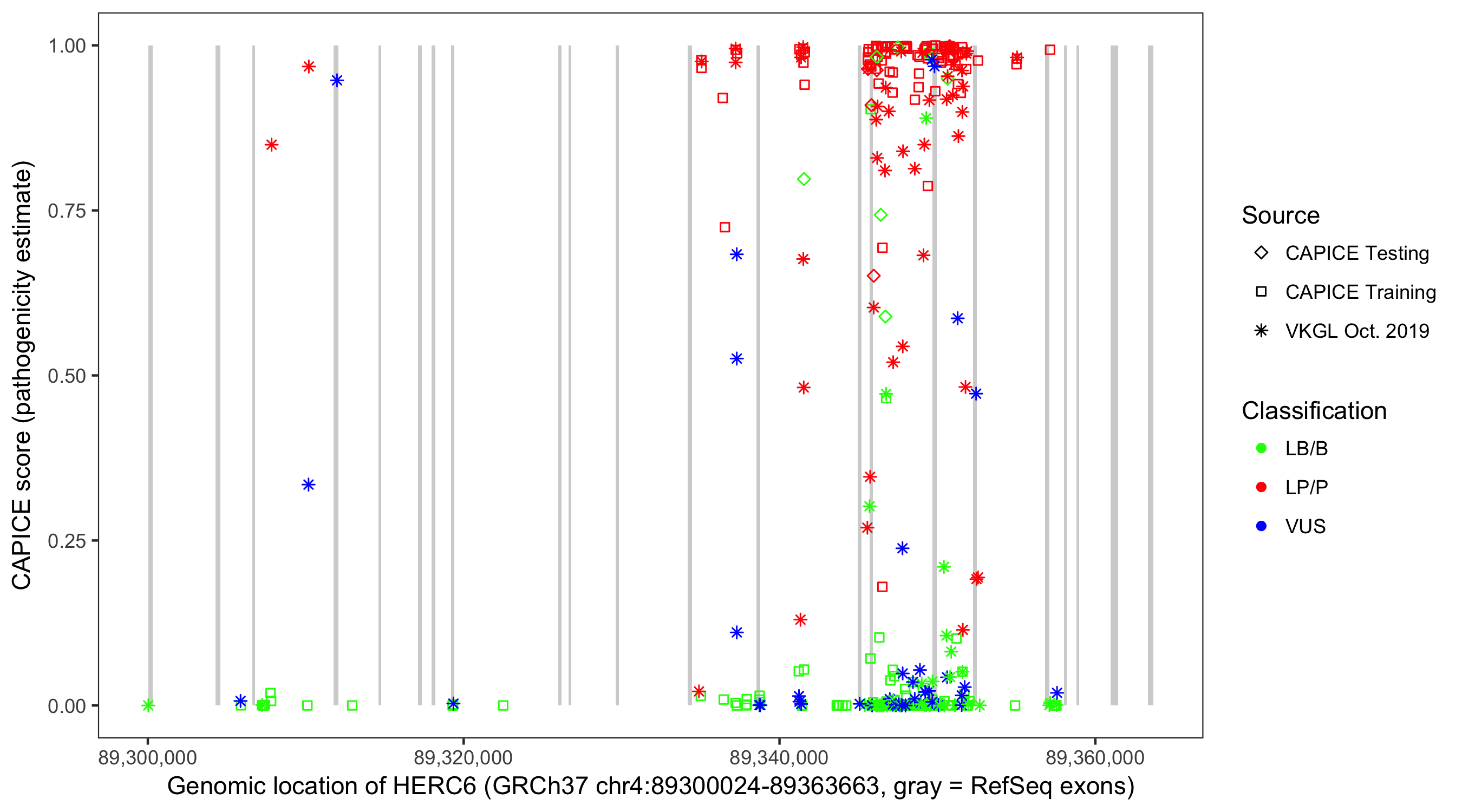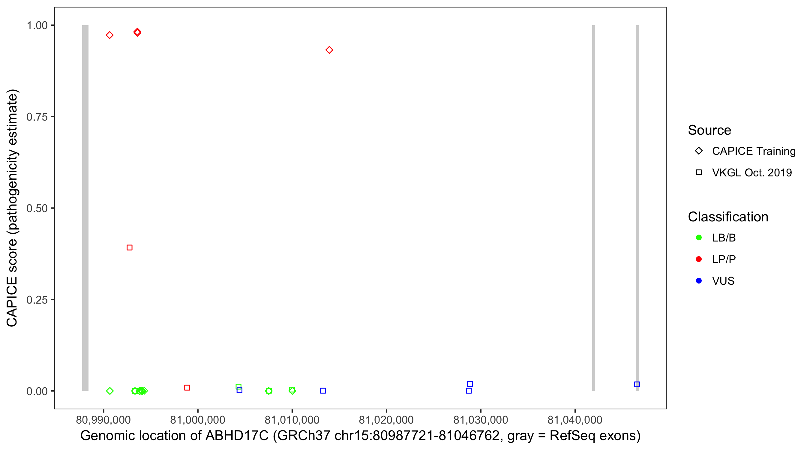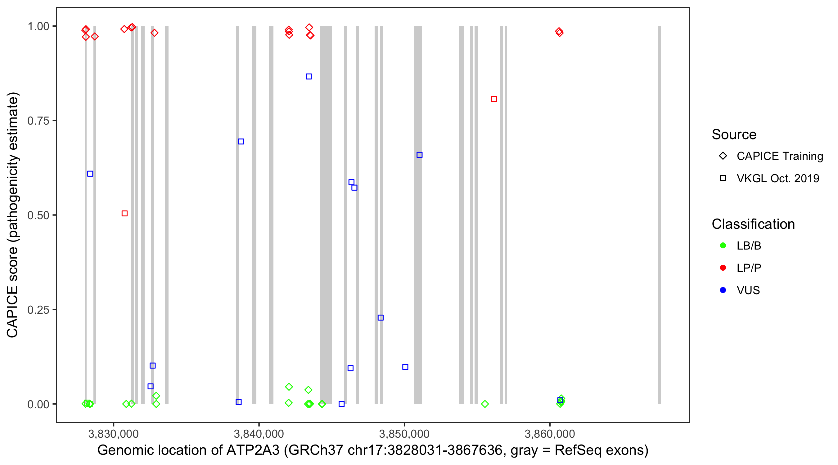 Shown are CAPICE train/test variants plus VKGL Oct 2019.