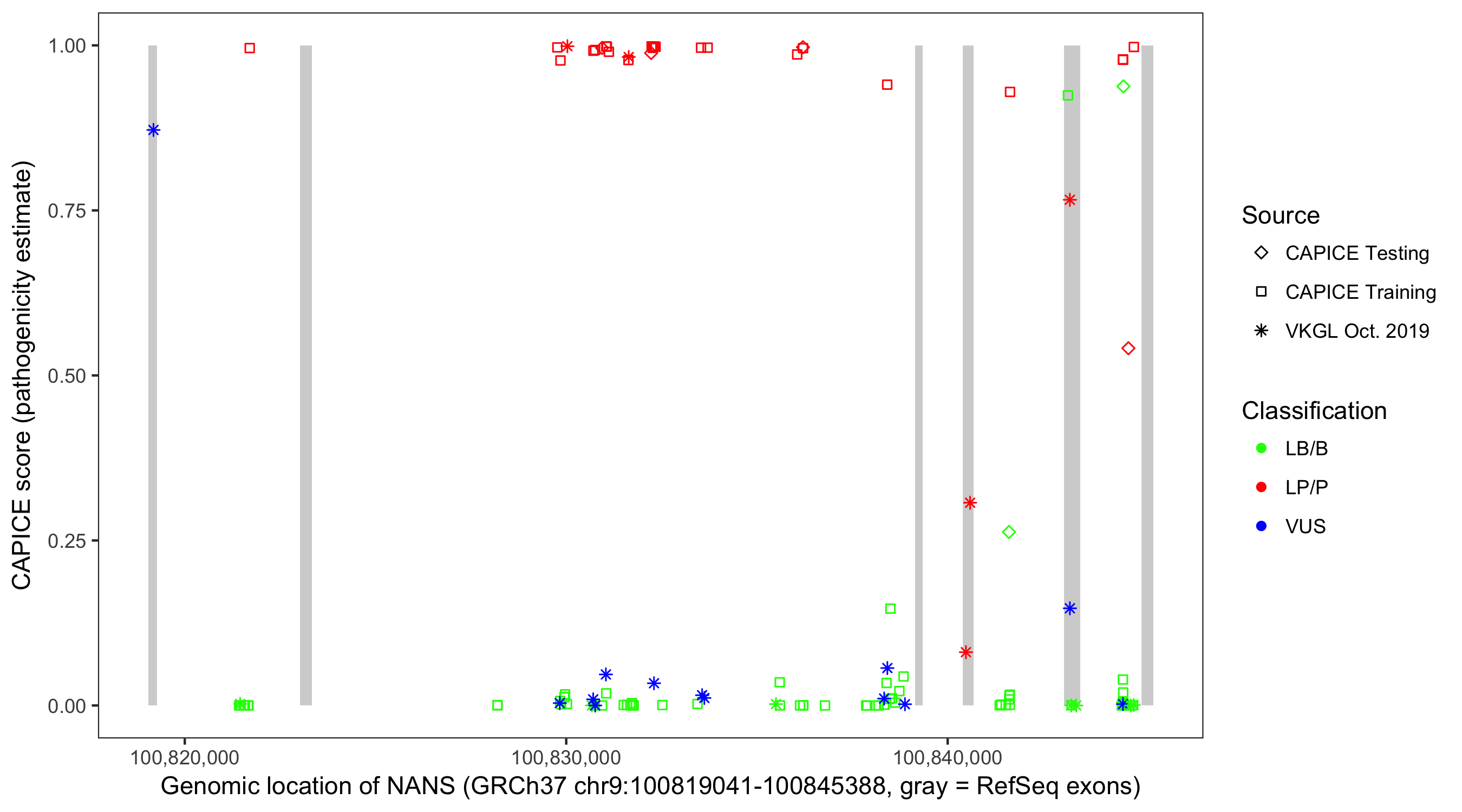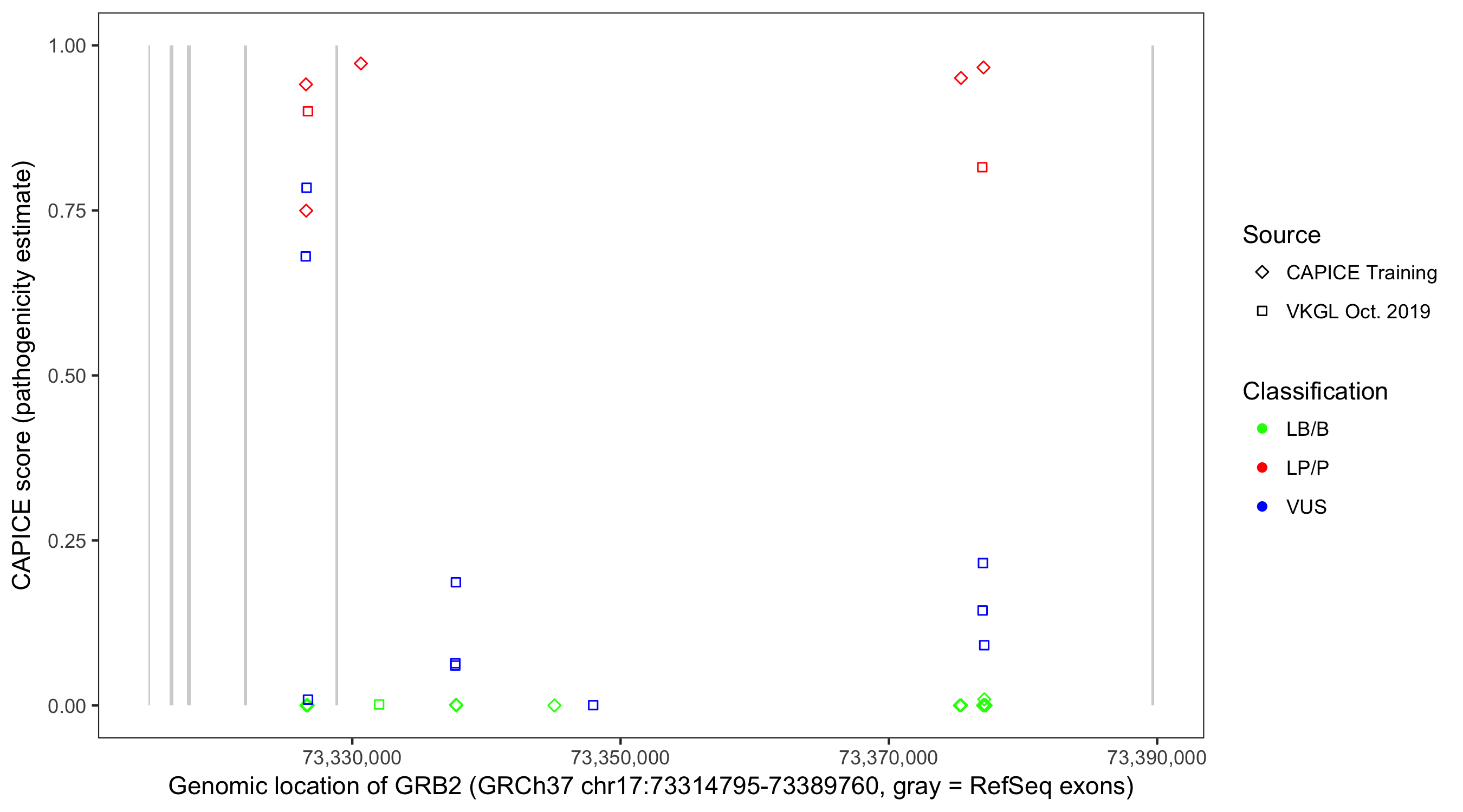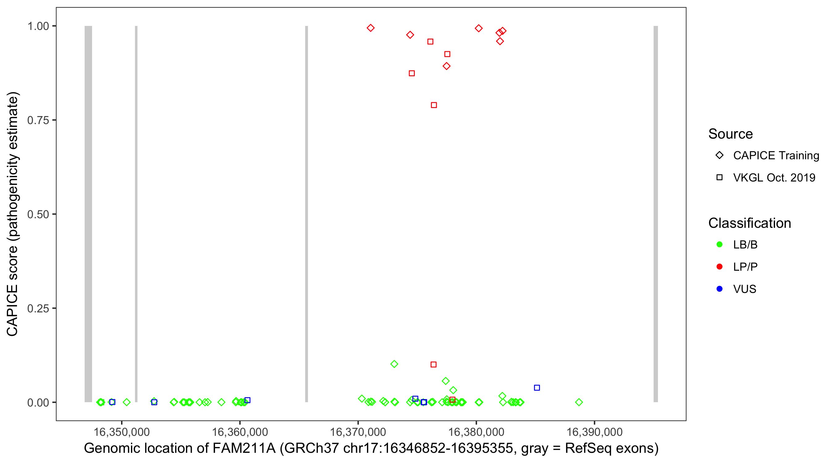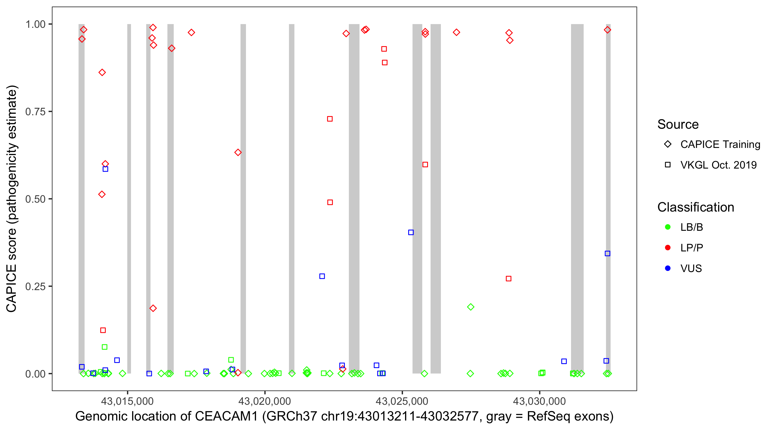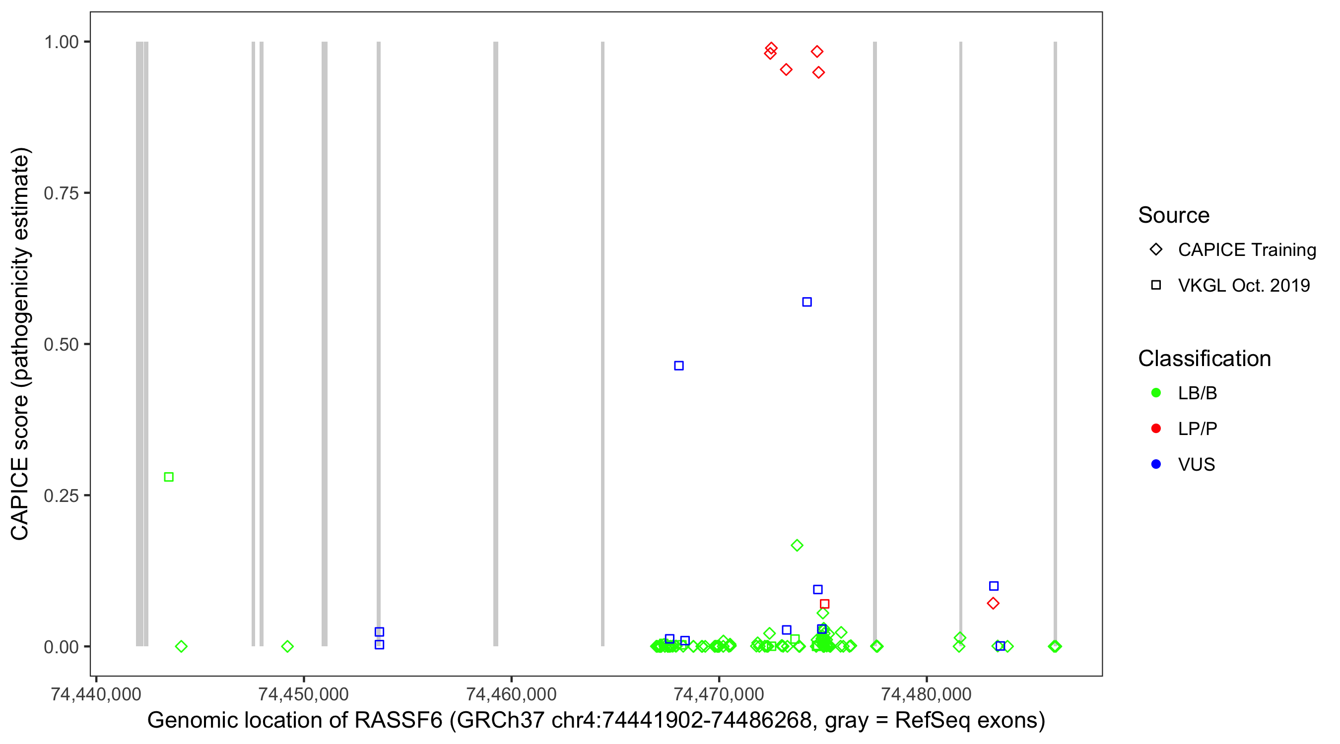 Shown are CAPICE train/test variants plus VKGL Oct 2019.