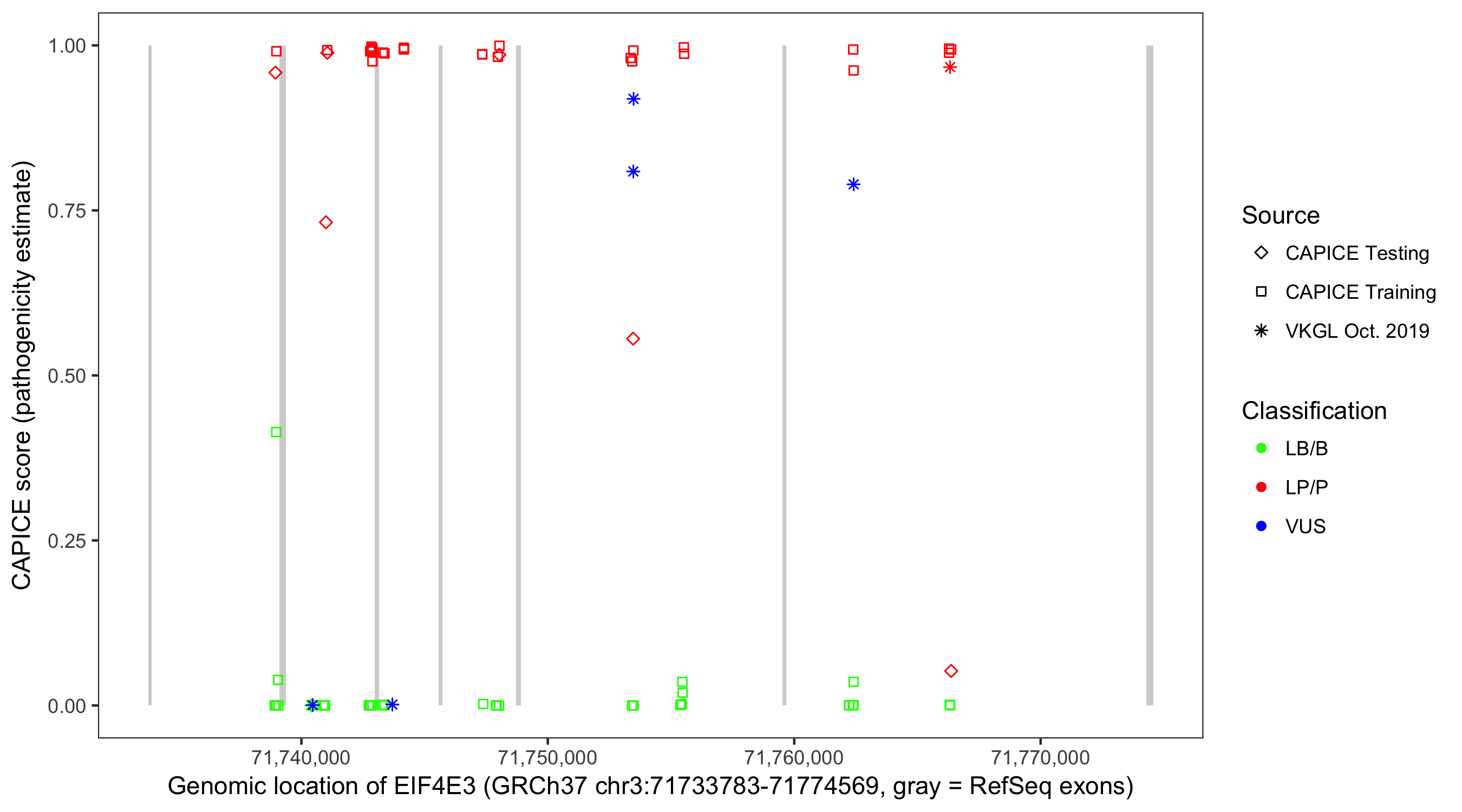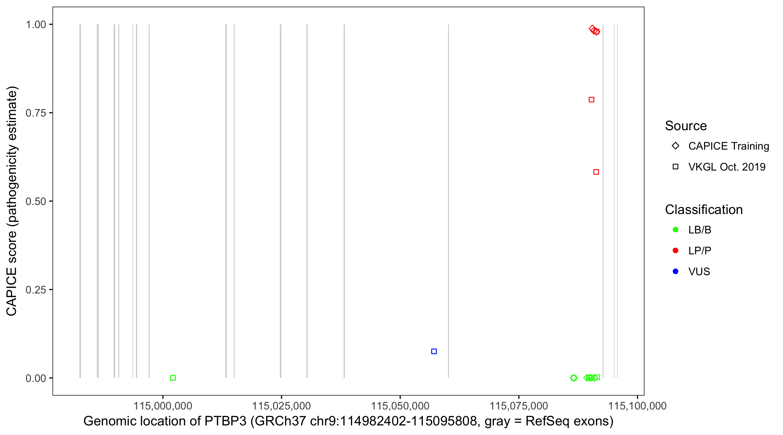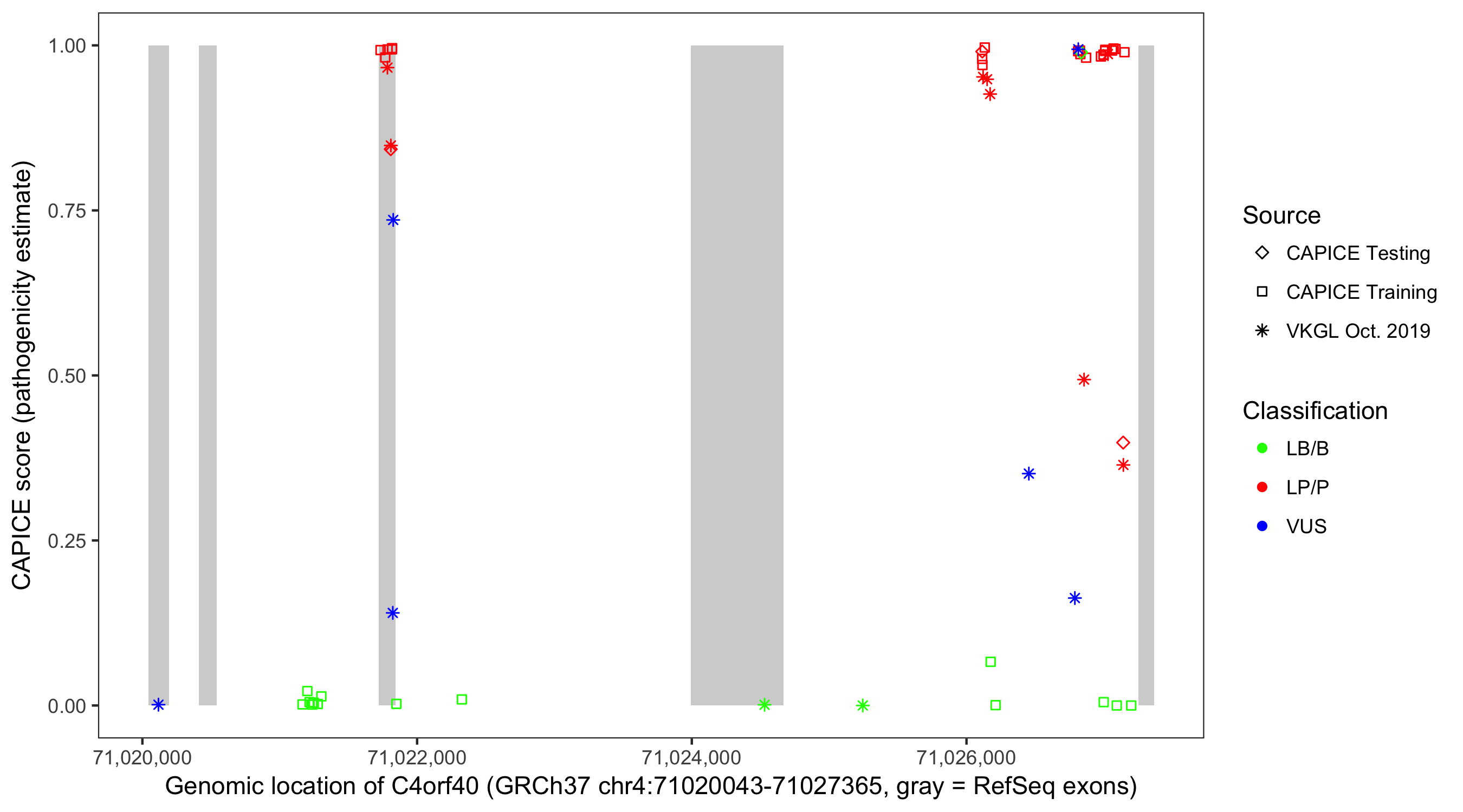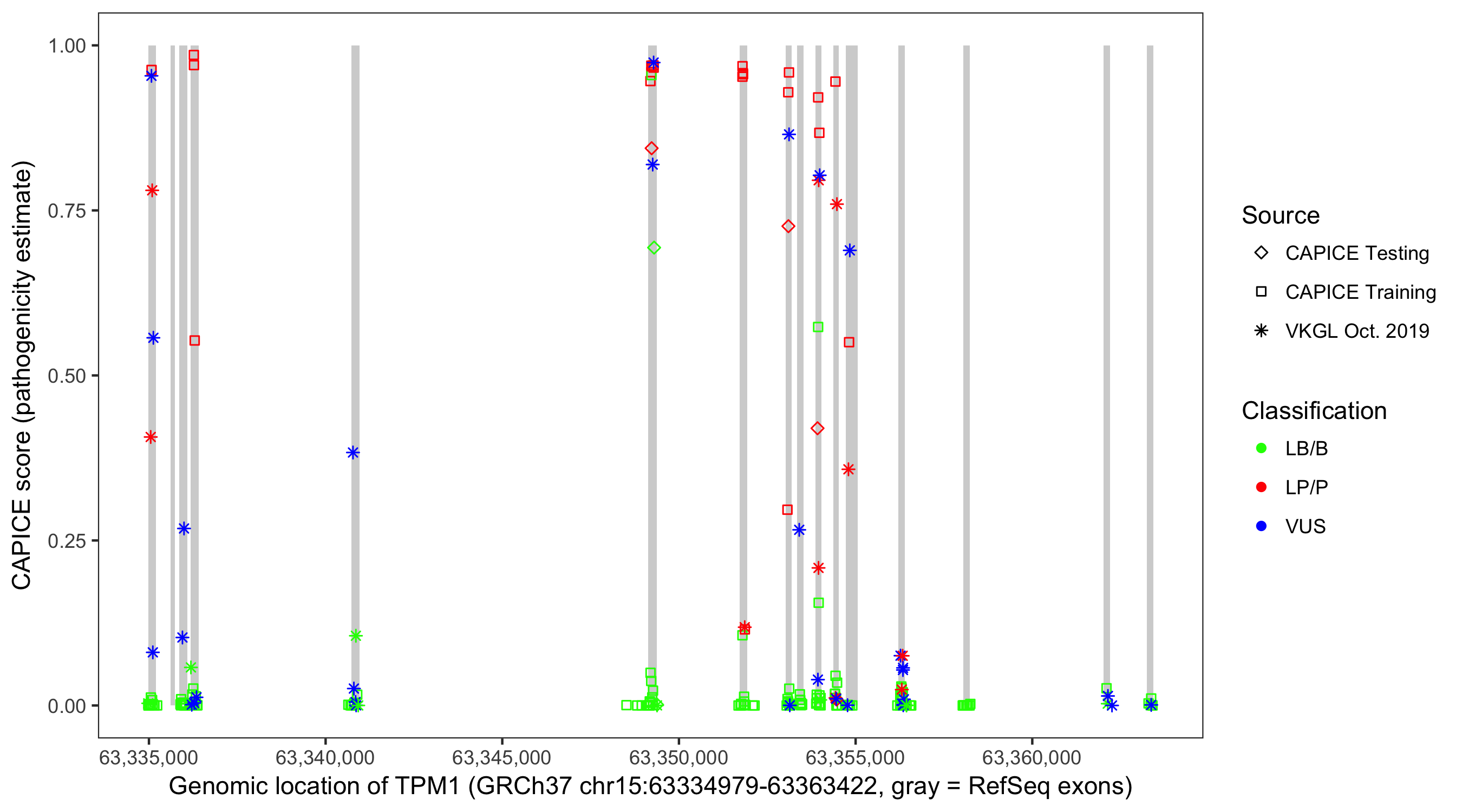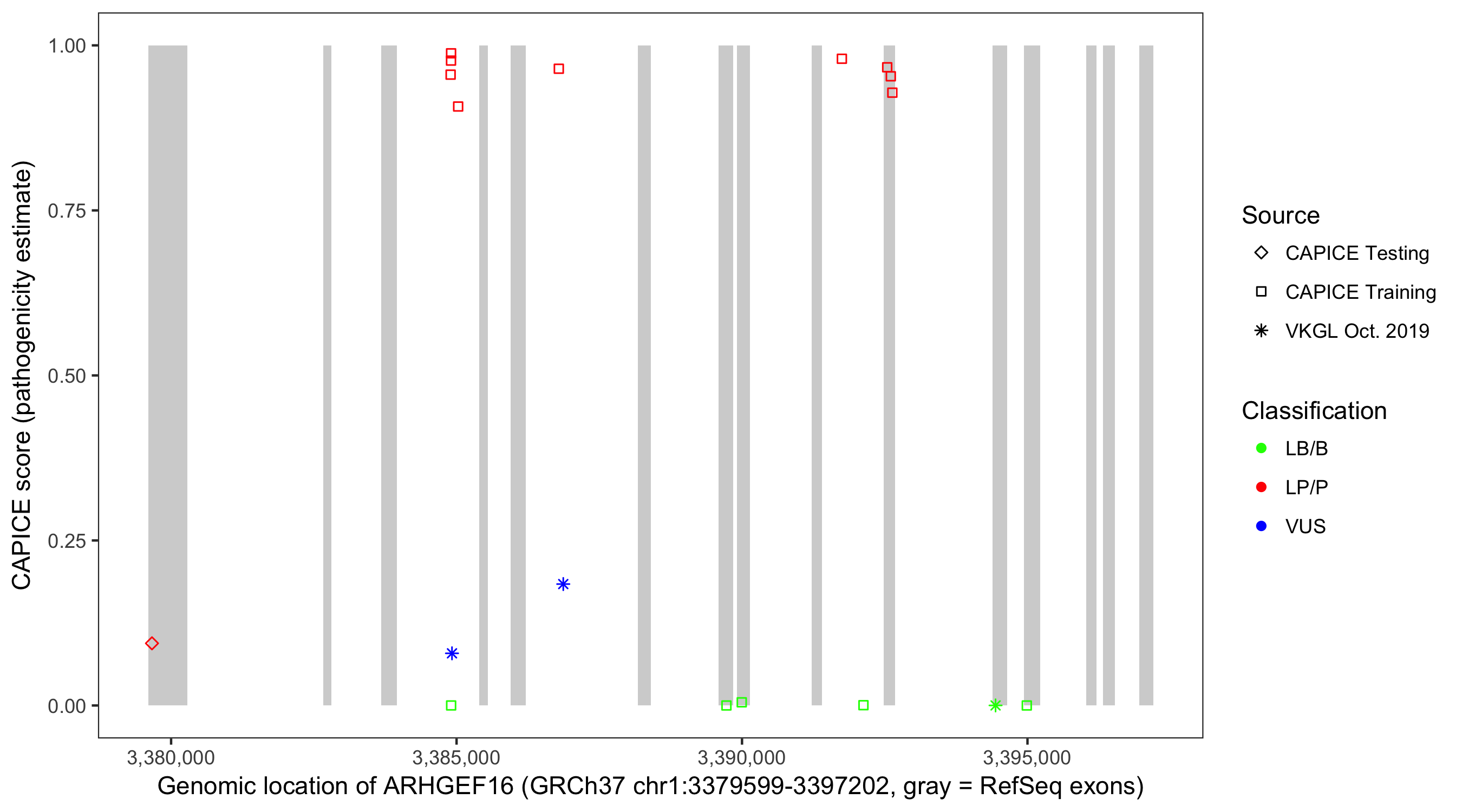 Shown are CAPICE train/test variants plus VKGL Oct 2019.