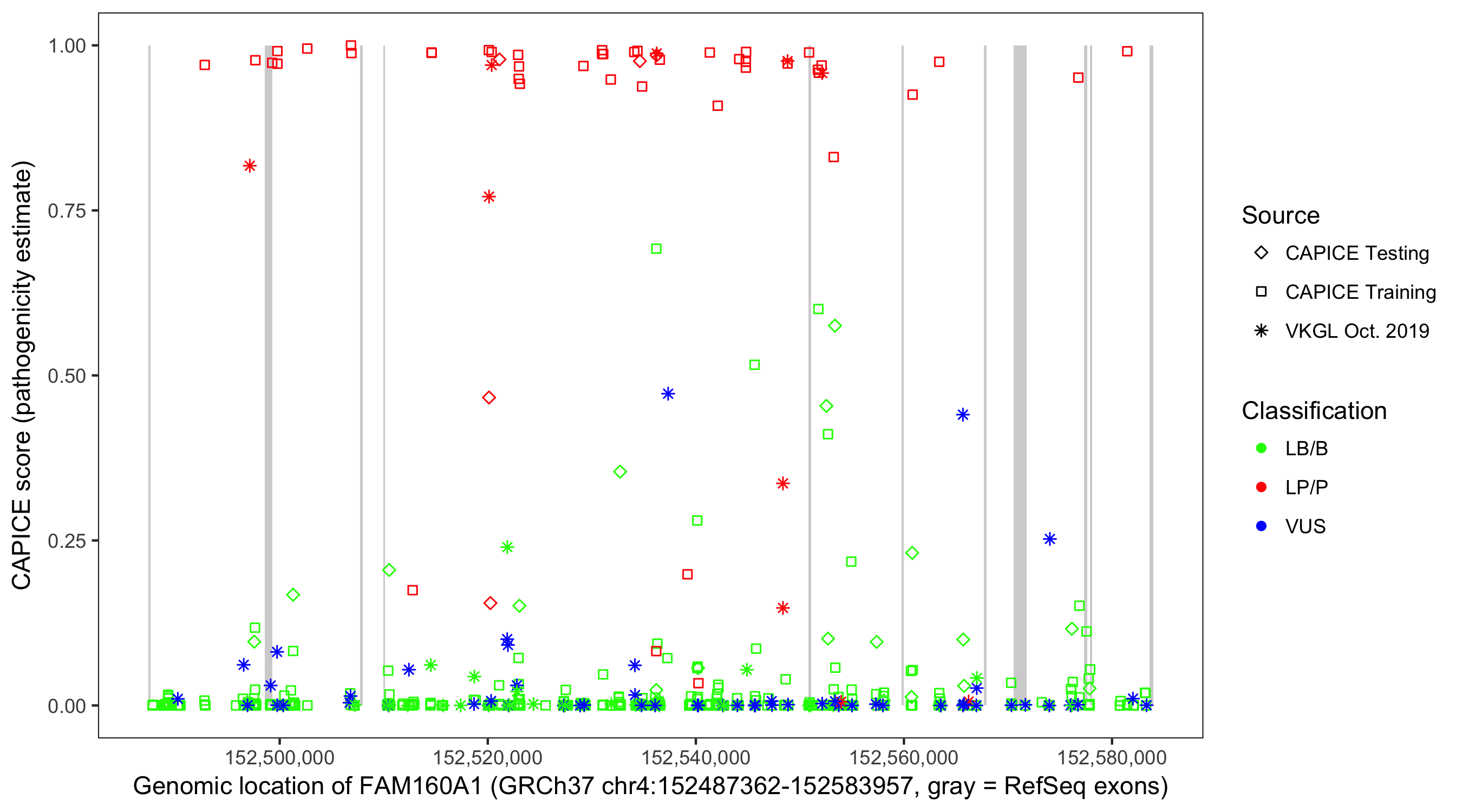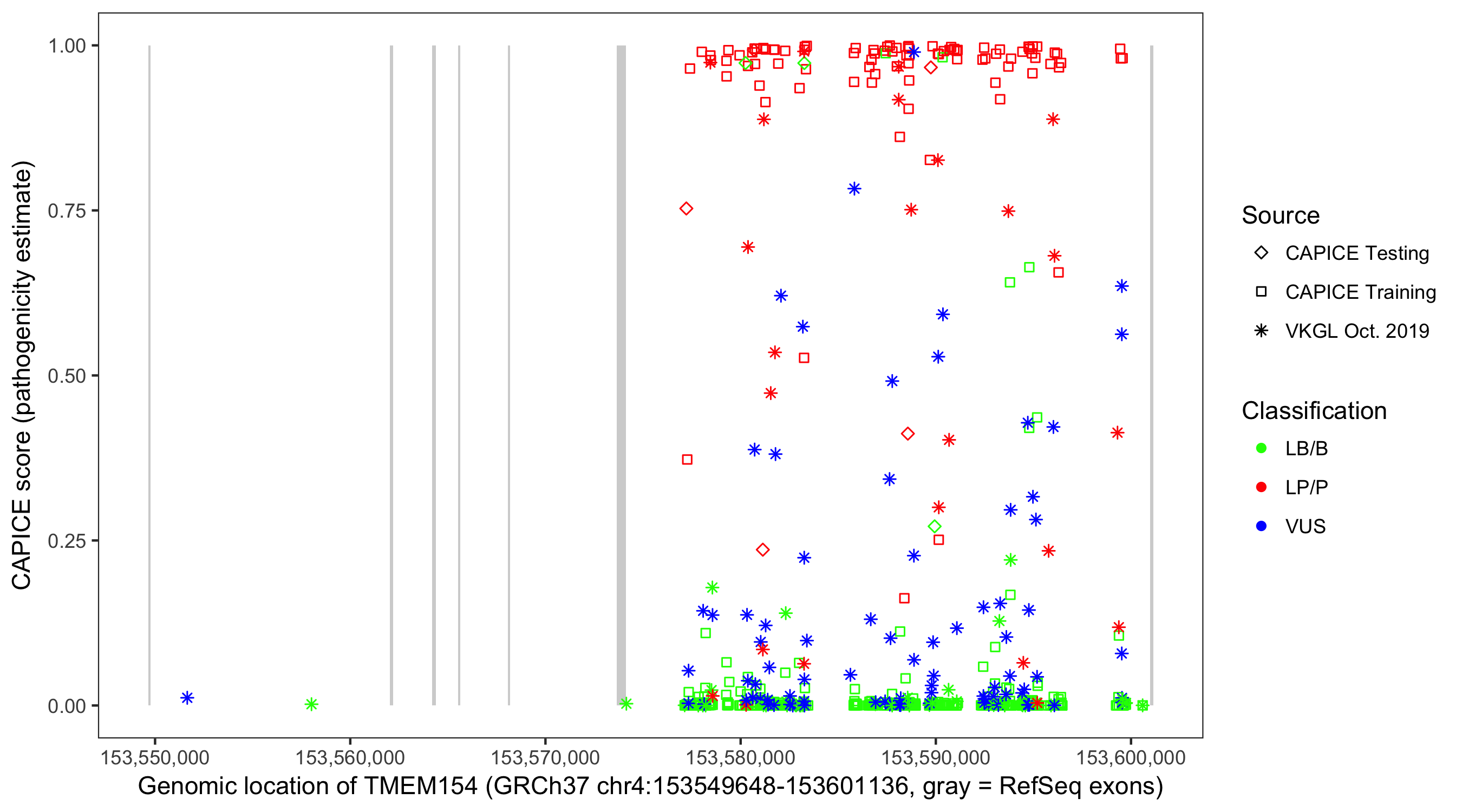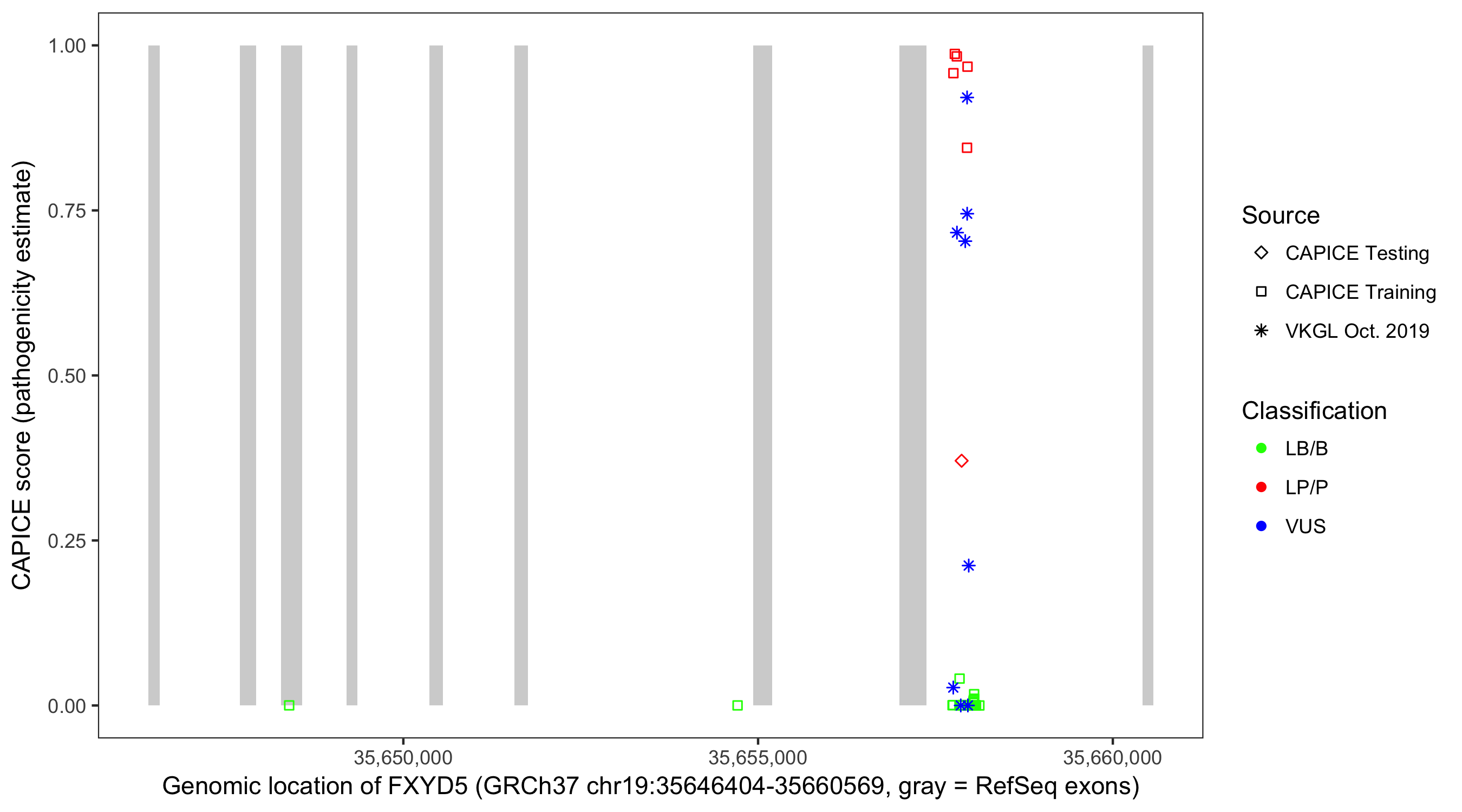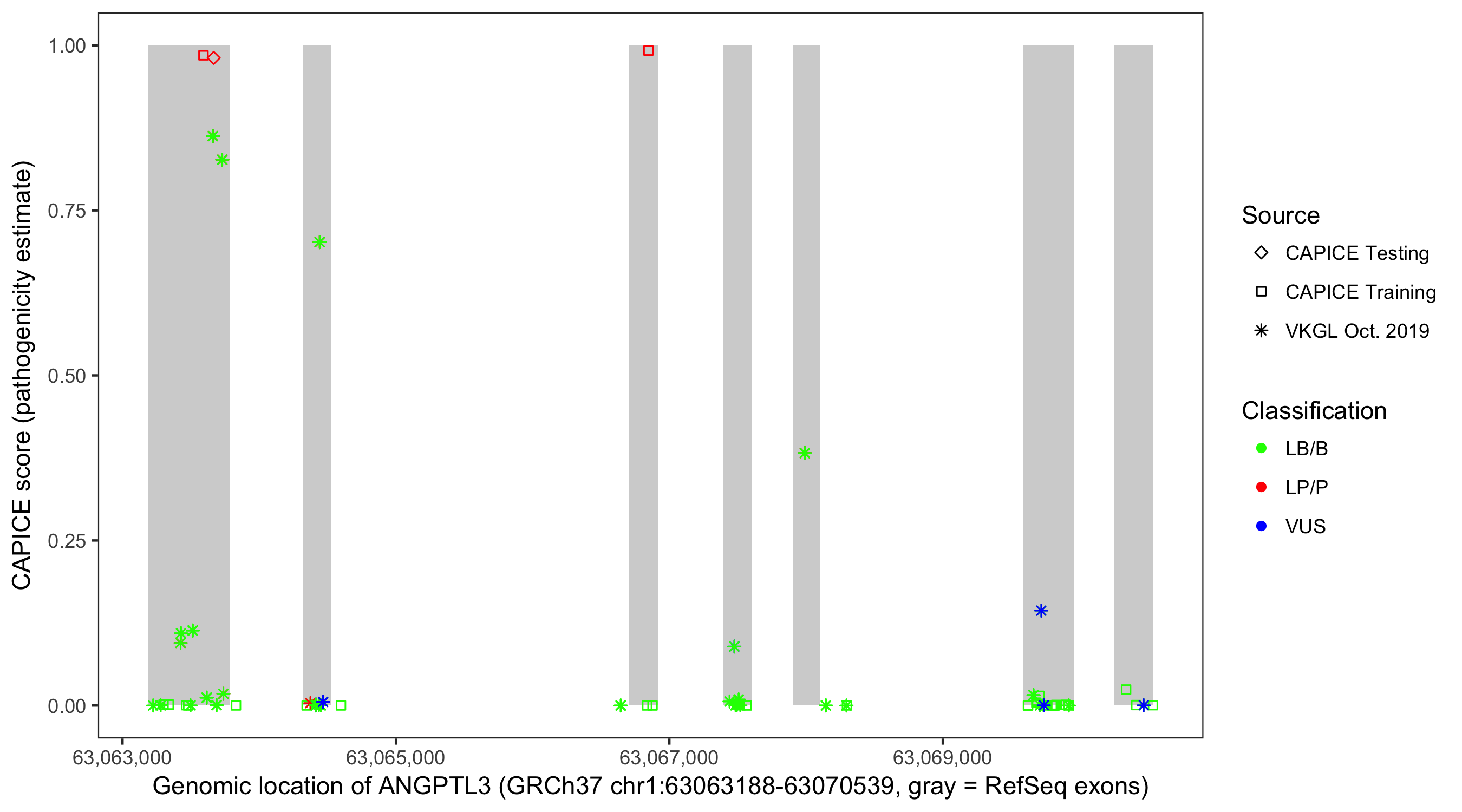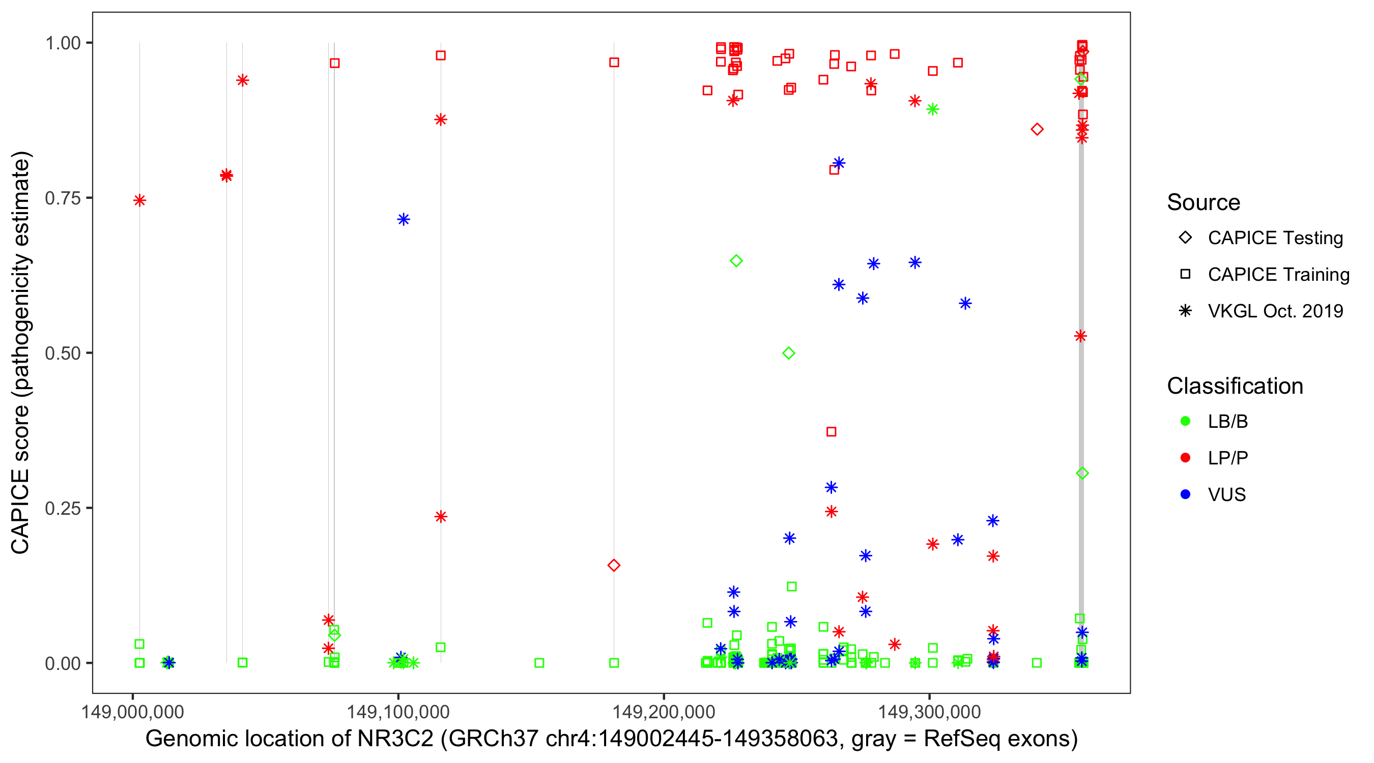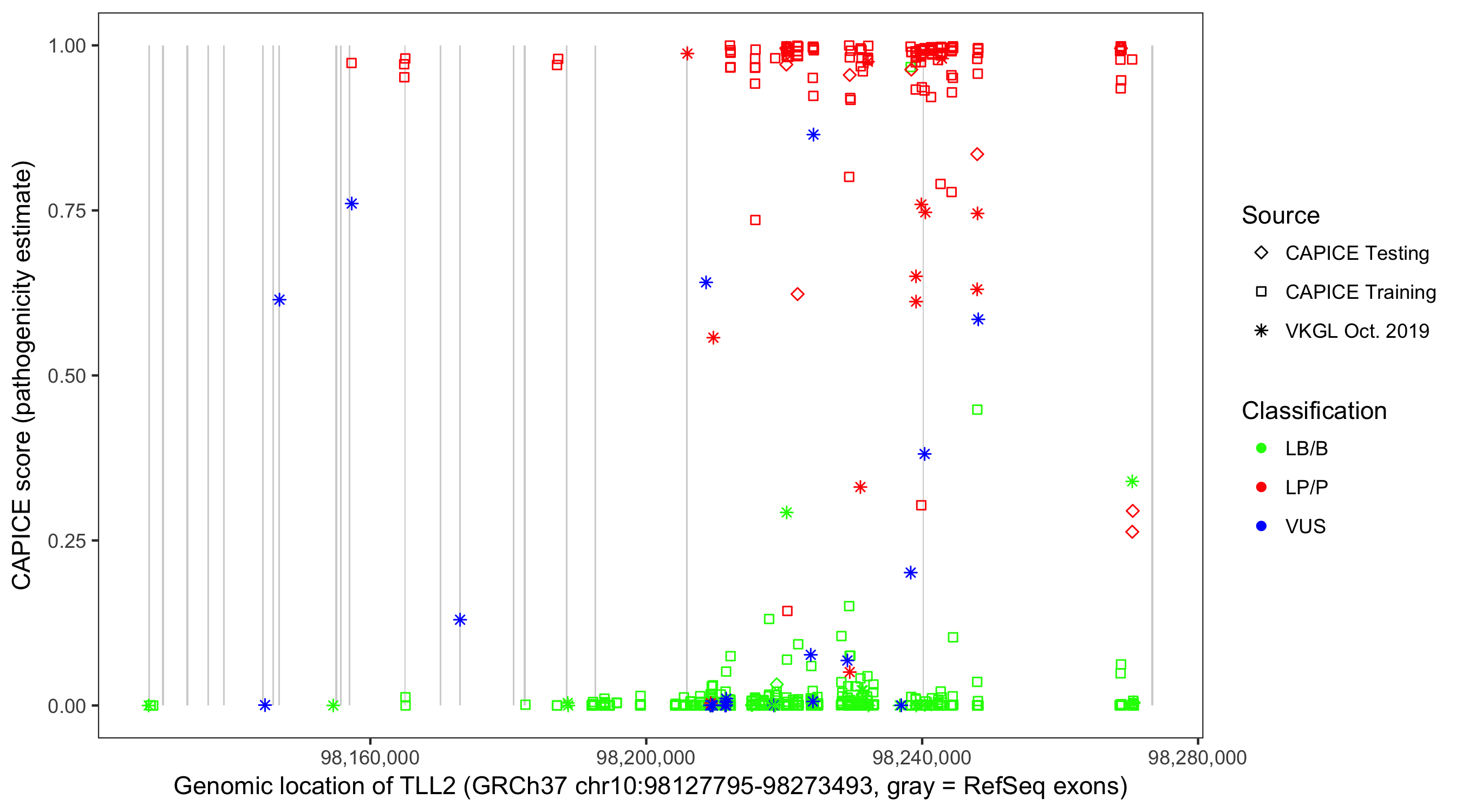 Shown are CAPICE train/test variants plus VKGL Oct 2019.