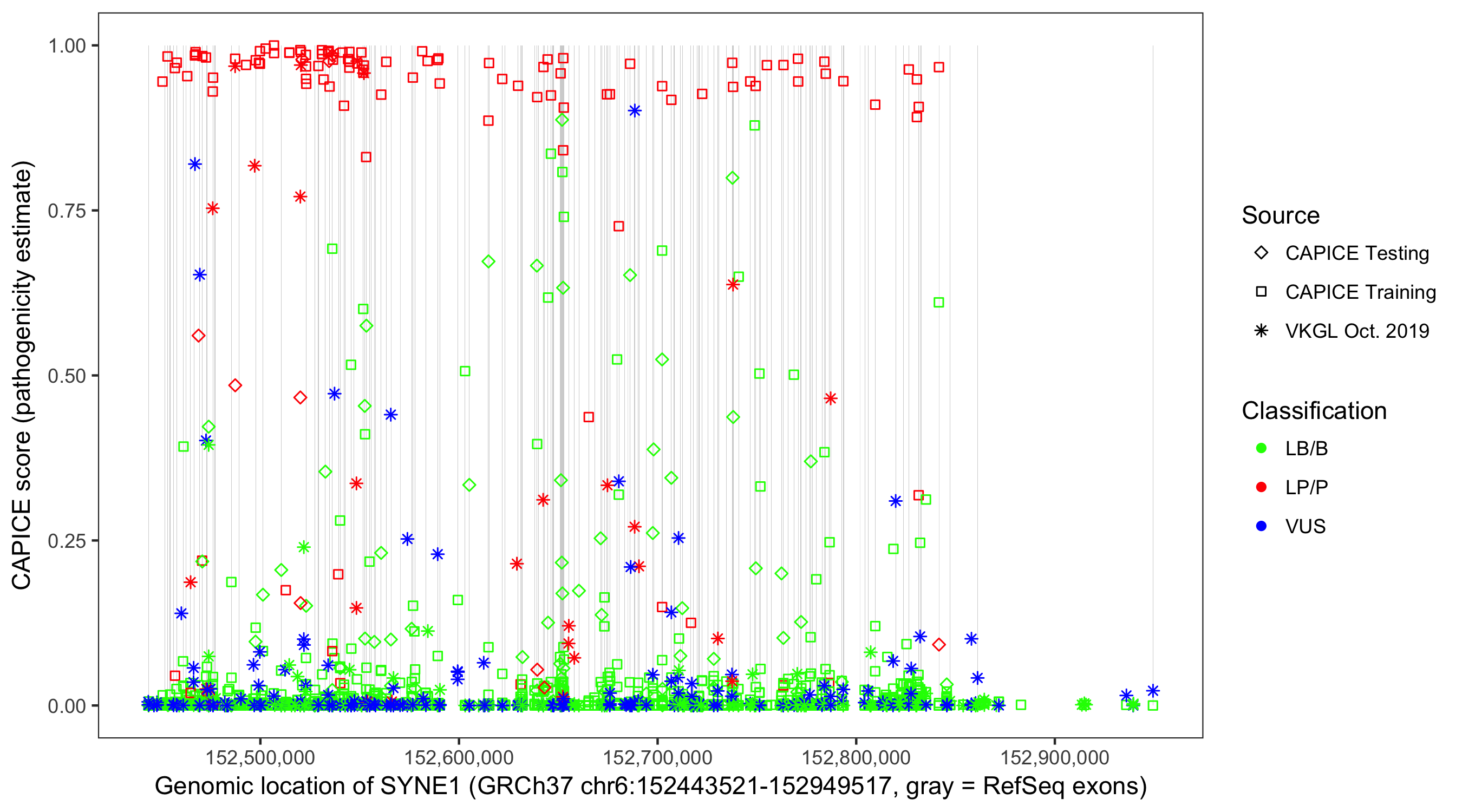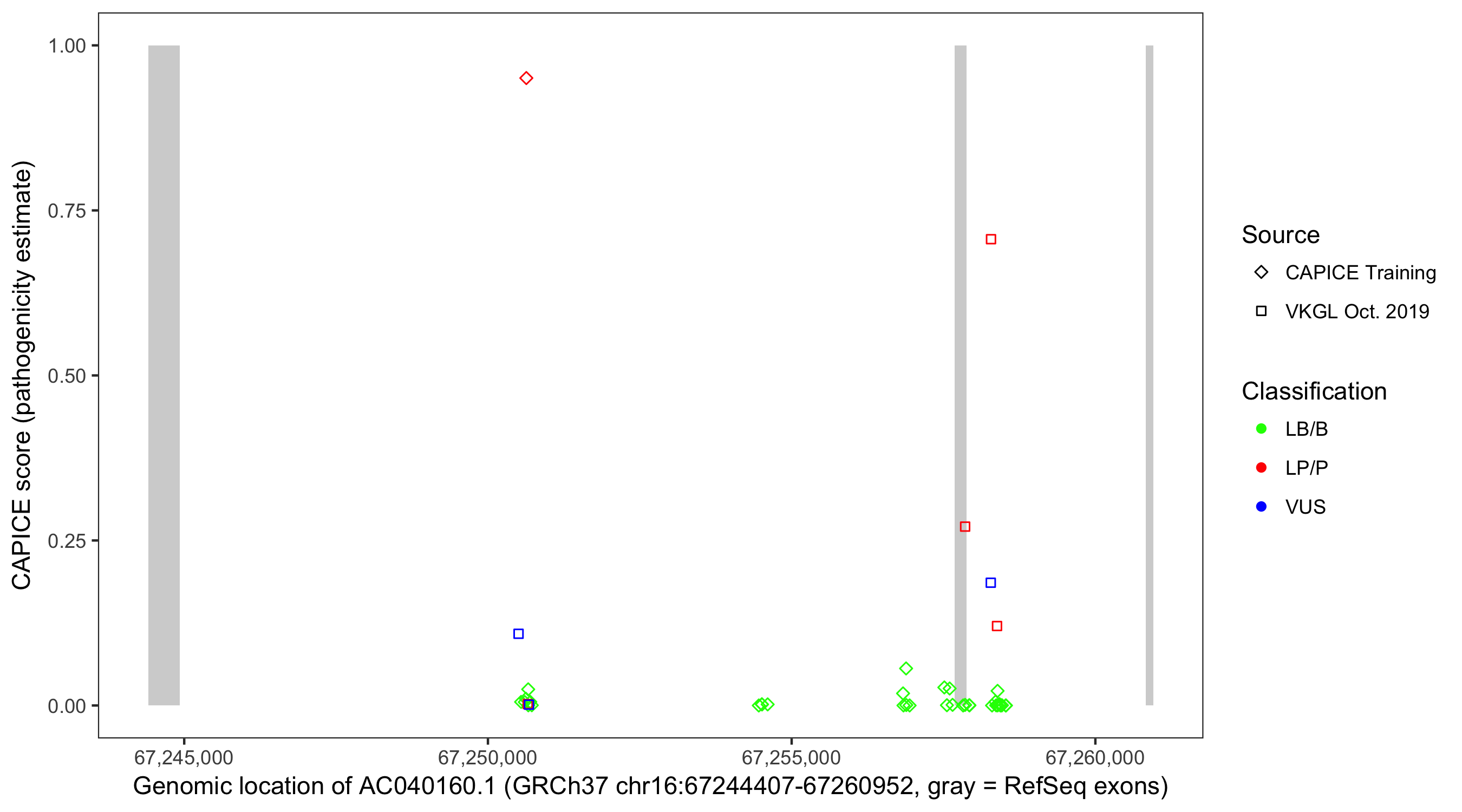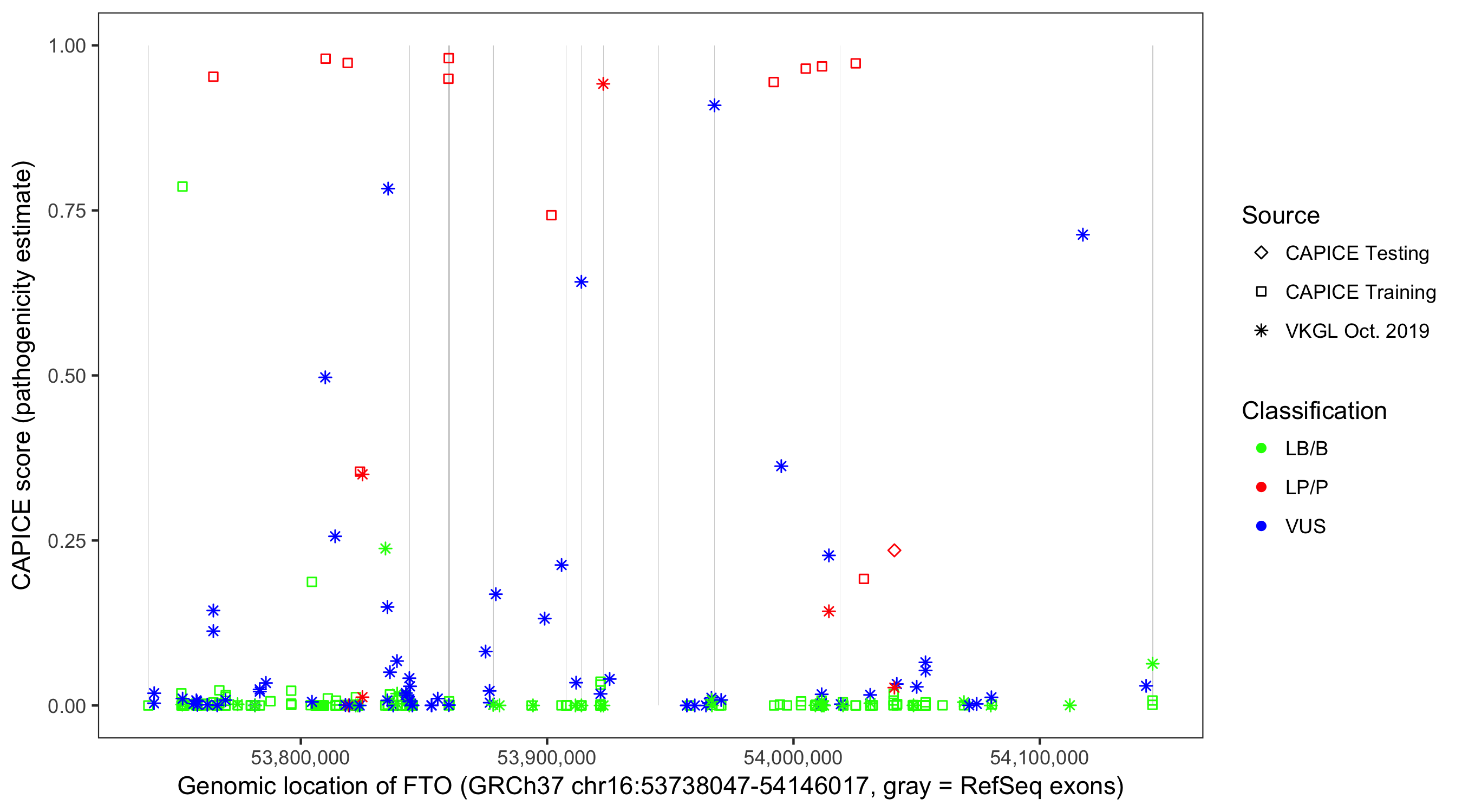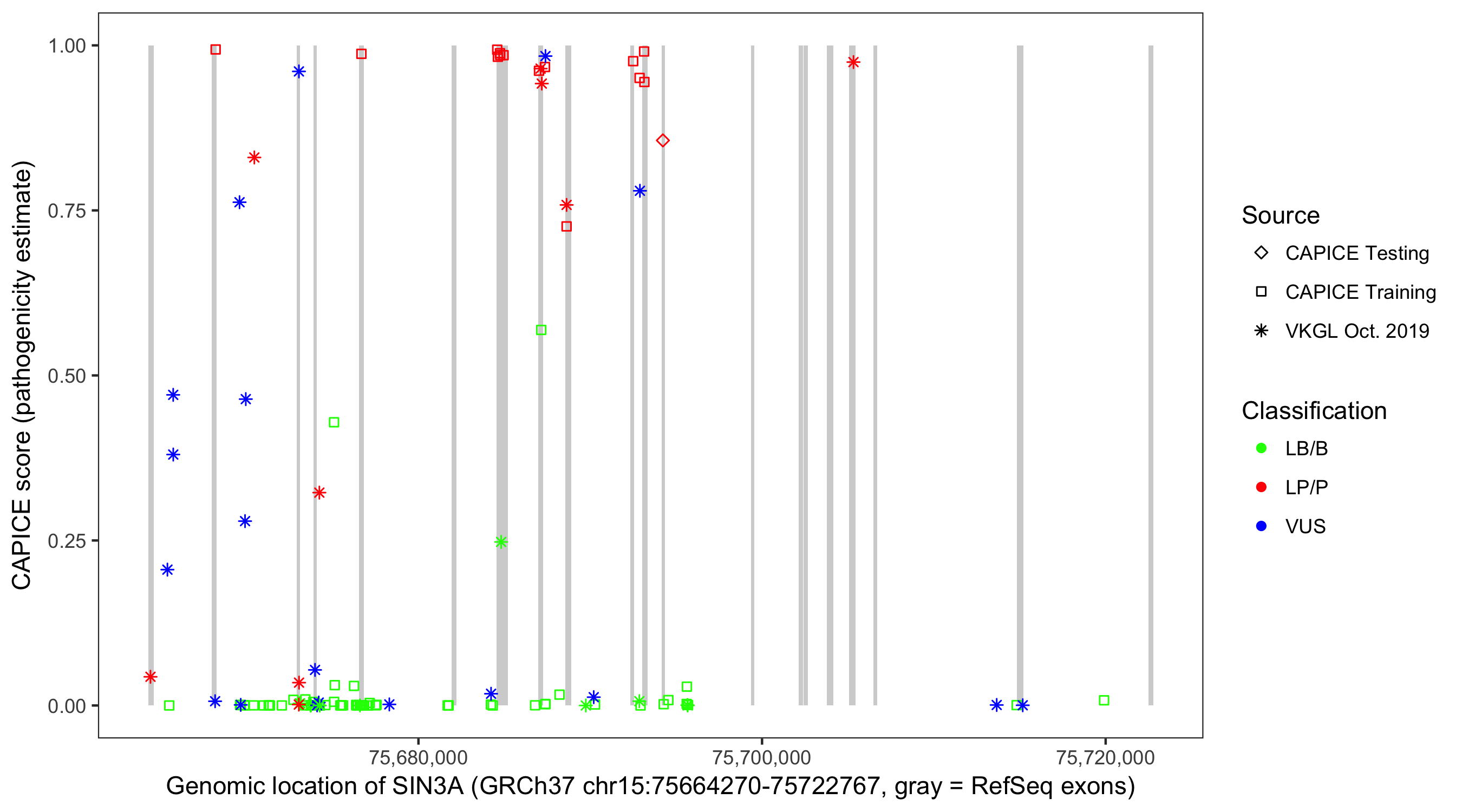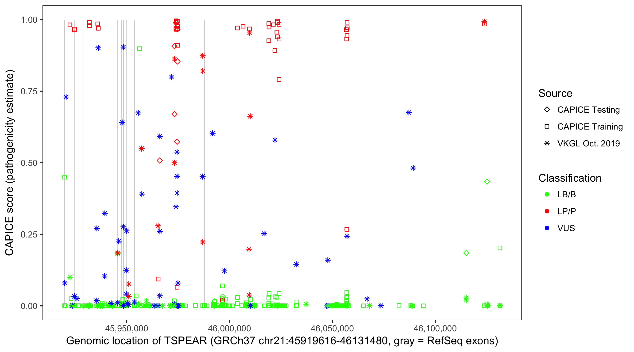 Shown are CAPICE train/test variants plus VKGL Oct 2019.