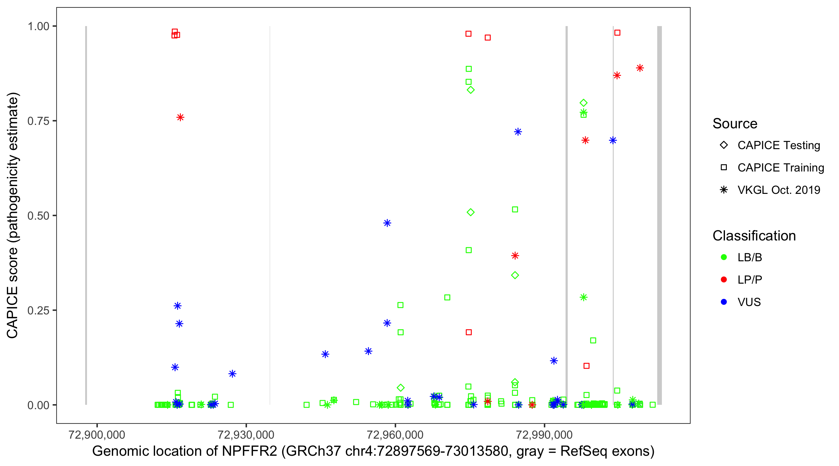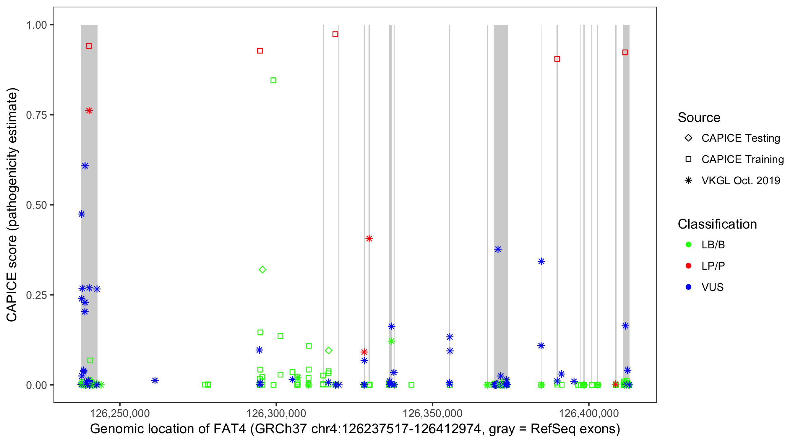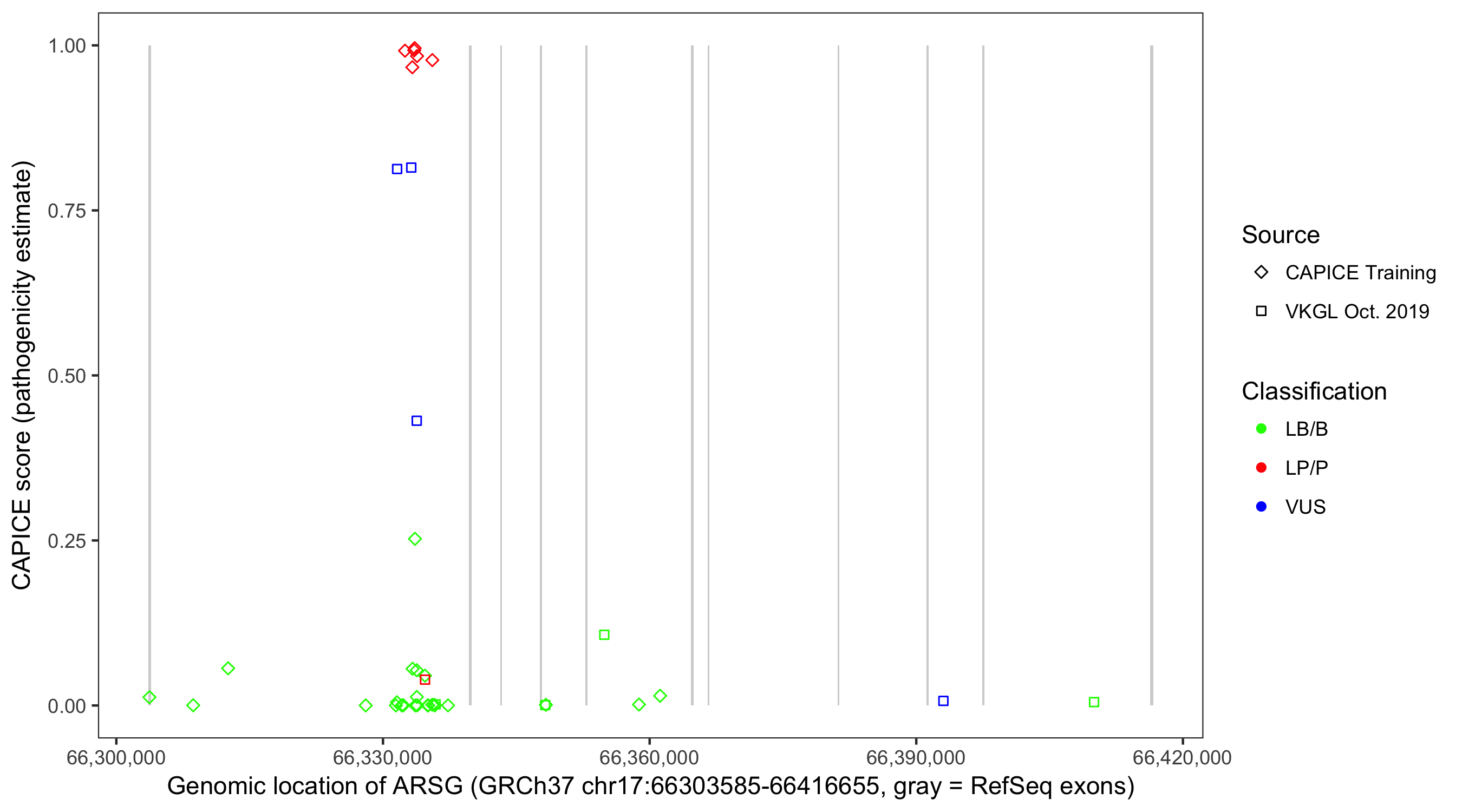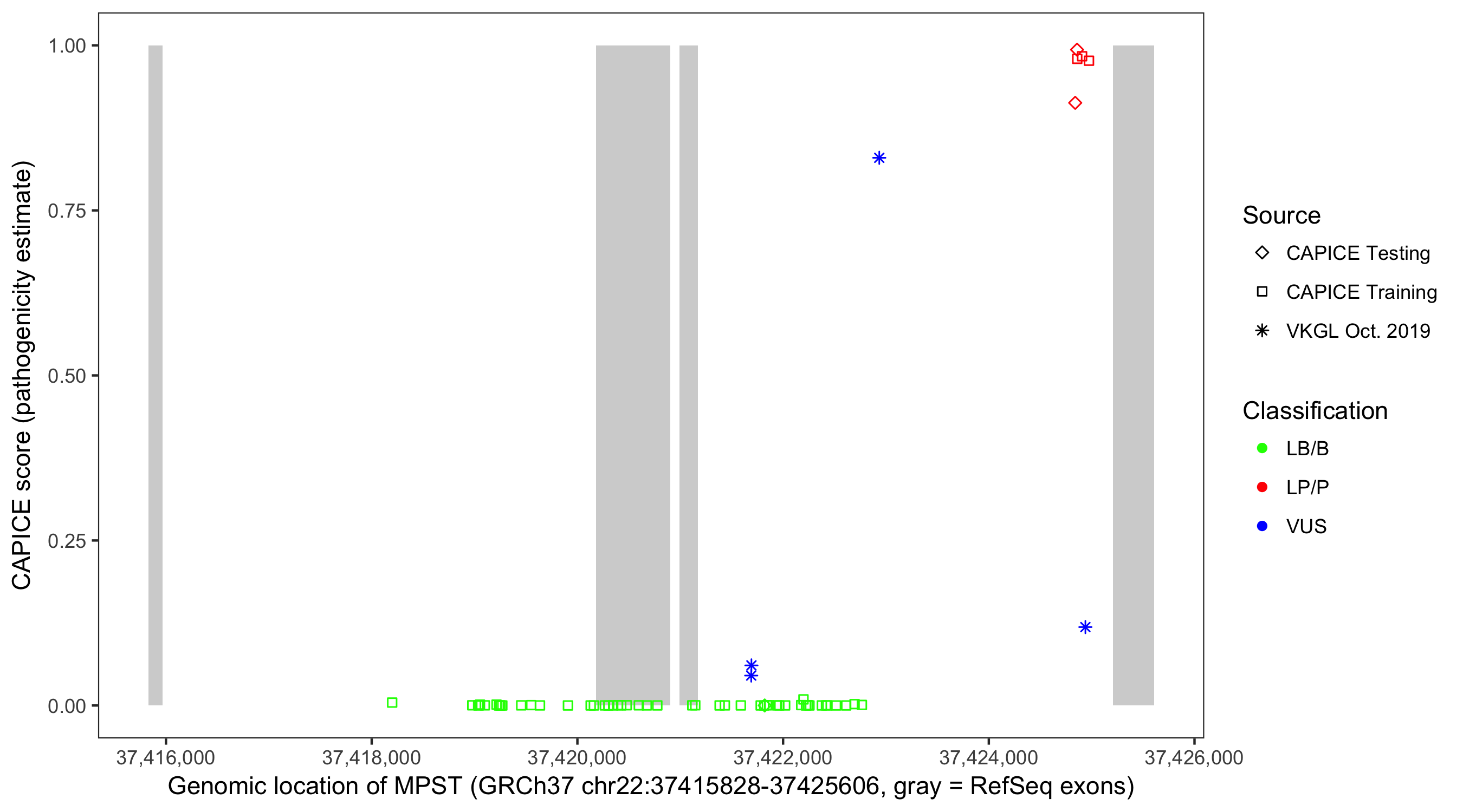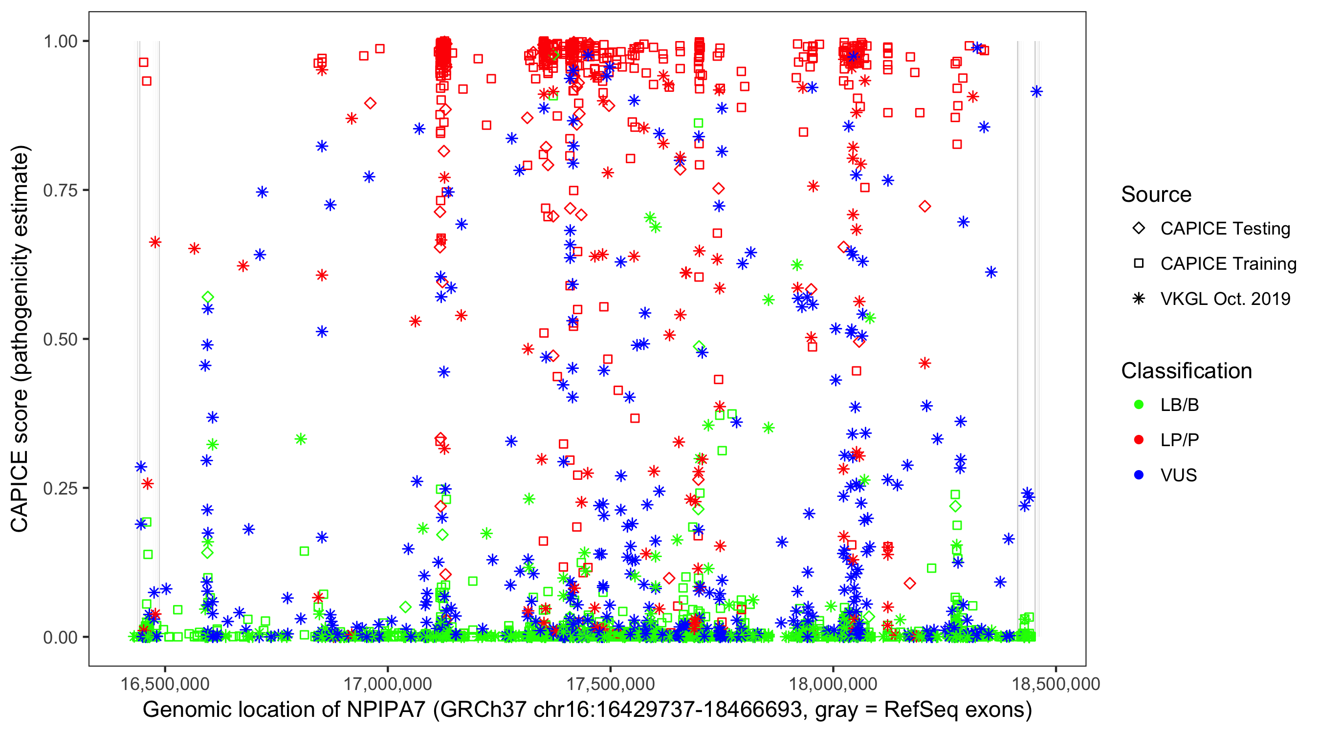 Shown are CAPICE train/test variants plus VKGL Oct 2019.