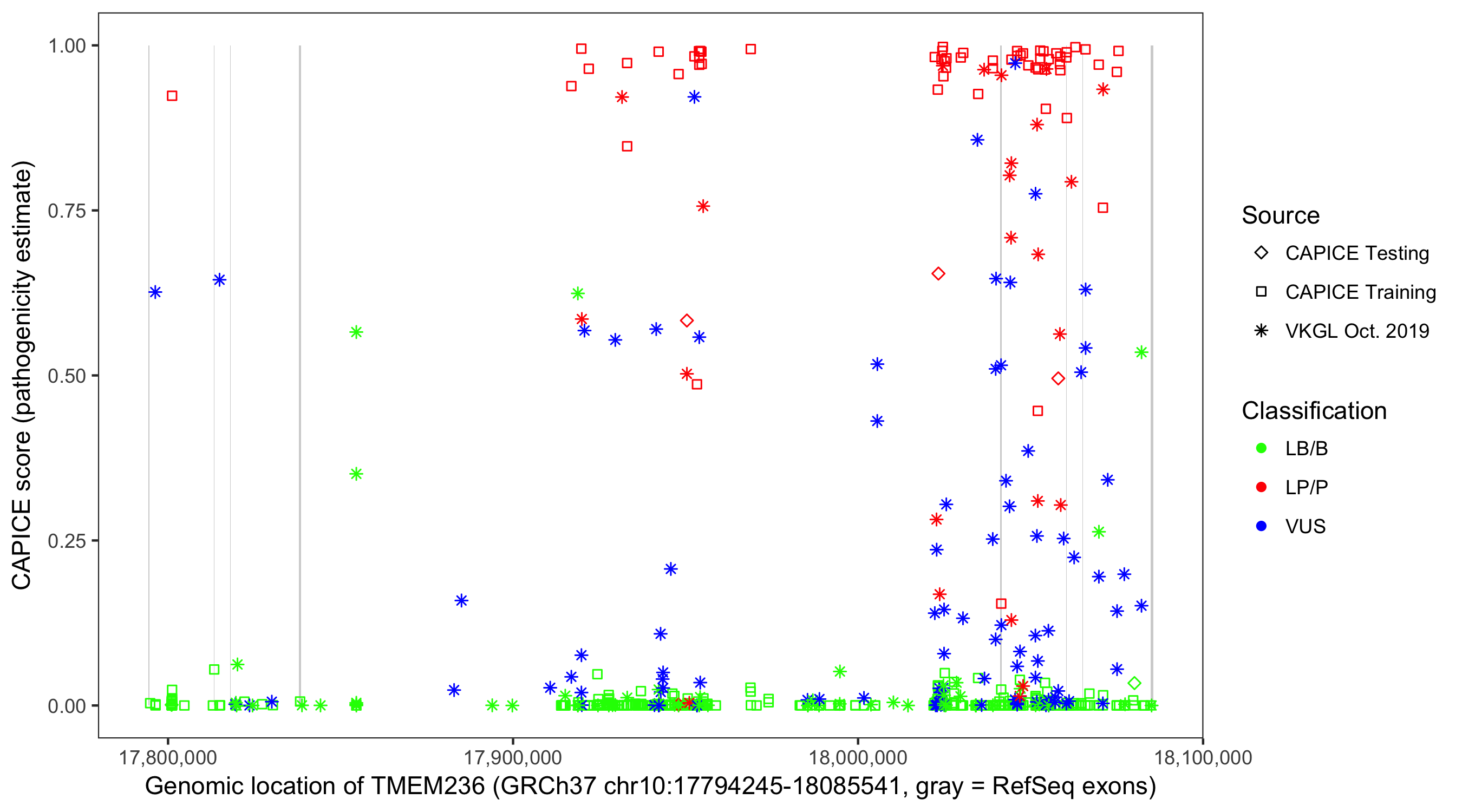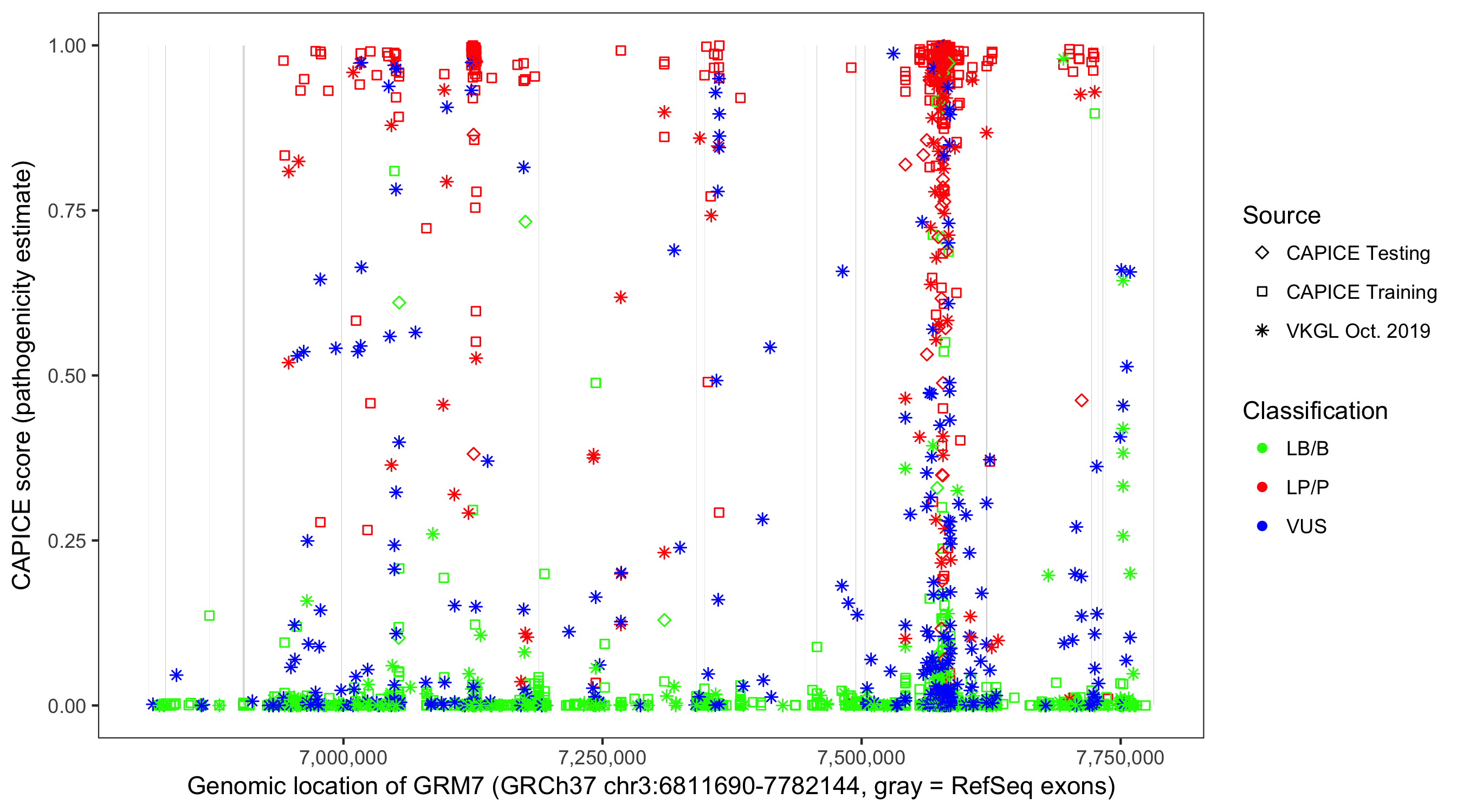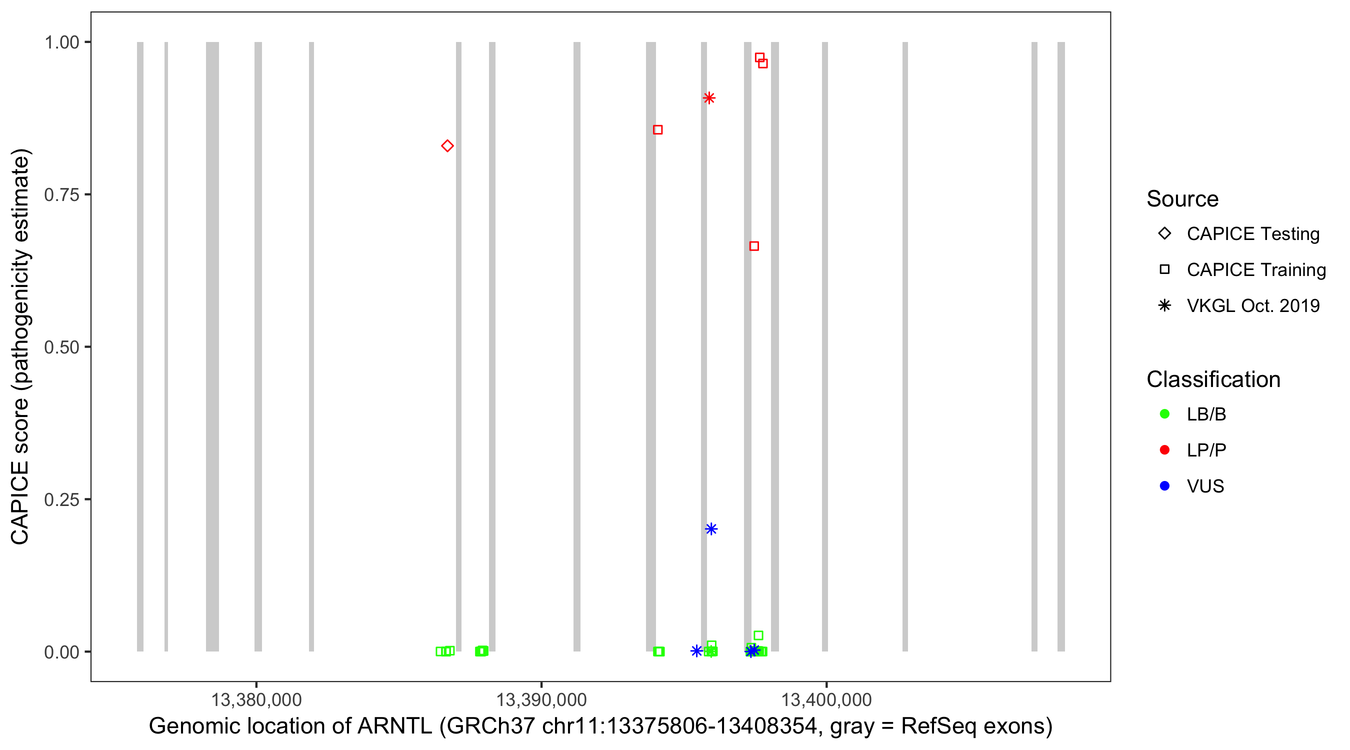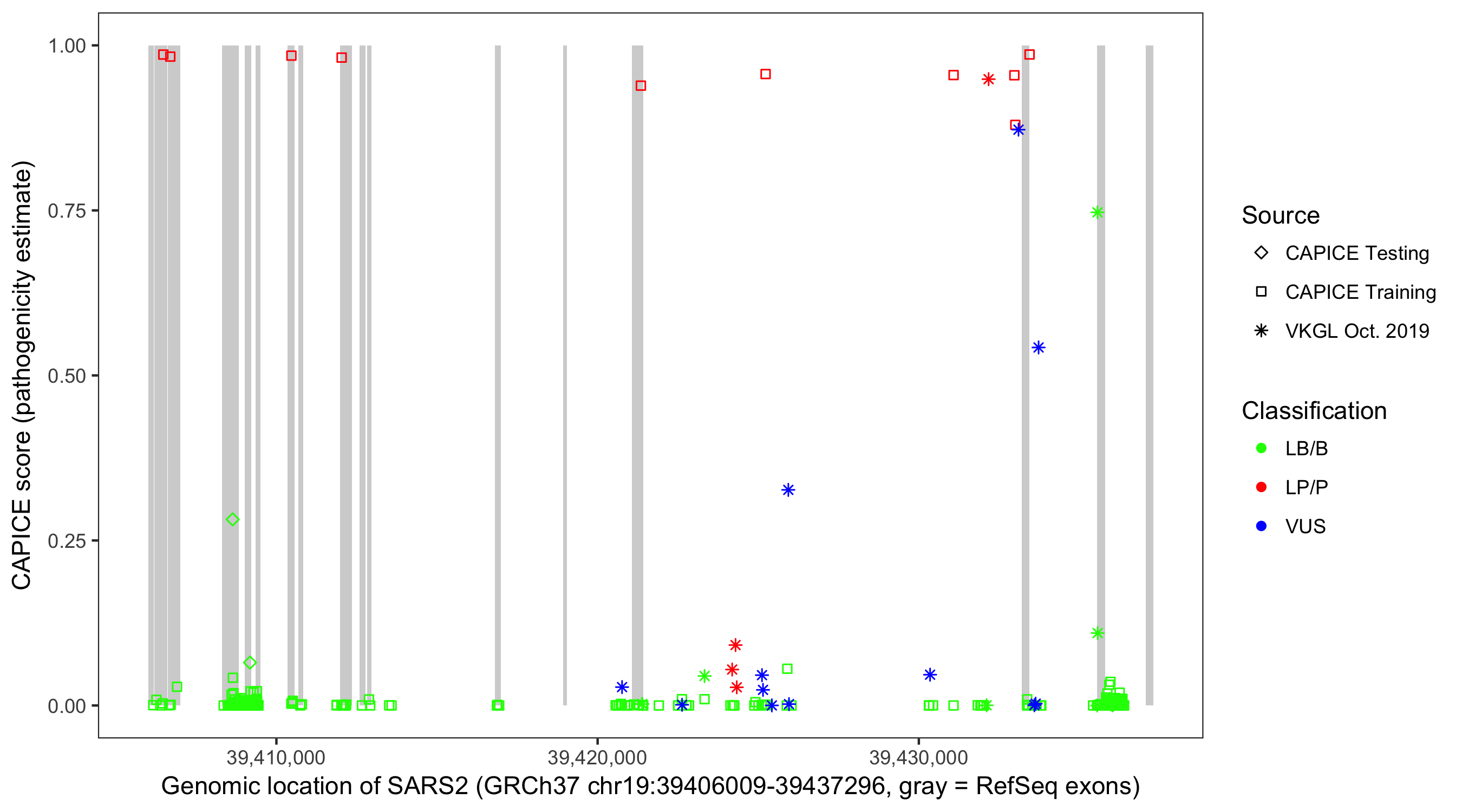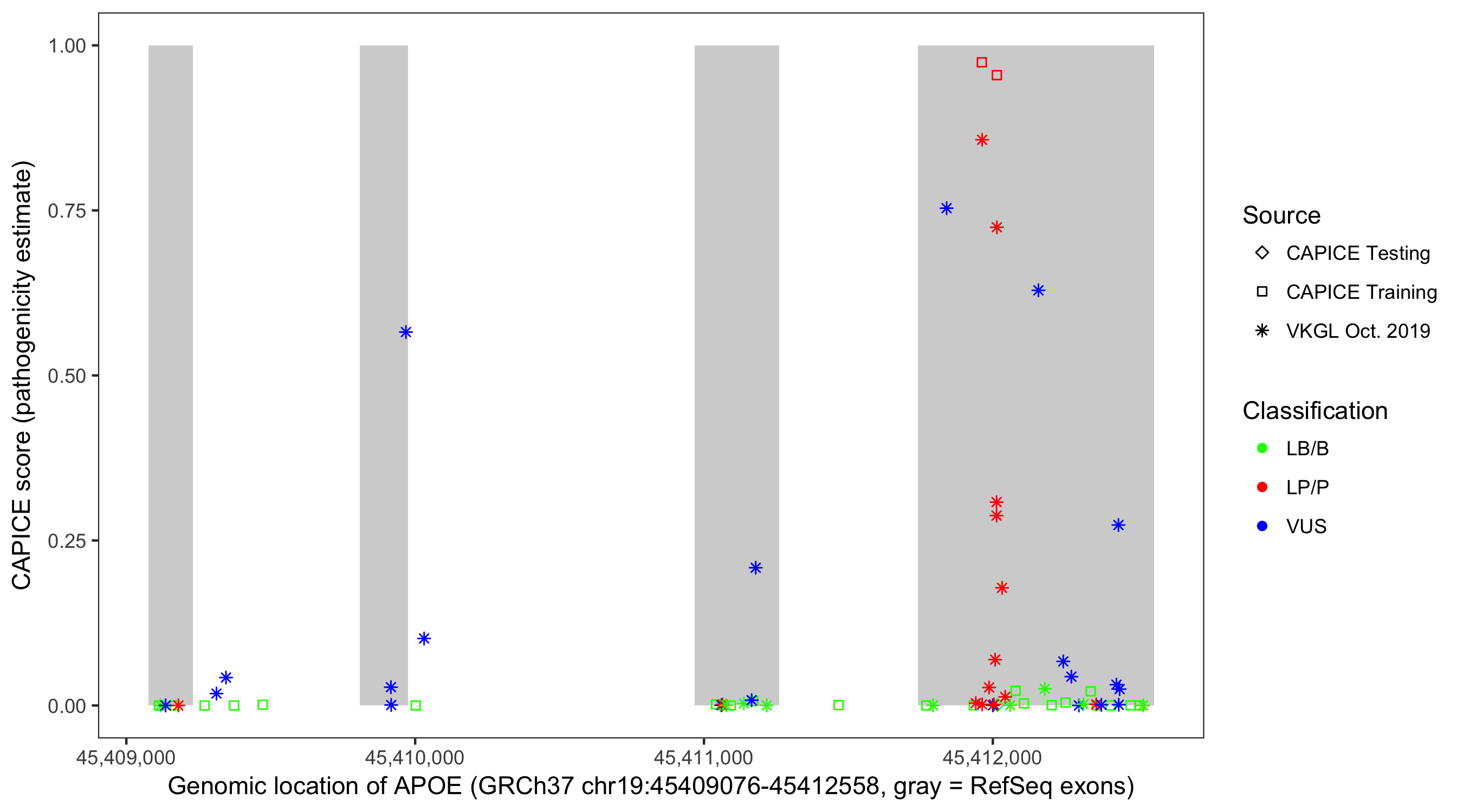 Shown are CAPICE train/test variants plus VKGL Oct 2019.