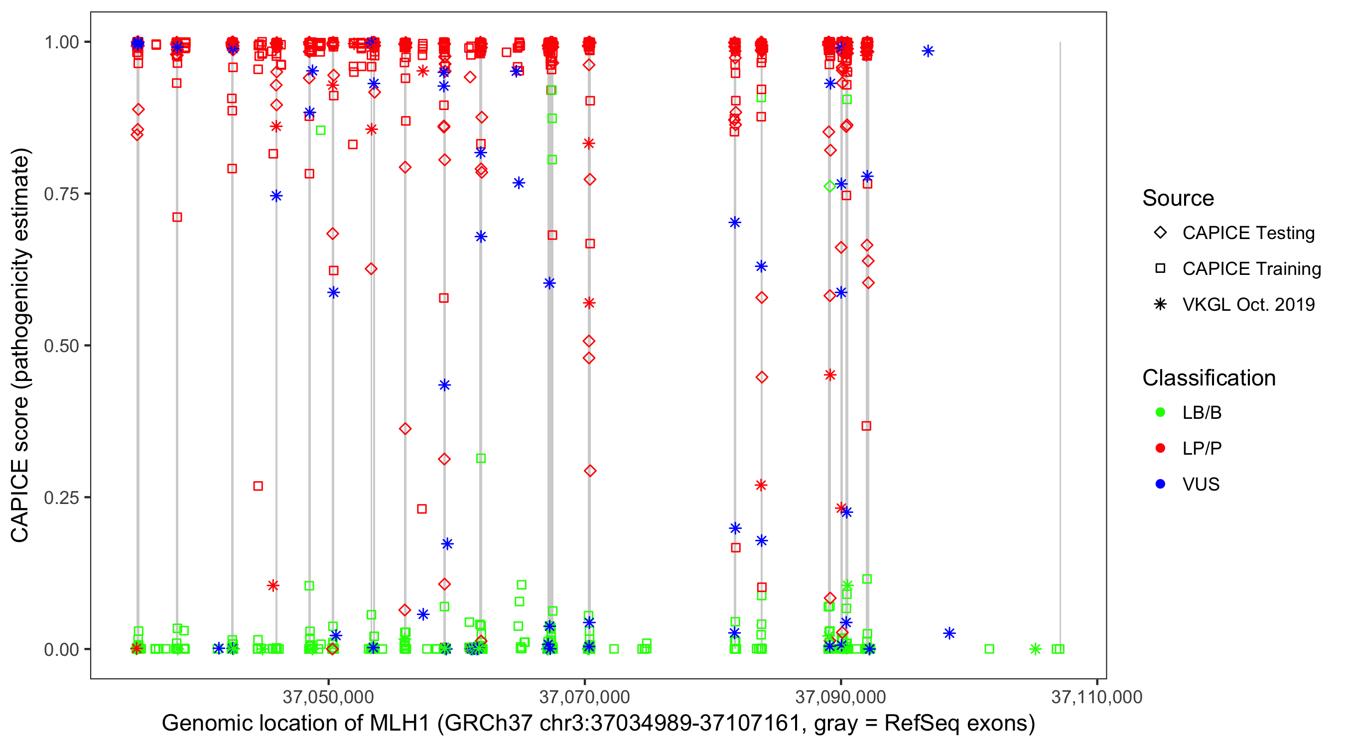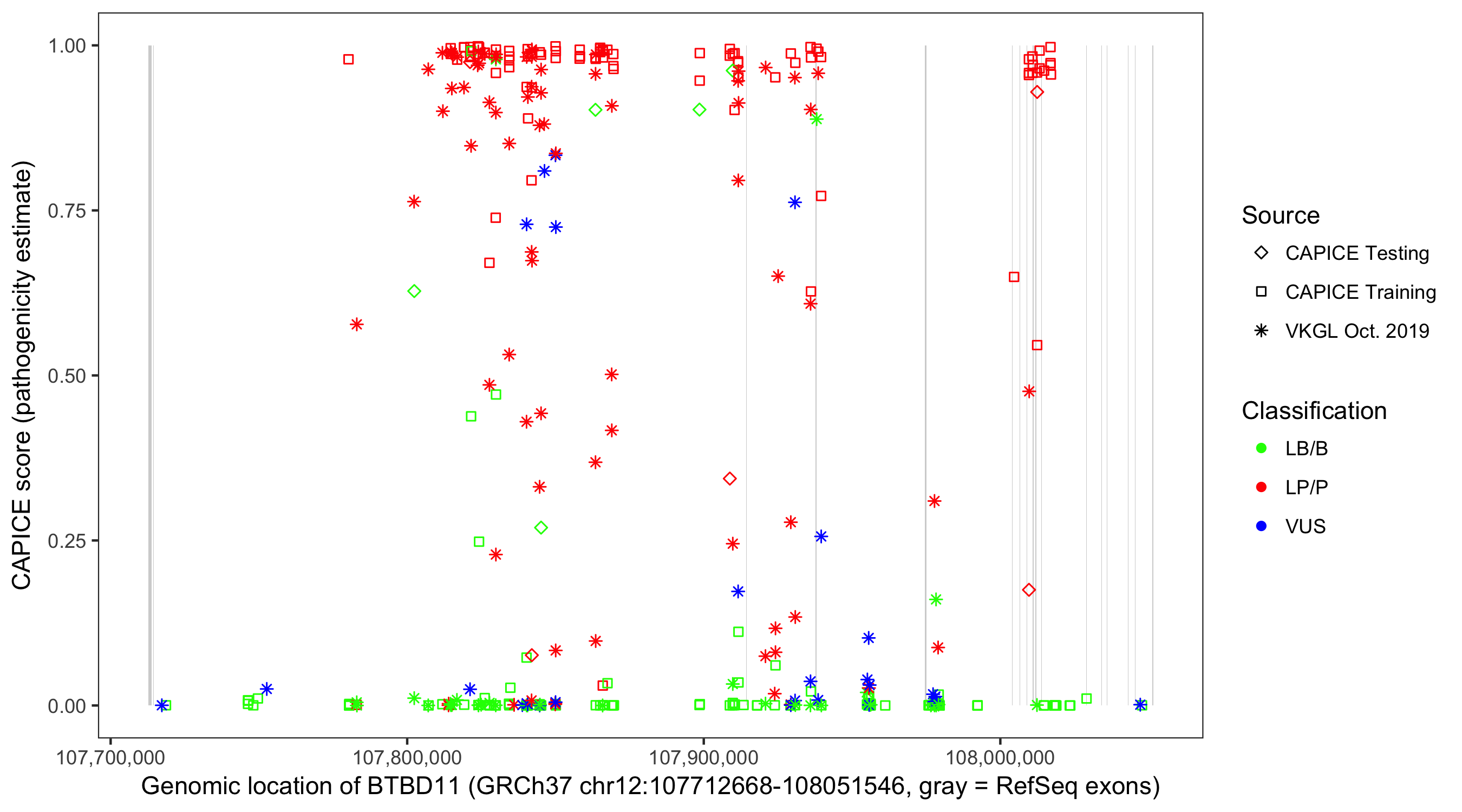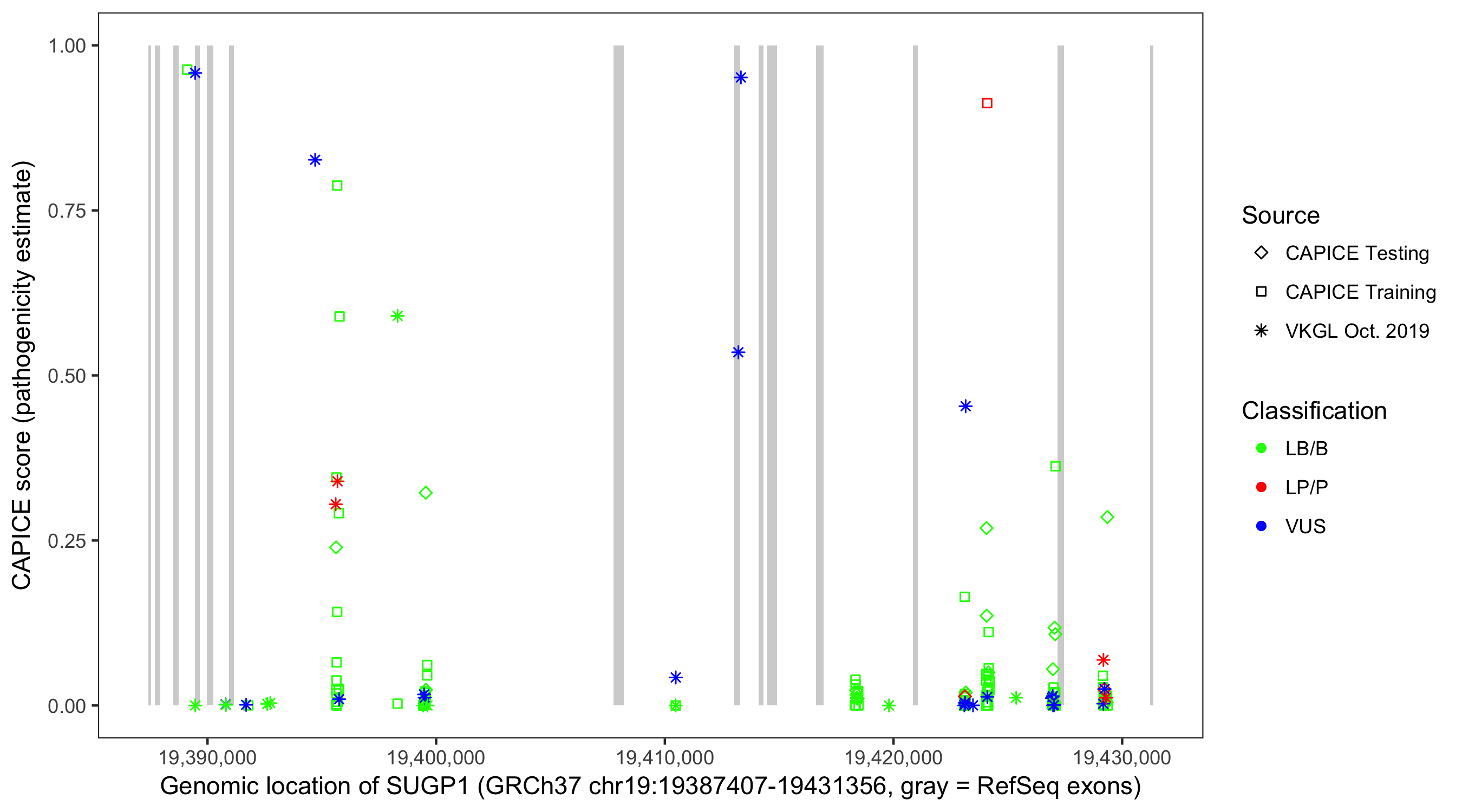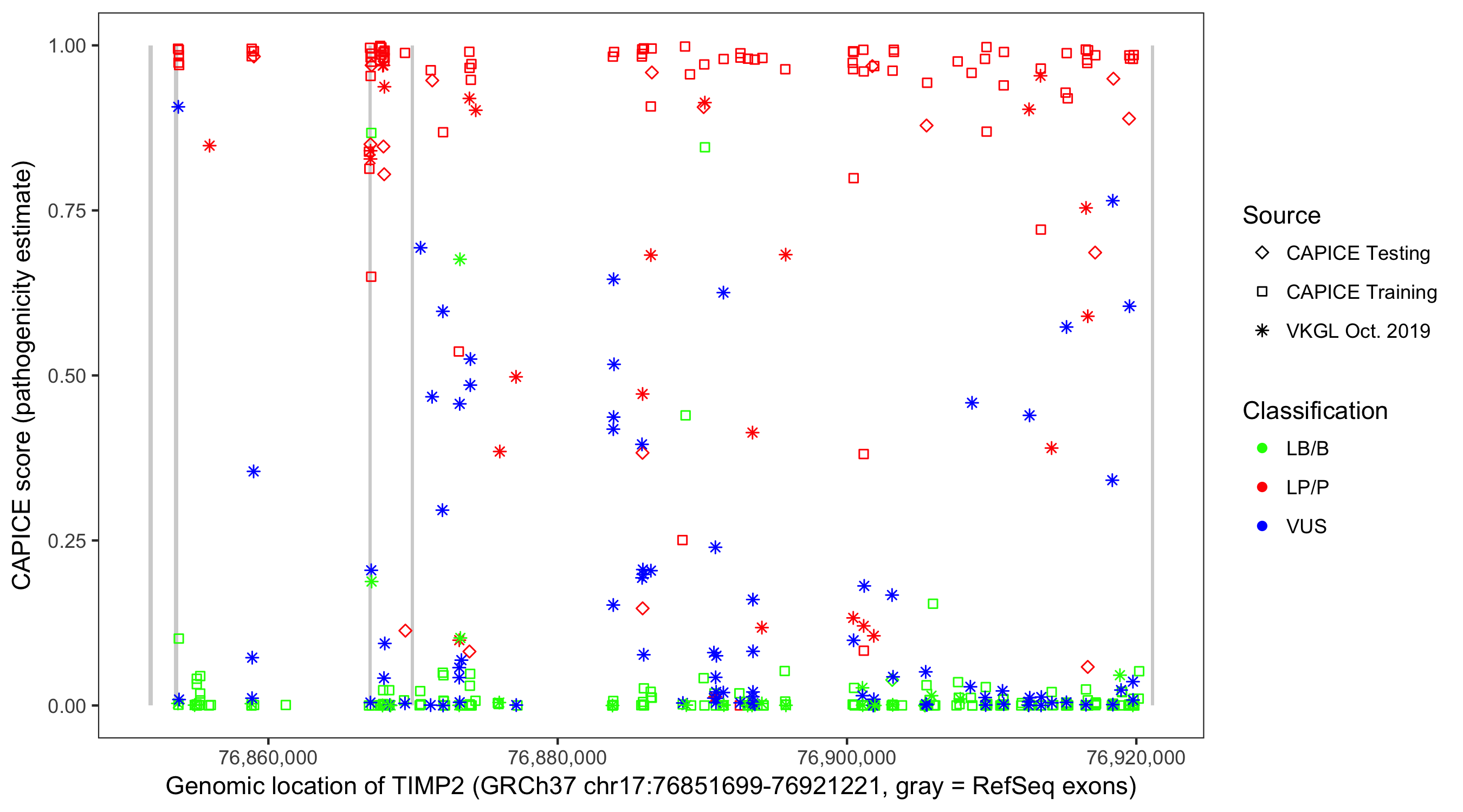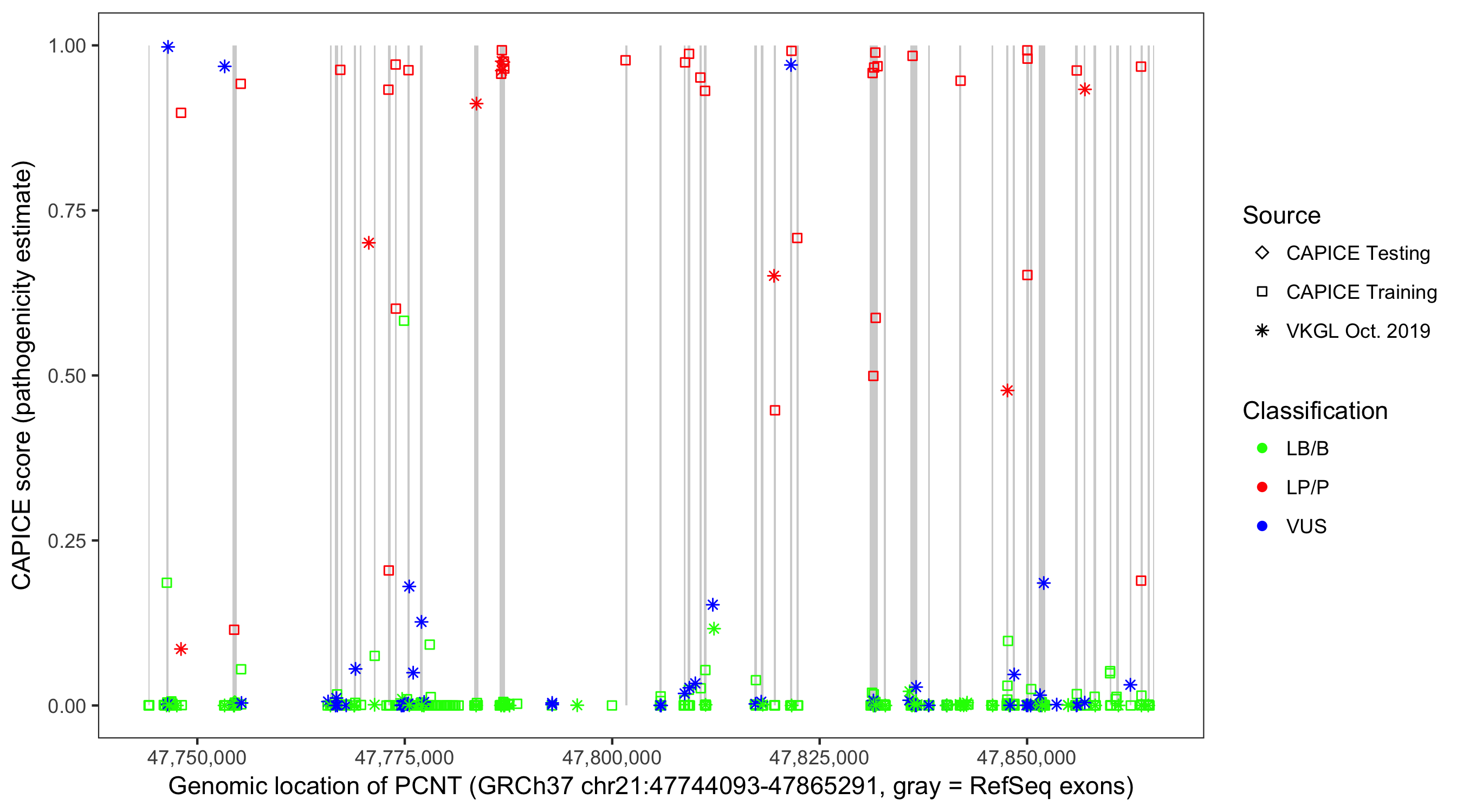 Shown are CAPICE train/test variants plus VKGL Oct 2019.