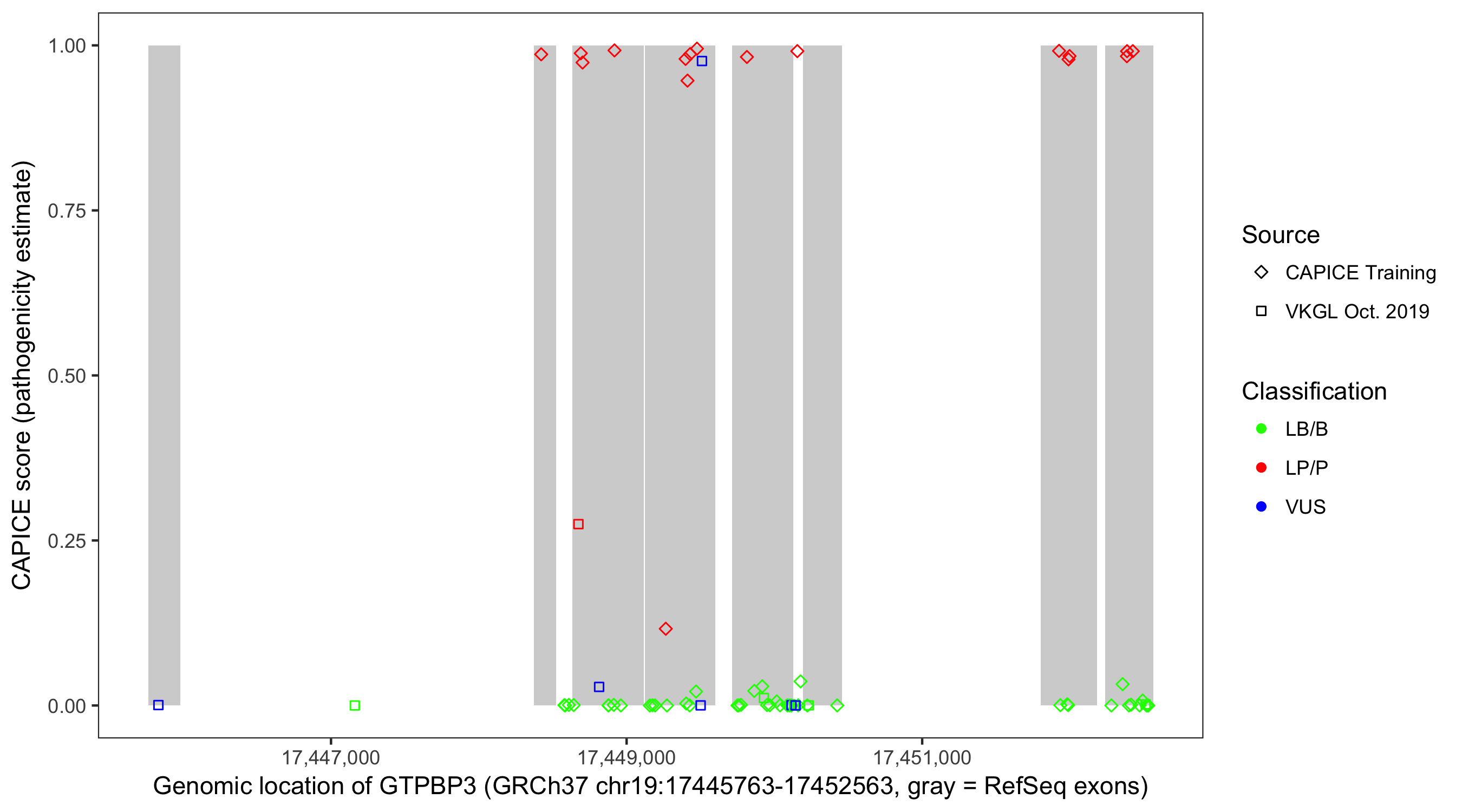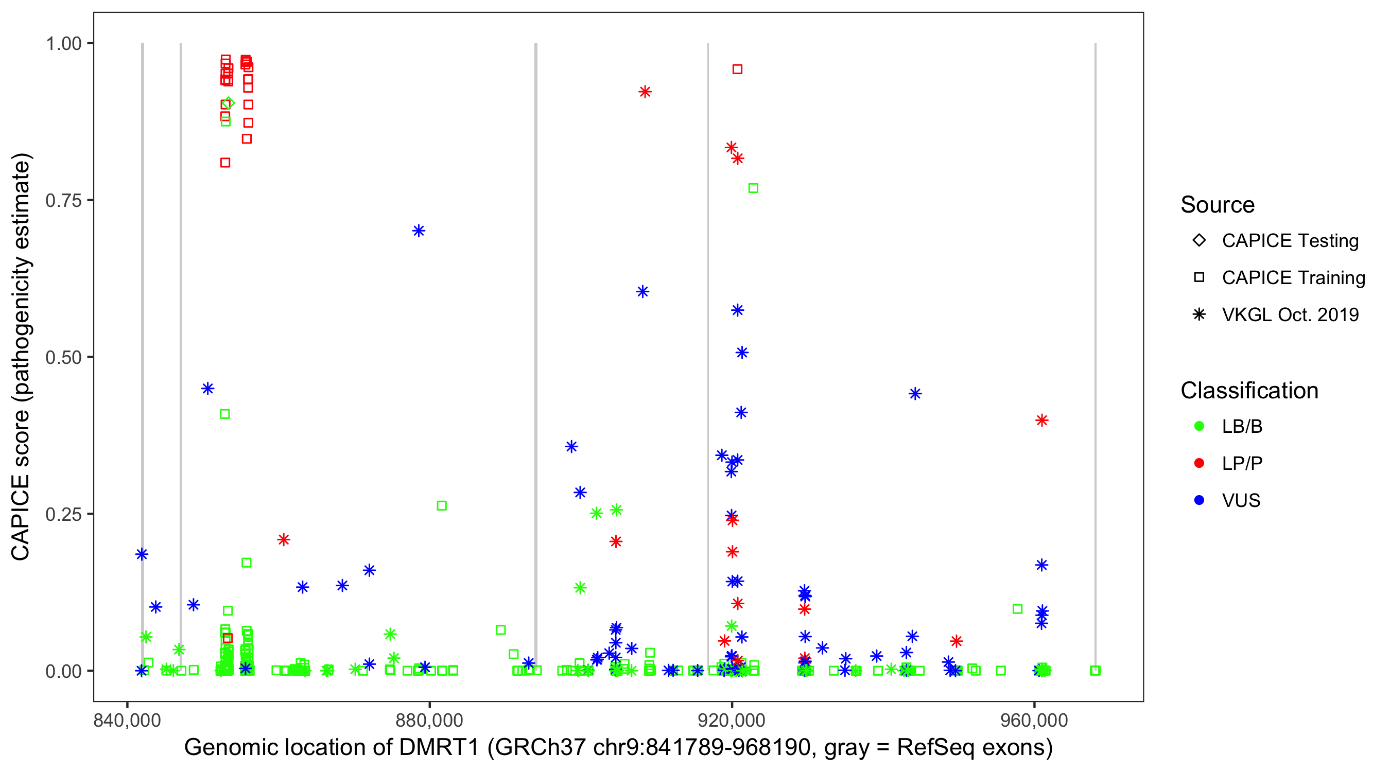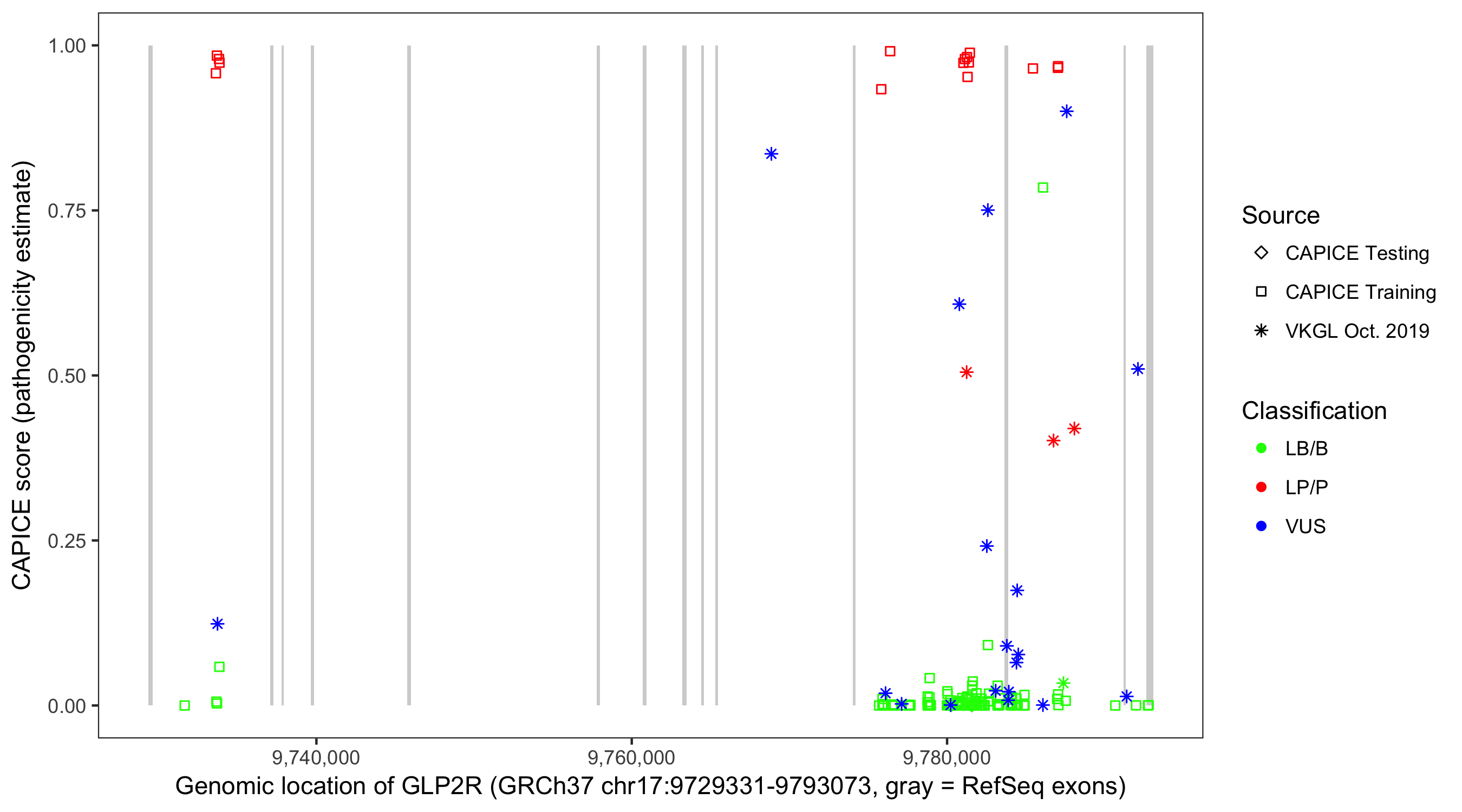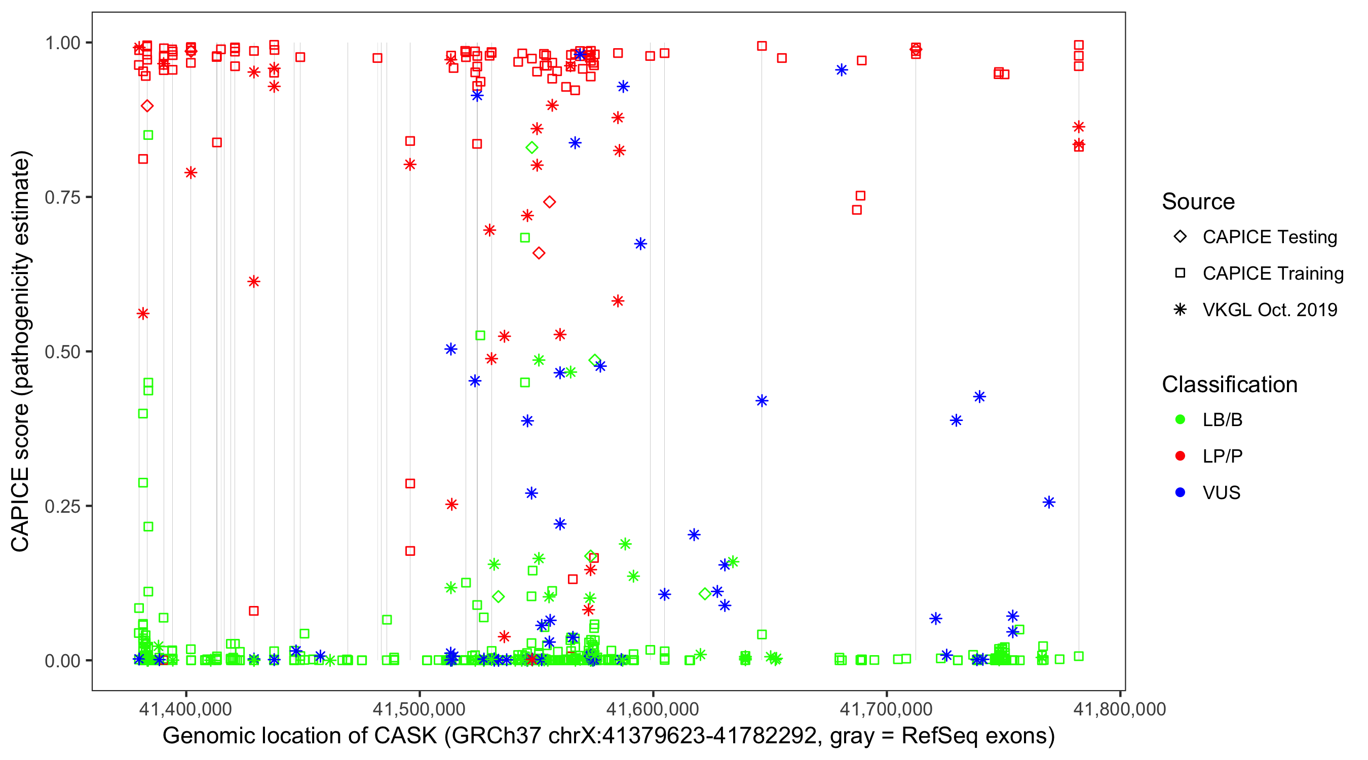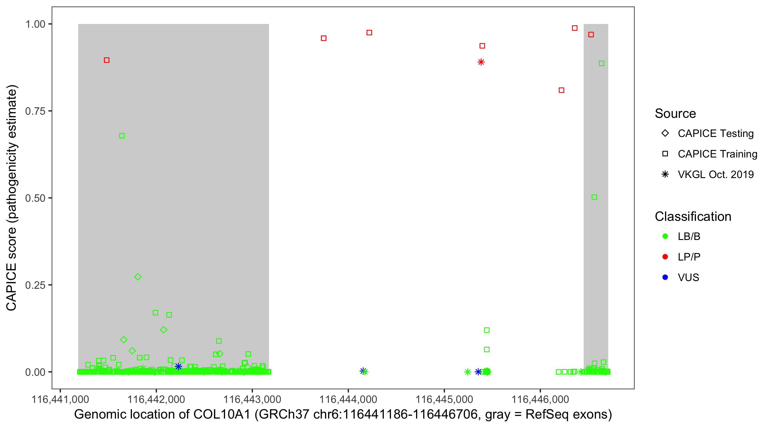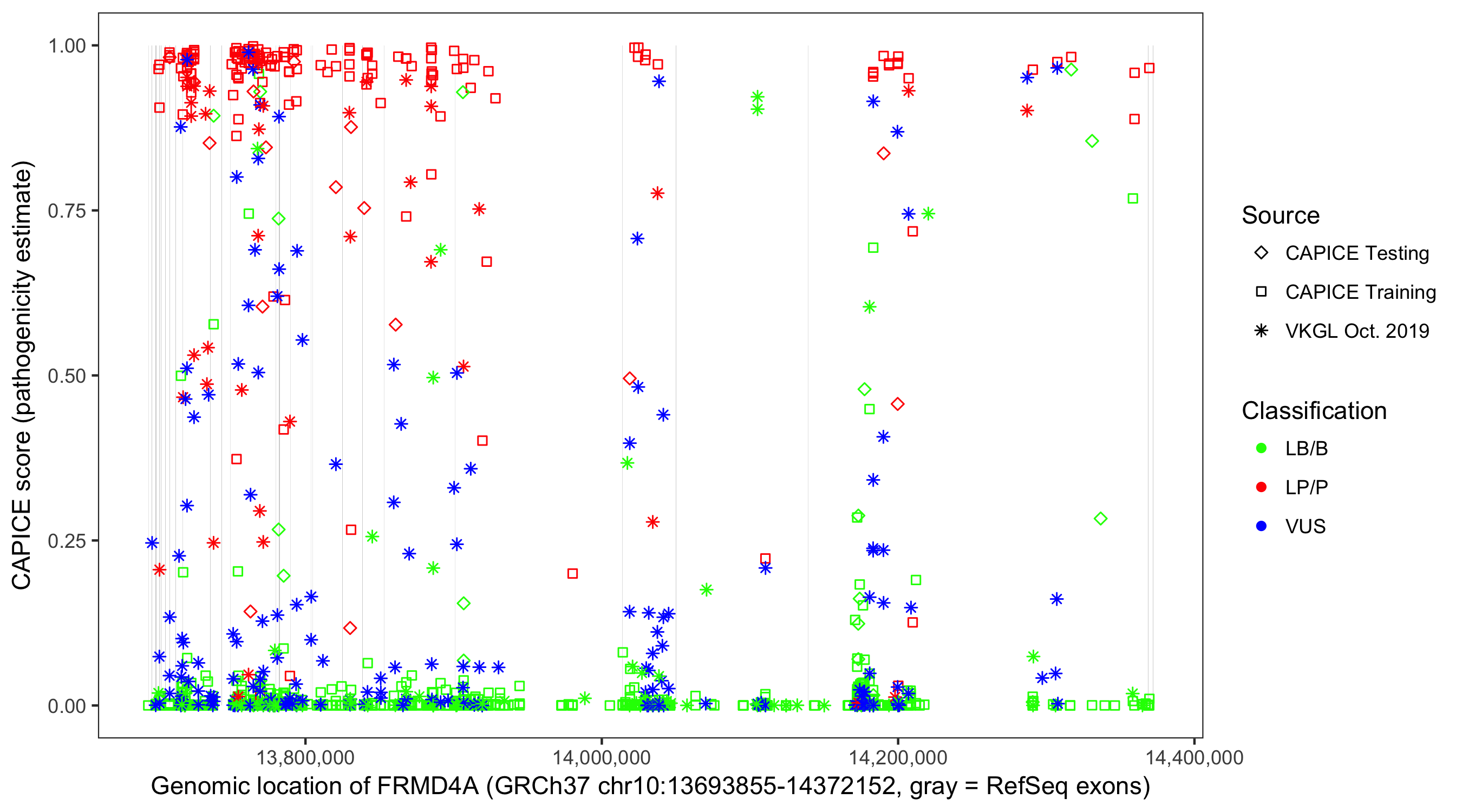 Shown are CAPICE train/test variants plus VKGL Oct 2019.