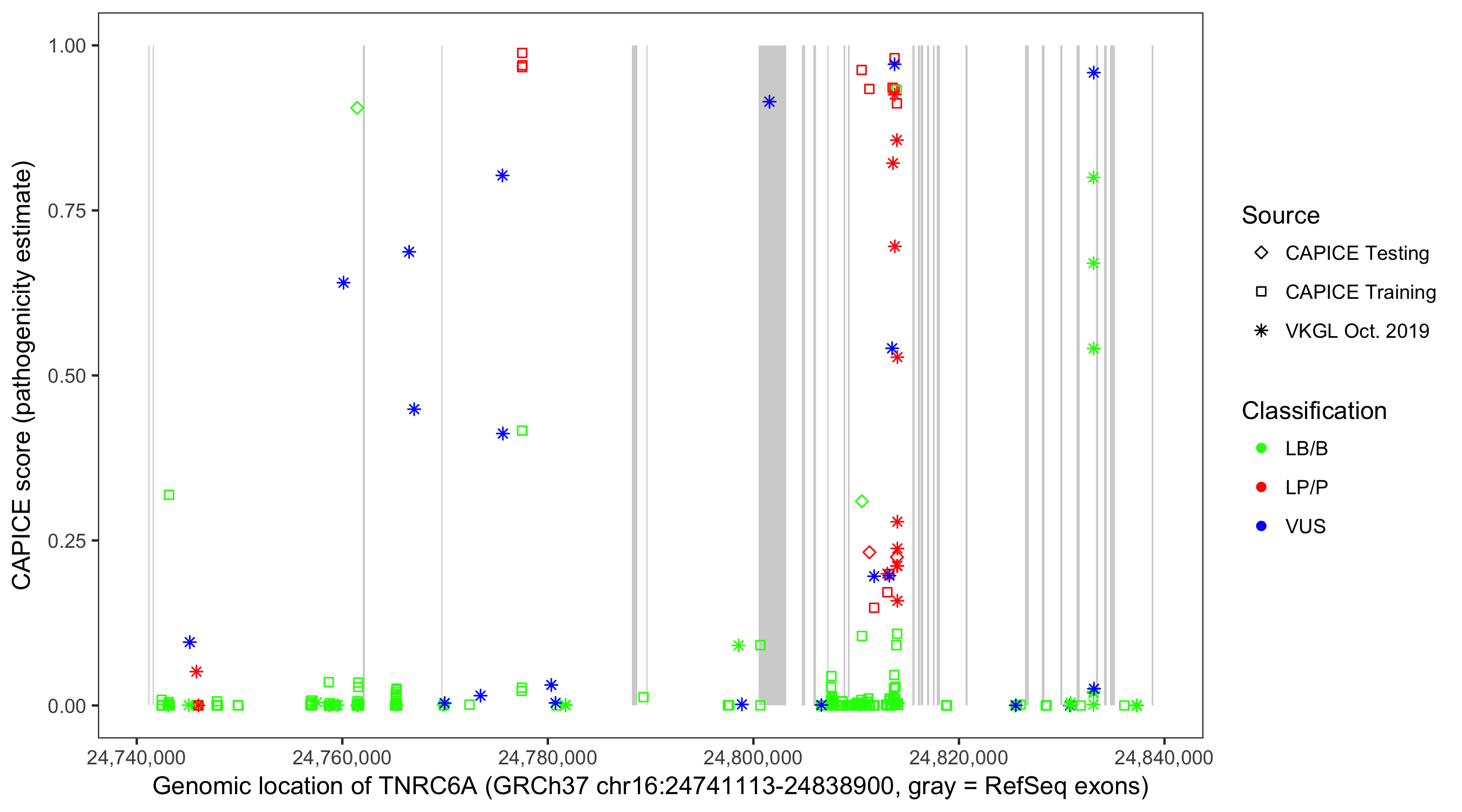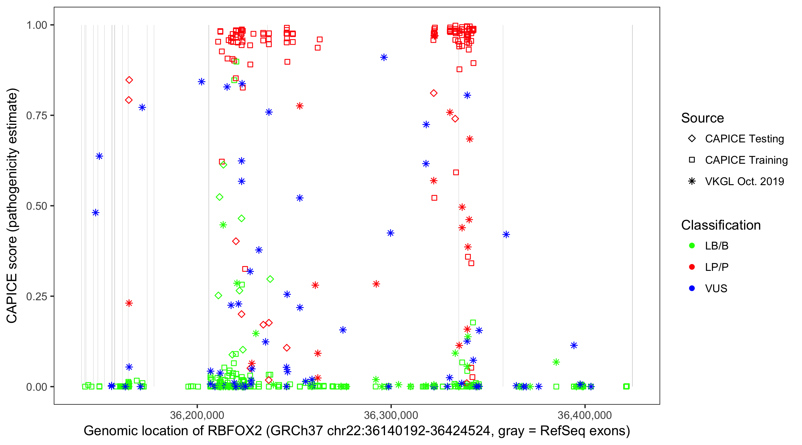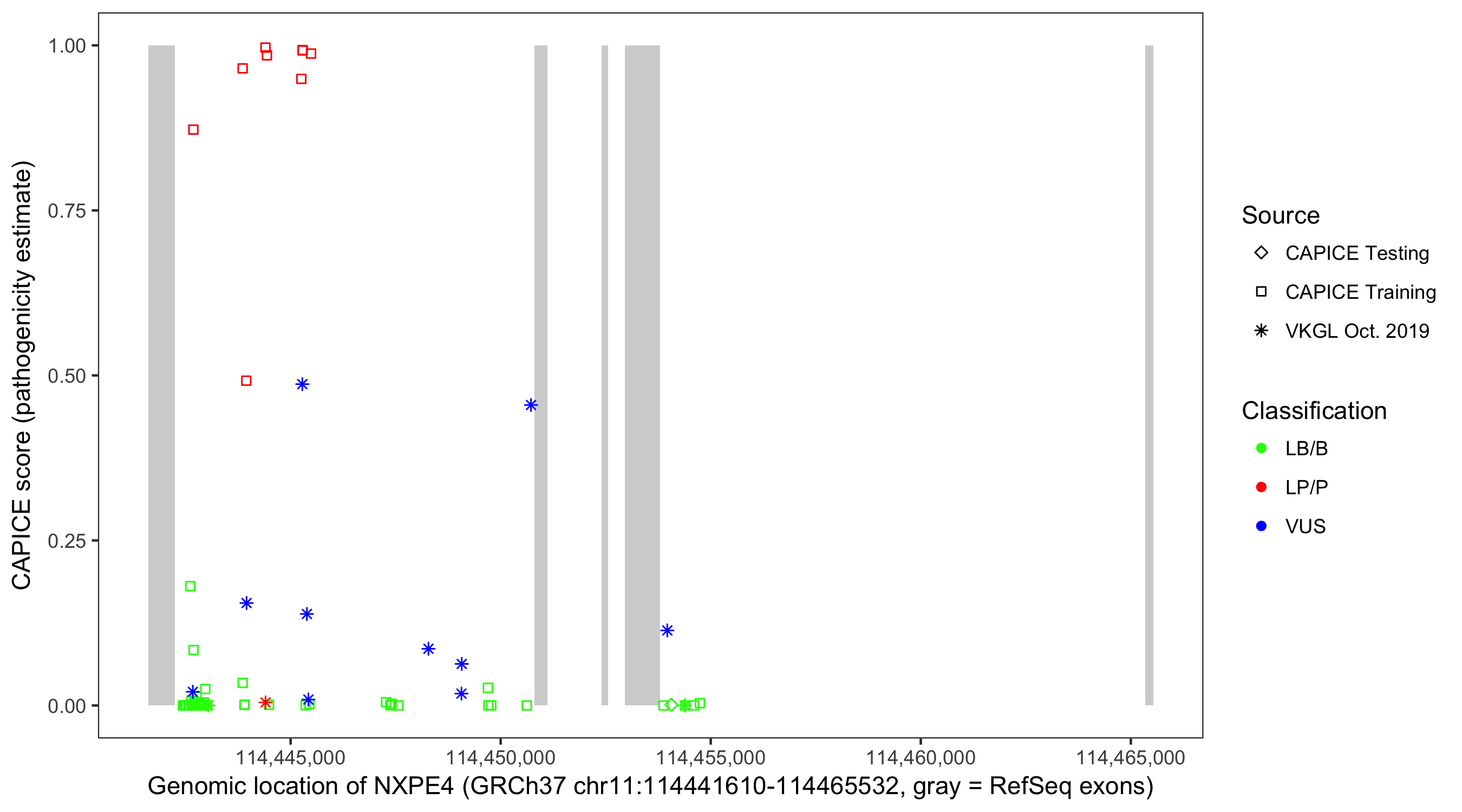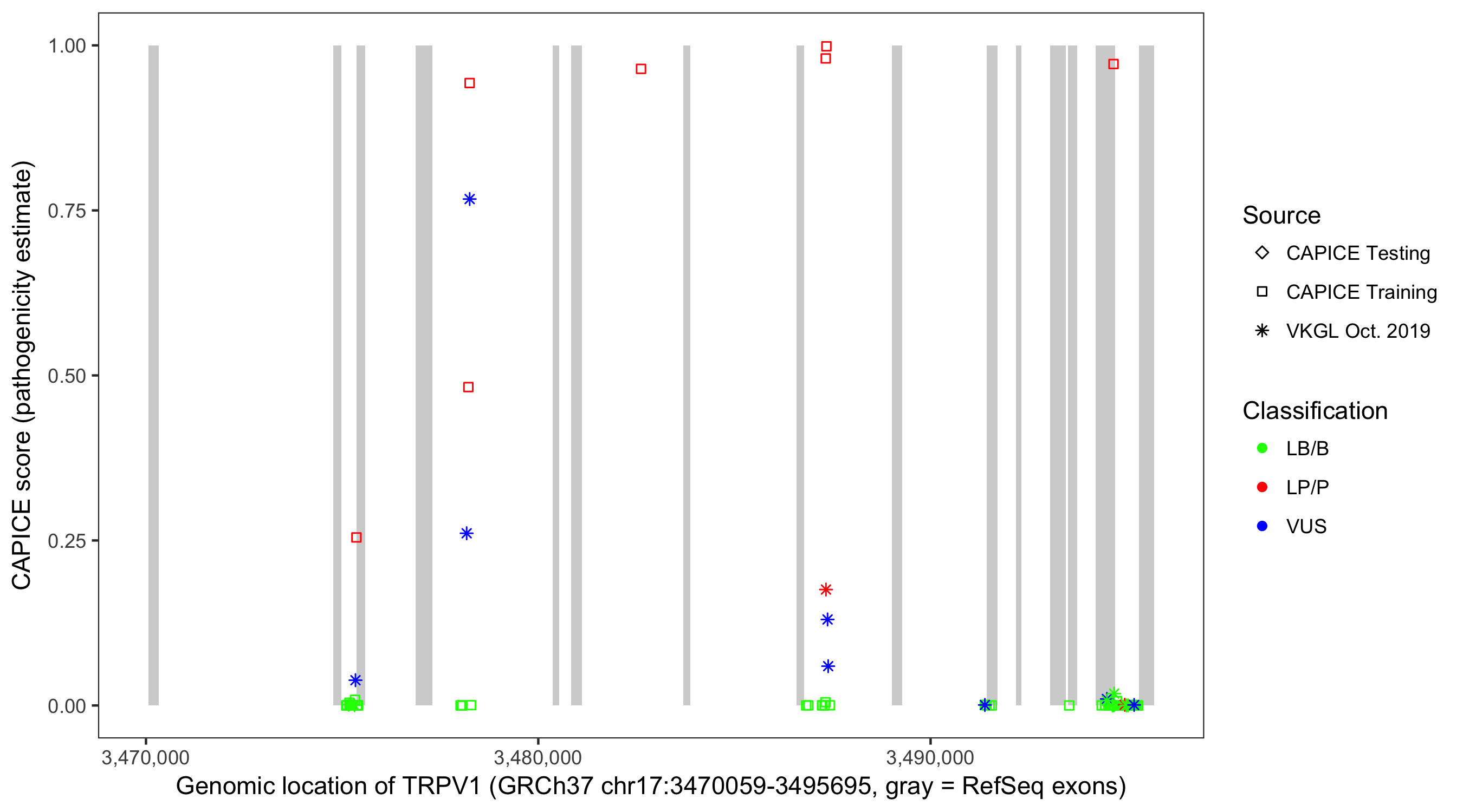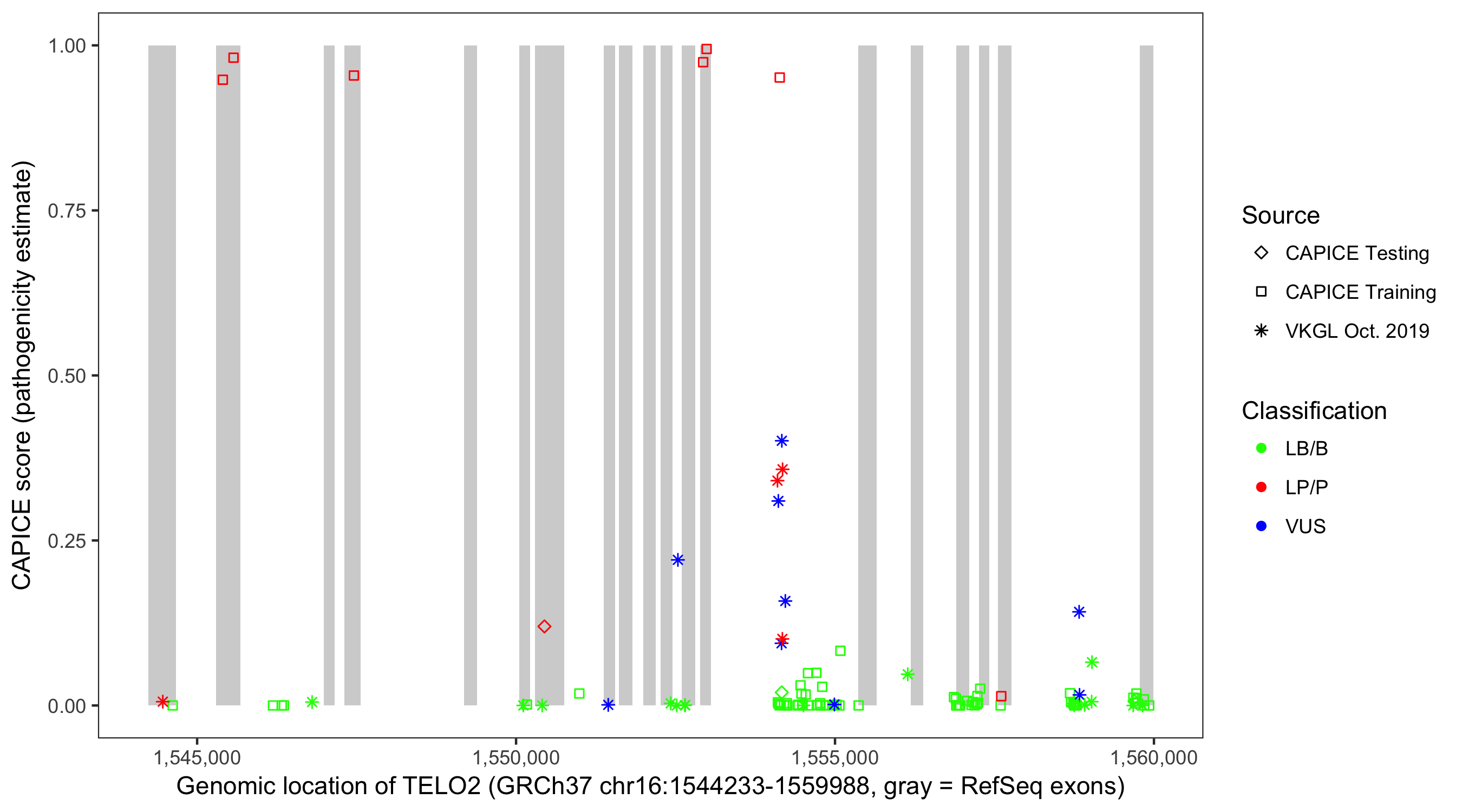 Shown are CAPICE train/test variants plus VKGL Oct 2019.