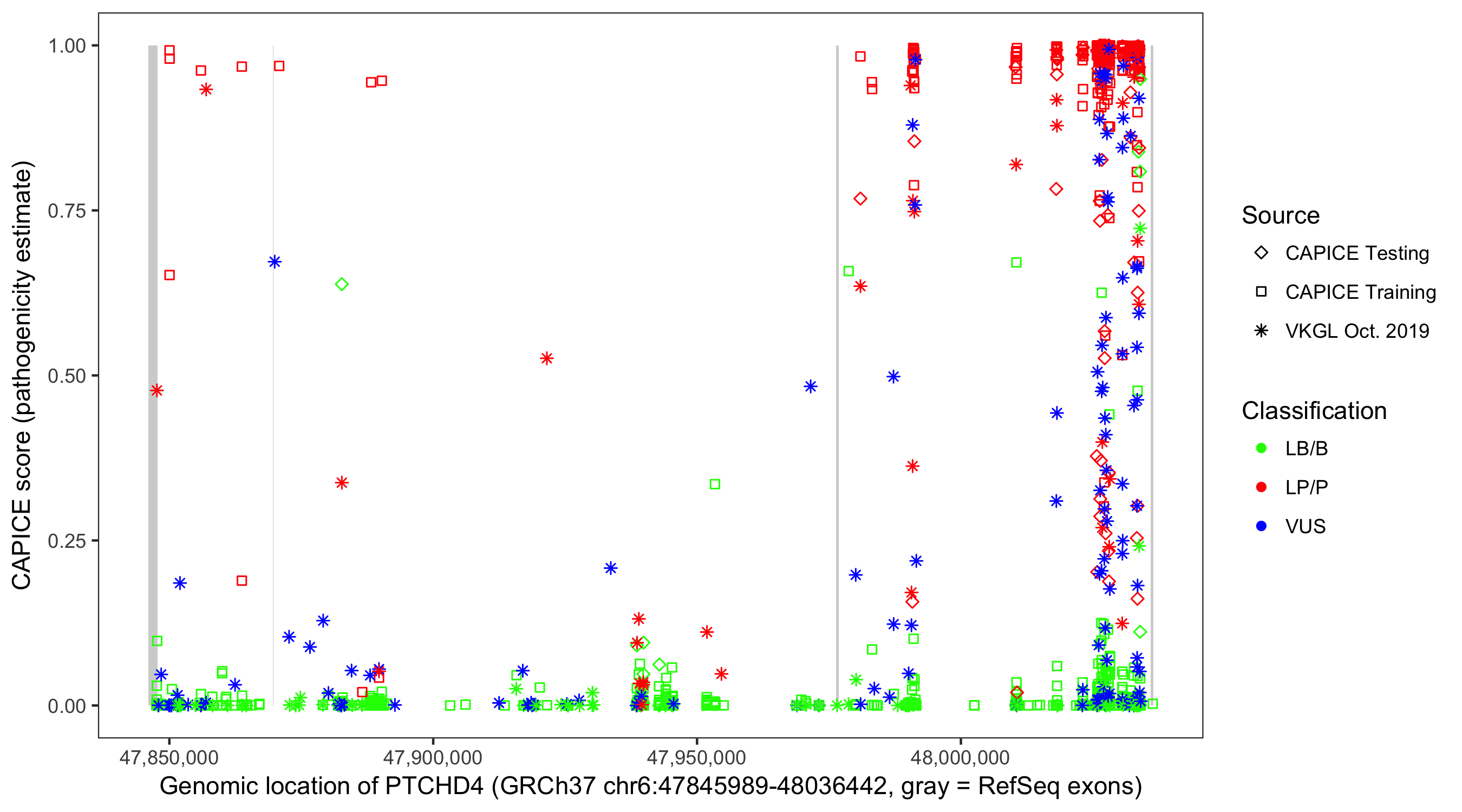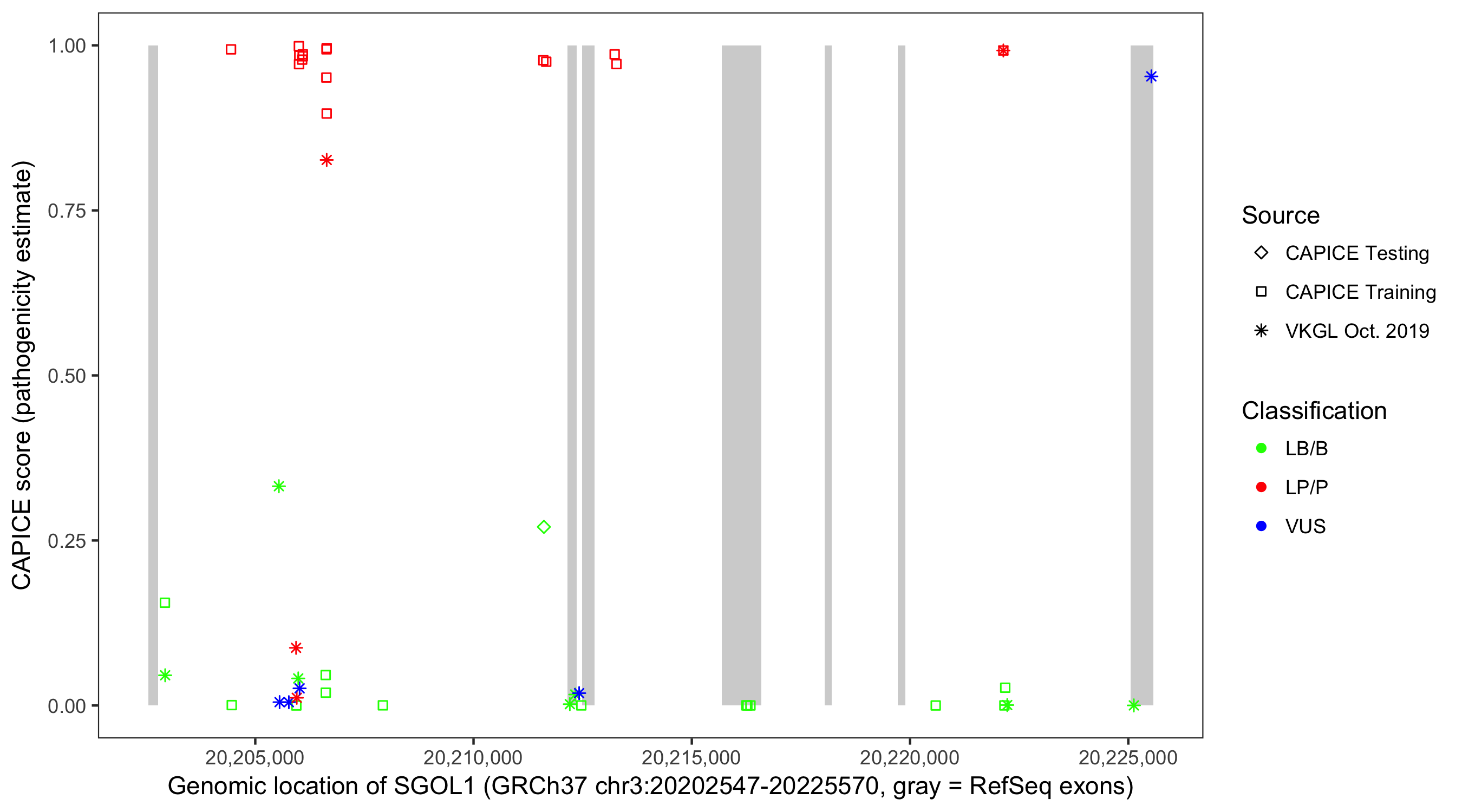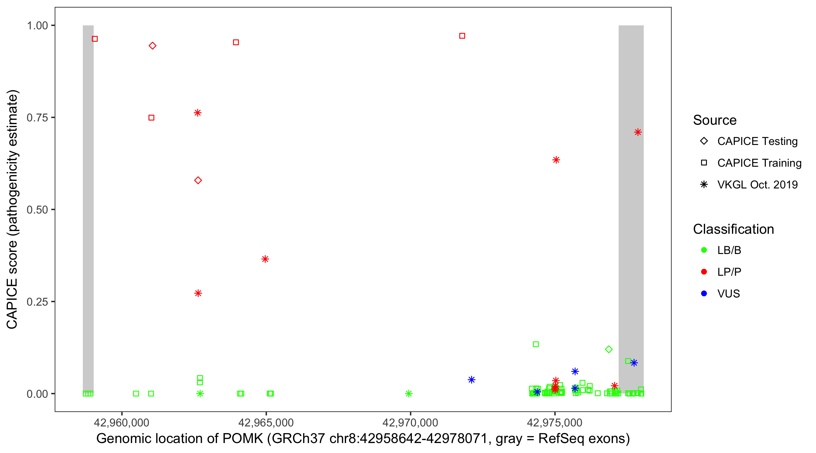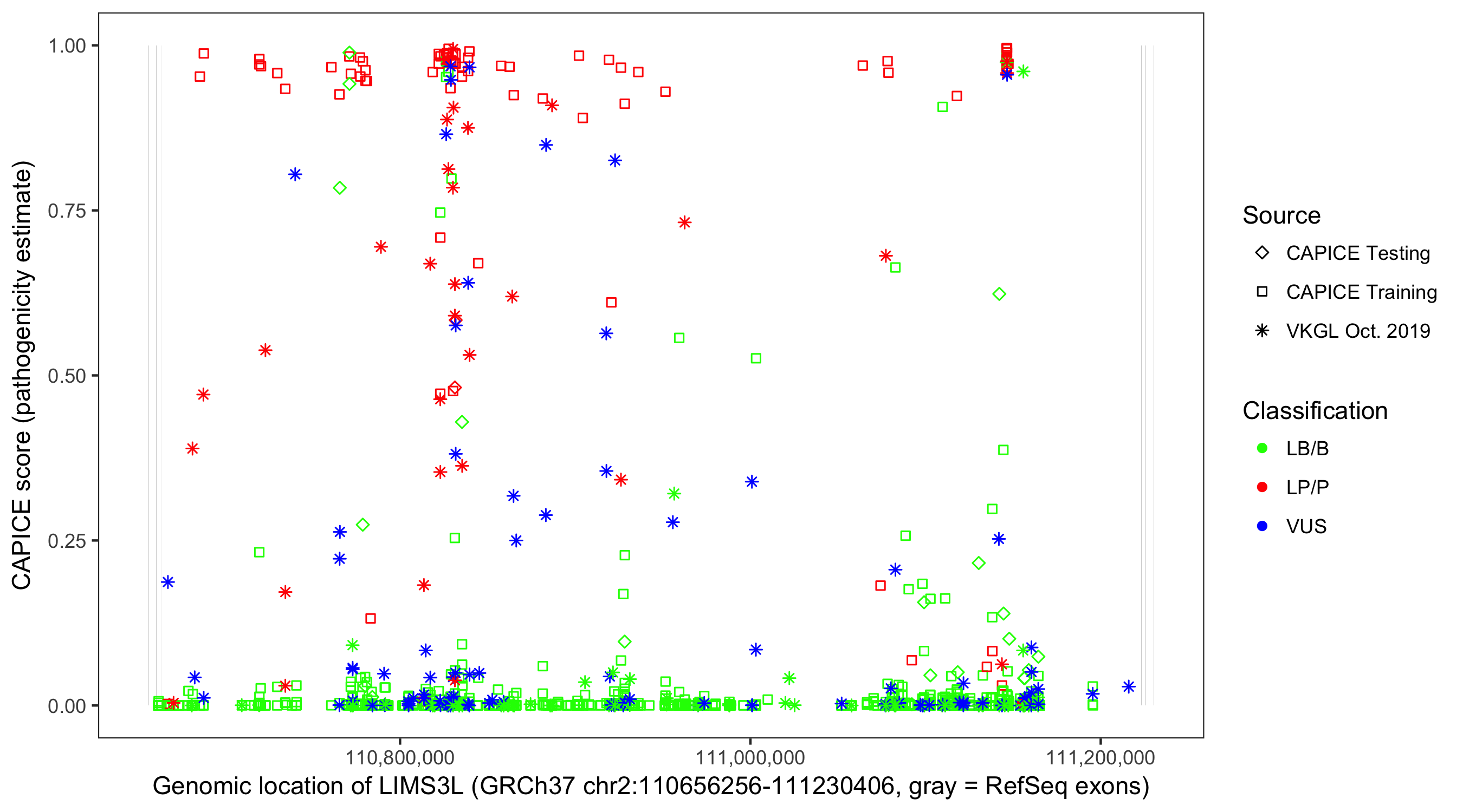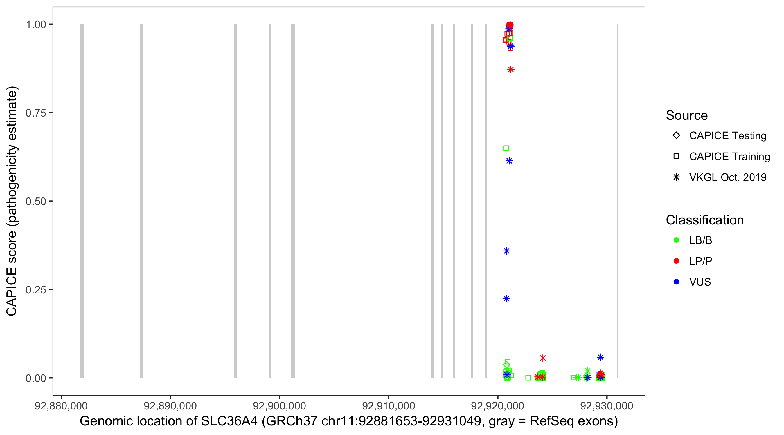 Shown are CAPICE train/test variants plus VKGL Oct 2019.