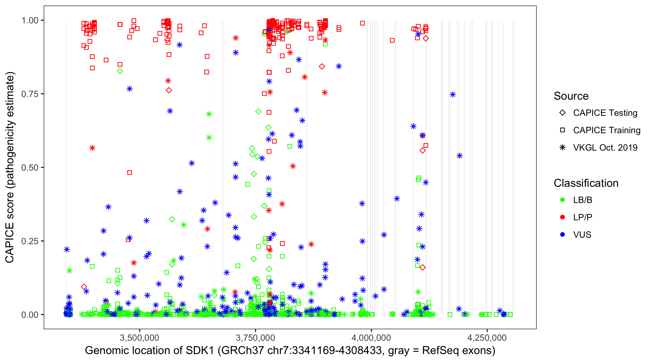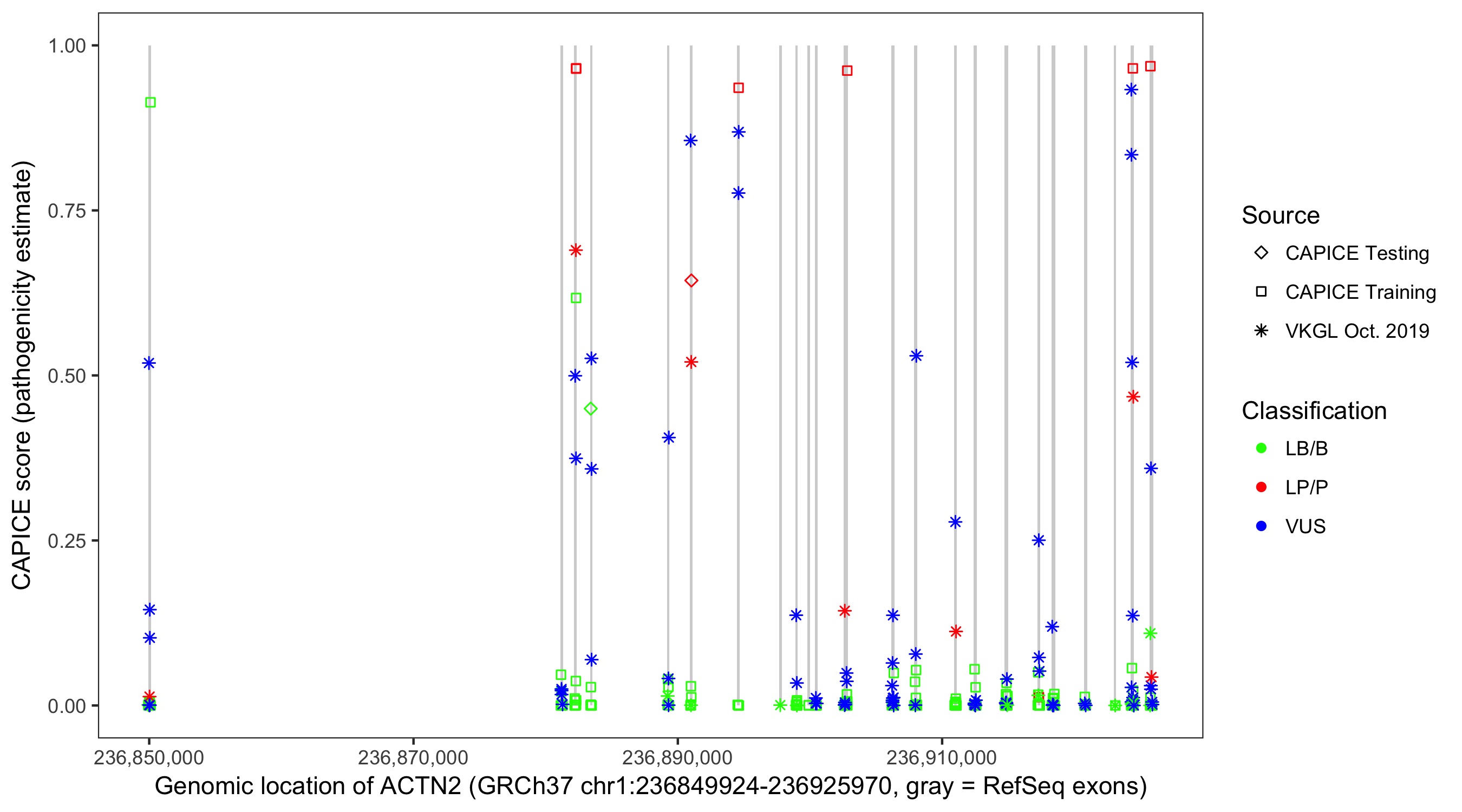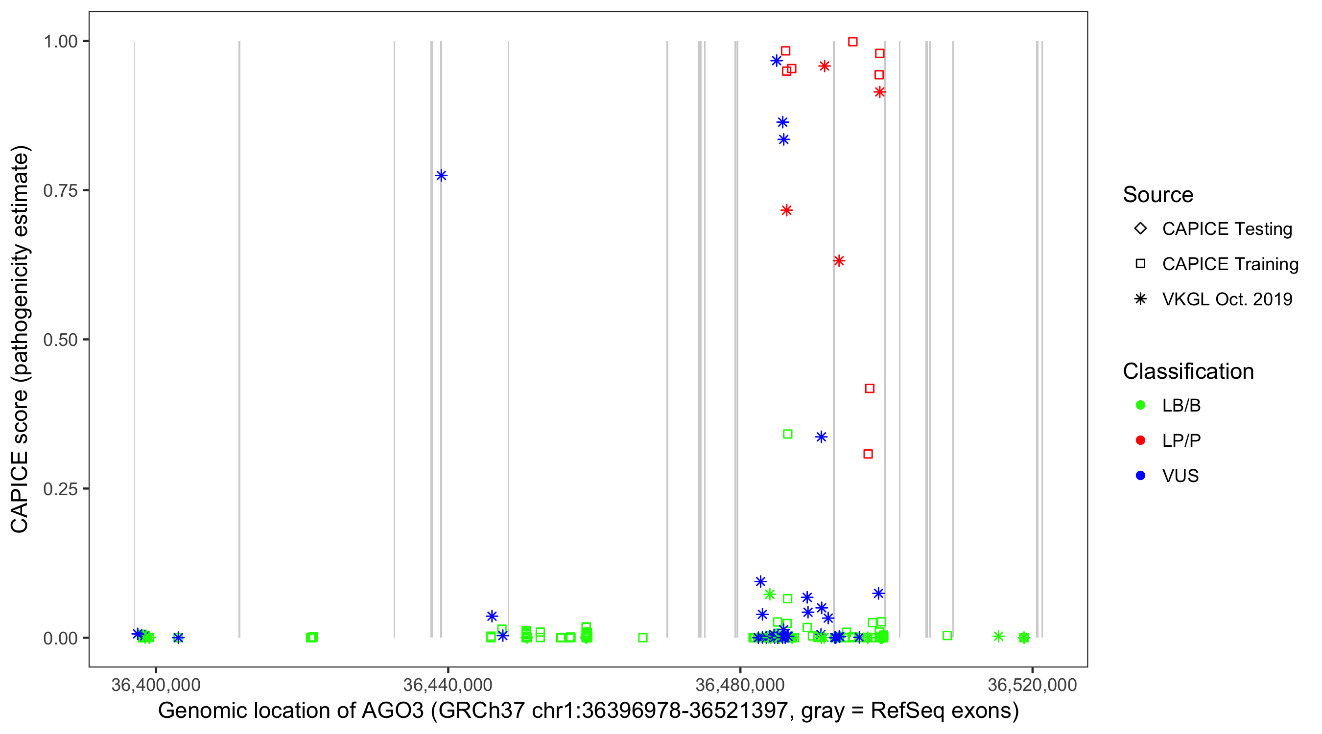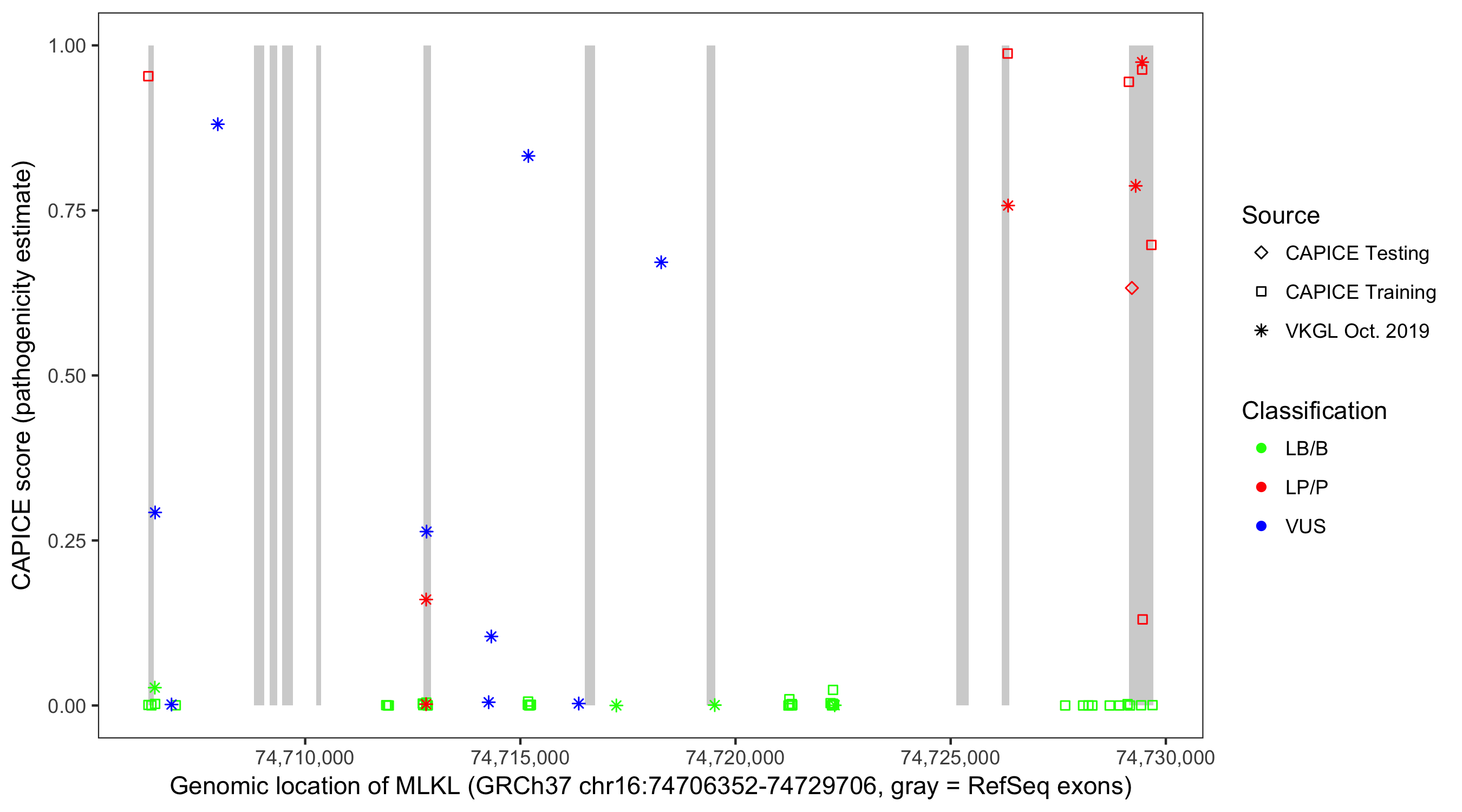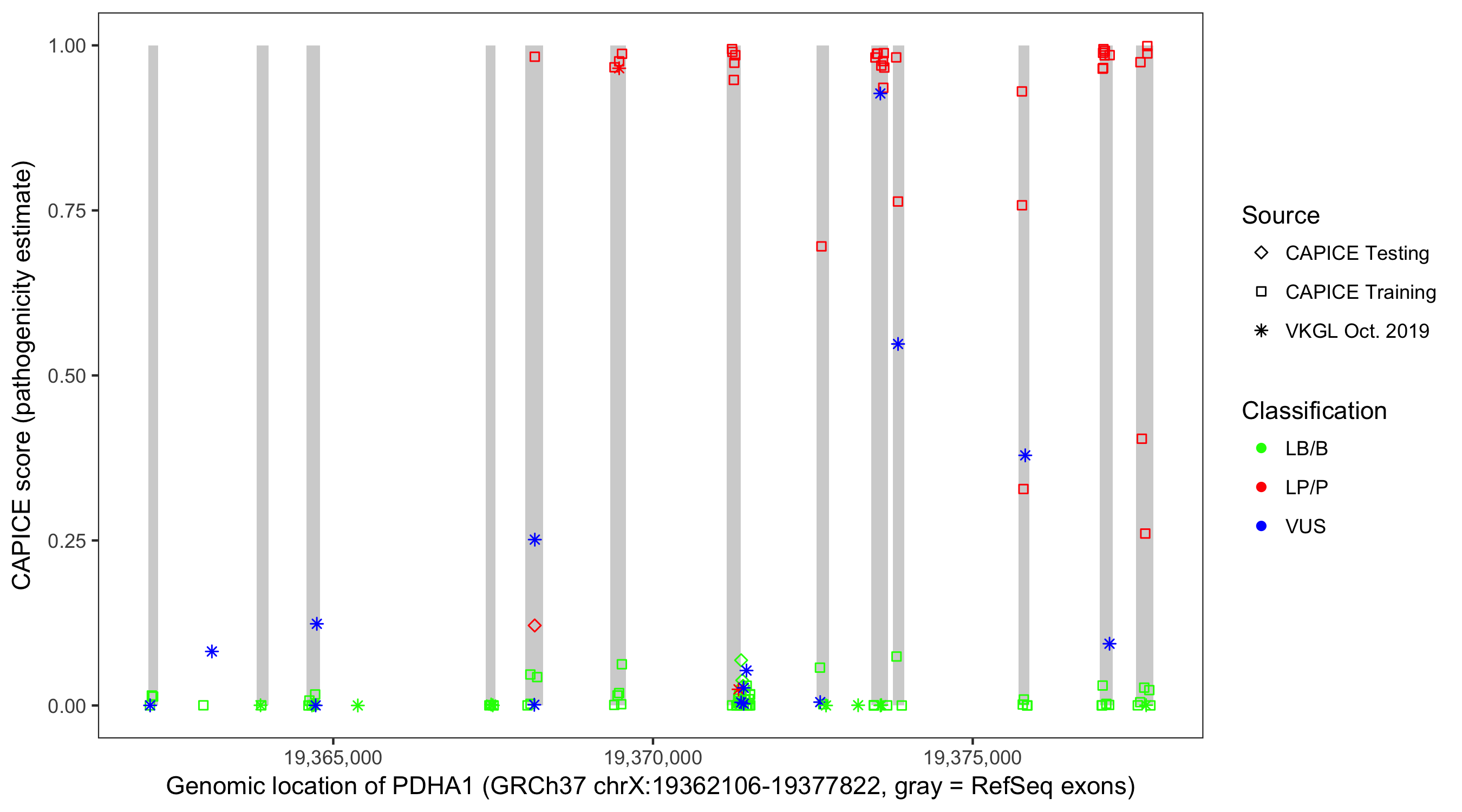 Shown are CAPICE train/test variants plus VKGL Oct 2019.