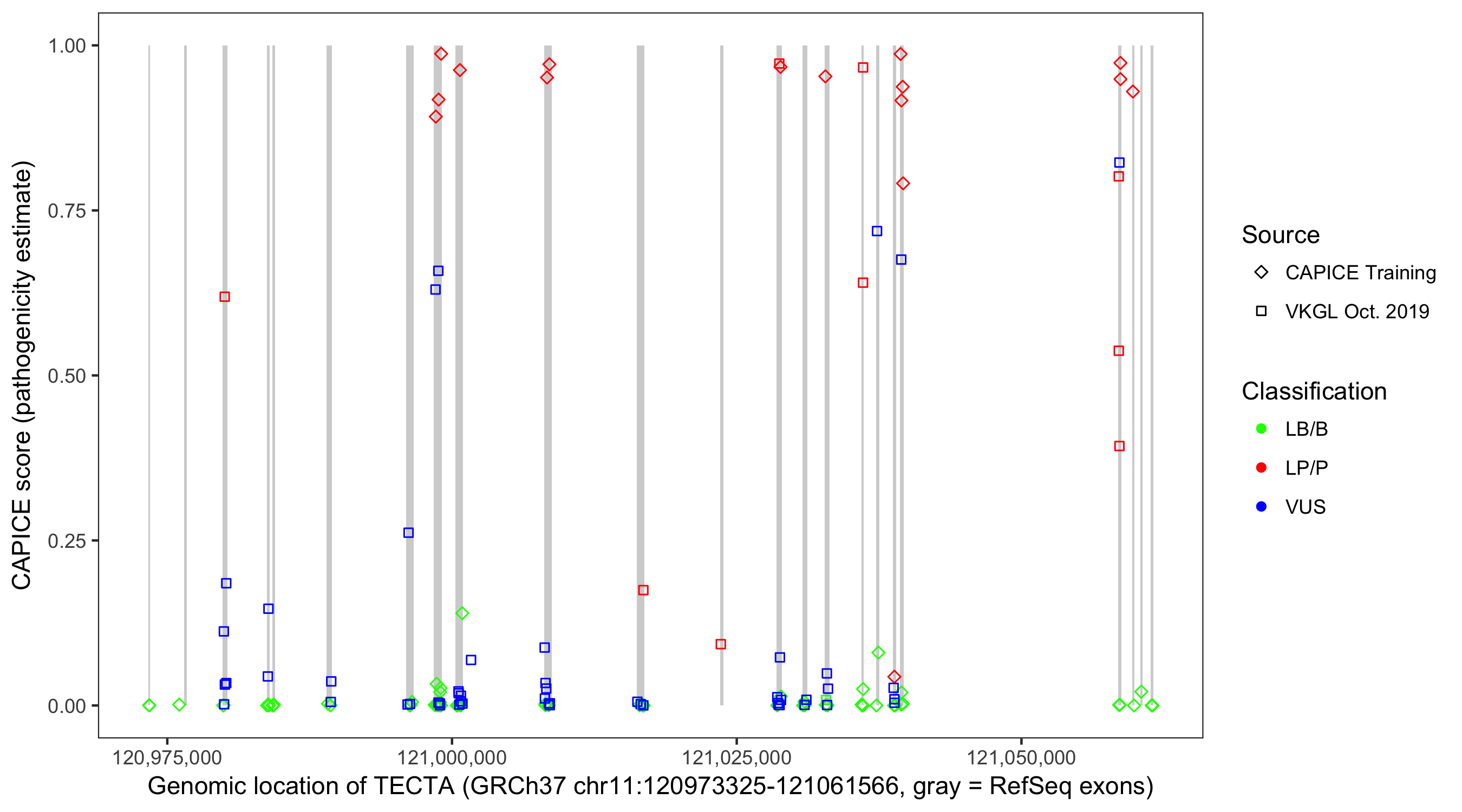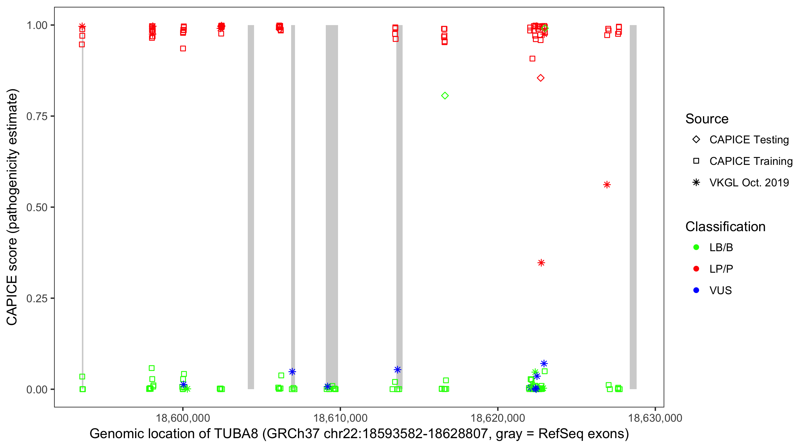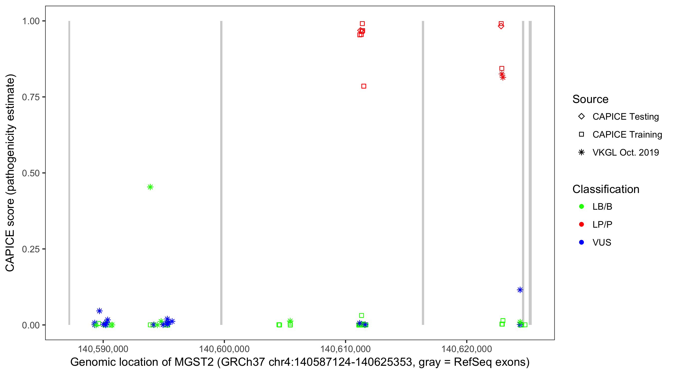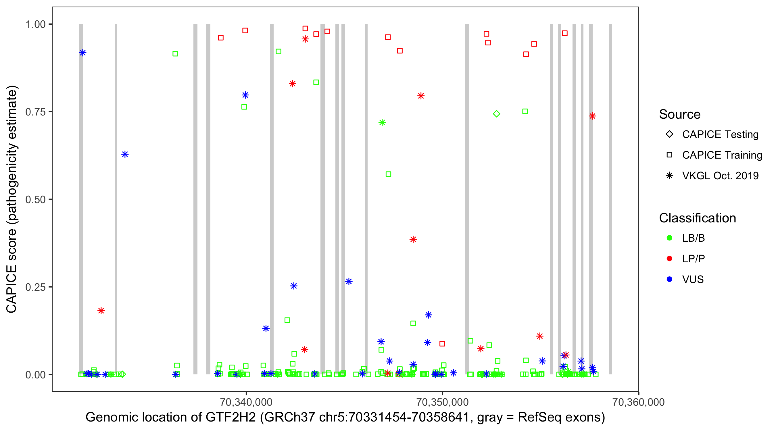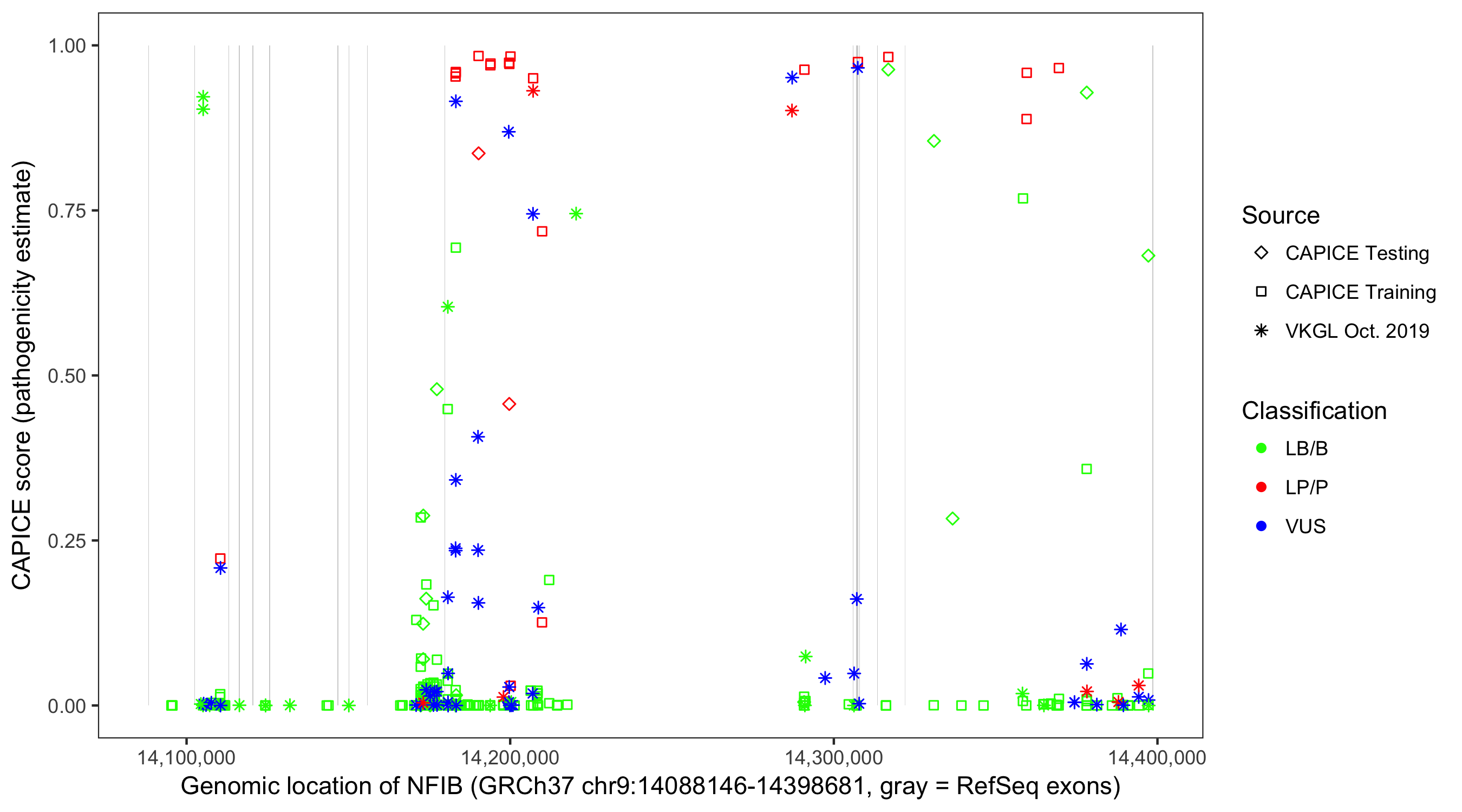 Shown are CAPICE train/test variants plus VKGL Oct 2019.